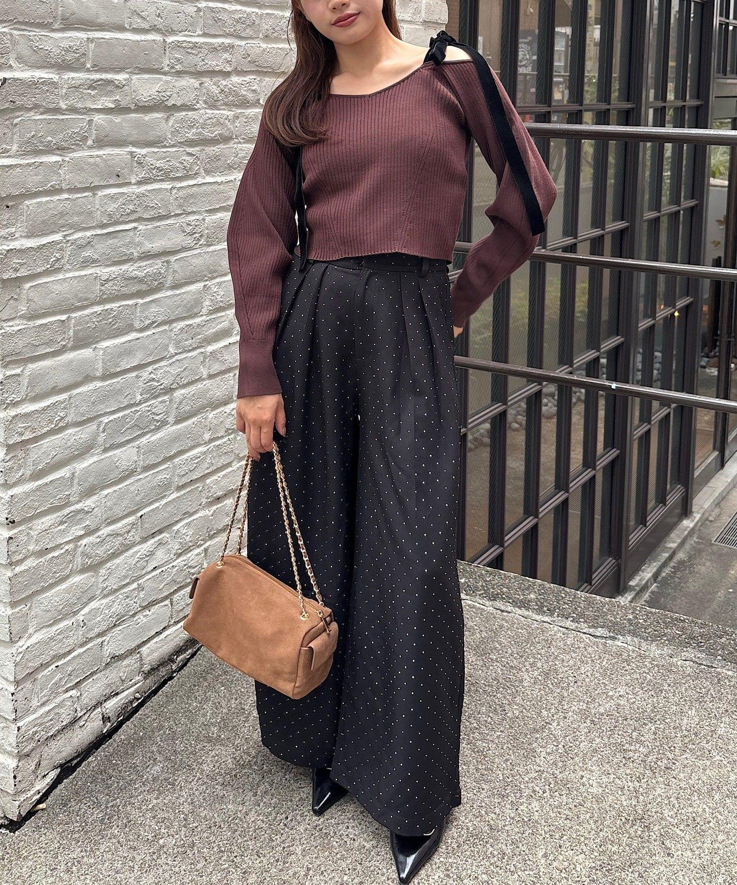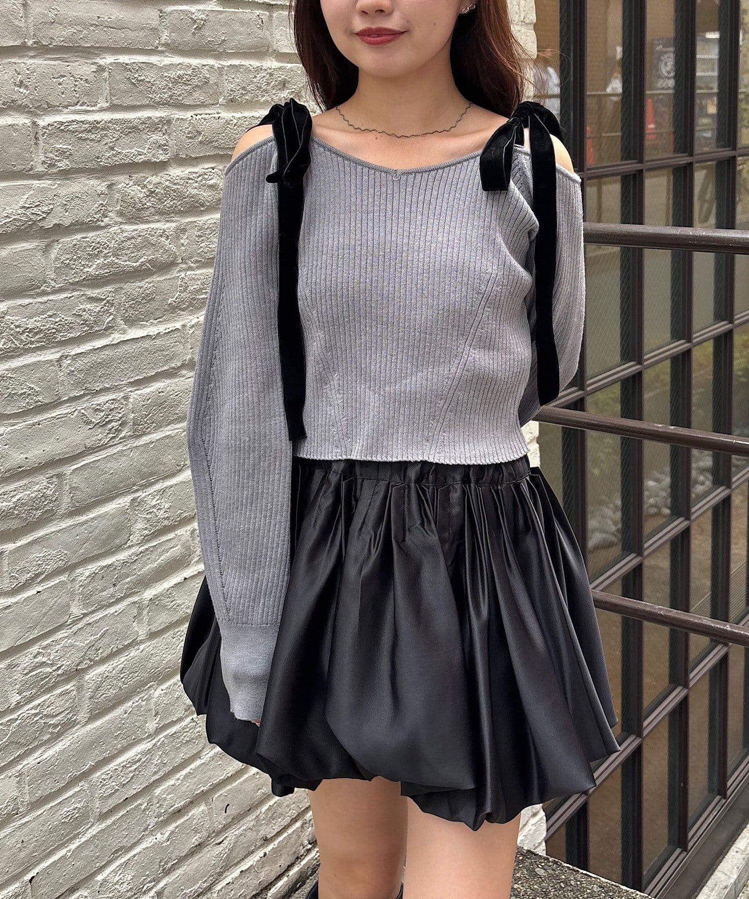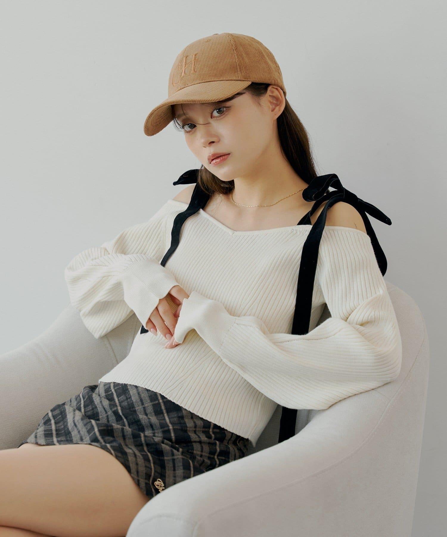 露肩羅紋針織衫,肩部飾有蝴蝶結!
