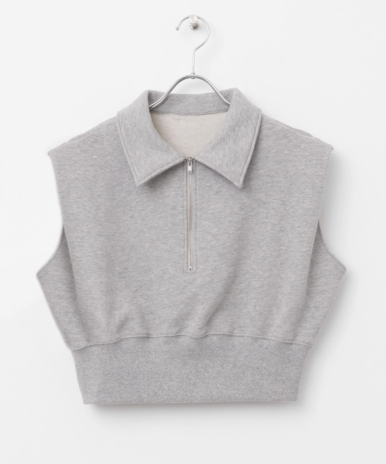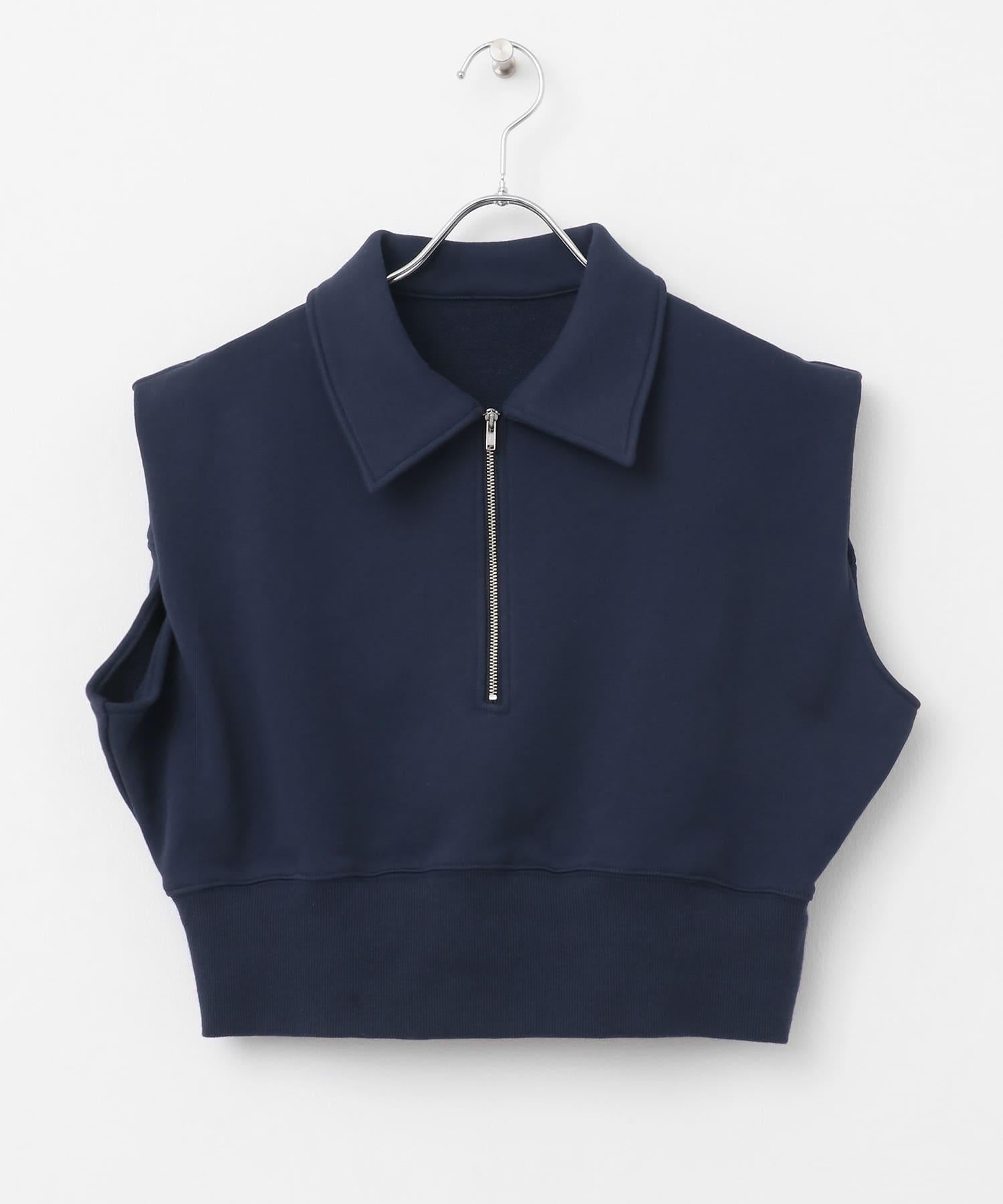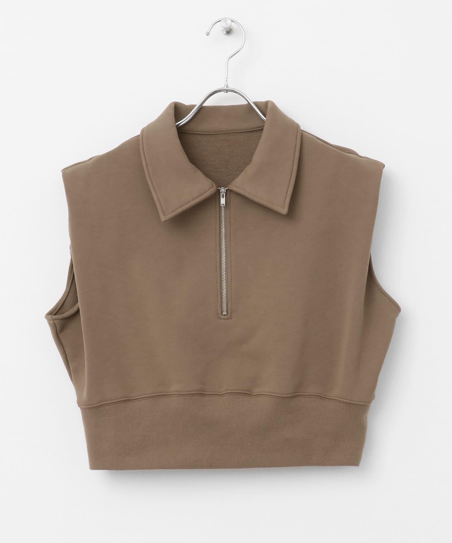 無袖運動衫採用墊肩設計,使手臂看起來更加纖細。半拉鍊設計給人一種休閒的感覺,但有領子的設計也可用於上班時穿著。舒適的面料和小巧的長度也是提升時尚感的關鍵點。有三種顏色可供選擇,可與任何下裝輕鬆搭配。