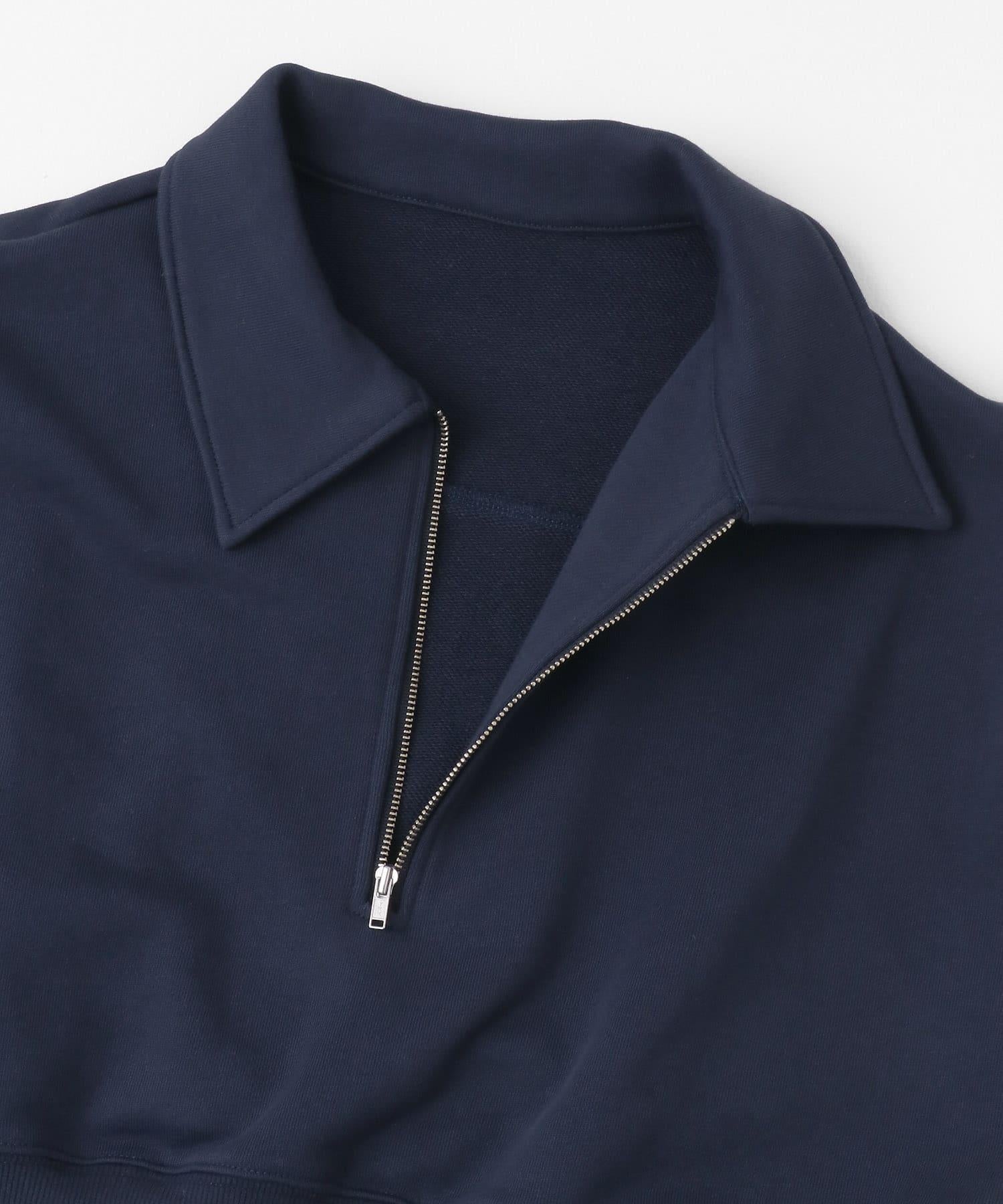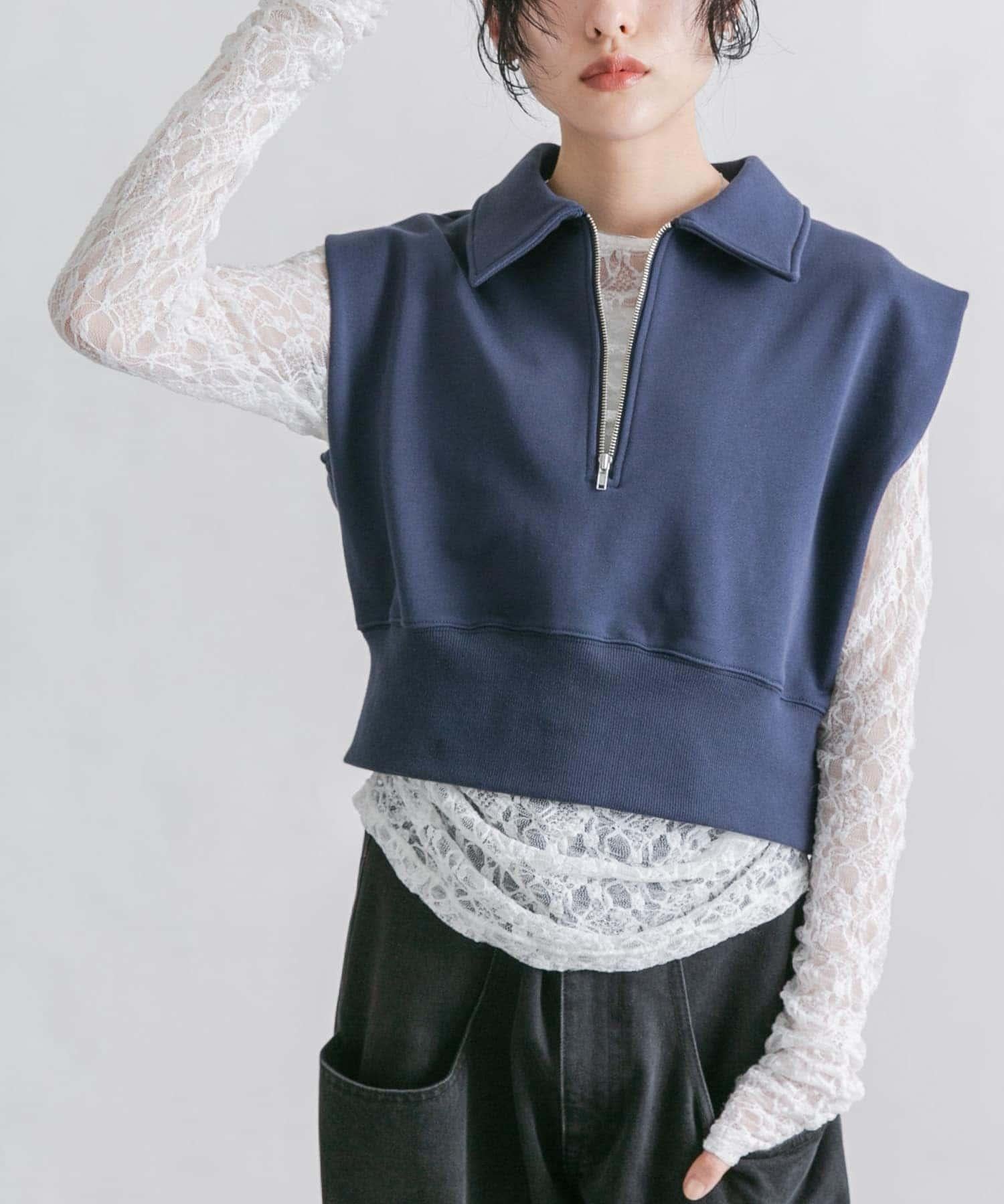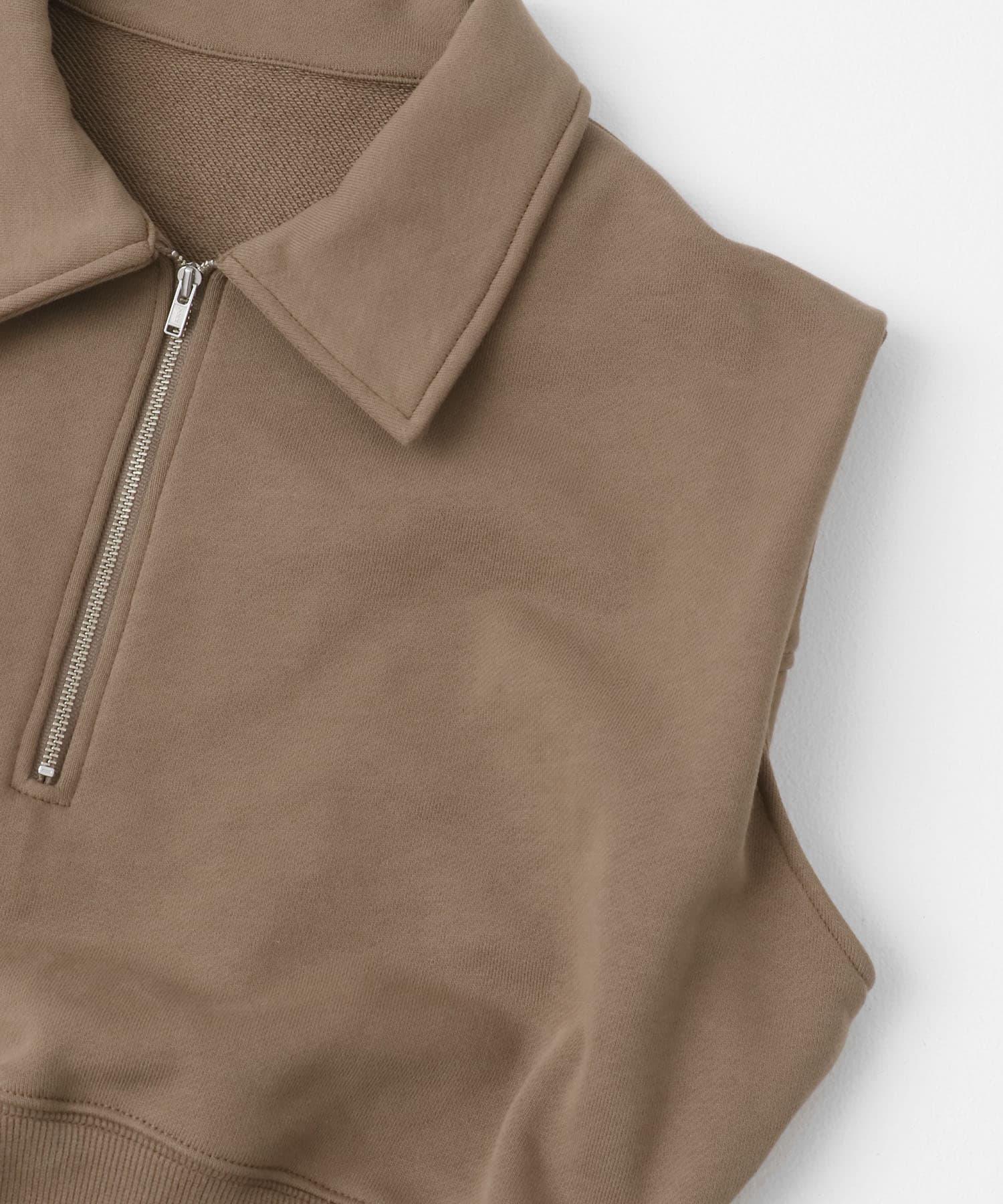 無袖運動衫採用墊肩設計,使手臂看起來更加纖細。半拉鍊設計給人一種休閒的感覺,但有領子的設計也可用於上班時穿著。舒適的面料和小巧的長度也是提升時尚感的關鍵點。有三種顏色可供選擇,可與任何下裝輕鬆搭配。