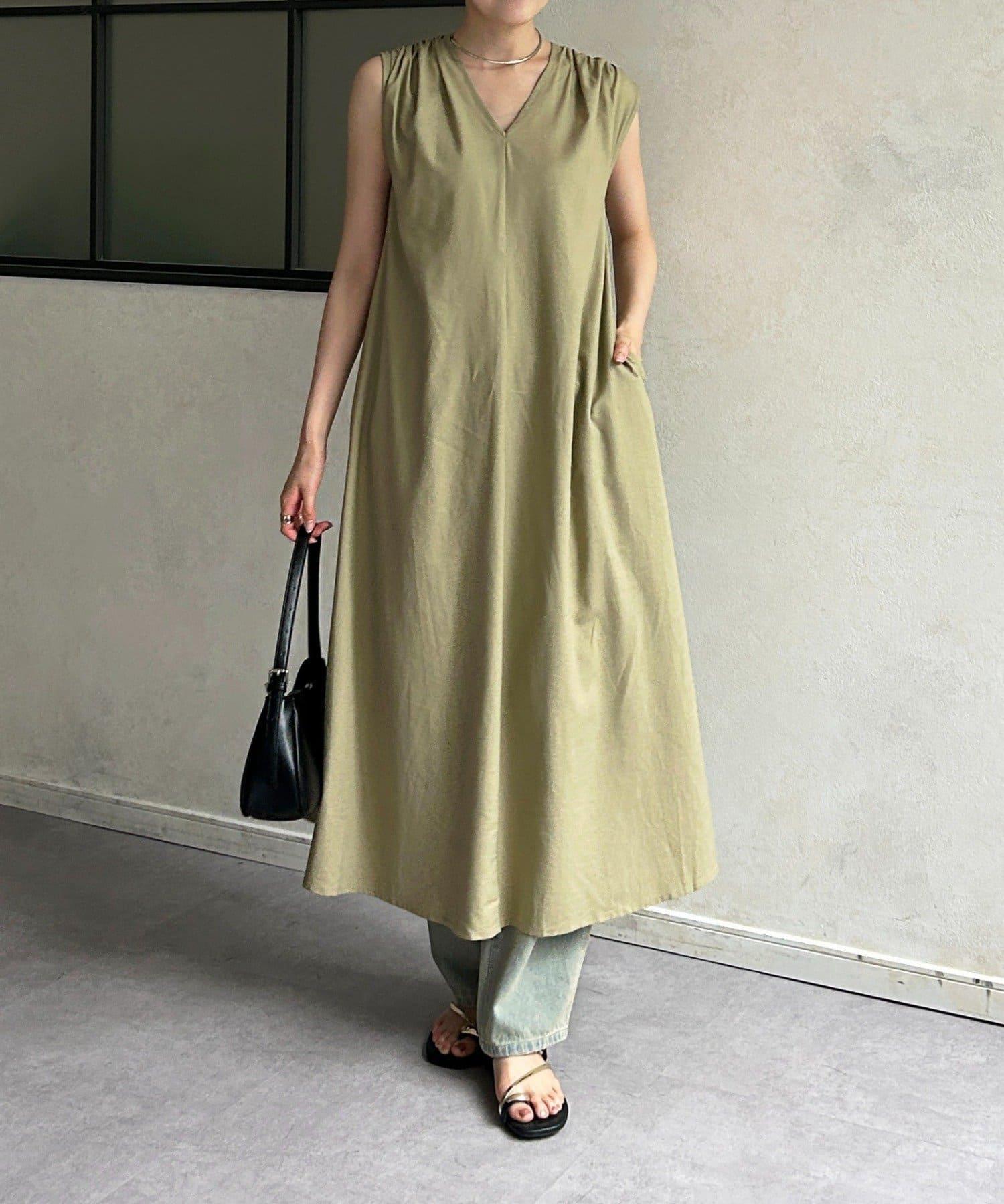 肩部褶皺V領連衣裙