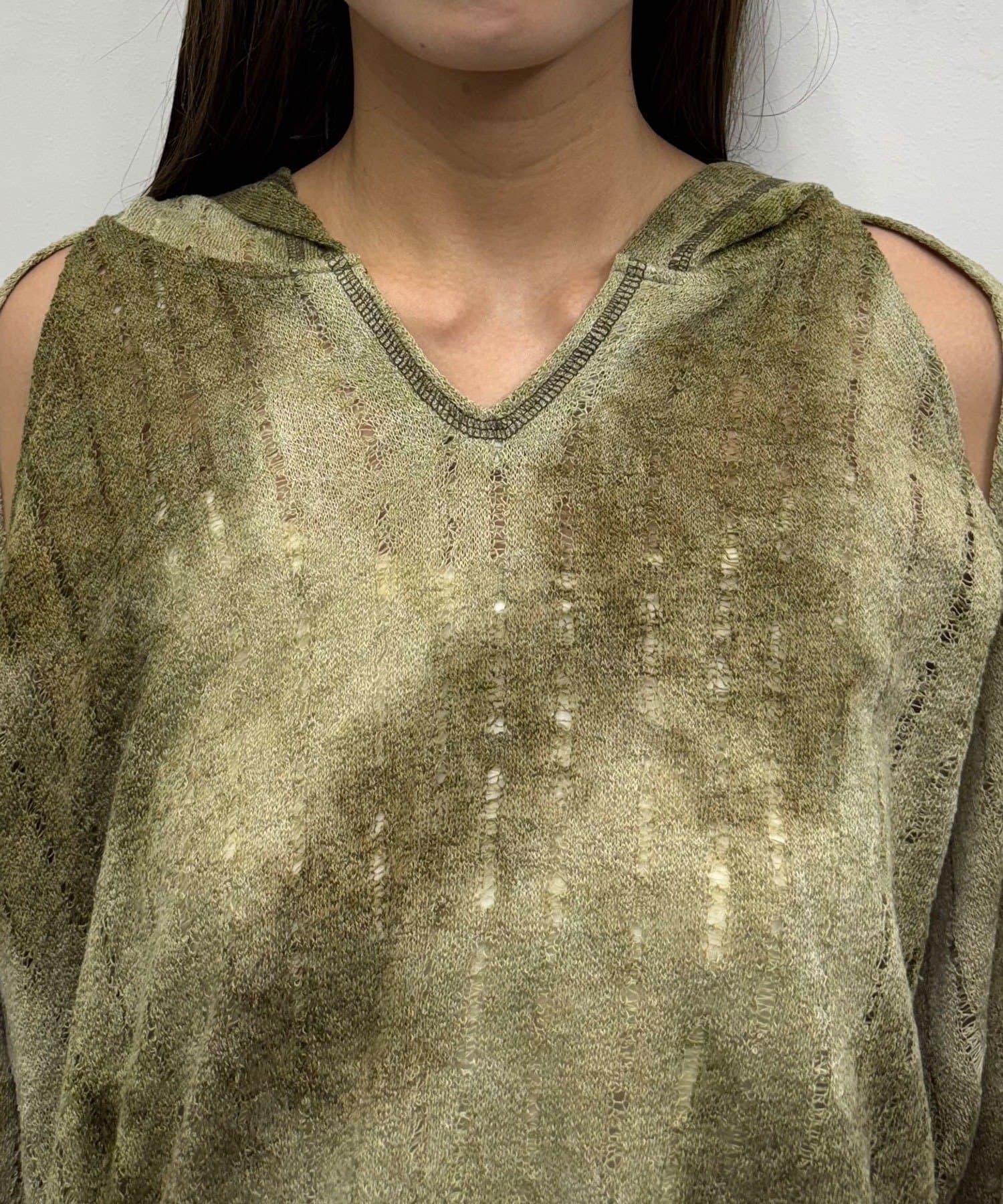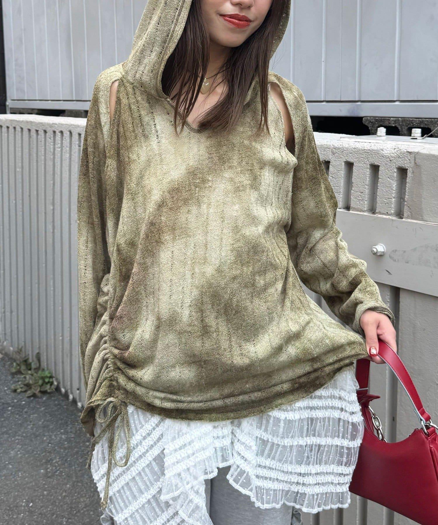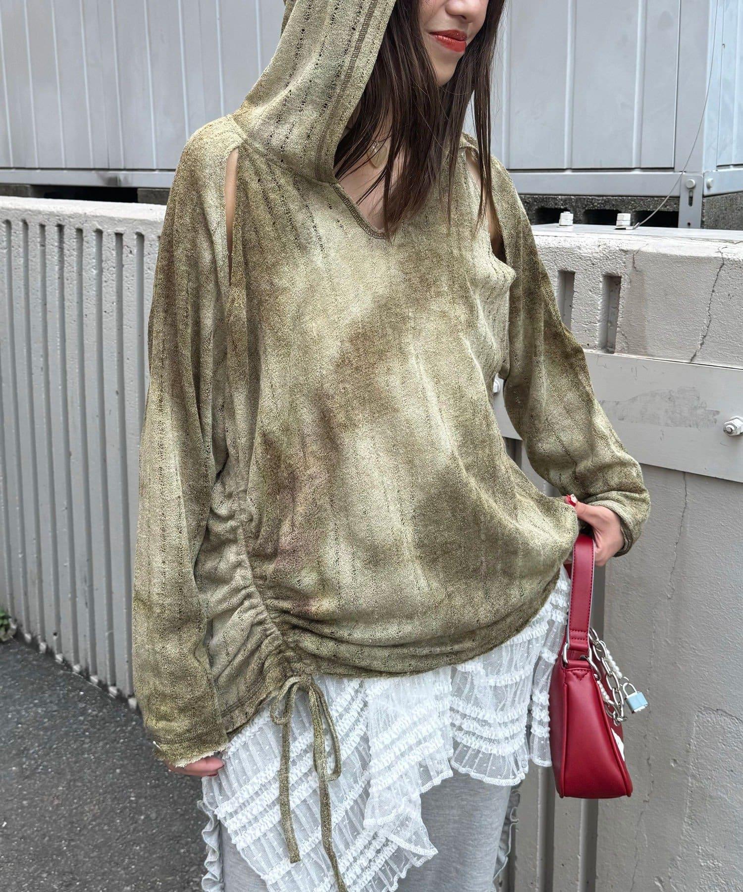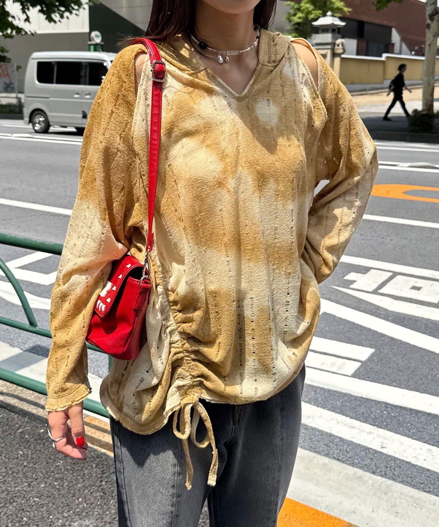 這款扎染連帽衫肩部開衩,在寬鬆感和露膚之間取得了精緻的平衡。