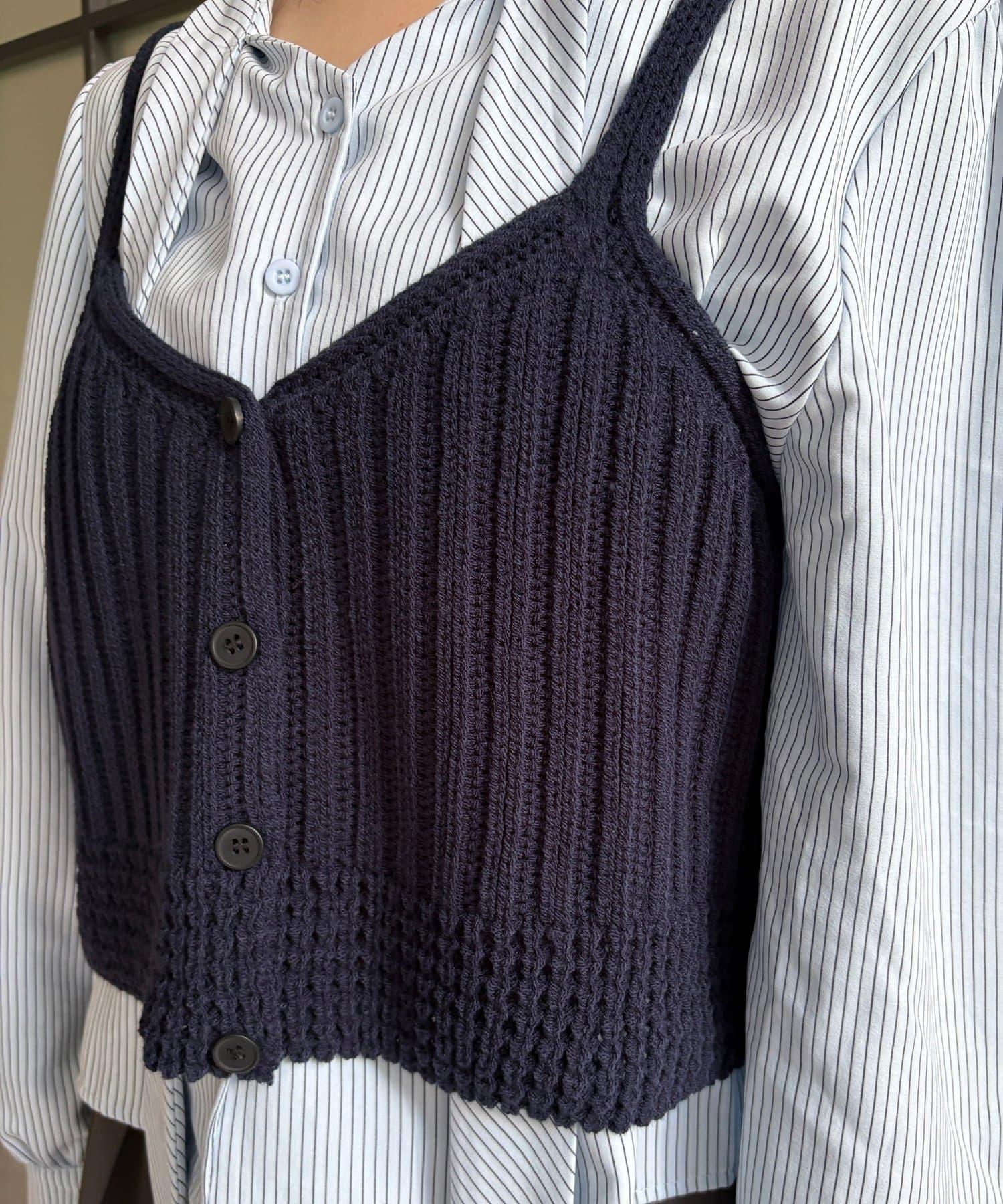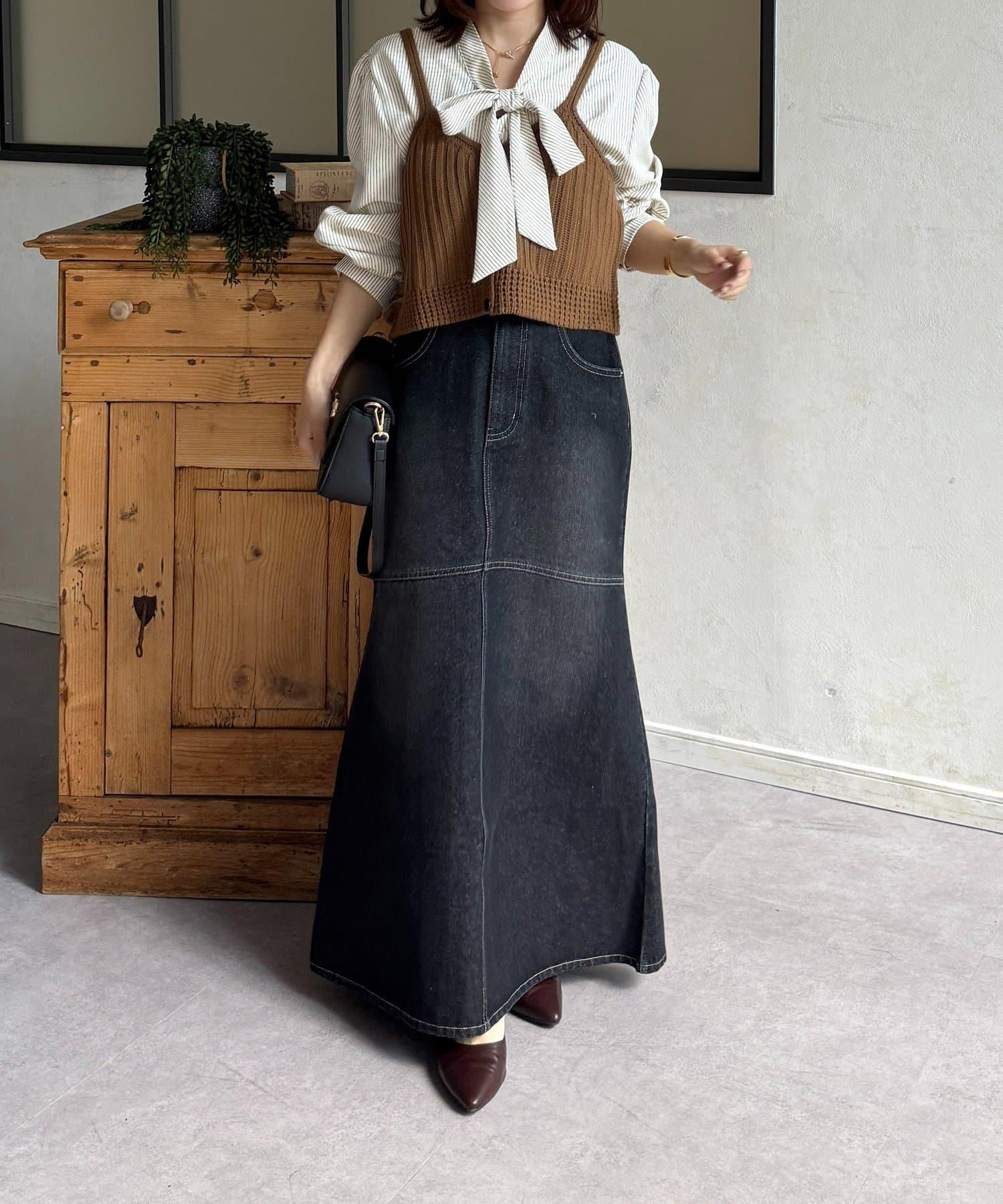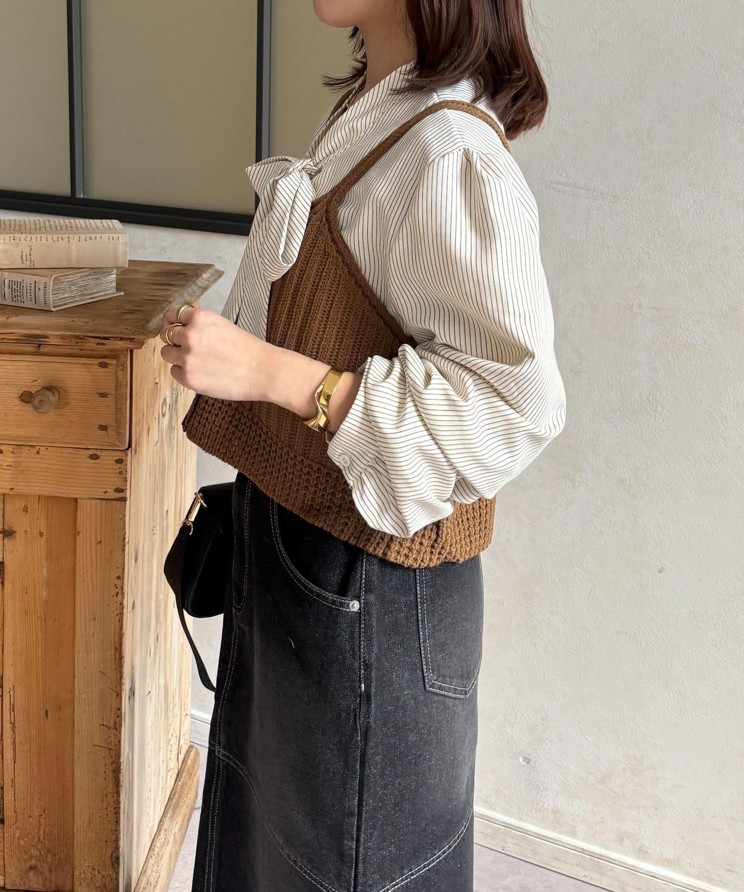 半身裙的針織面料為搭配增添了一絲清爽感。