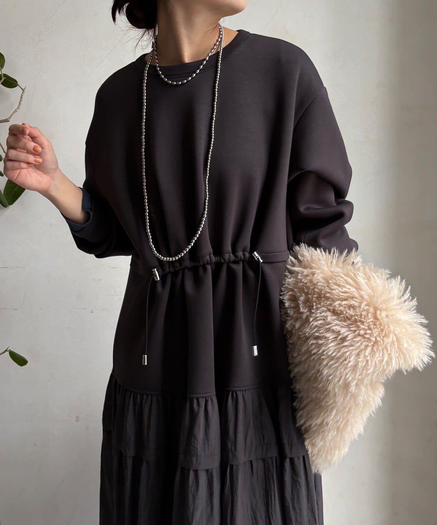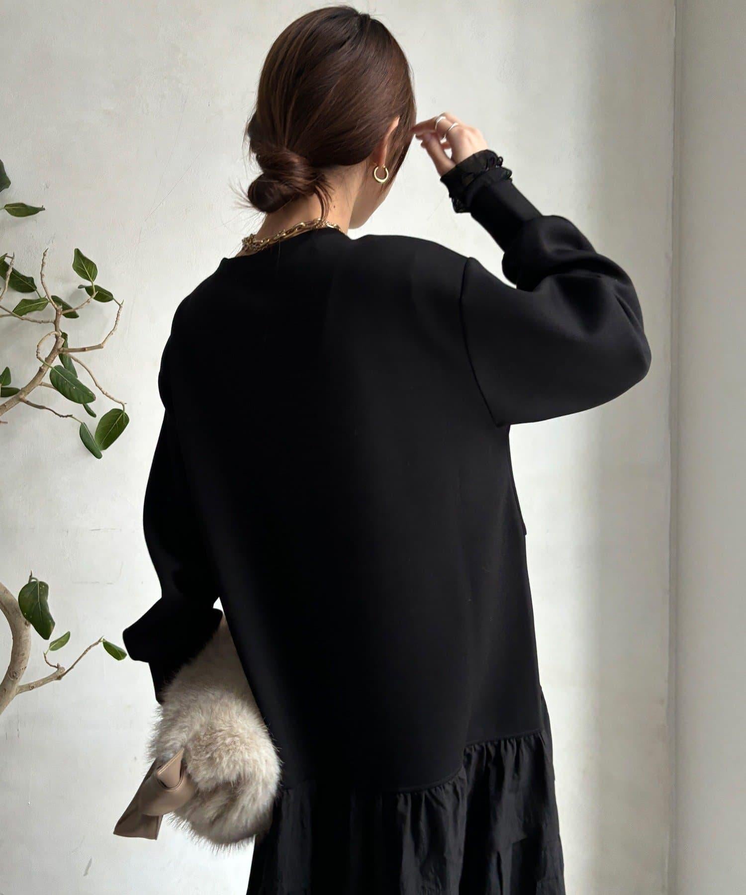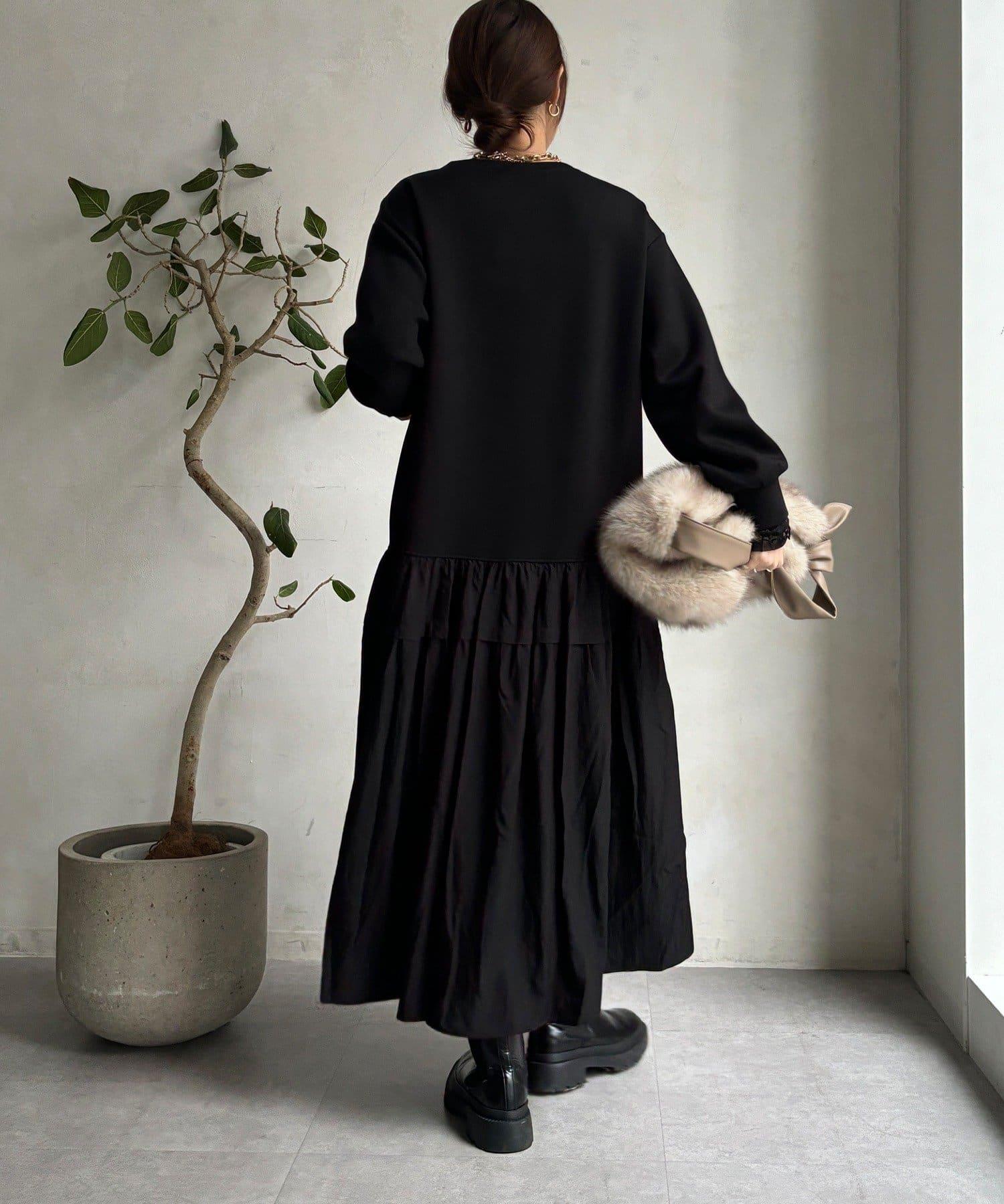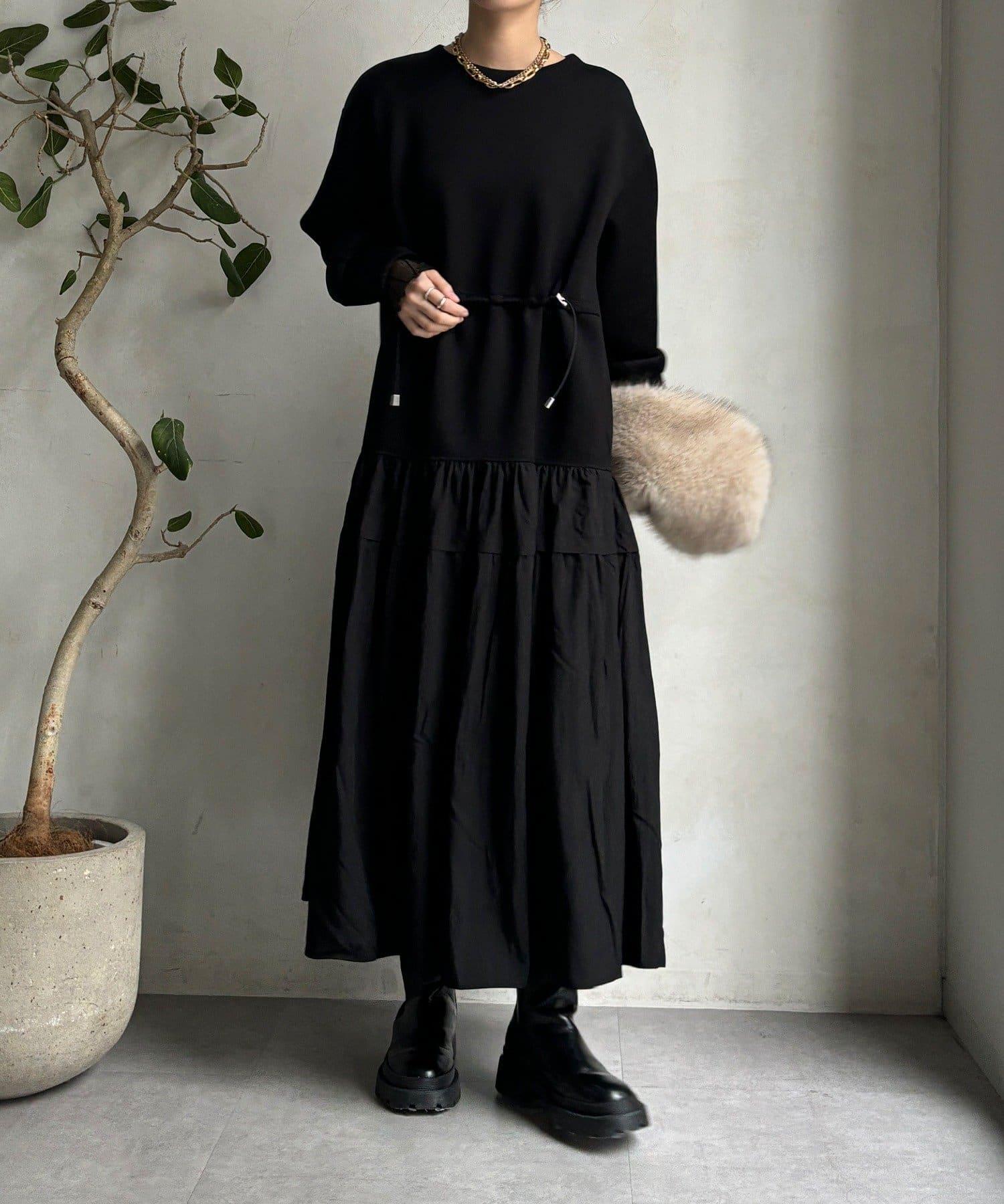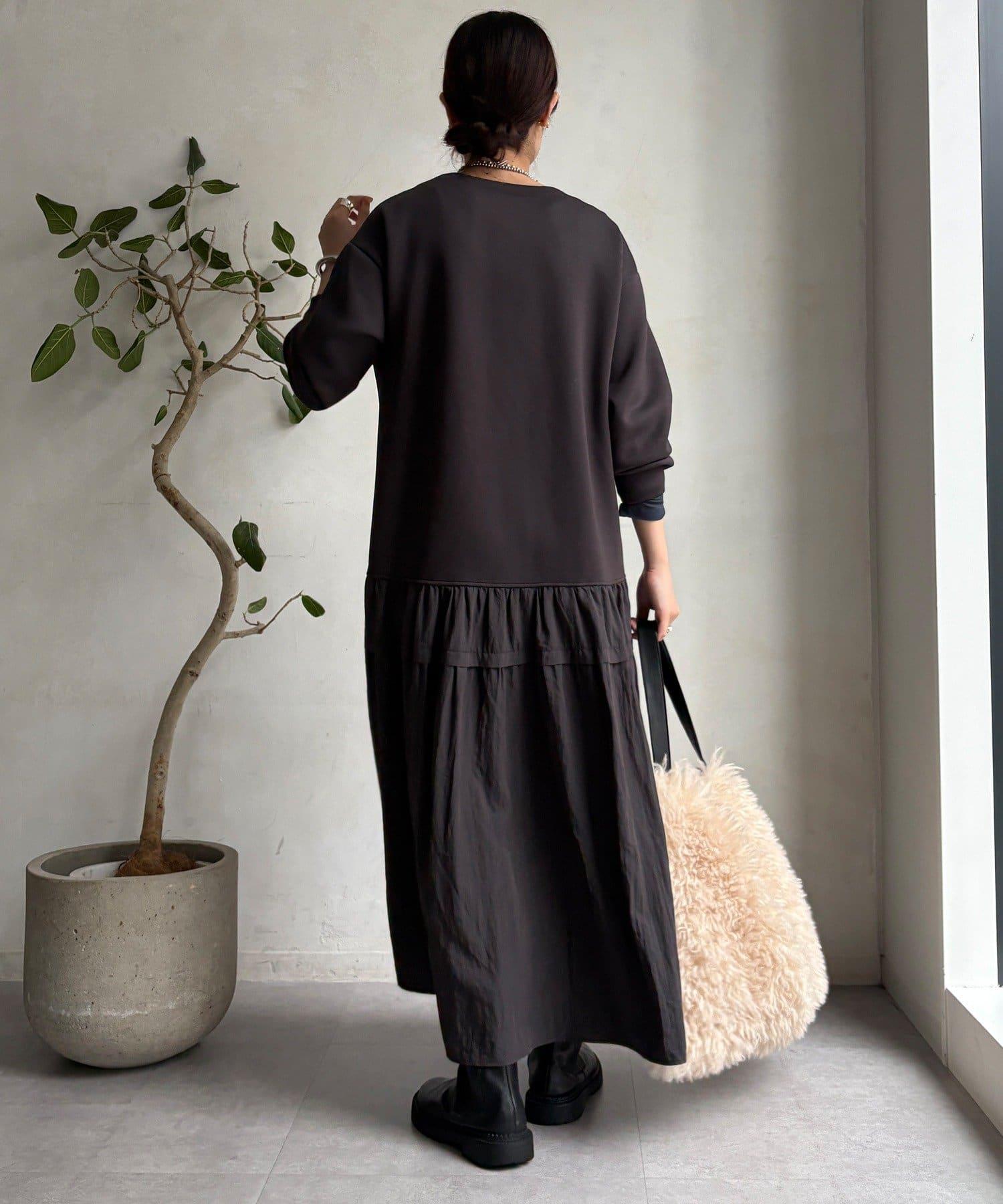 不同面料的變換帶來恰到好處的彈力和落差,增添了優雅的印象,使這款連衣裙成為適用於各種場合的百搭連衣裙。
