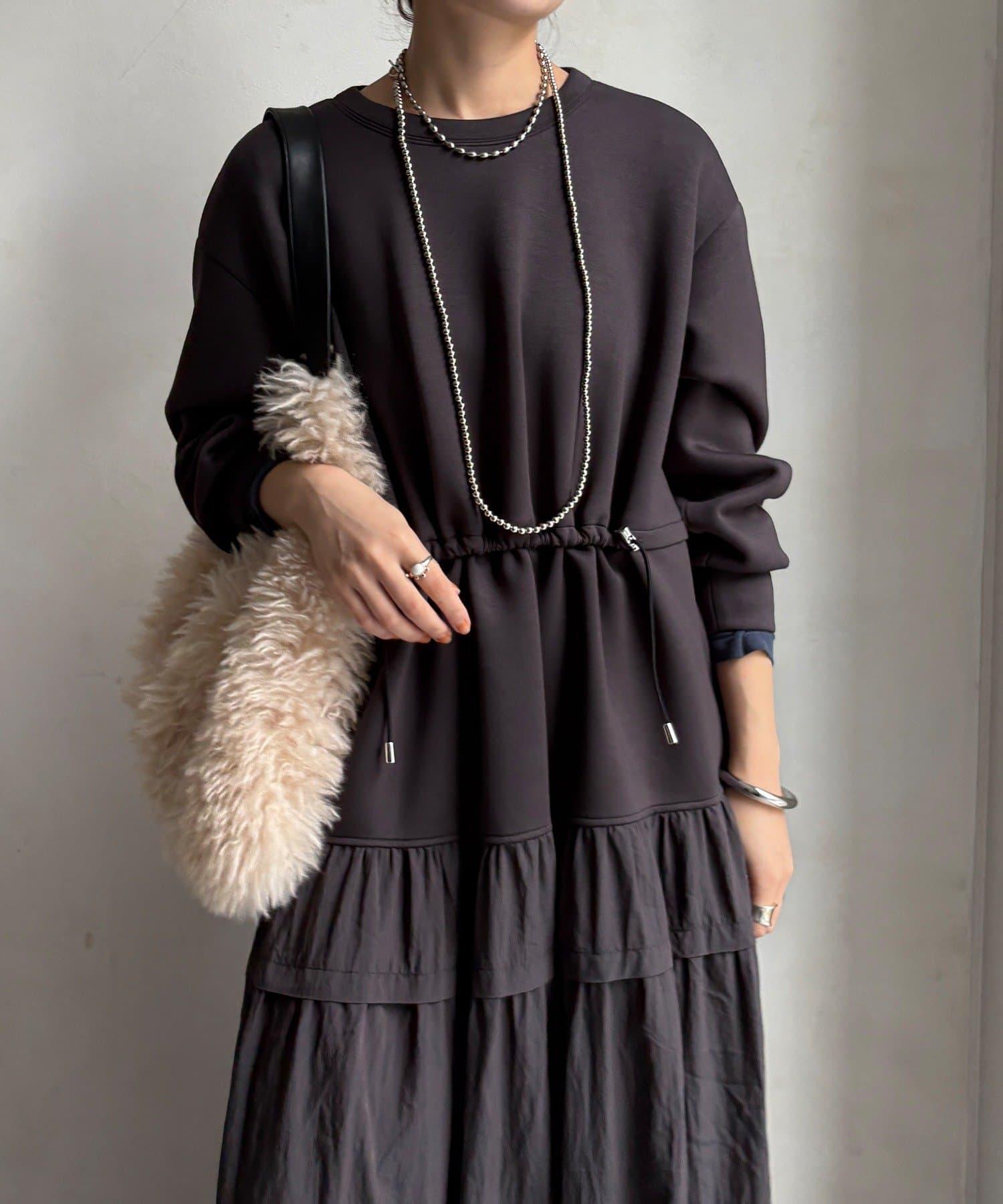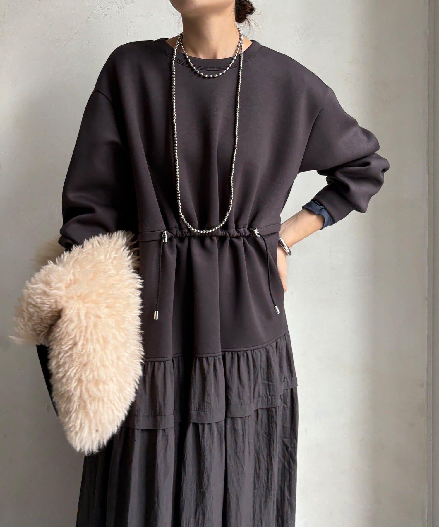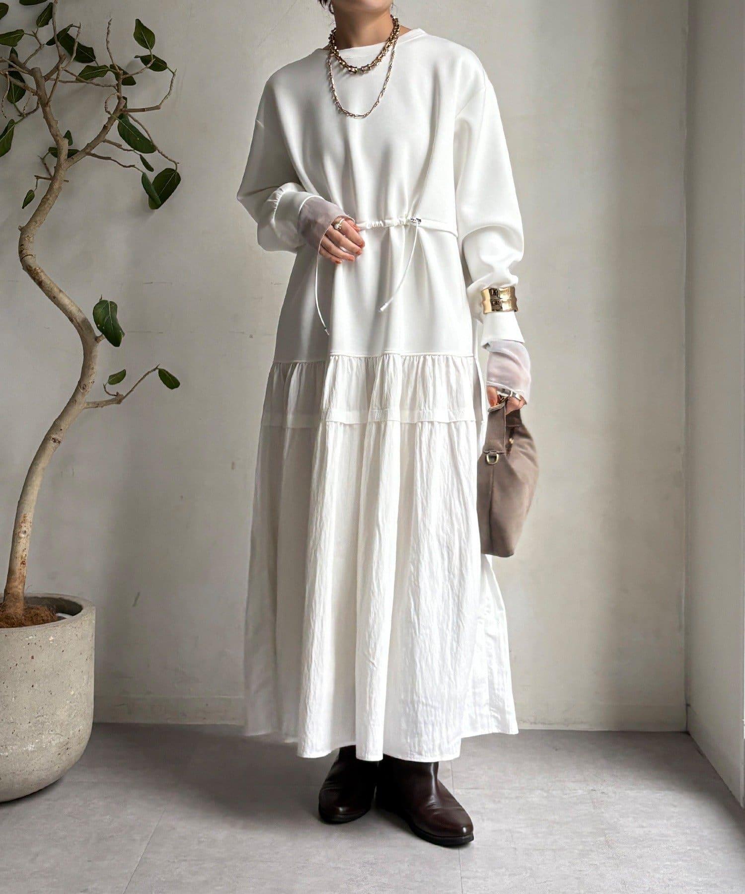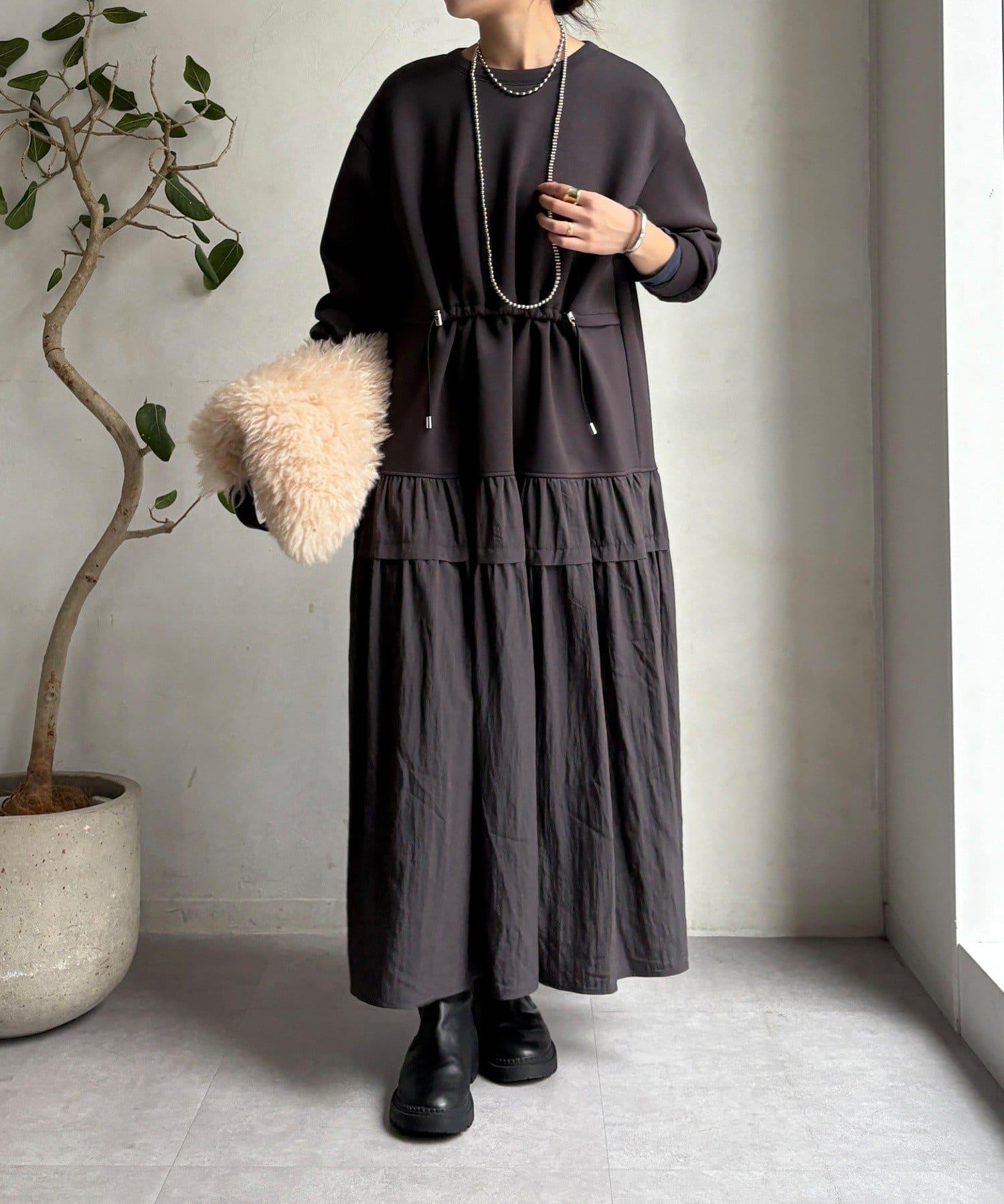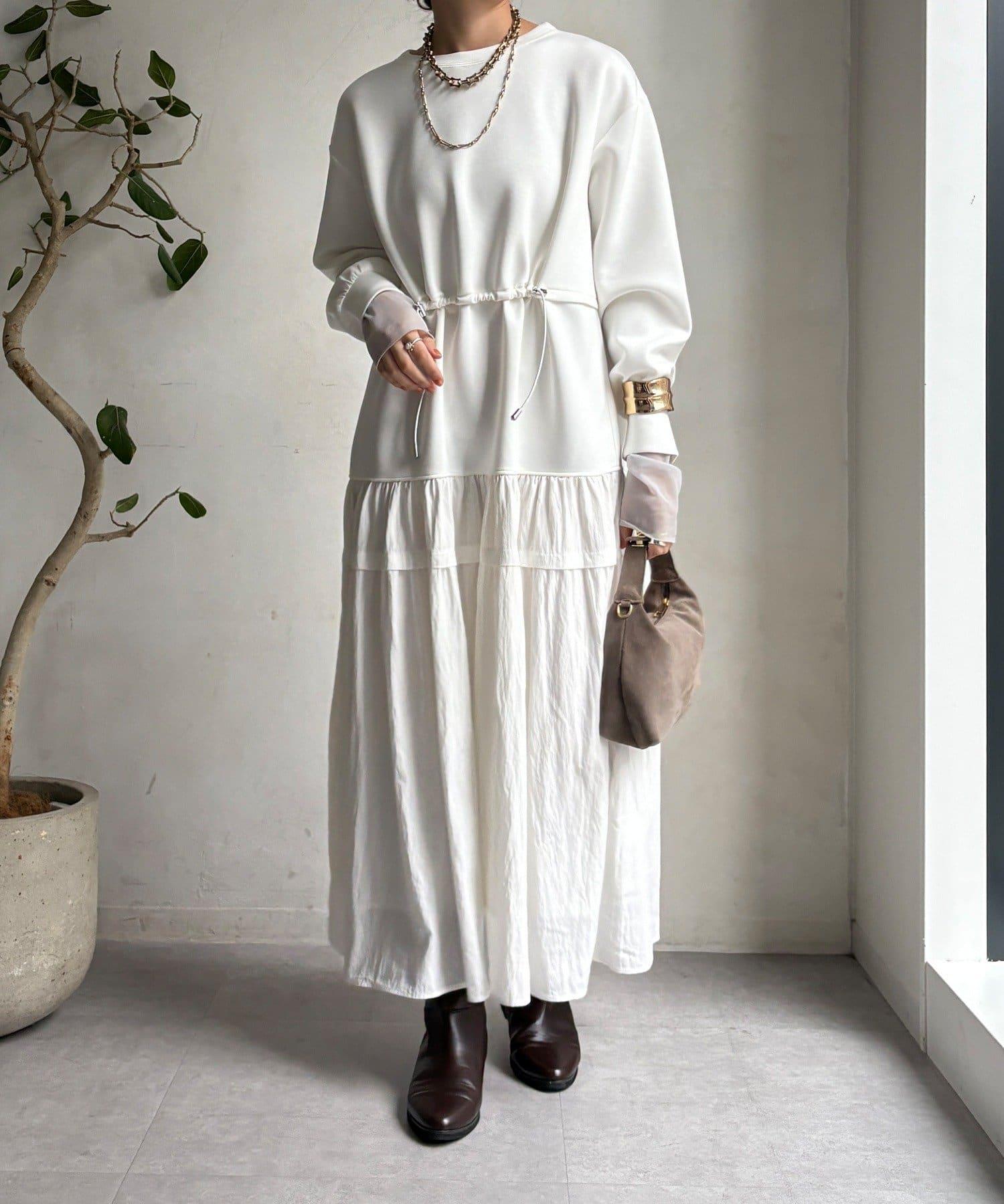 不同面料的變換帶來恰到好處的彈力和落差,增添了優雅的印象,使這款連衣裙成為適用於各種場合的百搭連衣裙。