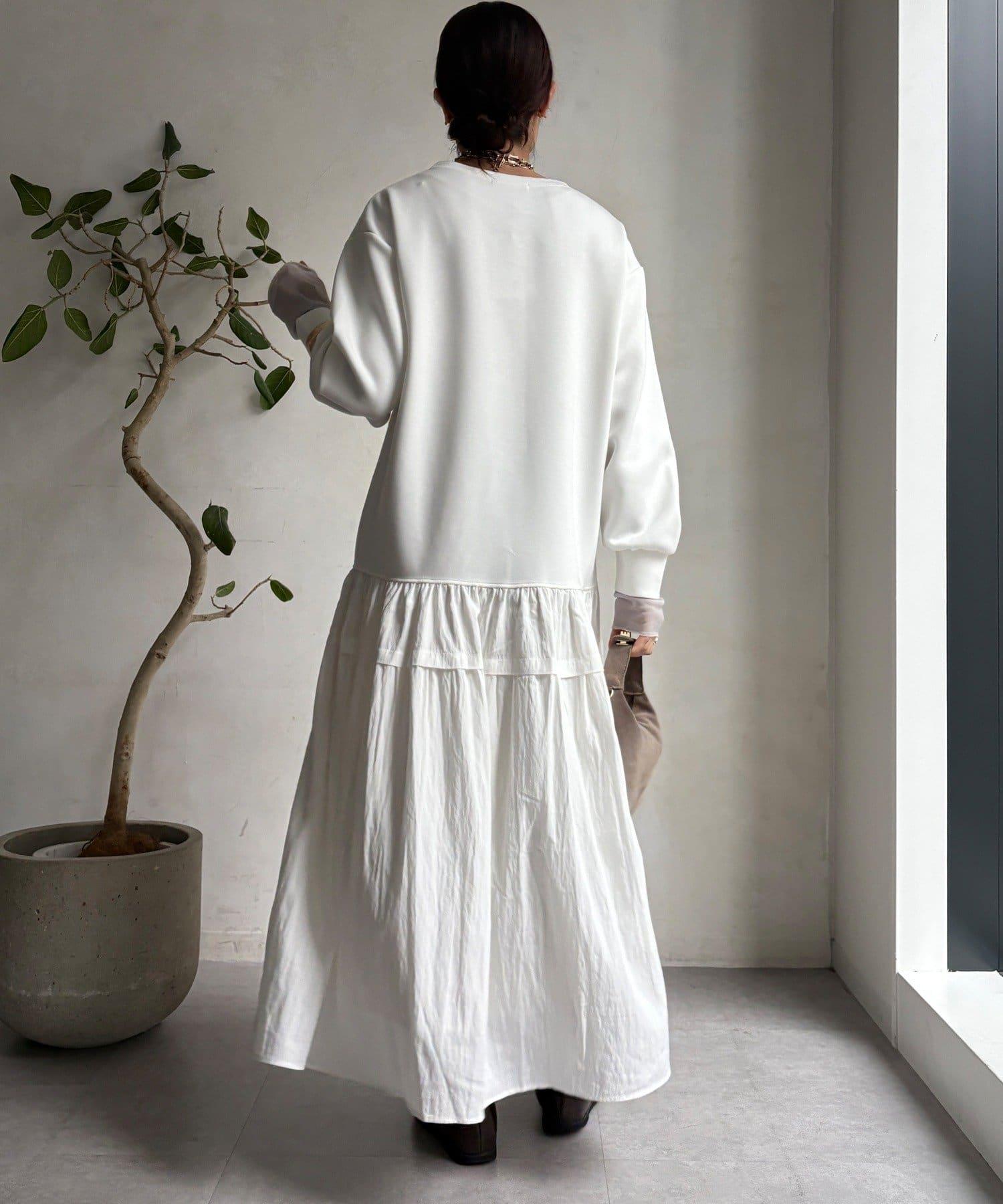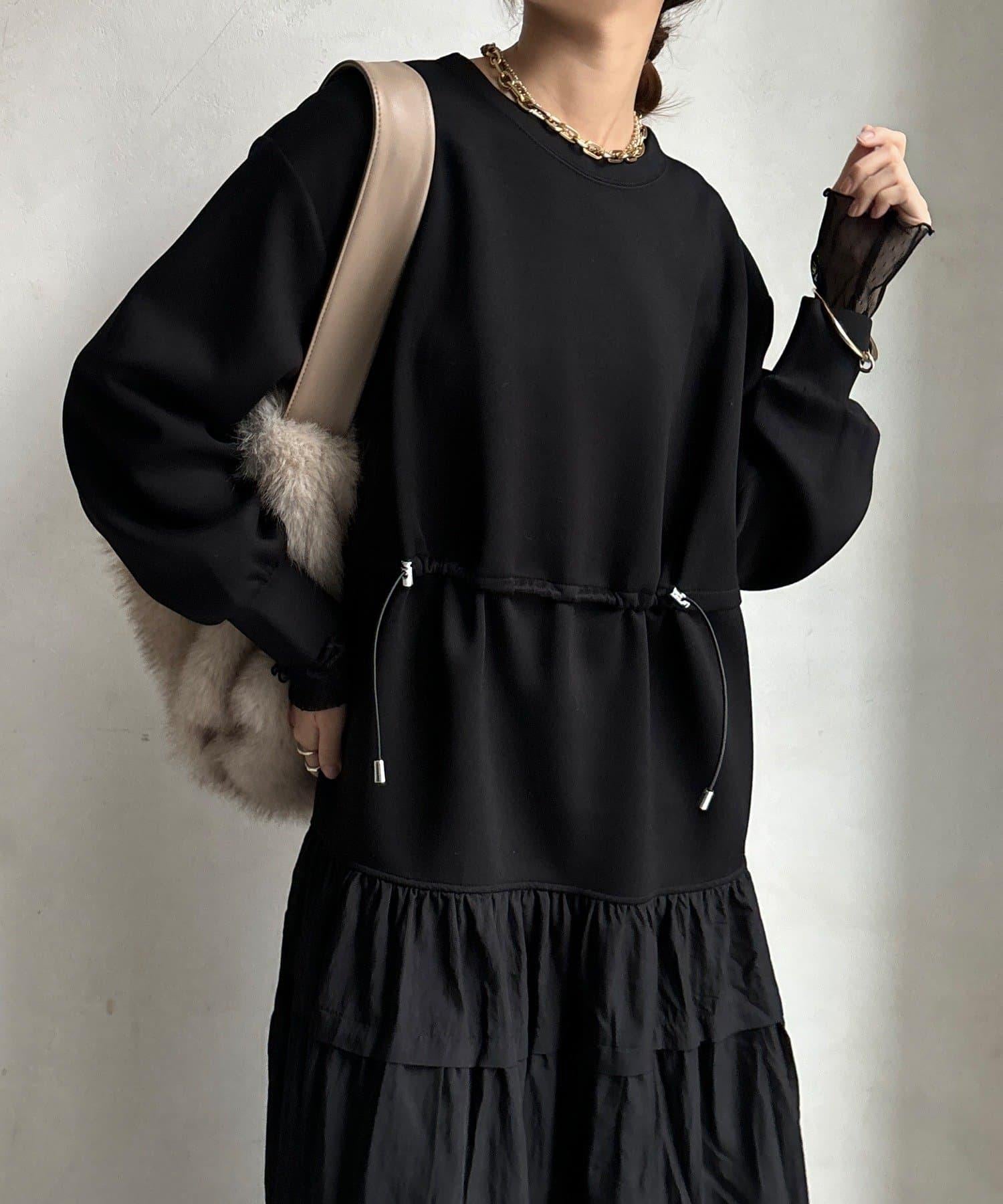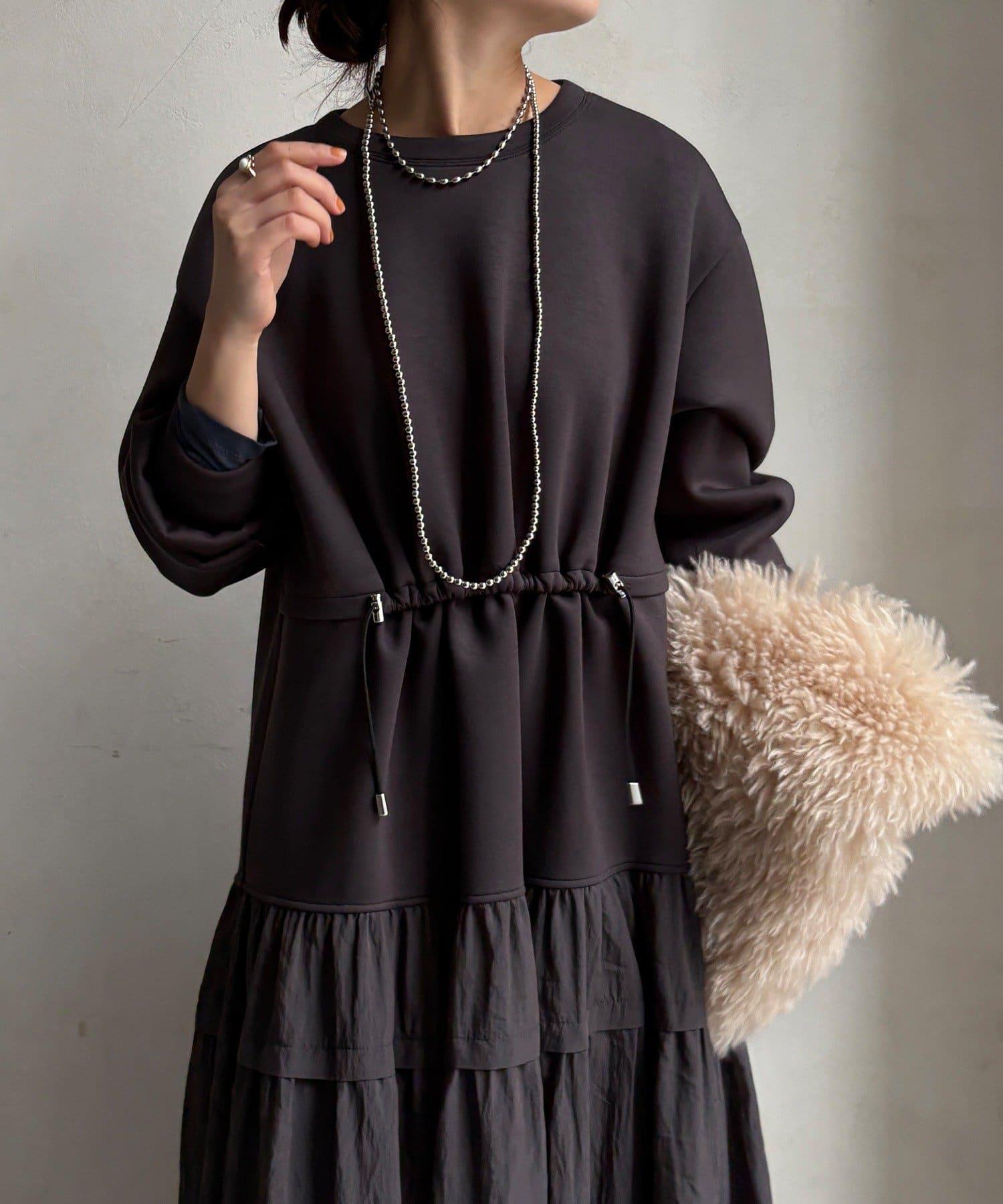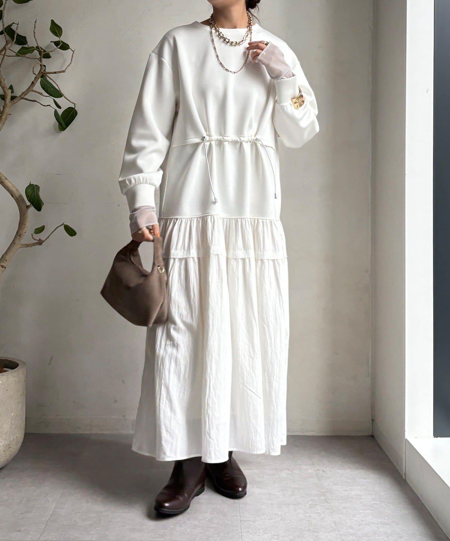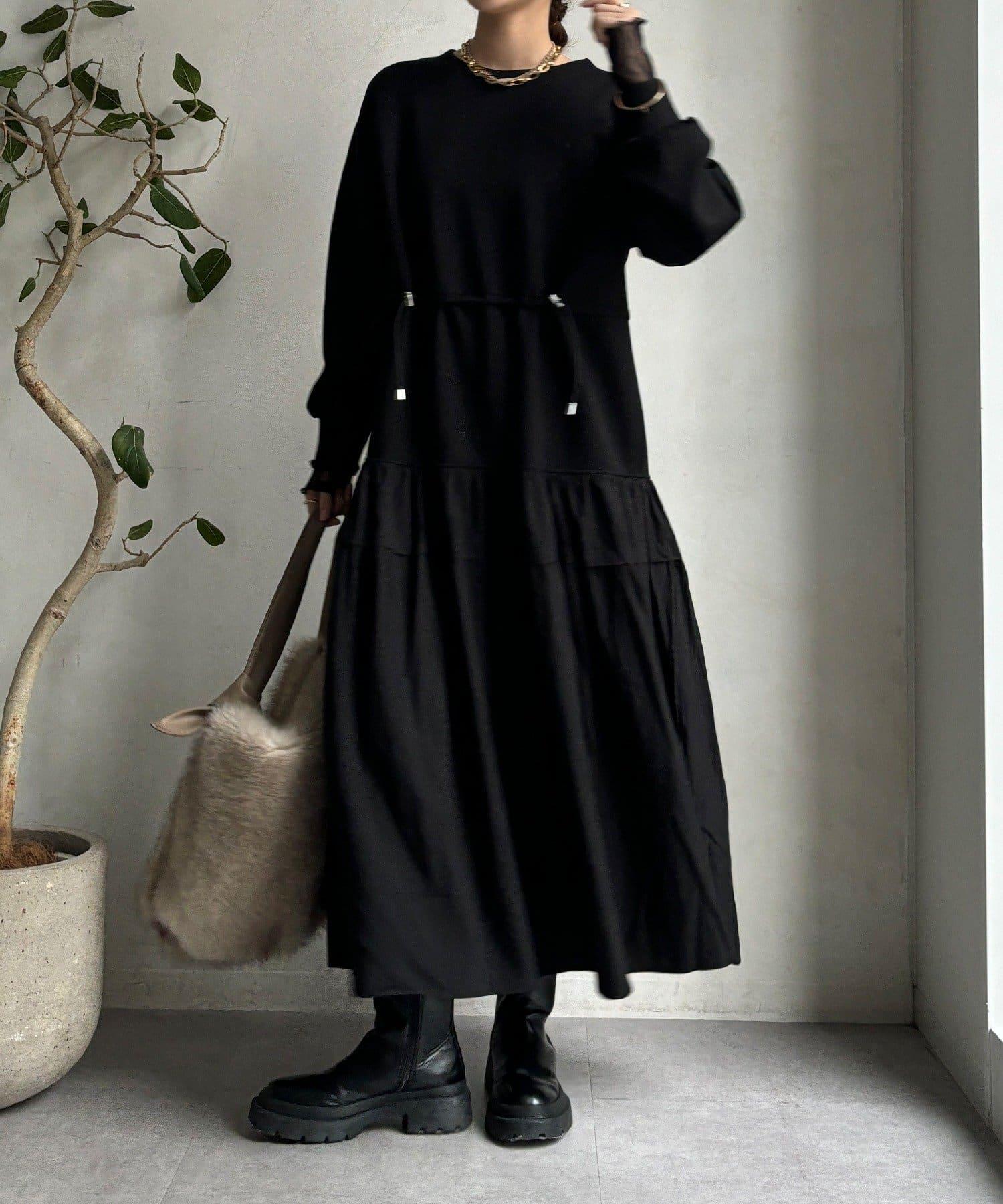 不同面料的變換帶來恰到好處的彈力和落差,增添了優雅的印象,使這款連衣裙成為適用於各種場合的百搭連衣裙。