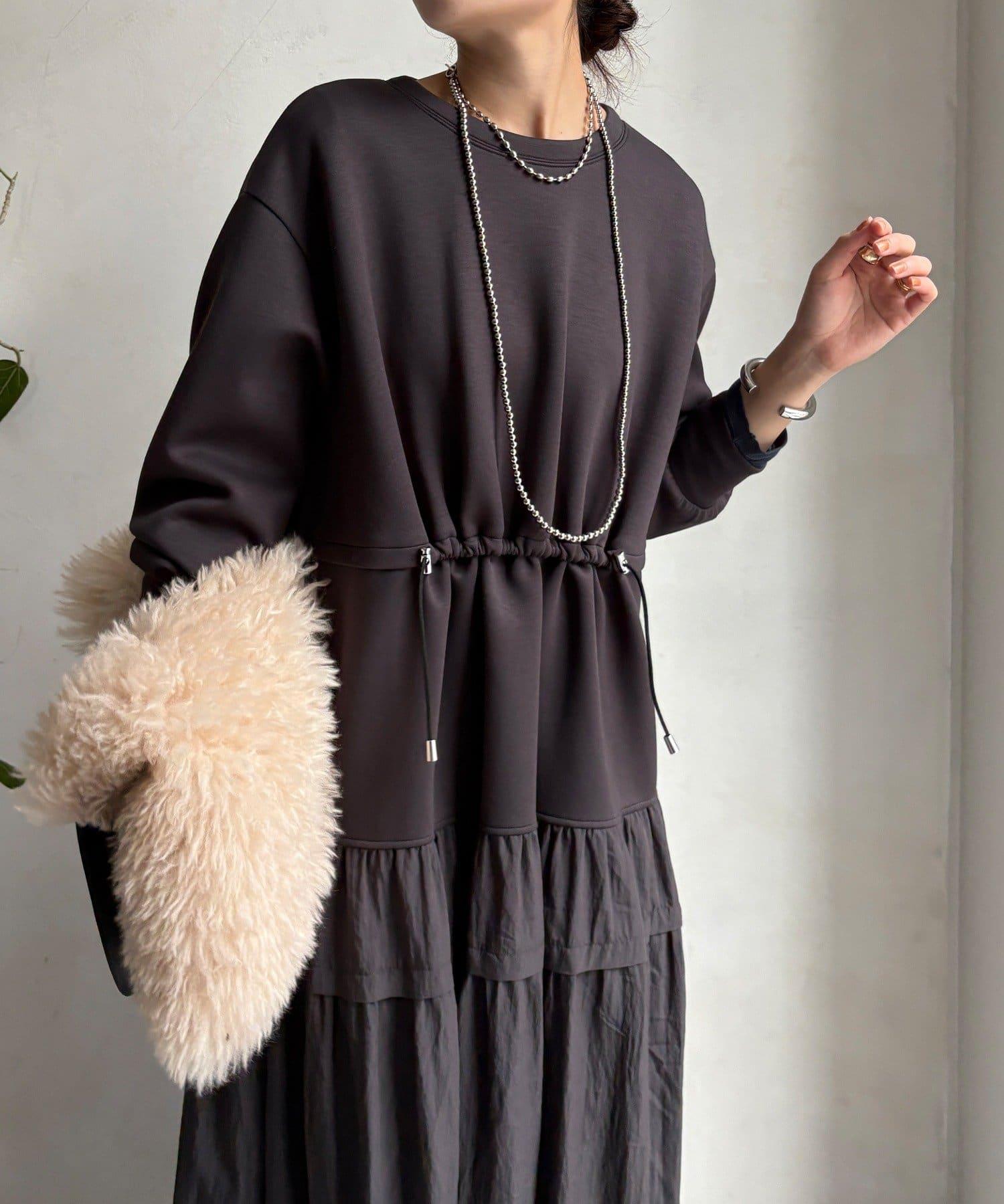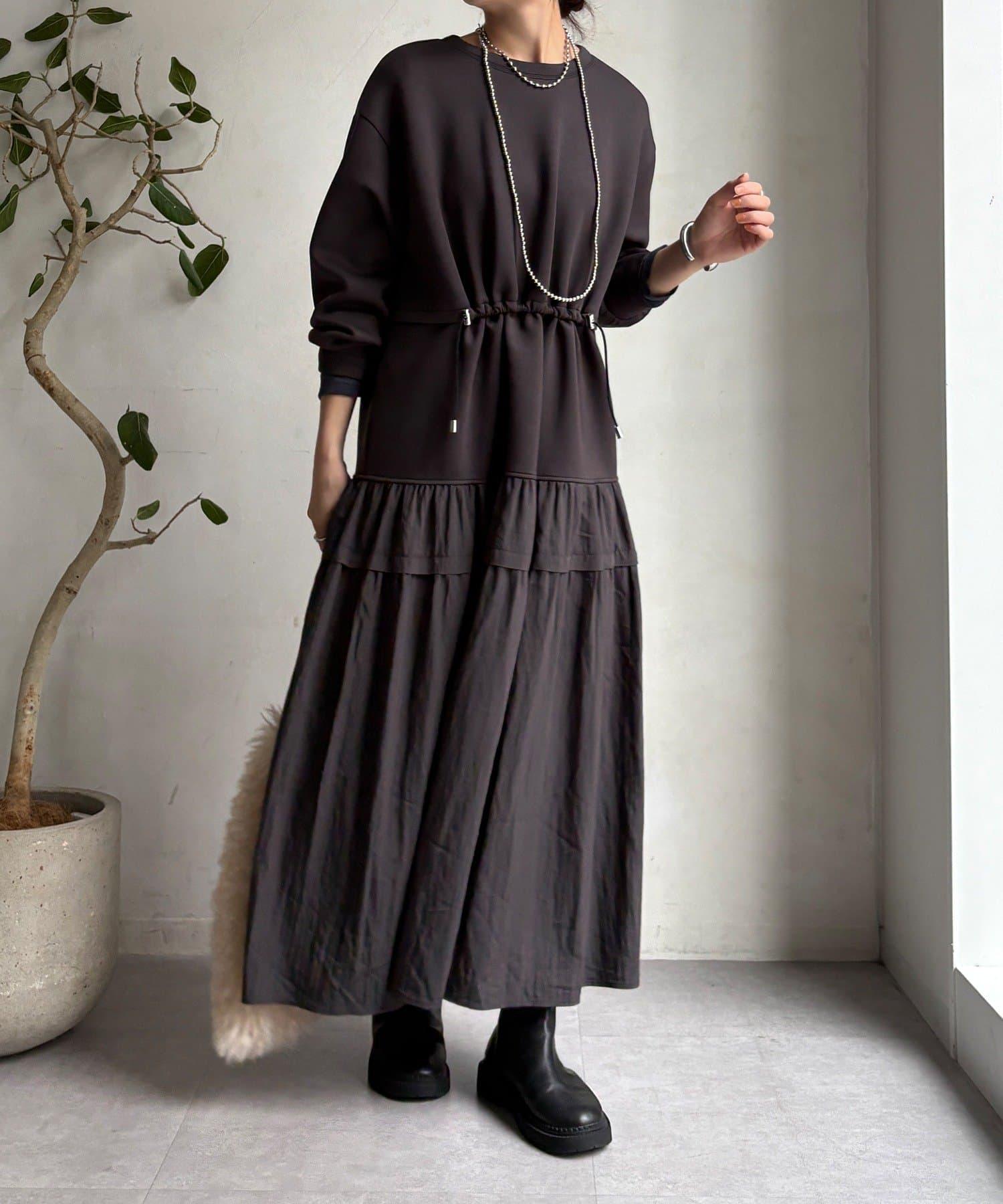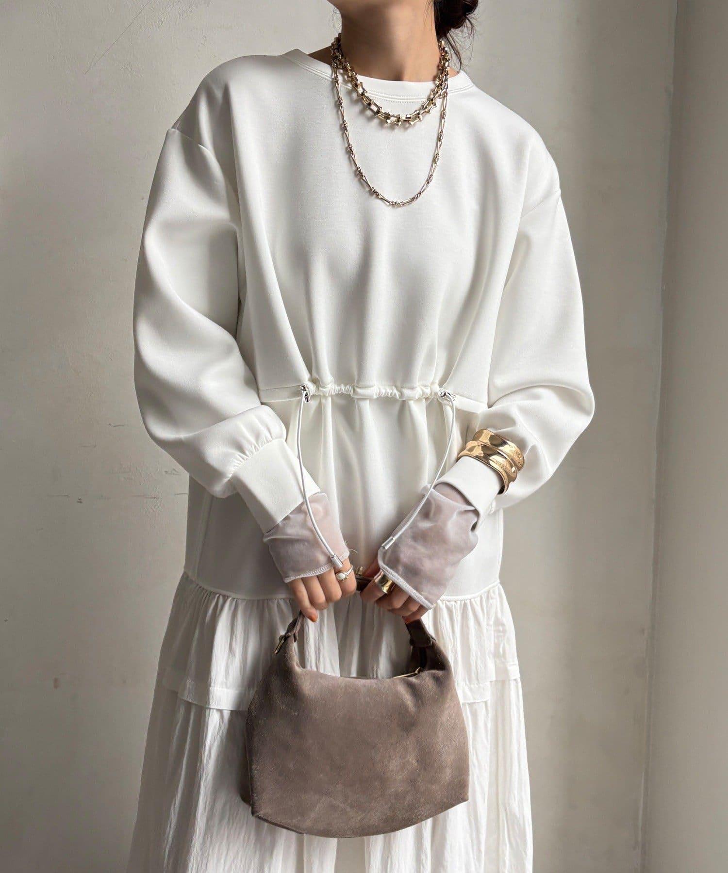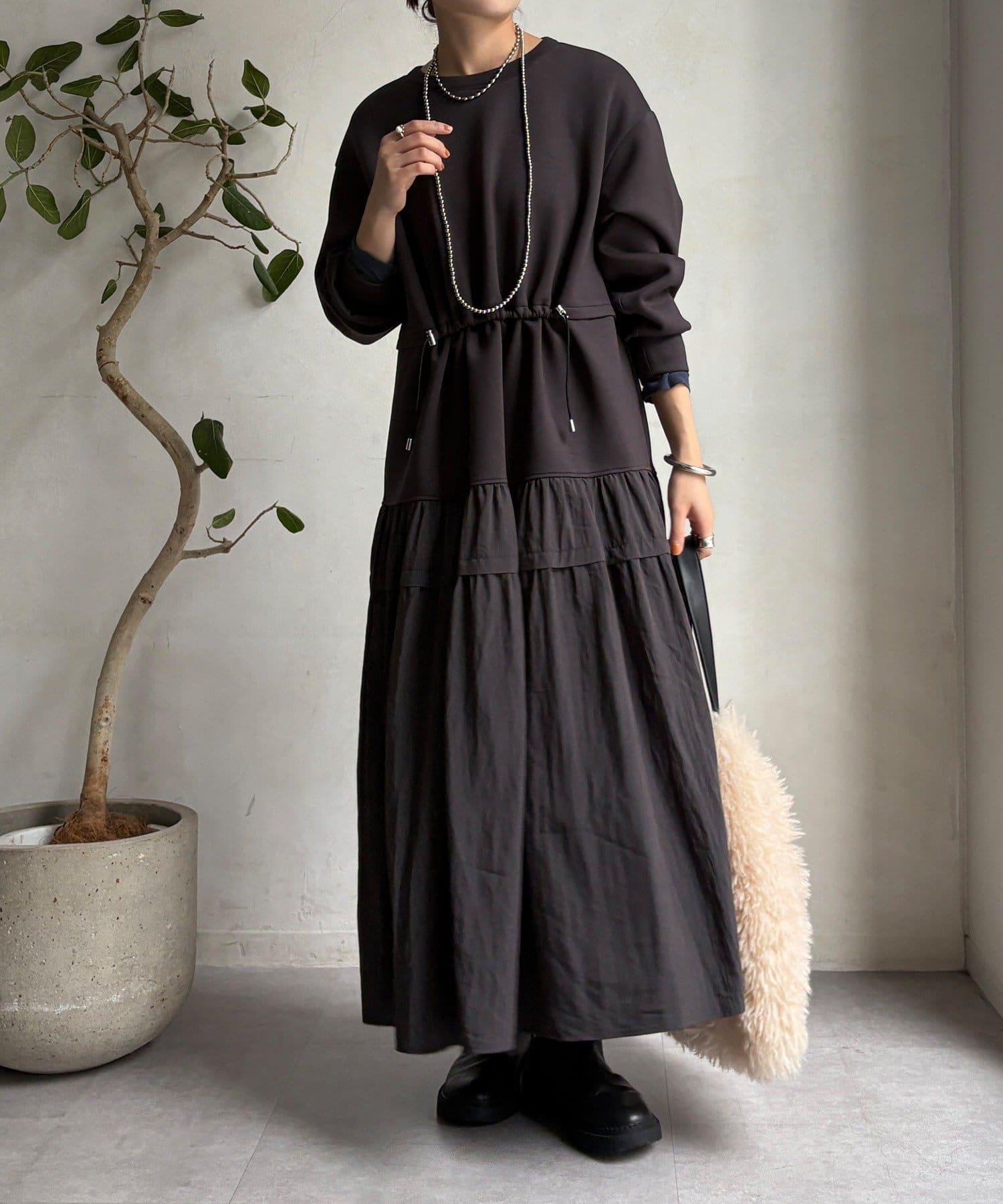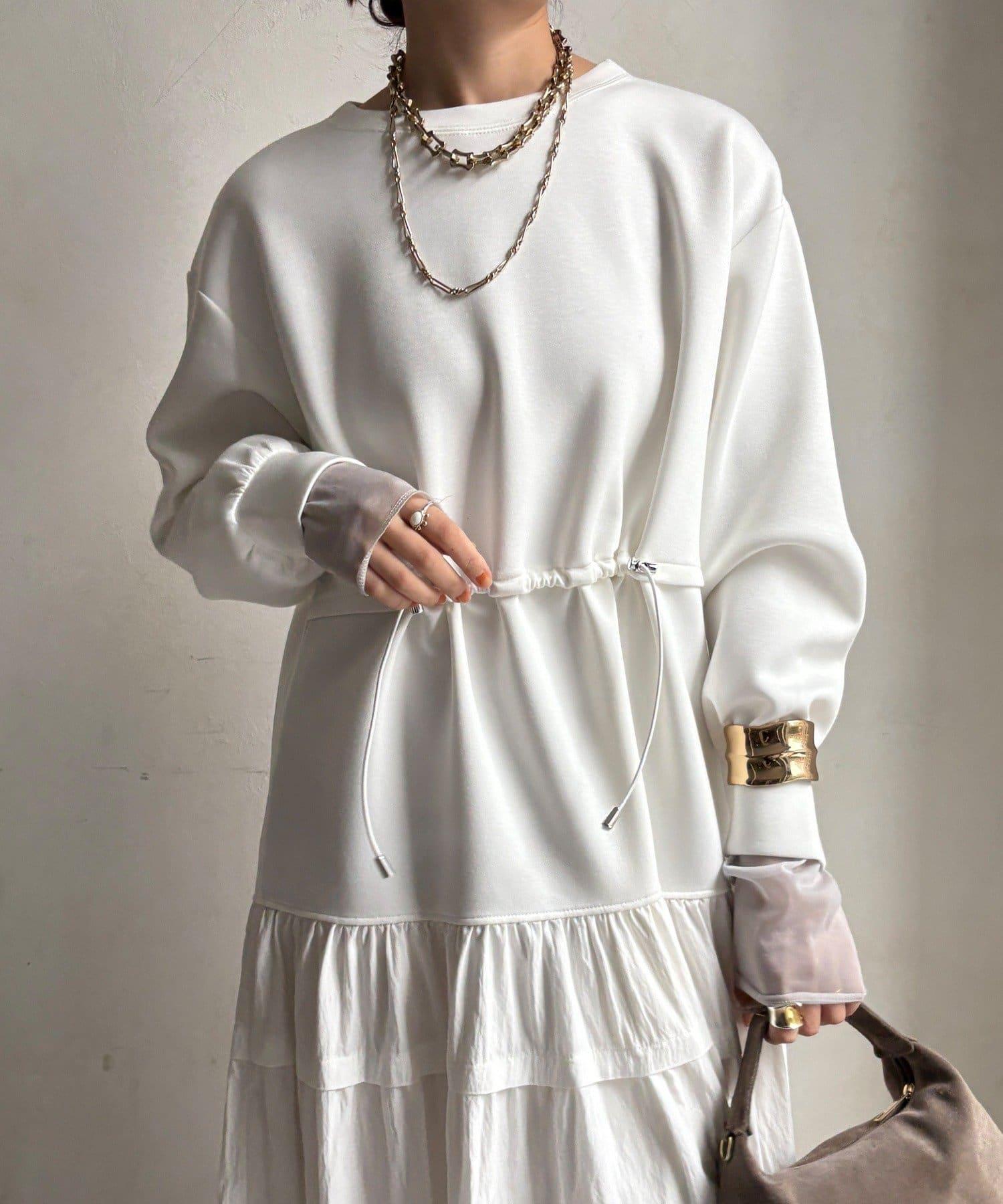 不同面料的變換帶來恰到好處的彈力和落差,增添了優雅的印象,使這款連衣裙成為適用於各種場合的百搭連衣裙。