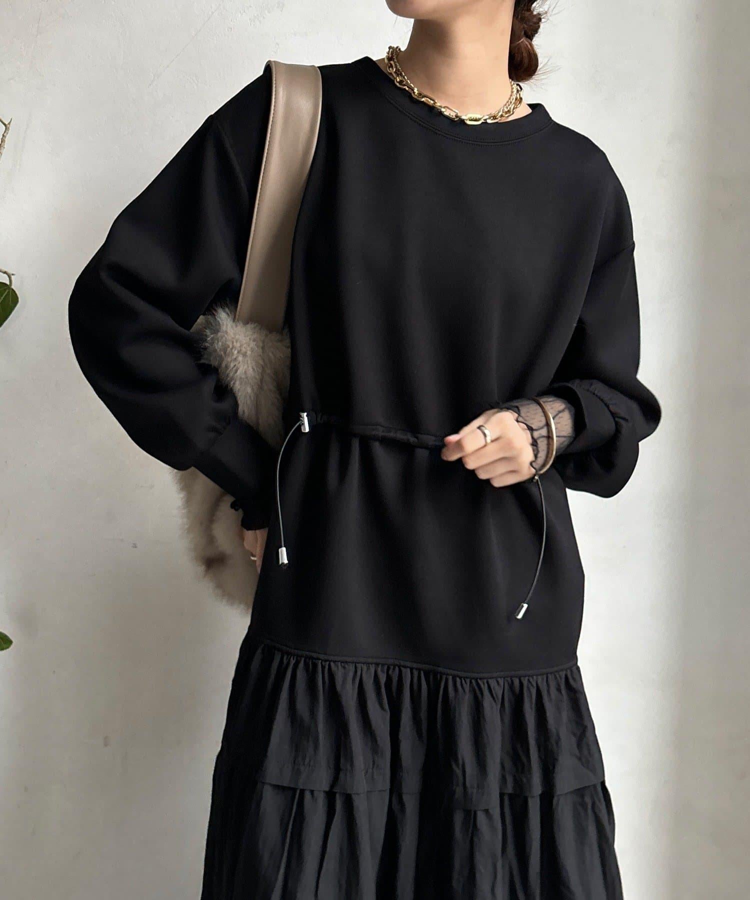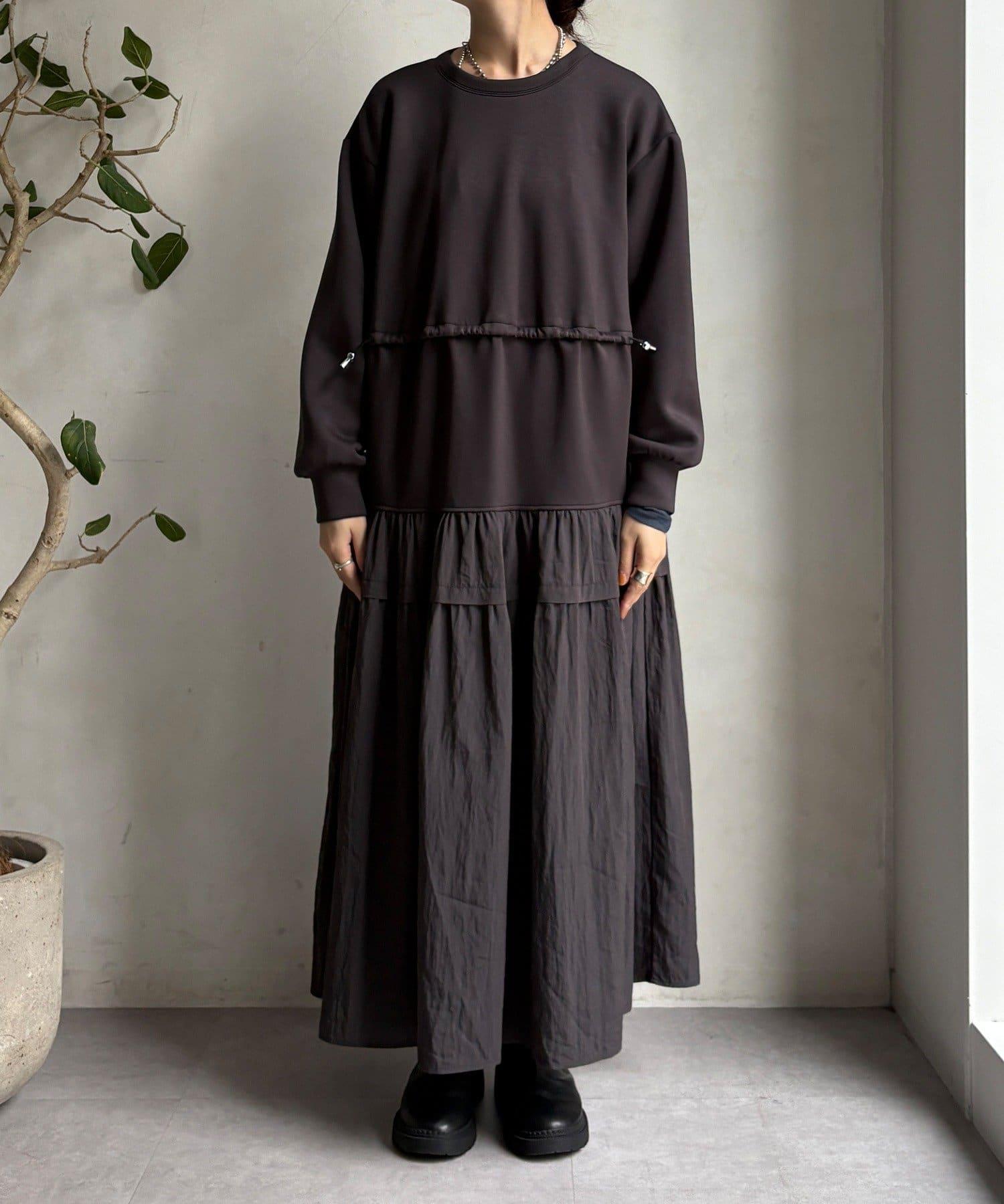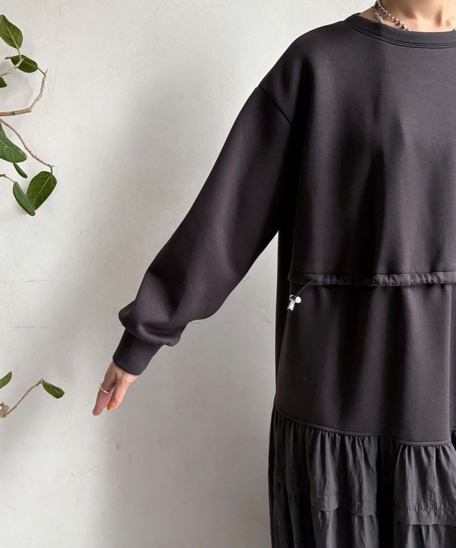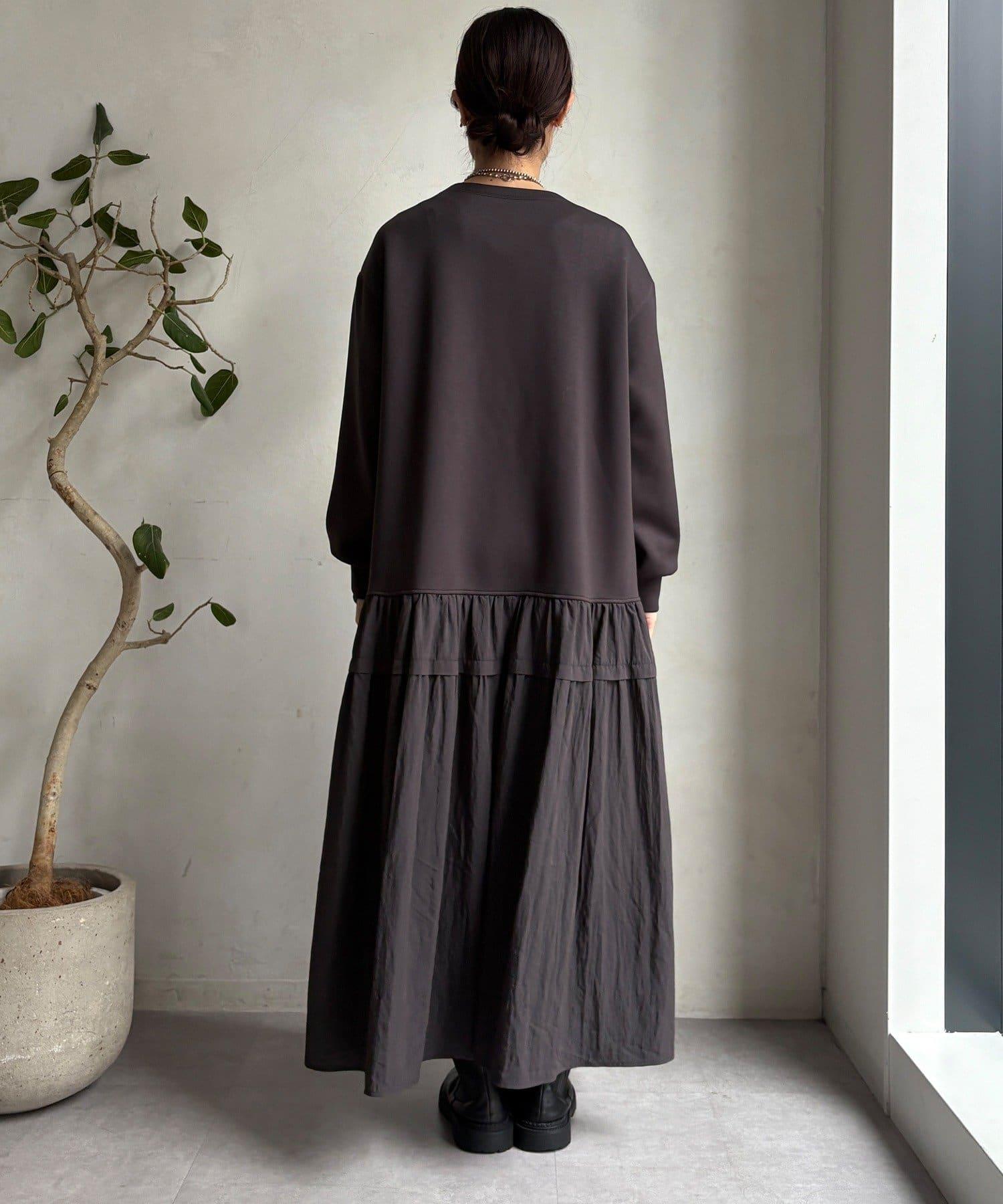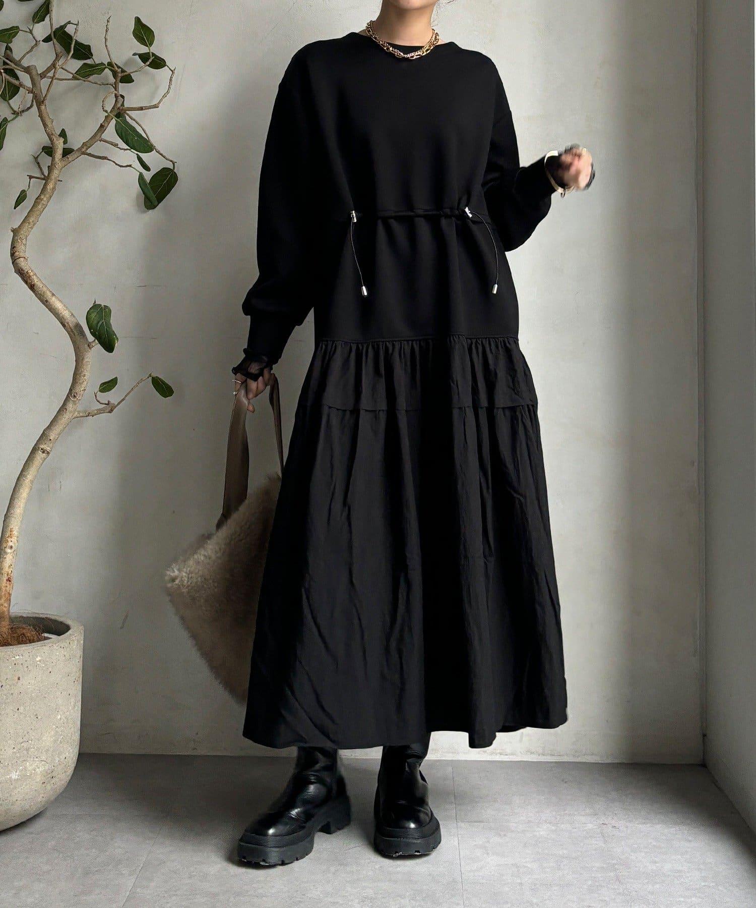 不同面料的變換帶來恰到好處的彈力和落差,增添了優雅的印象,使這款連衣裙成為適用於各種場合的百搭連衣裙。