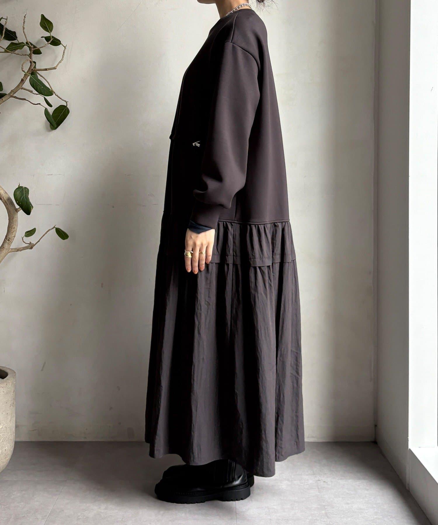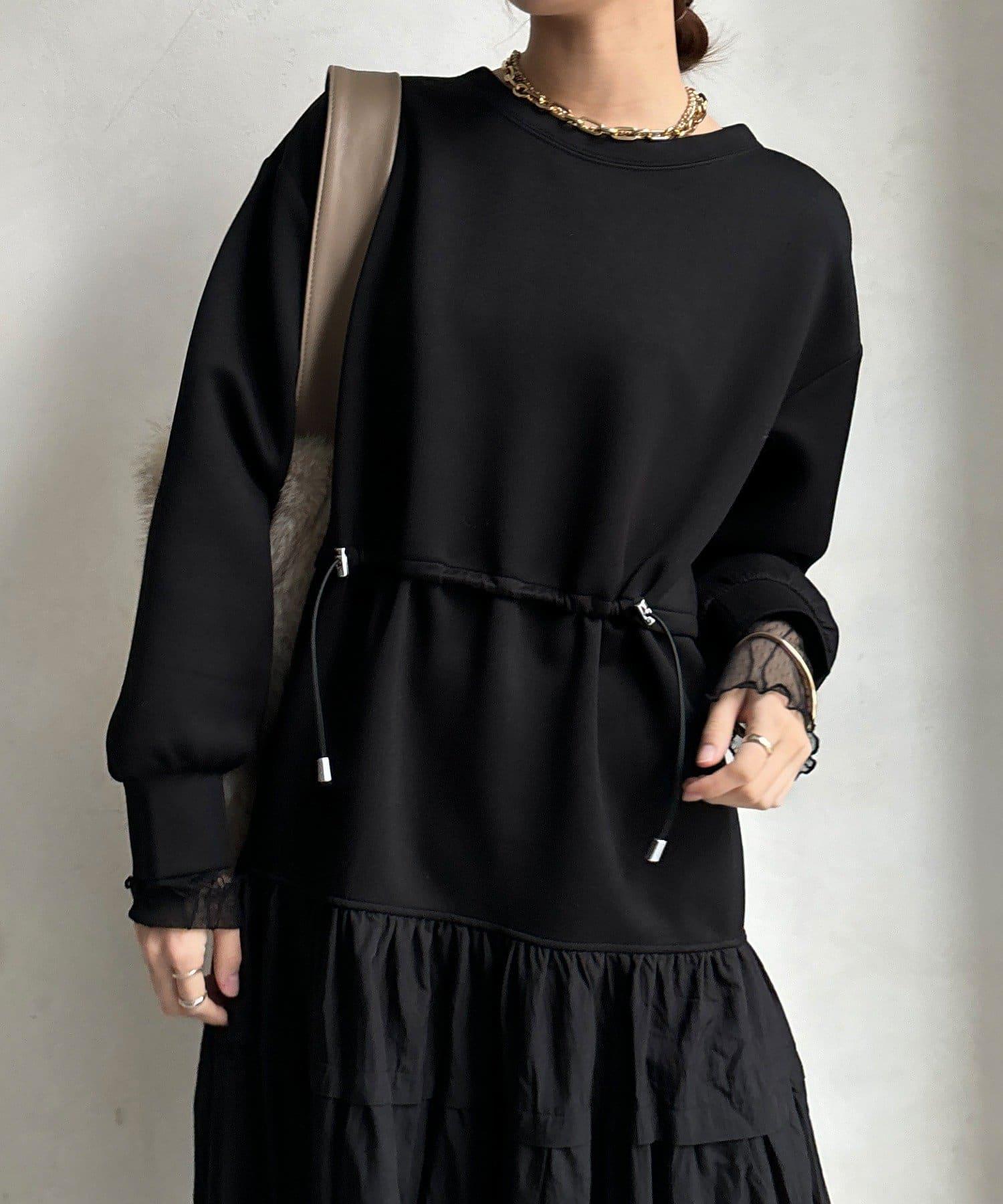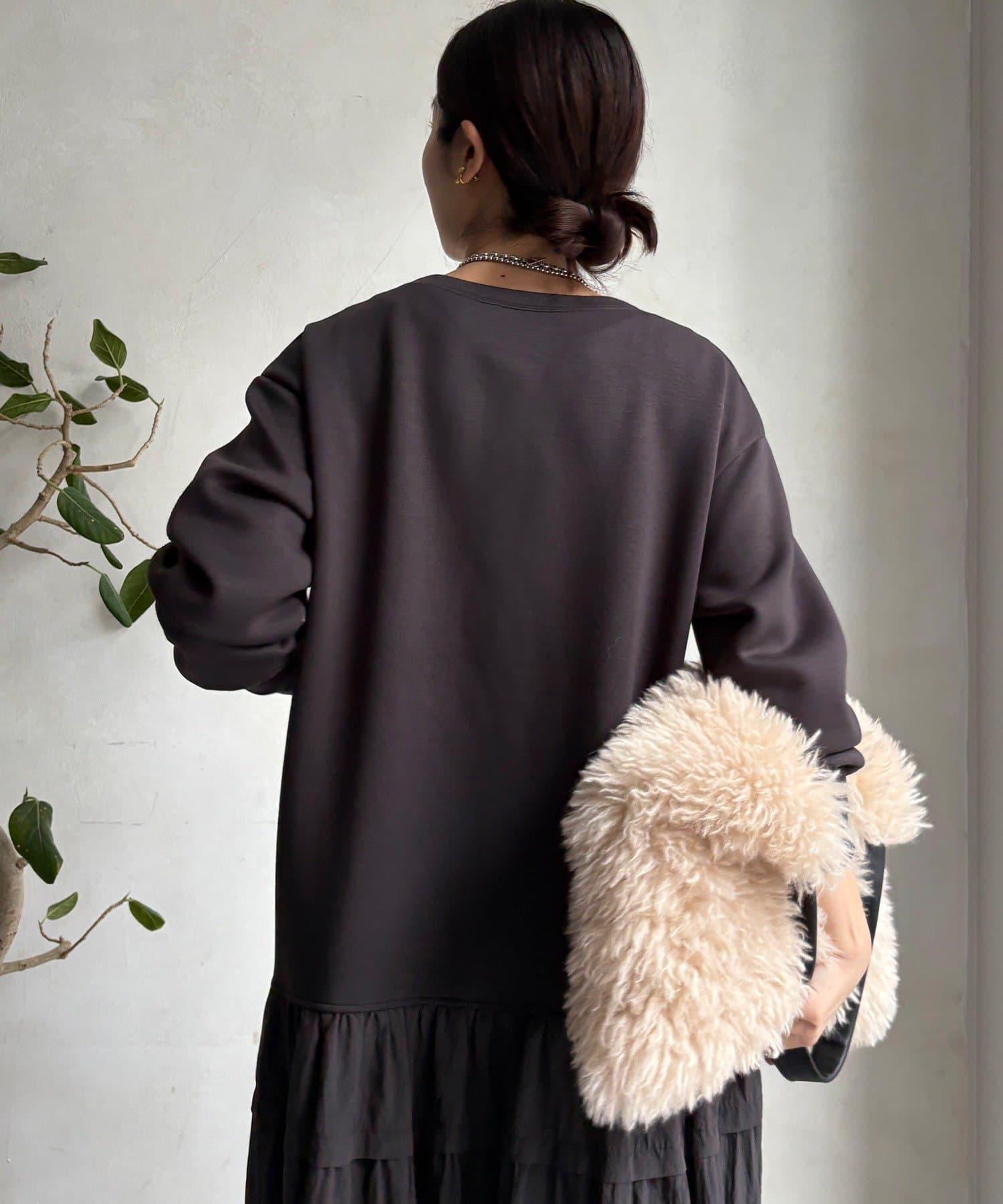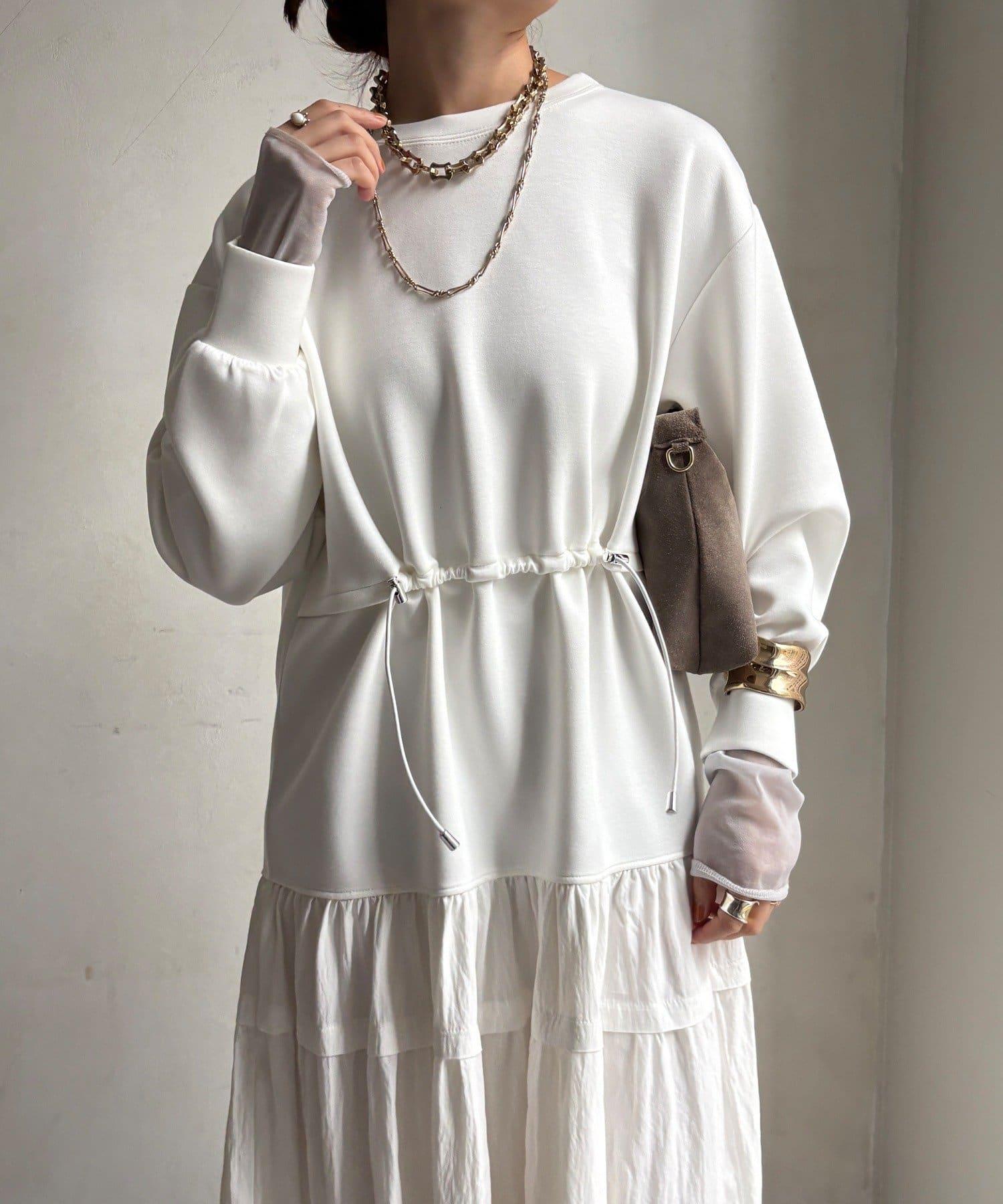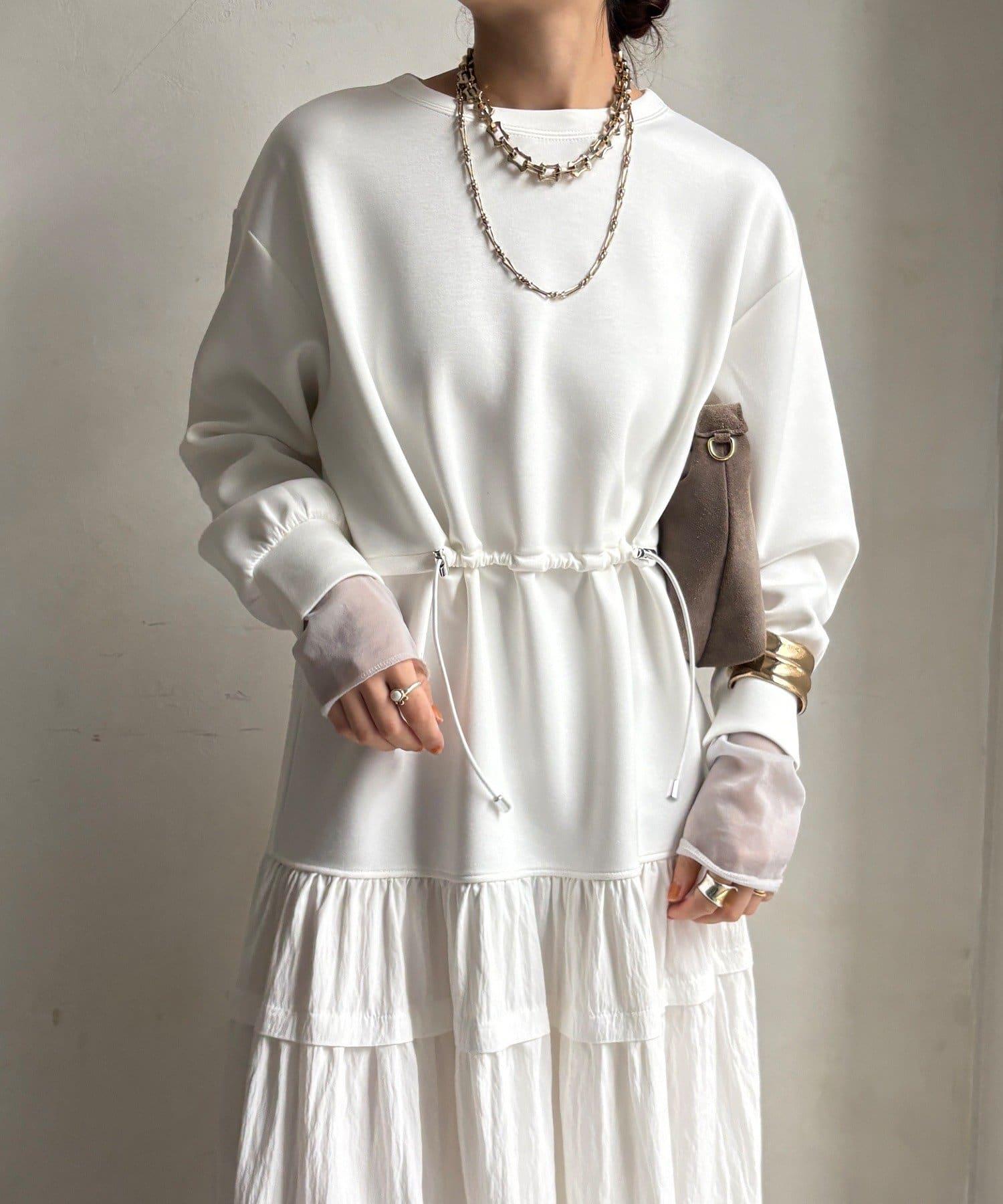 不同面料的變換帶來恰到好處的彈力和落差,增添了優雅的印象,使這款連衣裙成為適用於各種場合的百搭連衣裙。