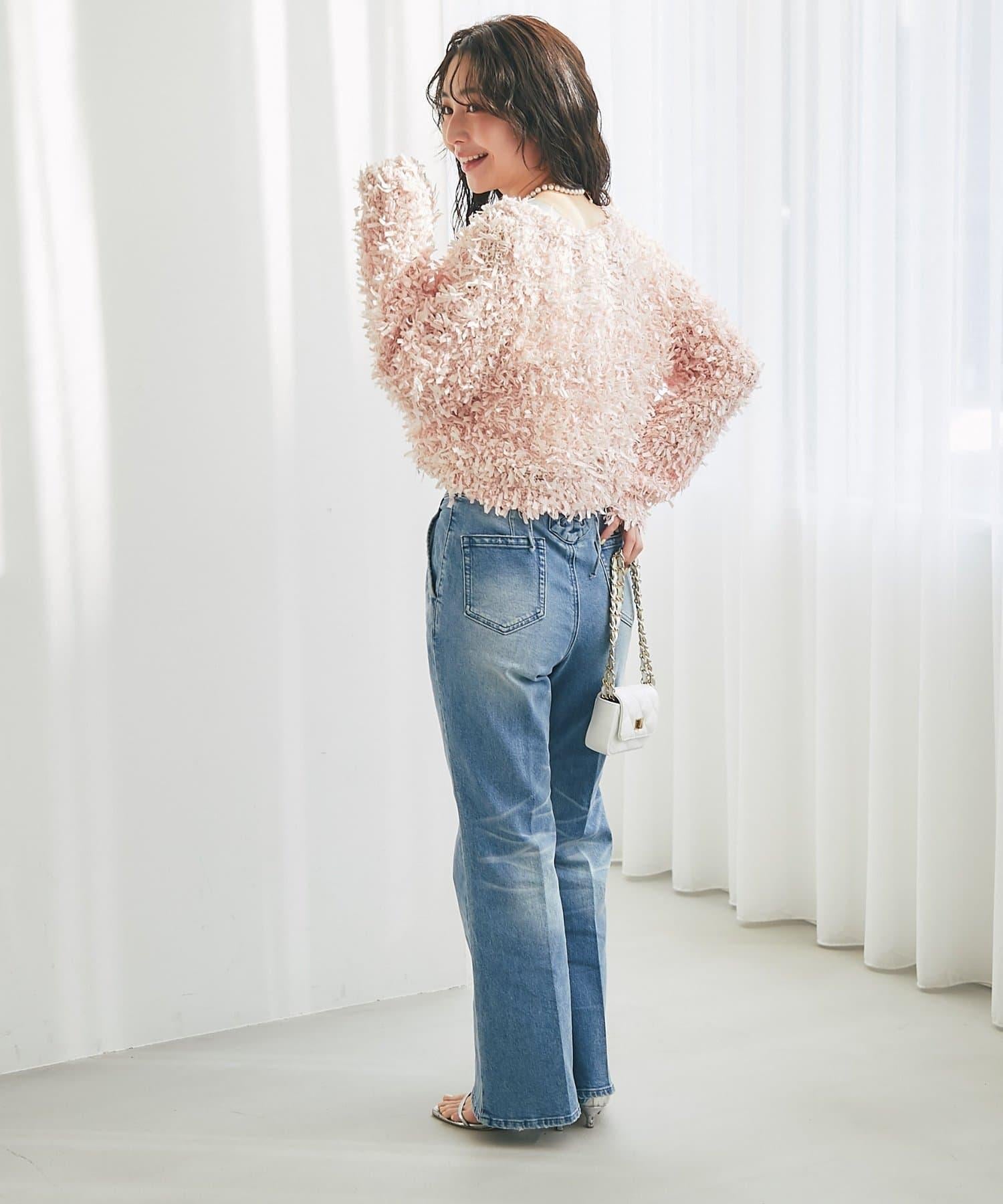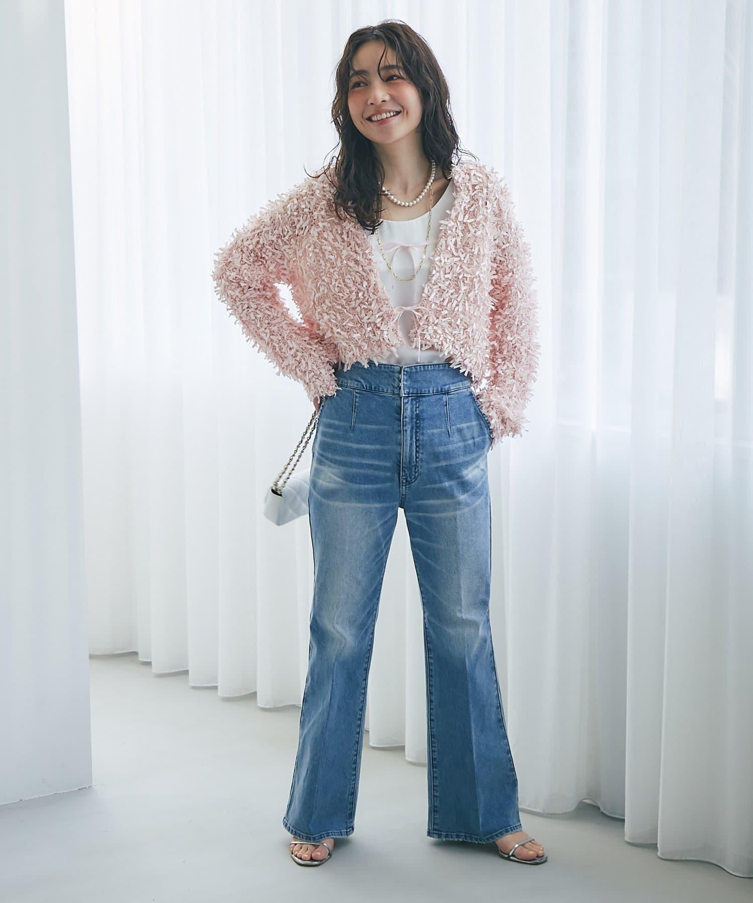 與牛仔褲搭配,打造成人休閒造型,凸顯蓬鬆材質。