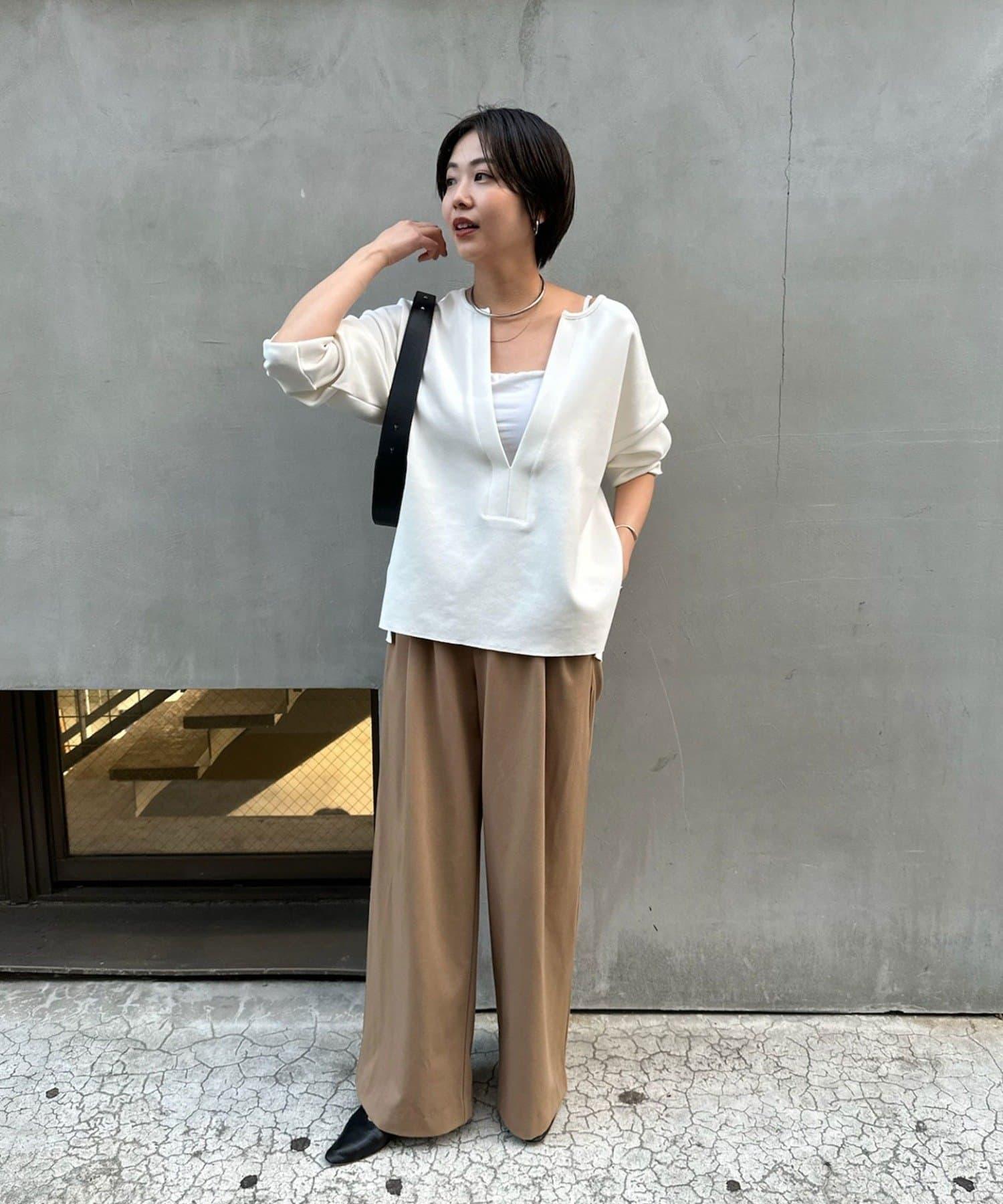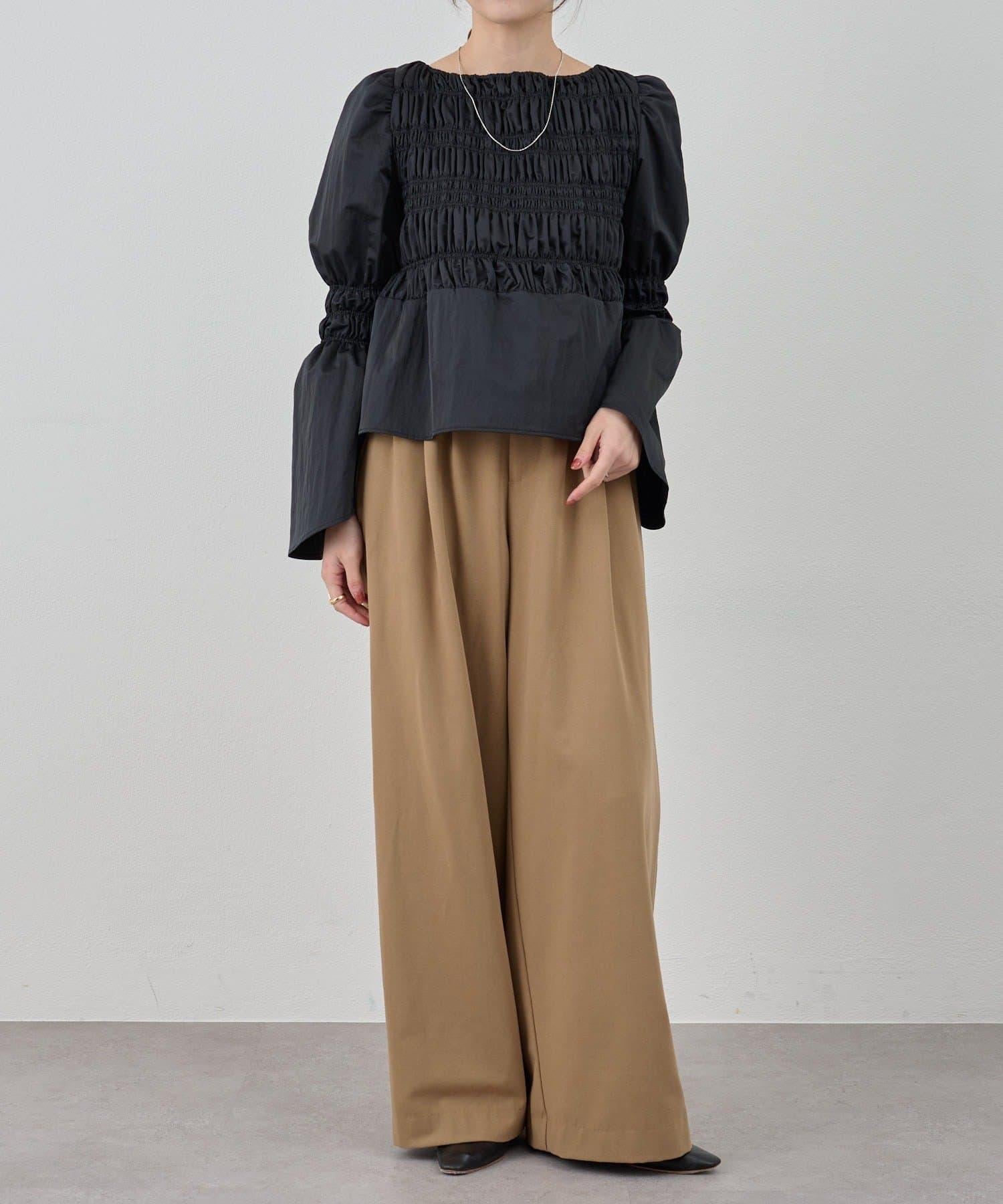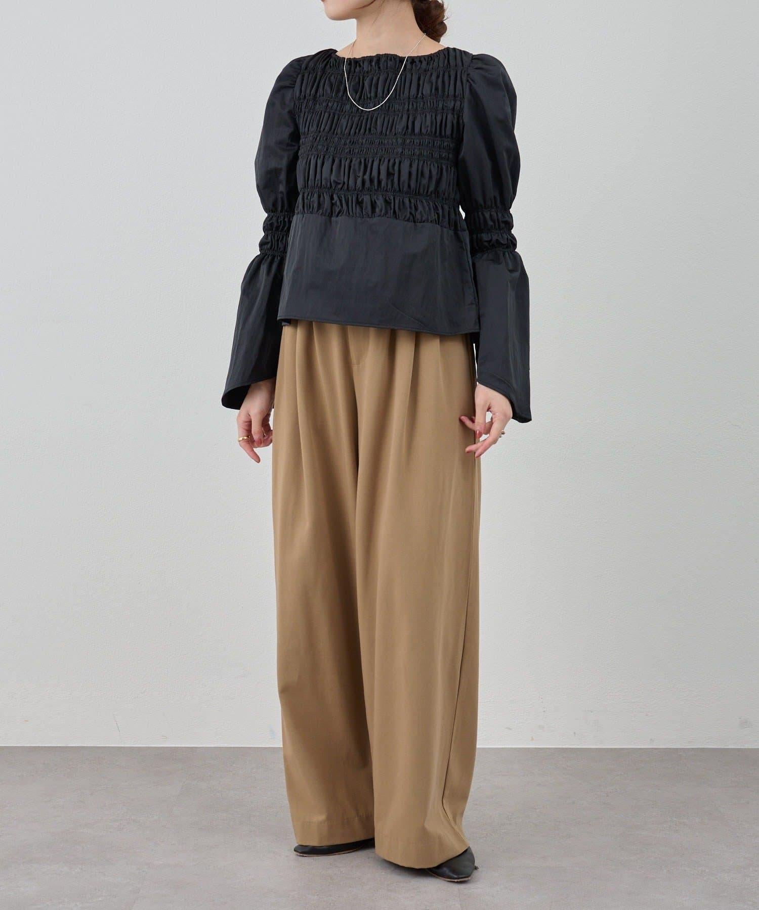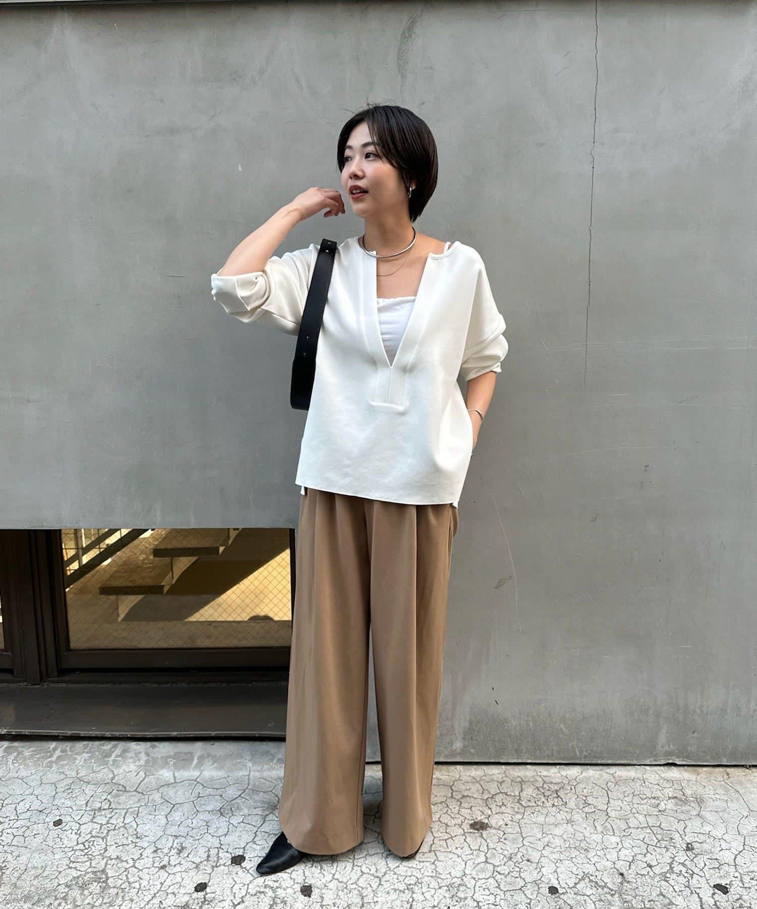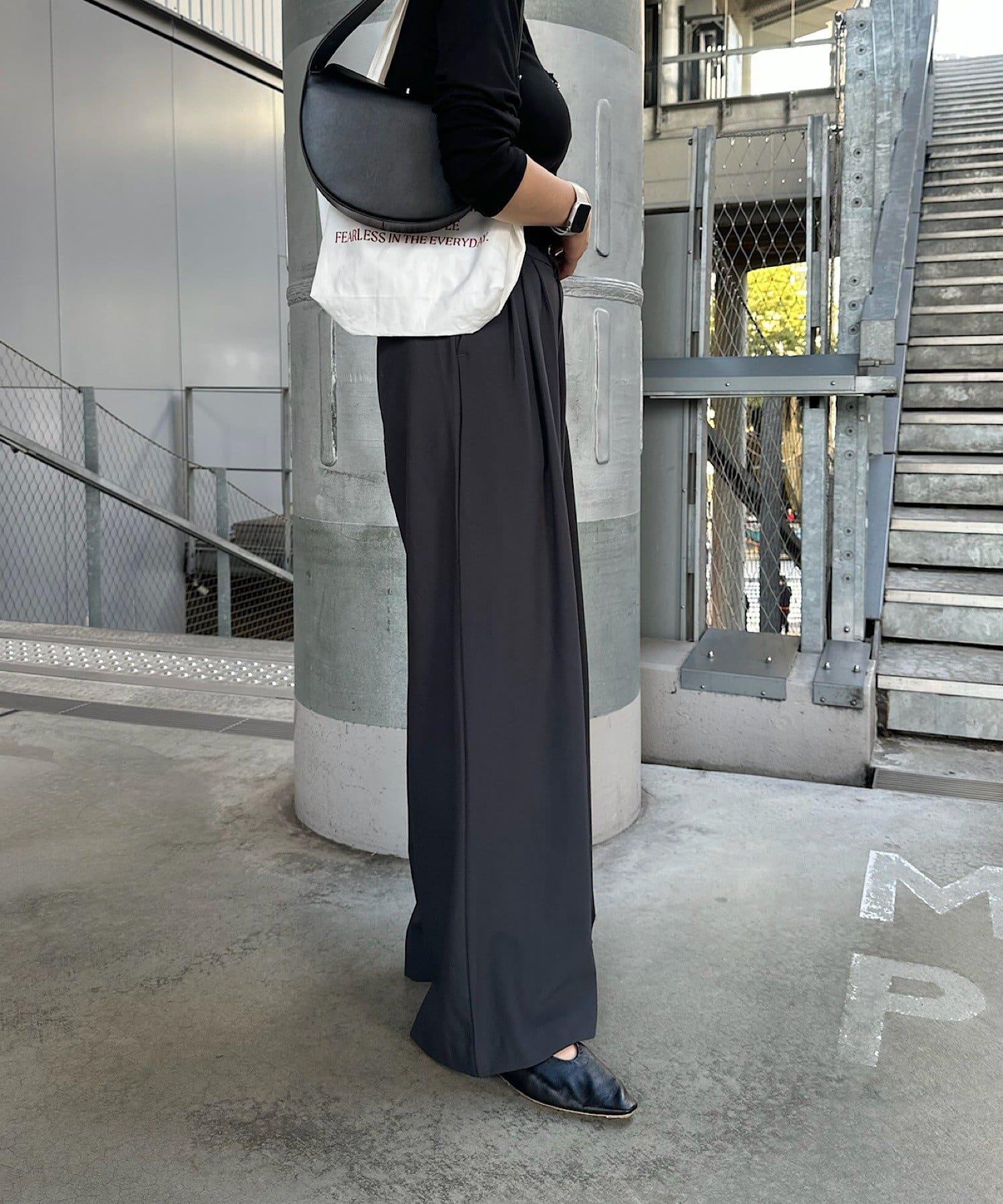 很好地遮住腰部。具有美腿效果的褶襉長褲。