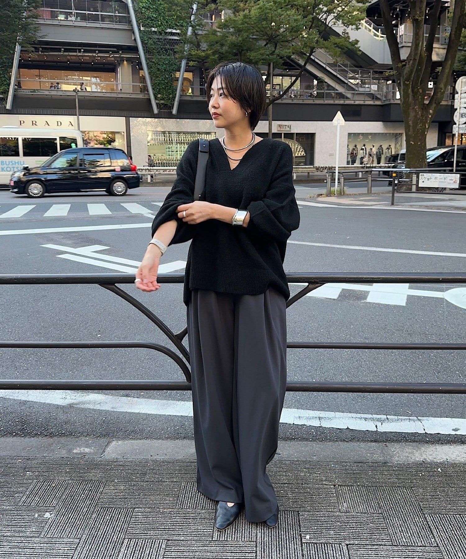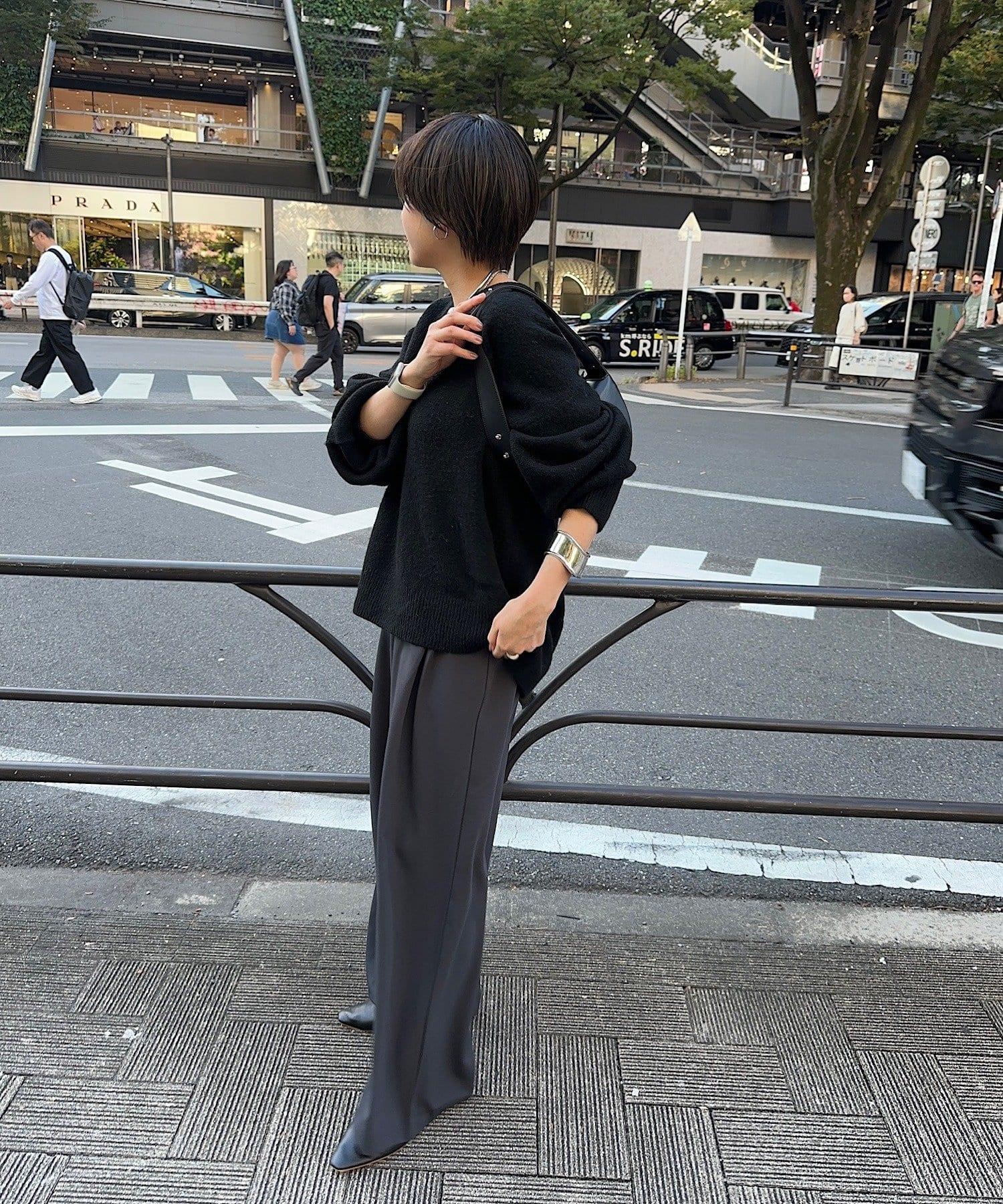 具有優雅墜感的面料使腰部看起來乾淨利落,也使整體輪廓更加優美。