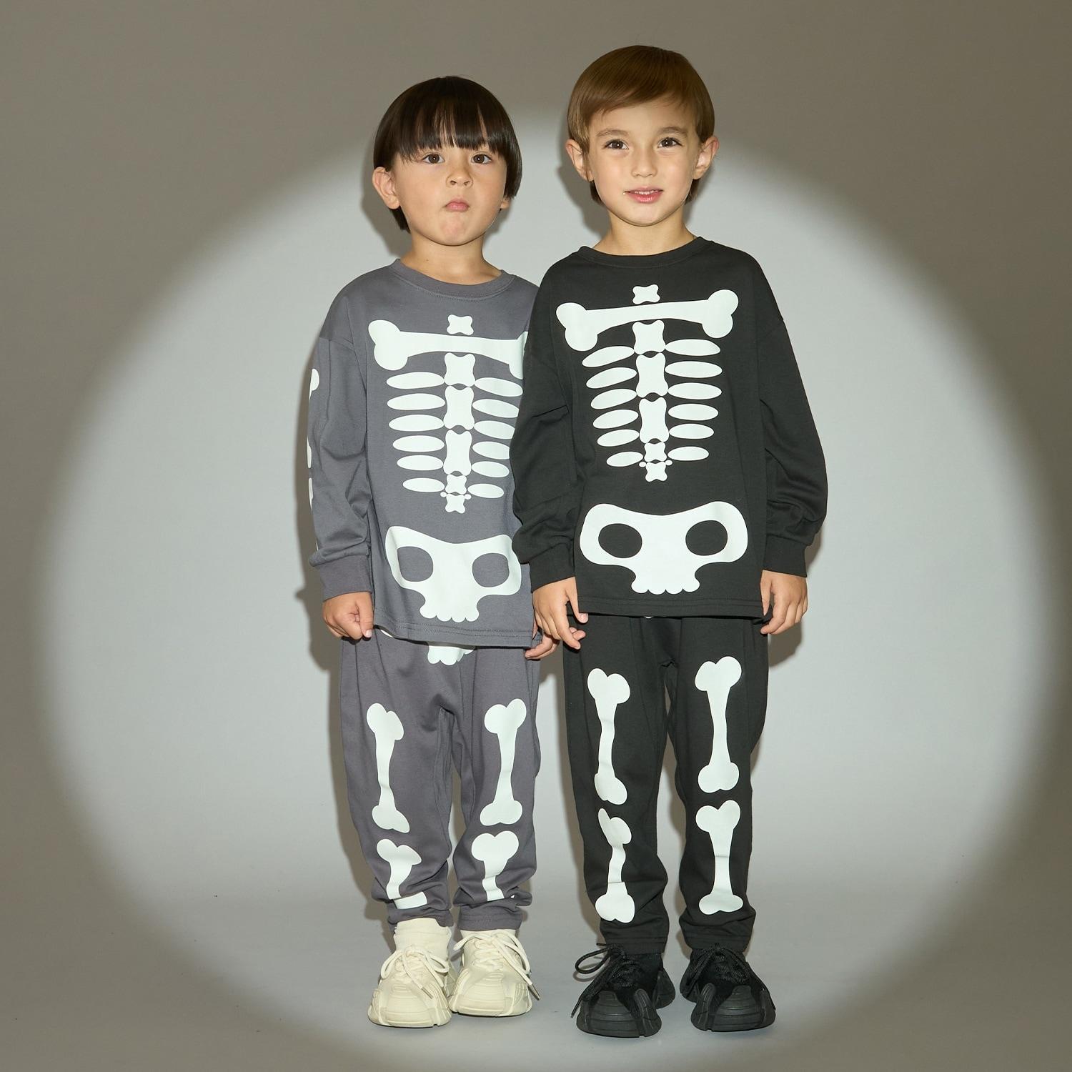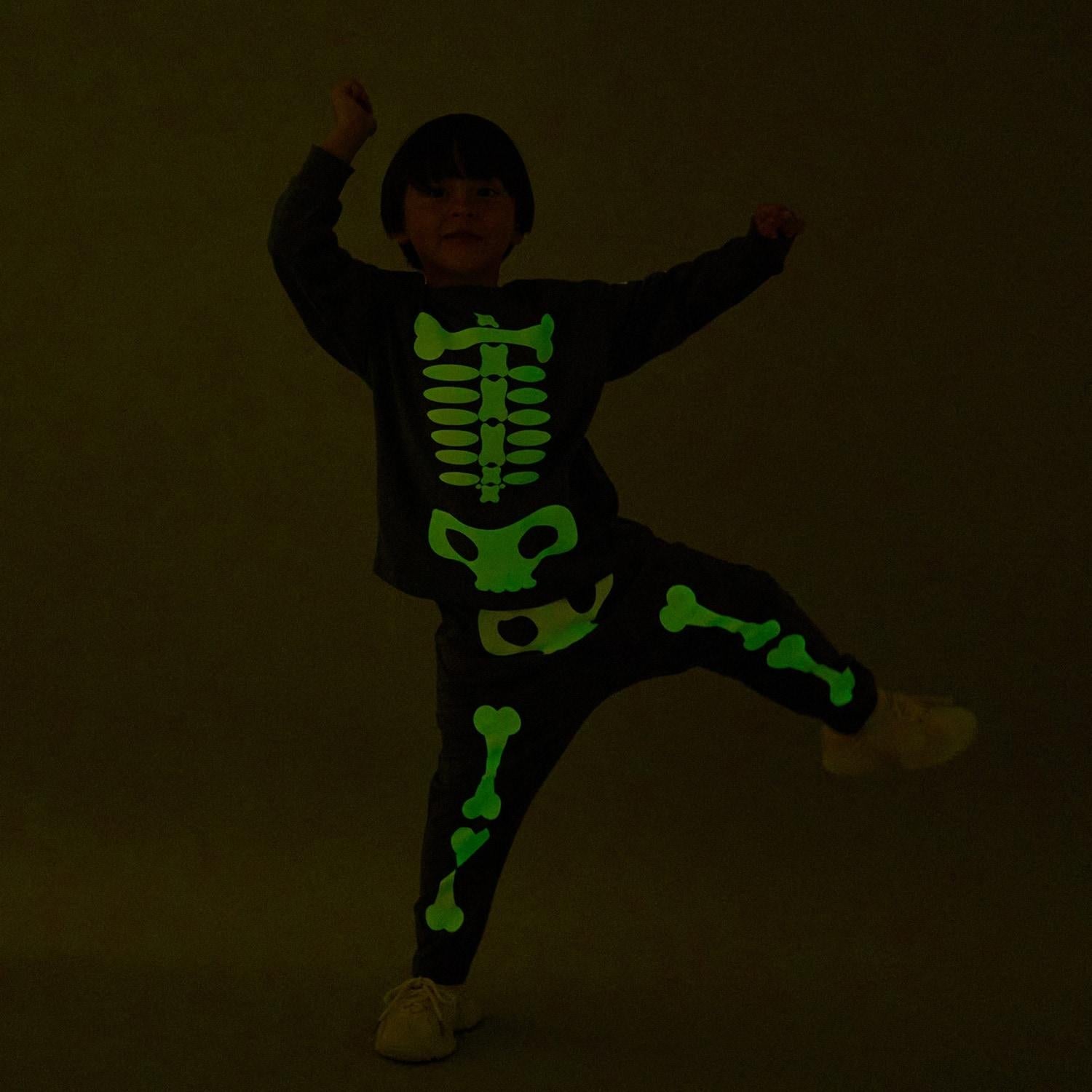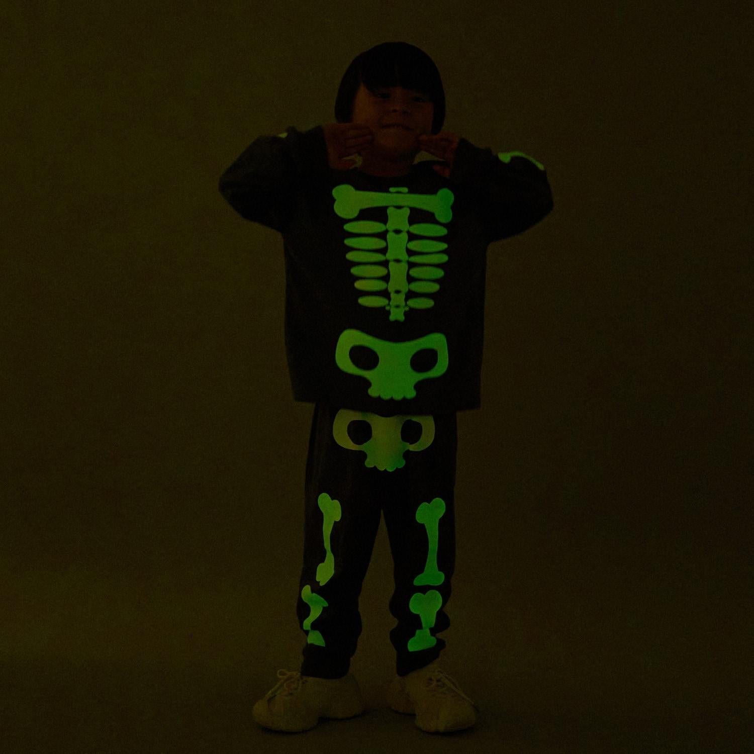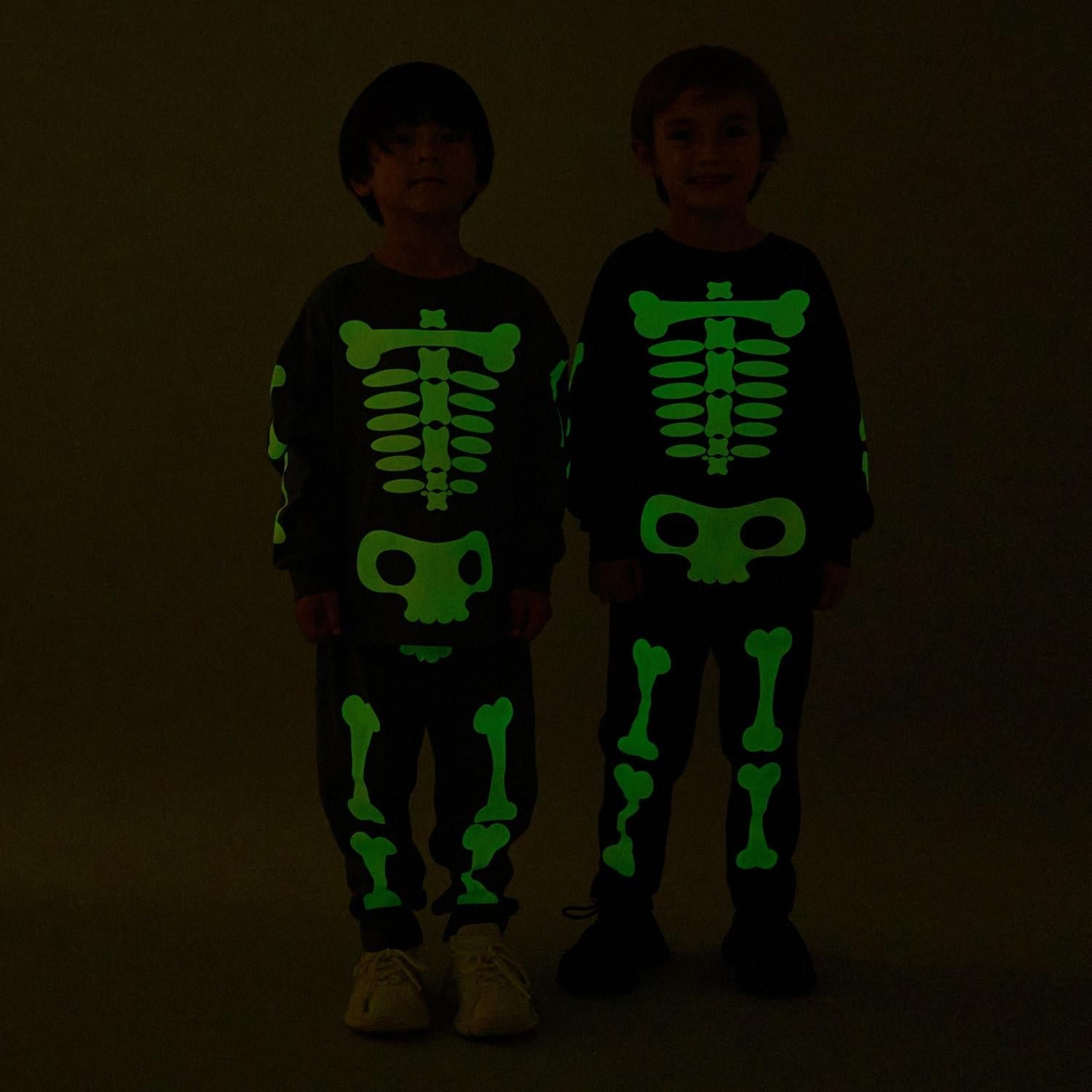 長袖 T 恤和長褲上印有醒目的夜光印花,栩栩如生。