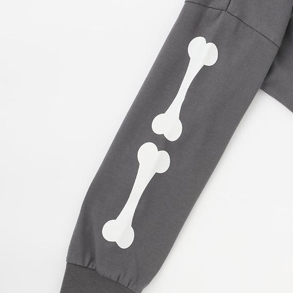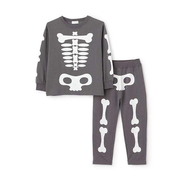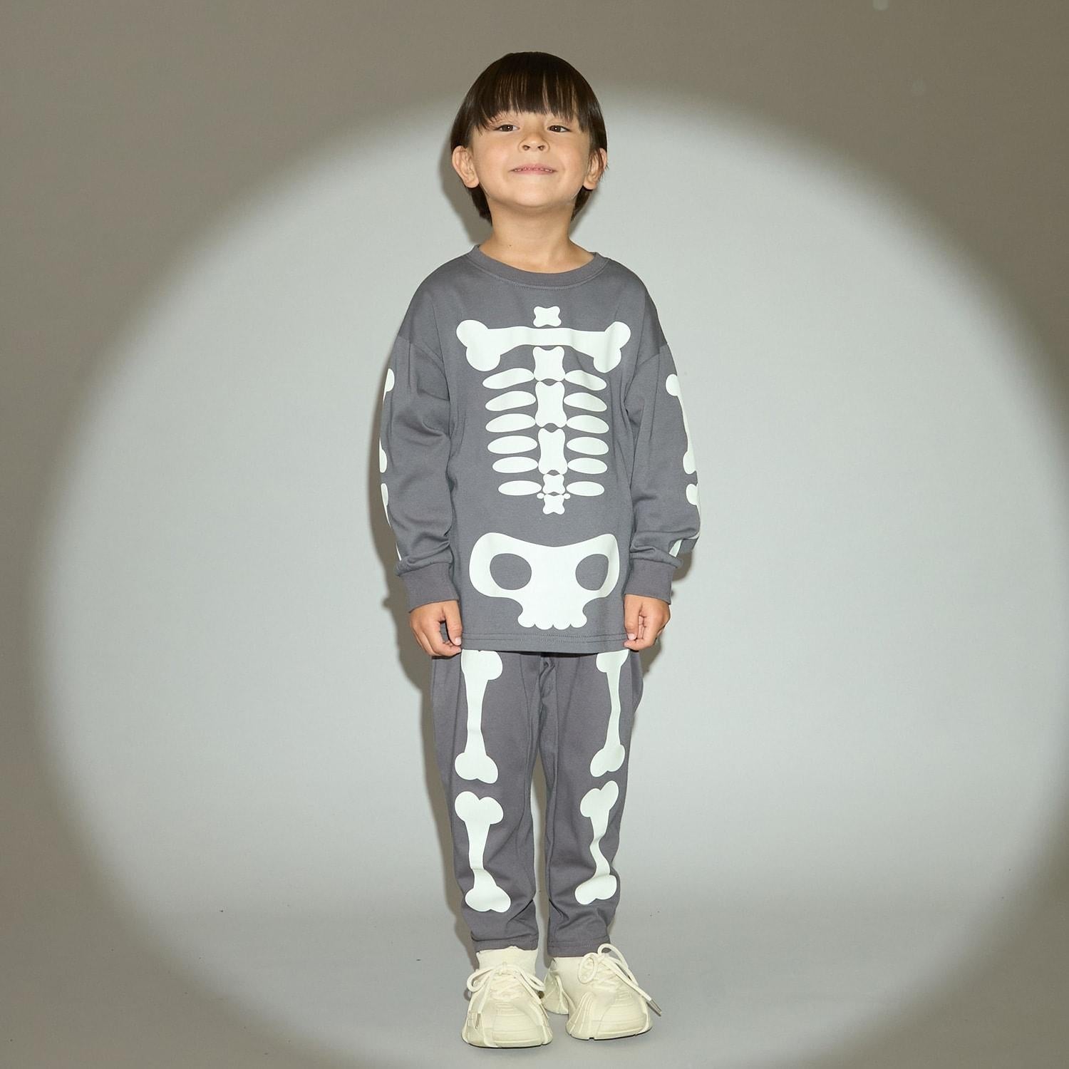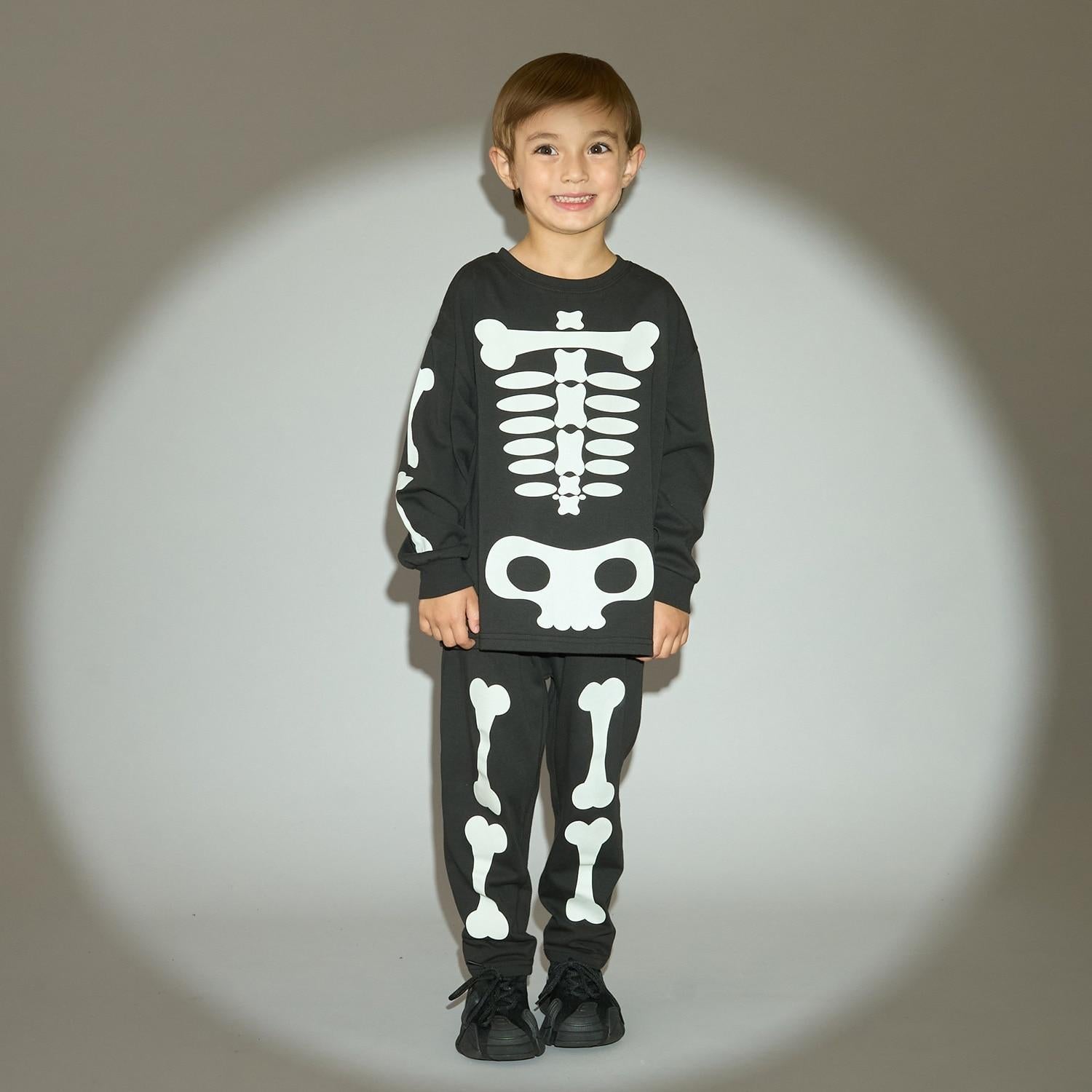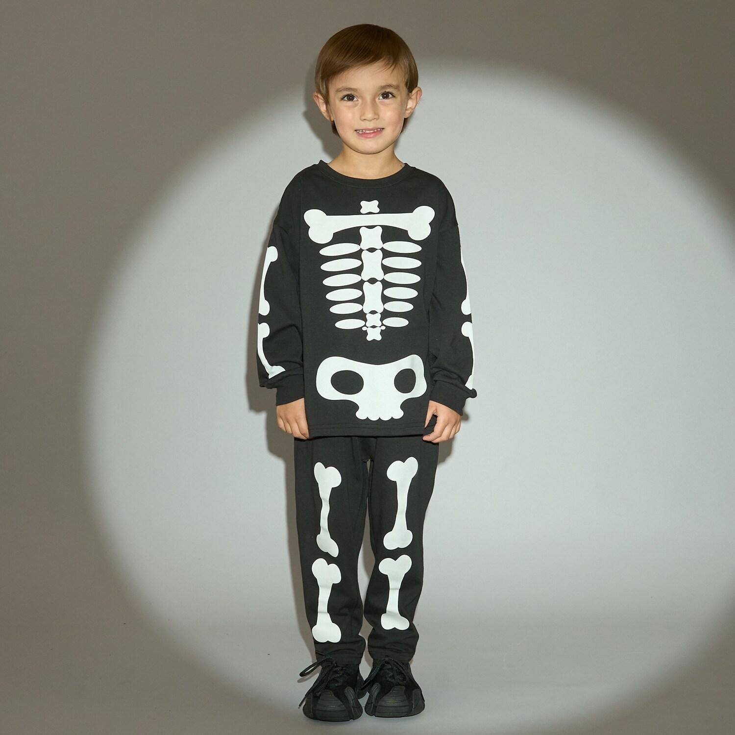 長袖 T 恤和長褲上印有醒目的夜光印花,栩栩如生。