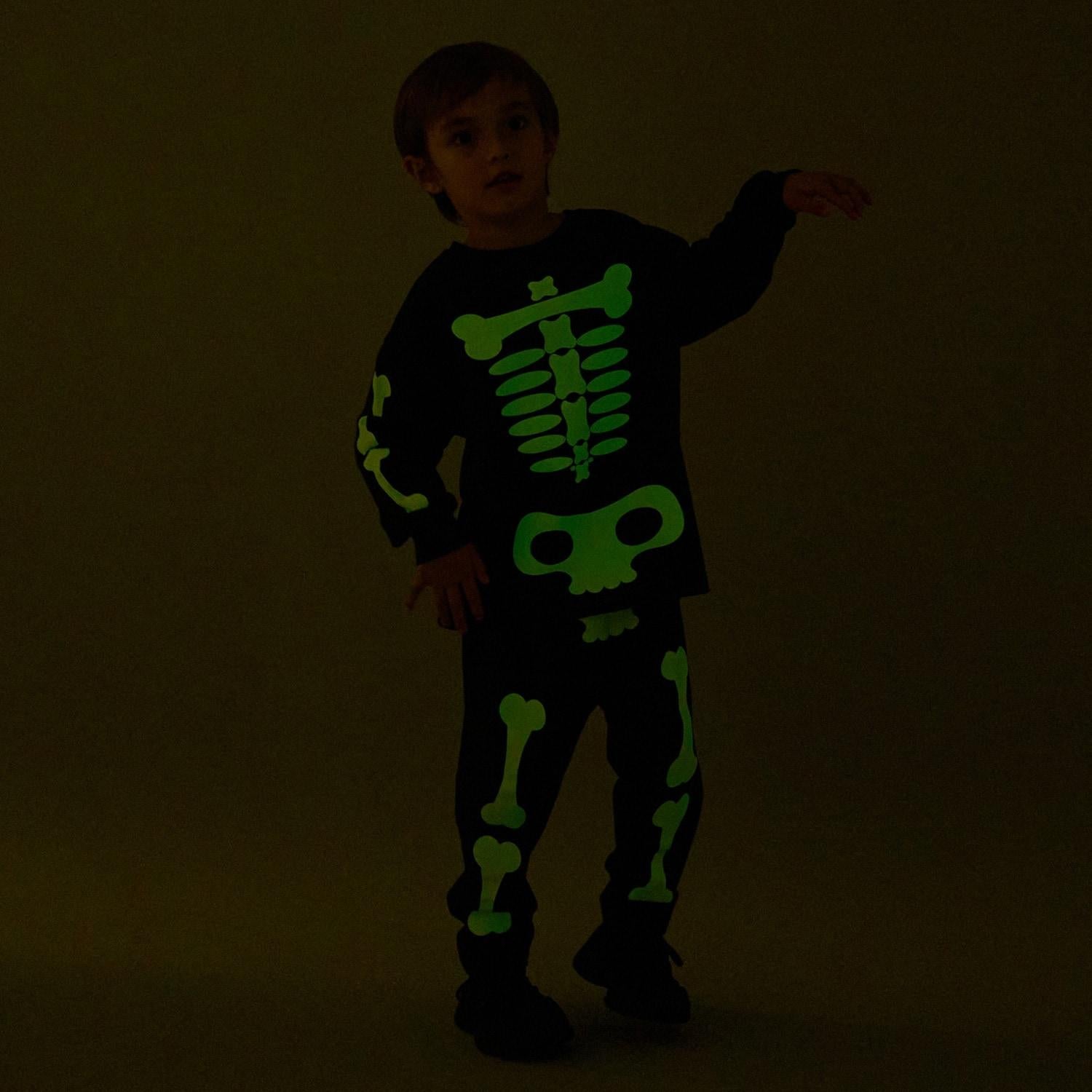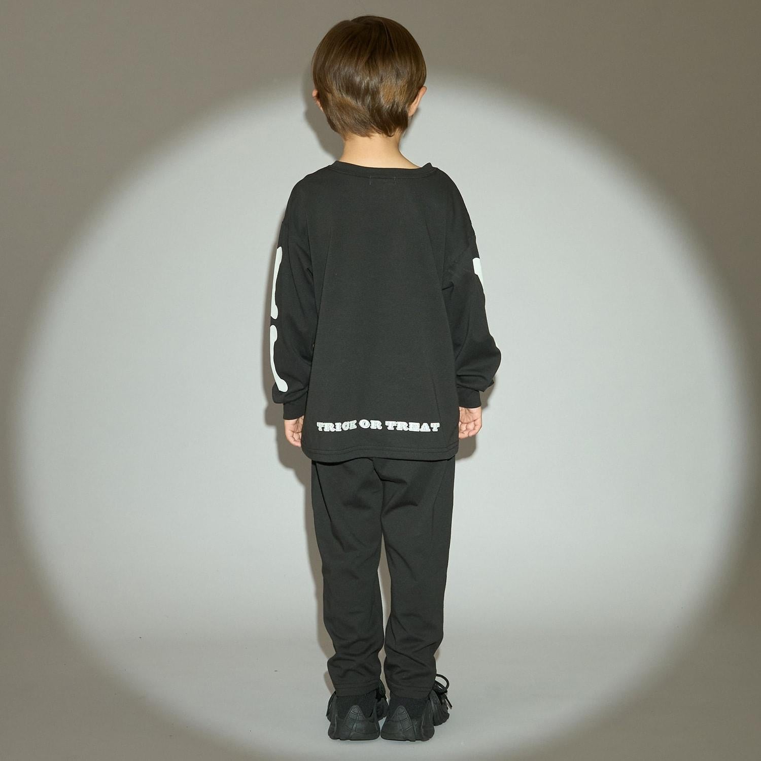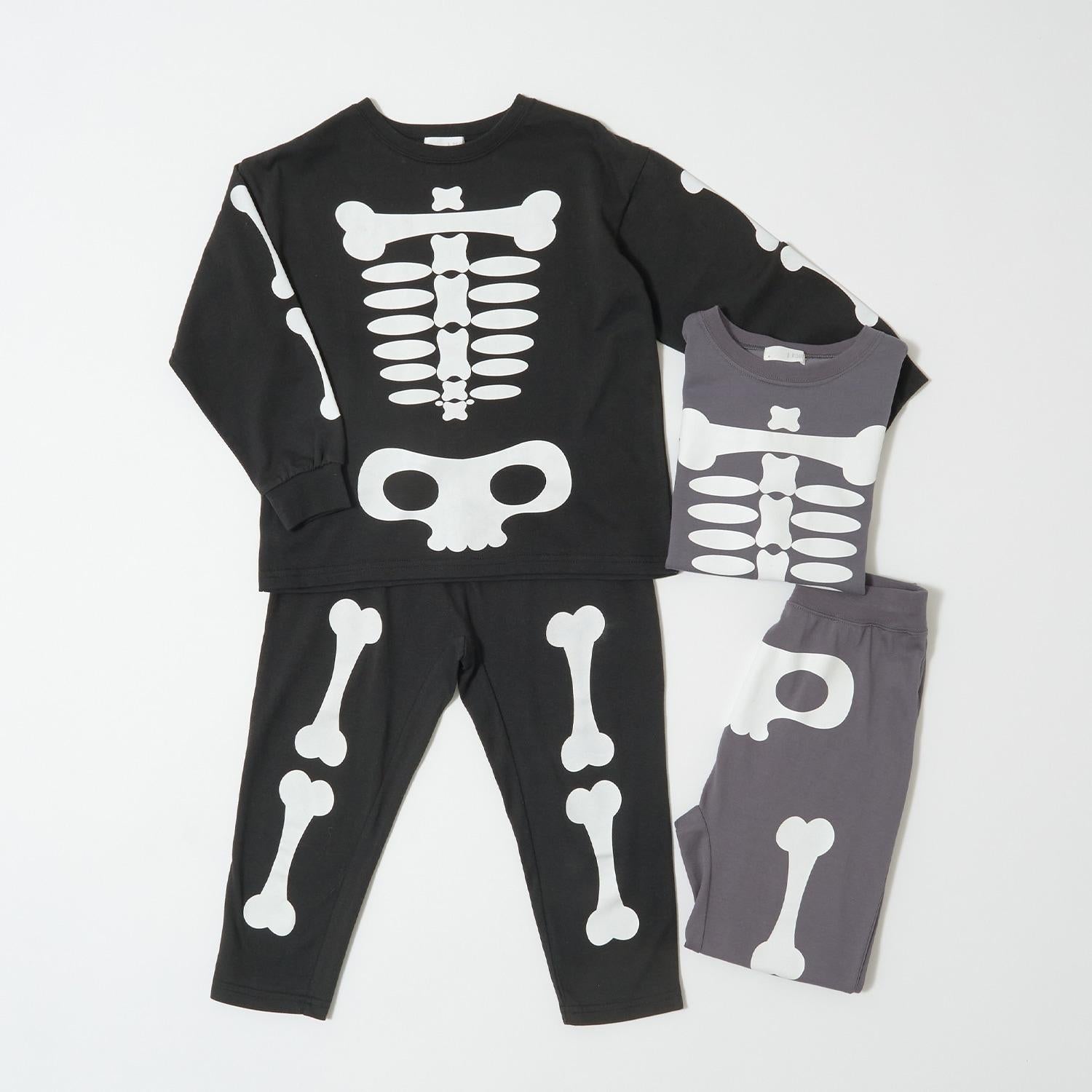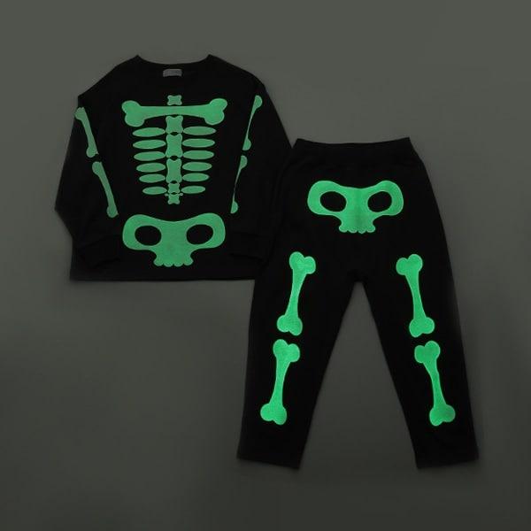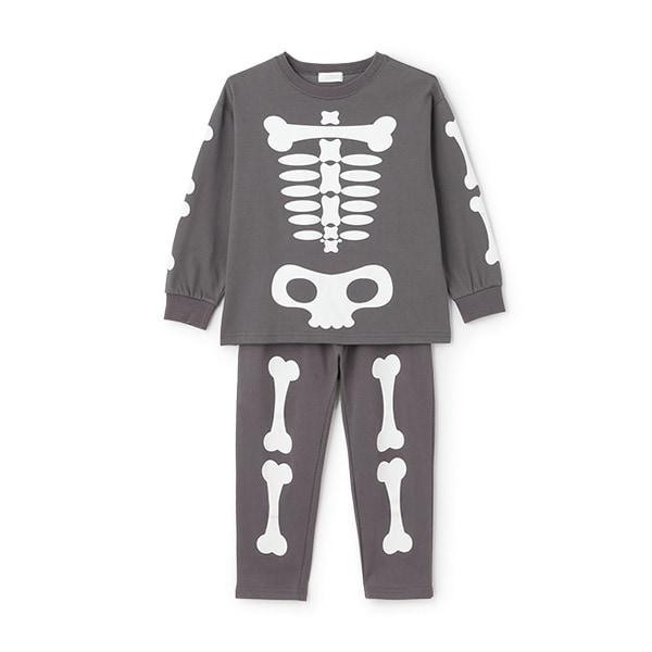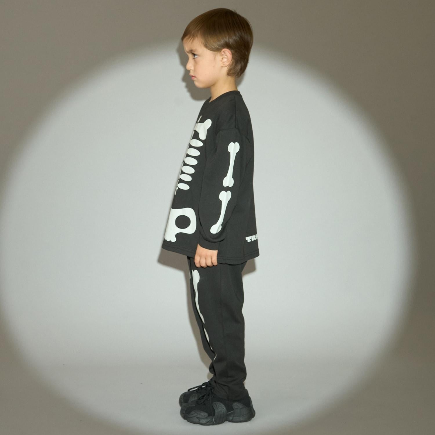 長袖 T 恤和長褲上印有醒目的夜光印花,栩栩如生。