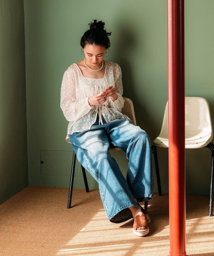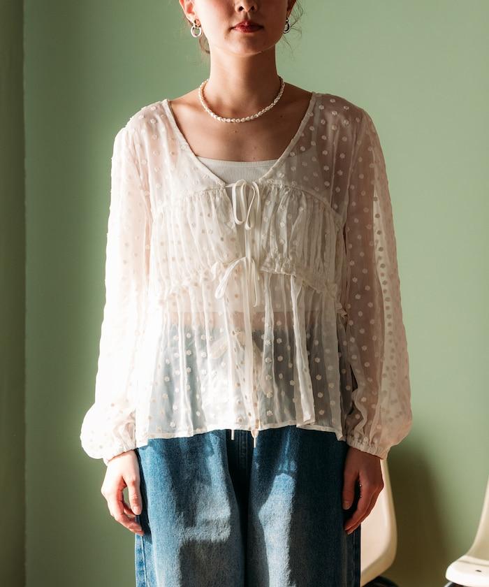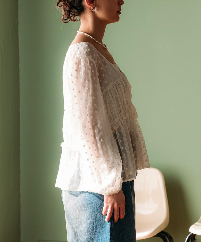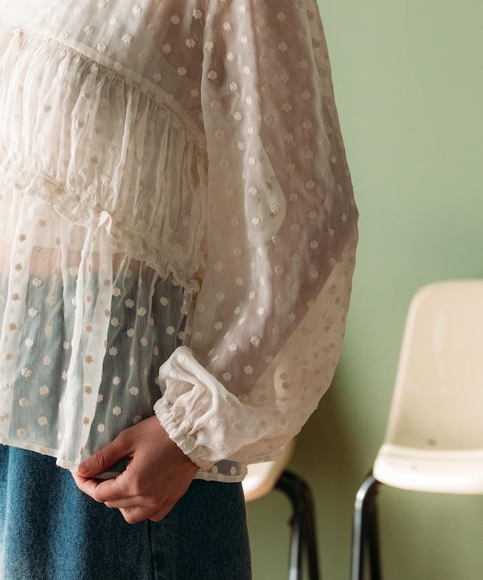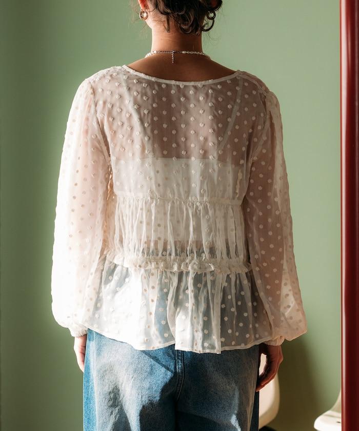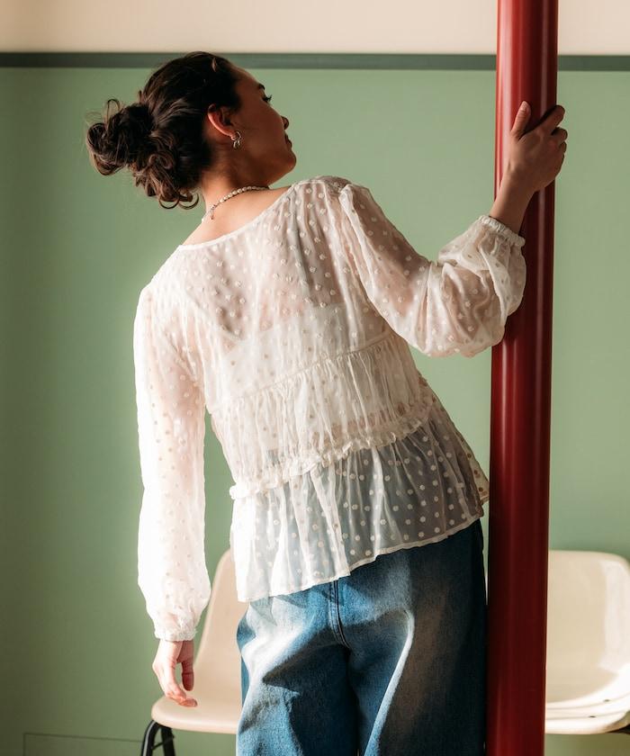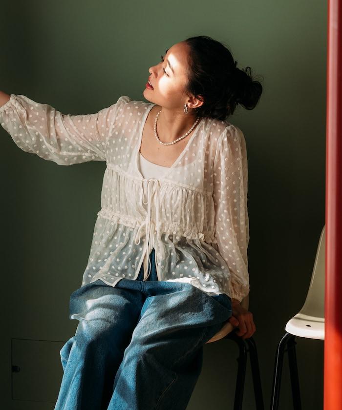 透視上衣上有可愛的花朵刺繡,看起來就像點點滴滴。