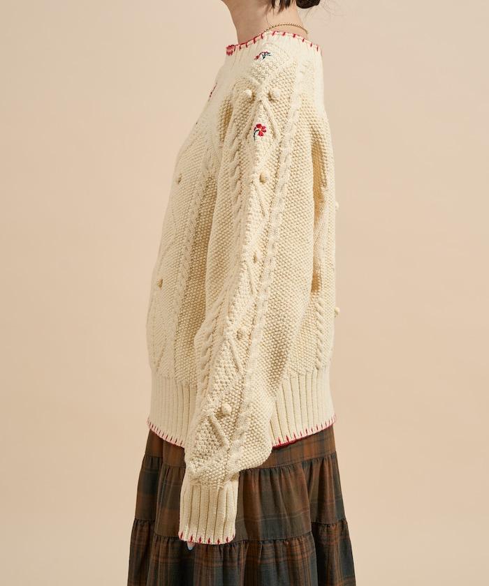 復古針織開衫,細節處繡有花朵、絨球和縫線。