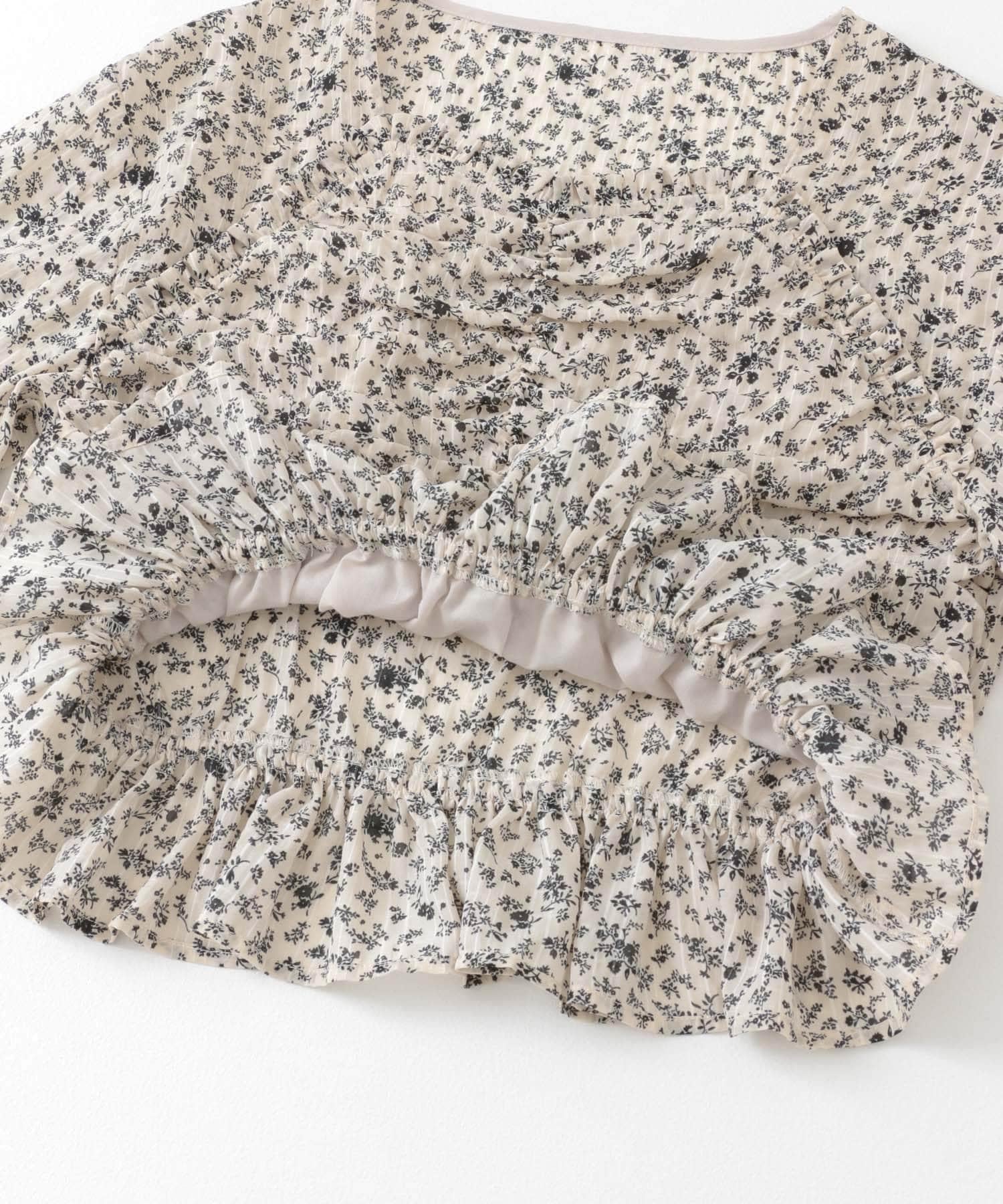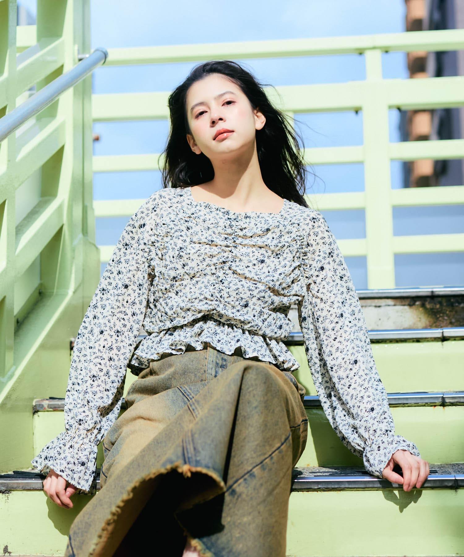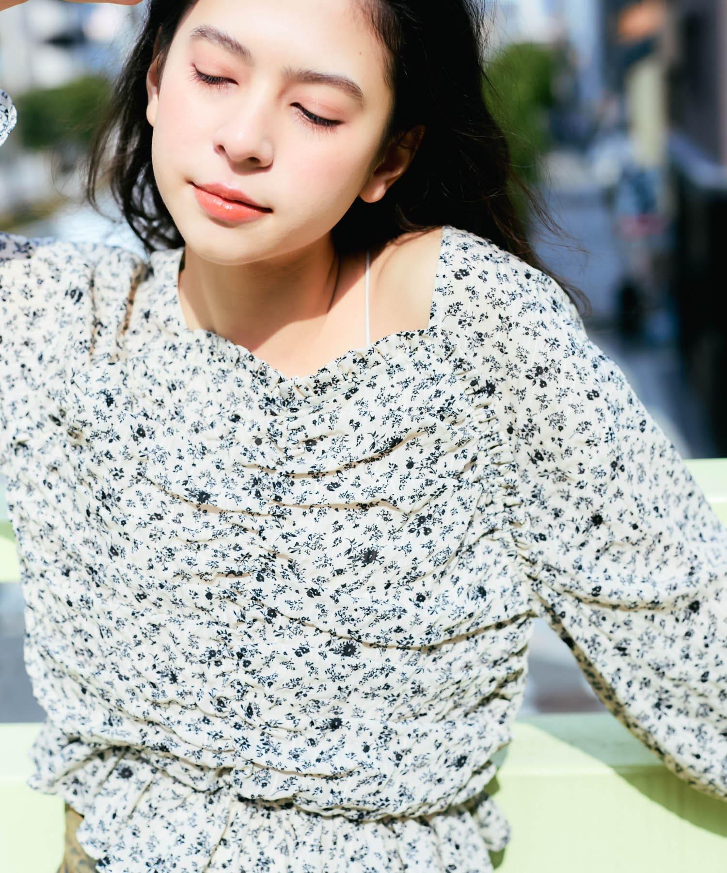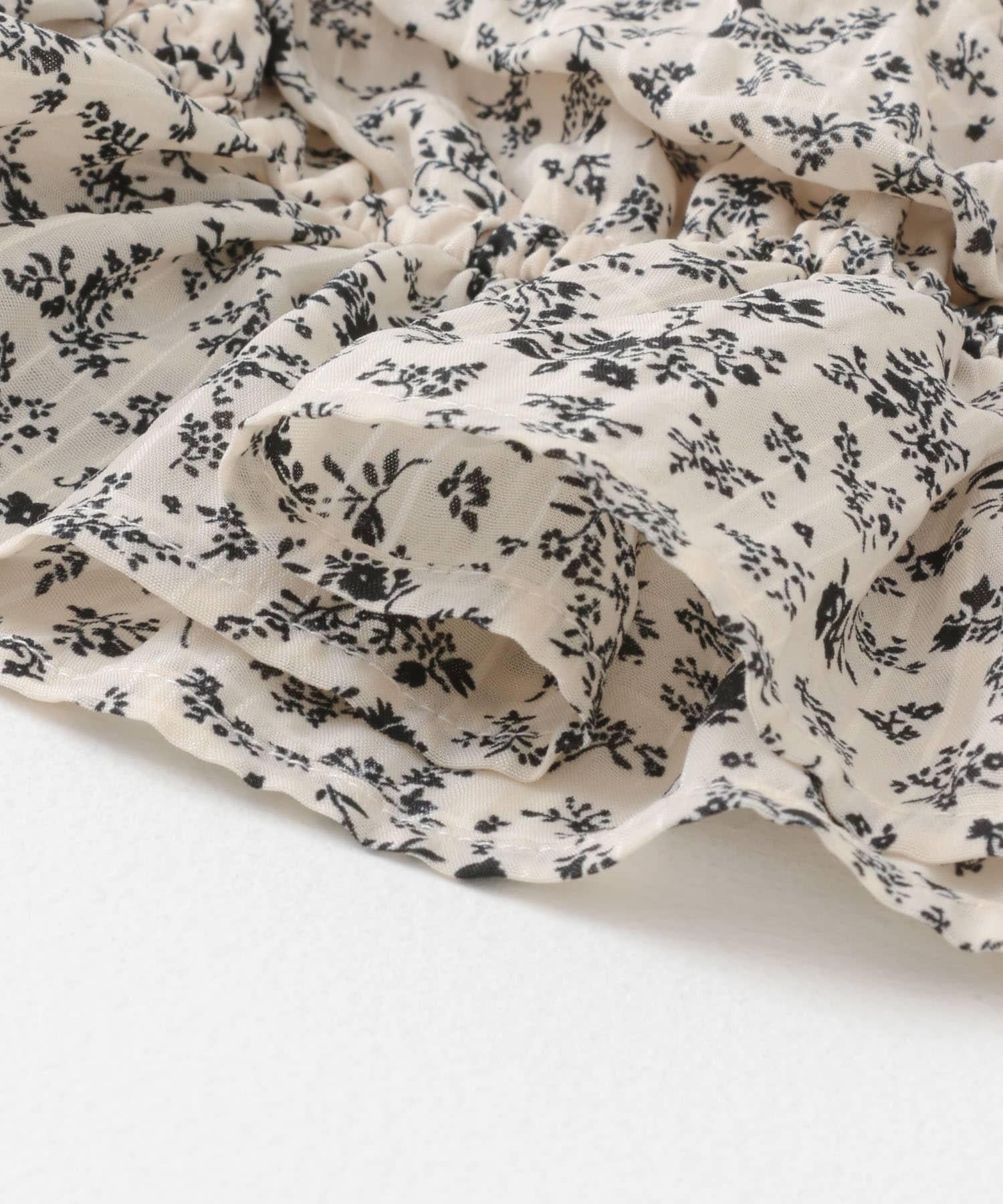 這款上衣的設計就像長裙和半身裙疊穿在一起。薄透而不甜膩的單色花朵圖案給人一種迷人的印象。剪裁的長度讓人眼前一亮,而方形的設計則將肩部的線條展現得淋漓盡致。有兩種顏色可供選擇,營造復古氛圍。