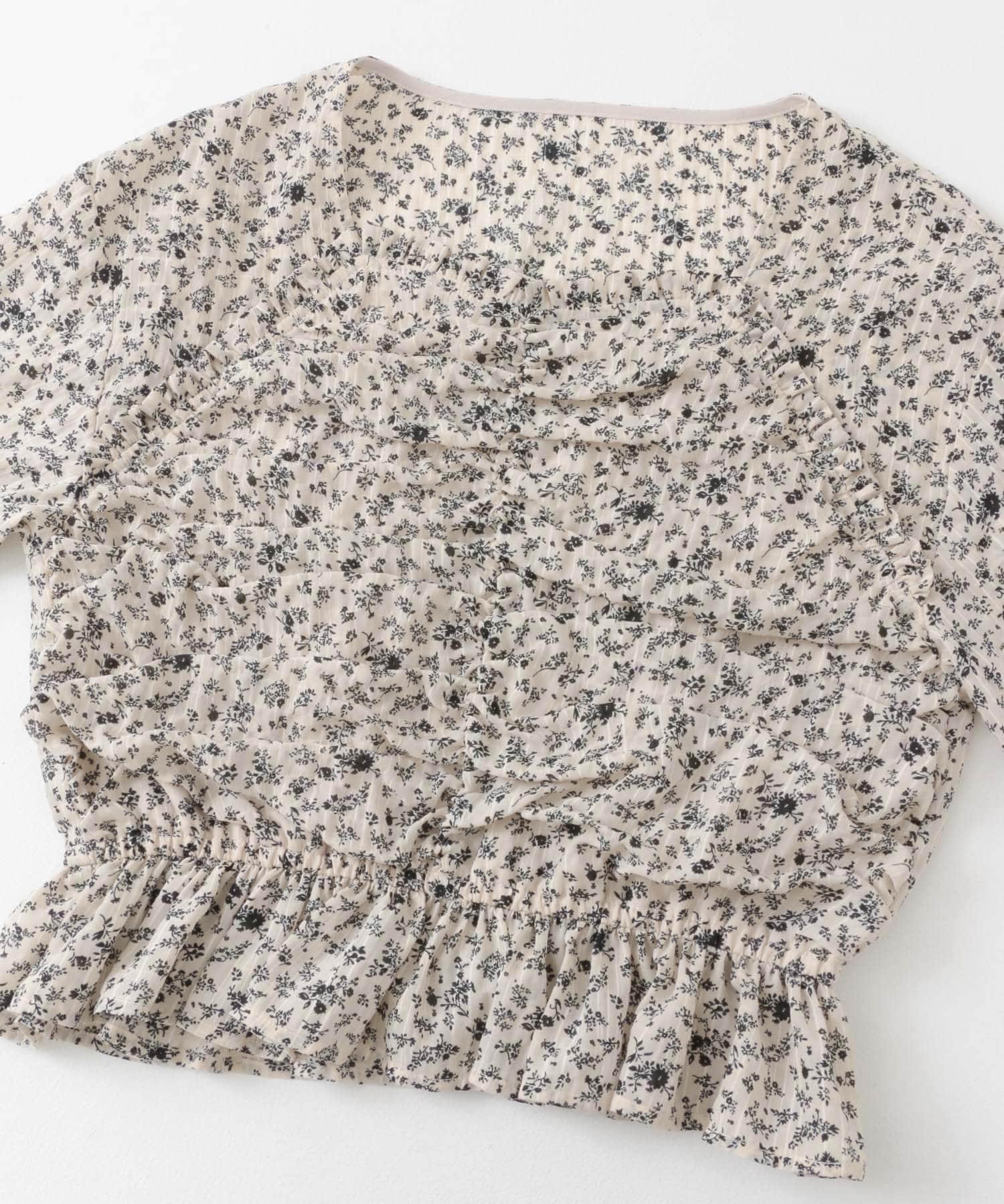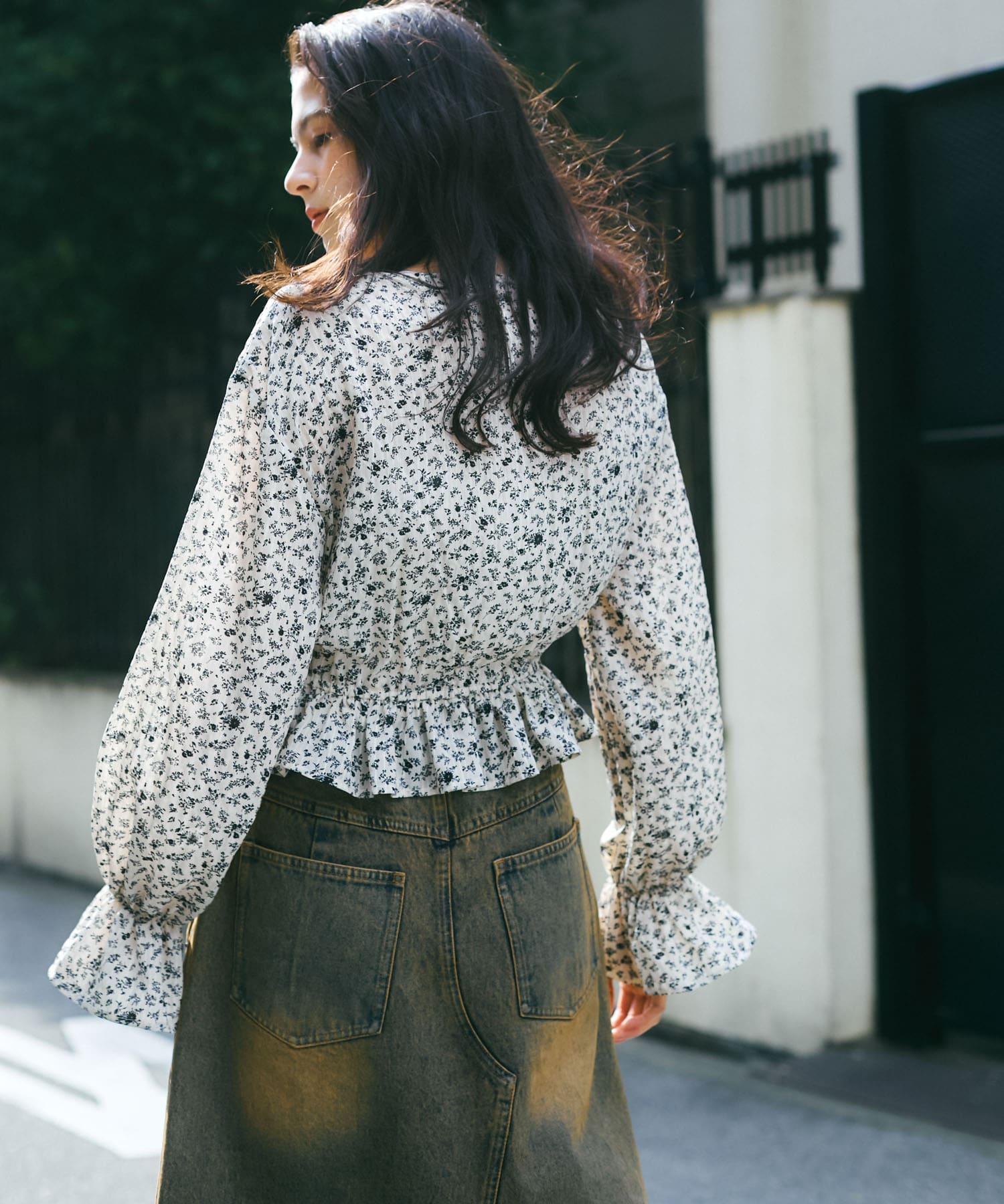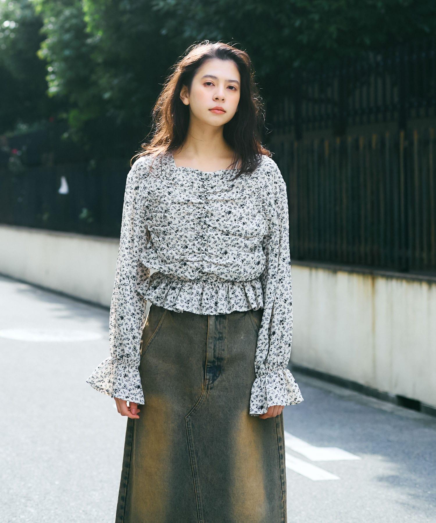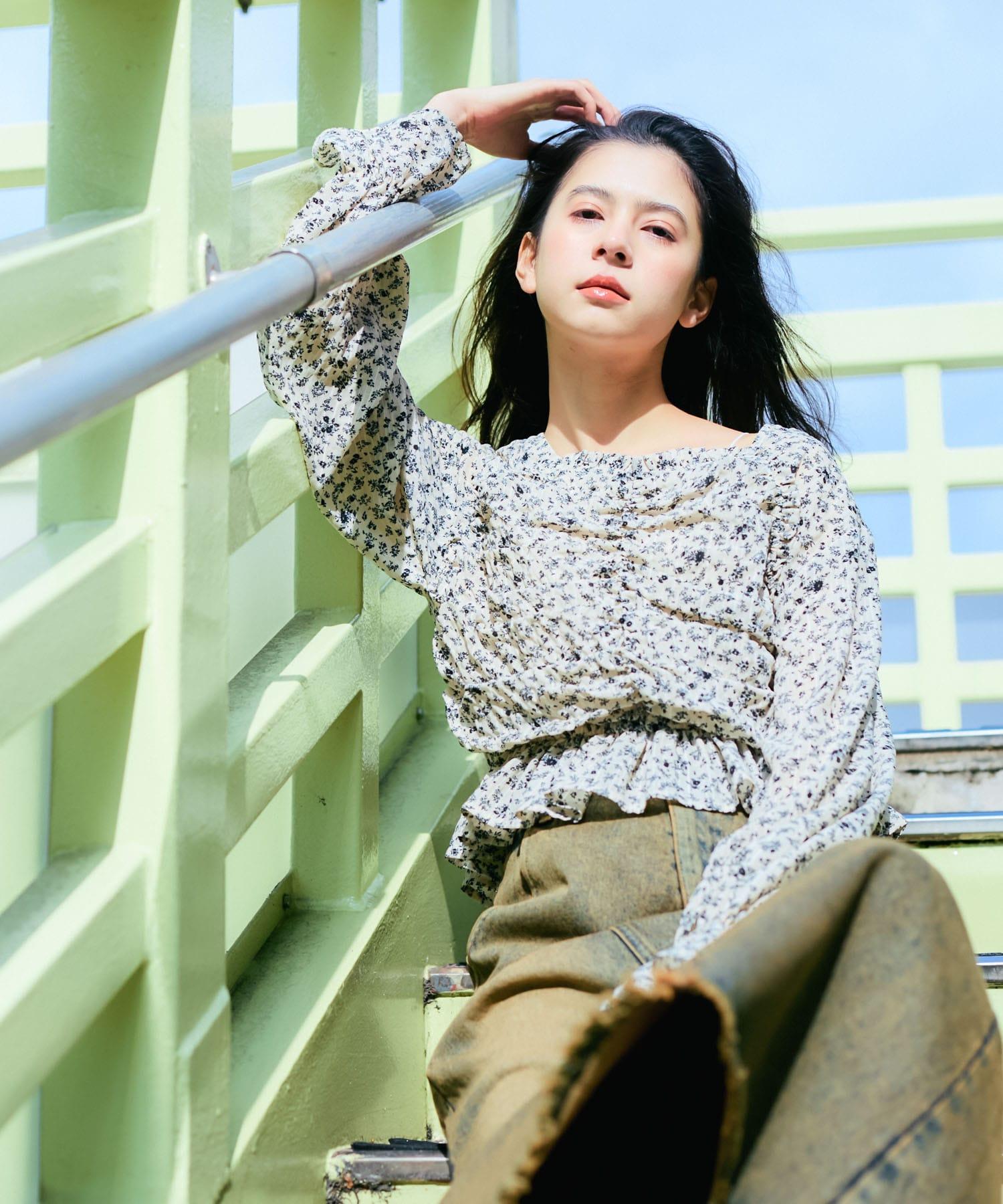 這款上衣的設計就像長裙和半身裙疊穿在一起。薄透而不甜膩的單色花朵圖案給人一種迷人的印象。剪裁的長度讓人眼前一亮,而方形的設計則將肩部的線條展現得淋漓盡致。有兩種顏色可供選擇,營造復古氛圍。