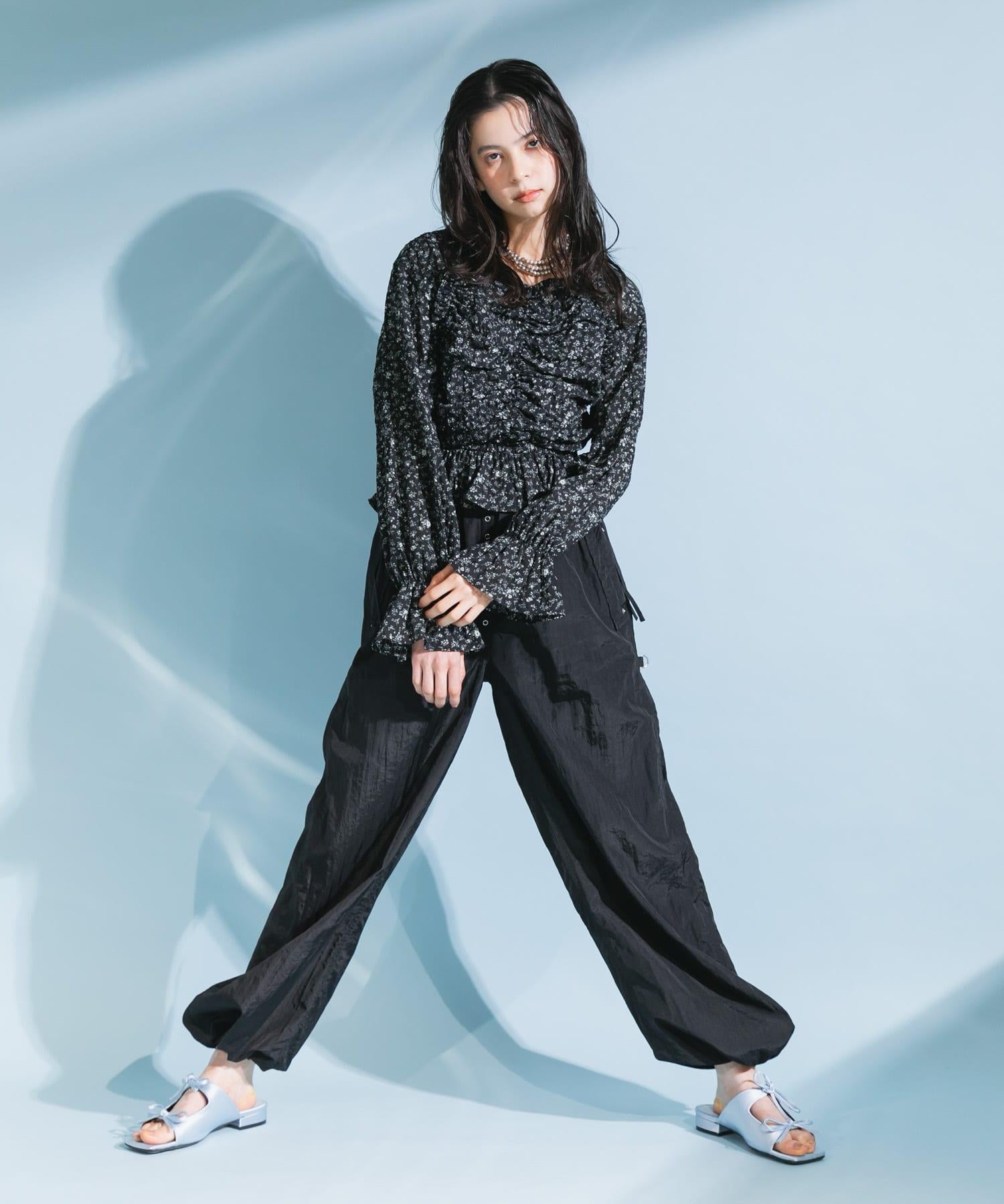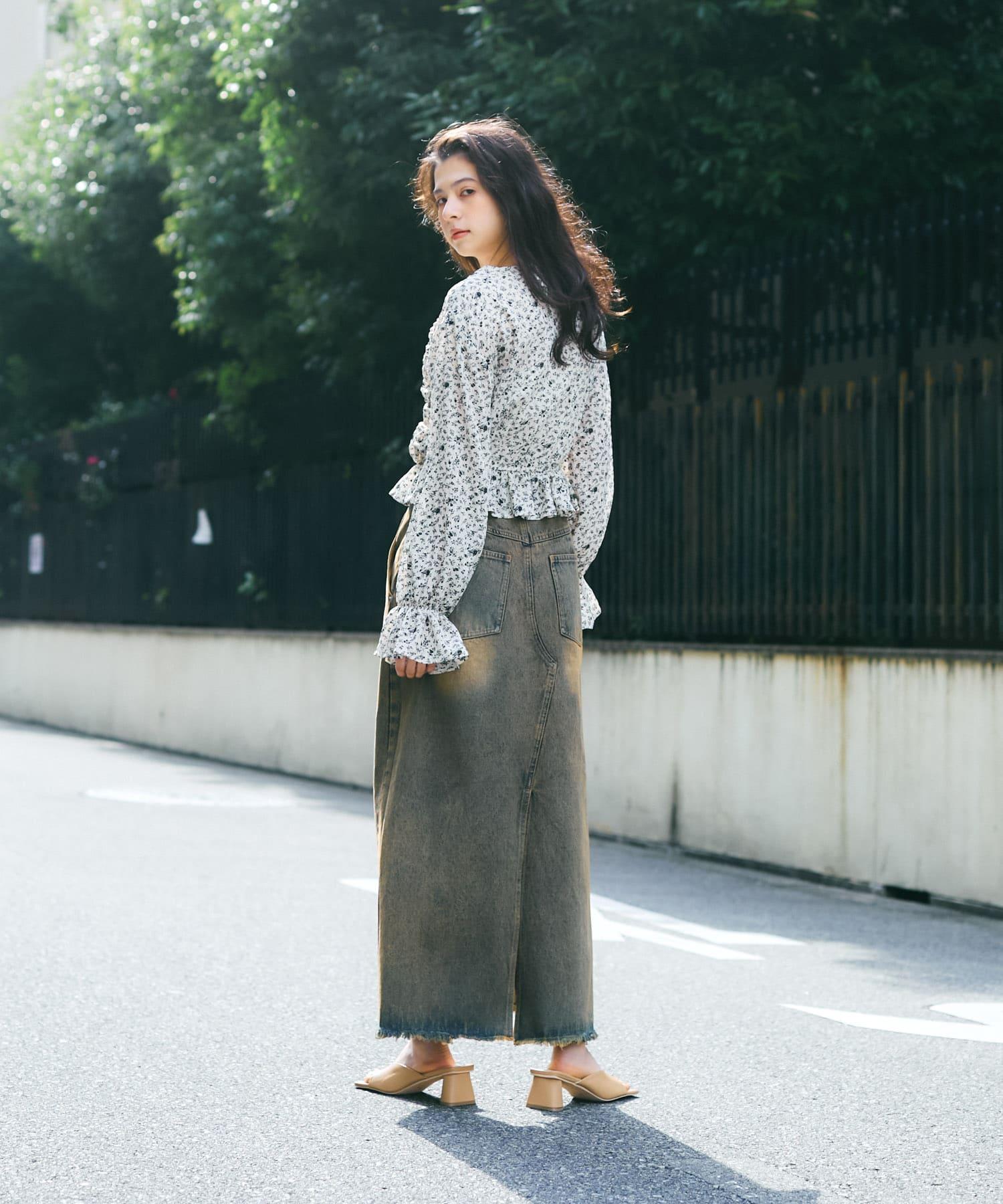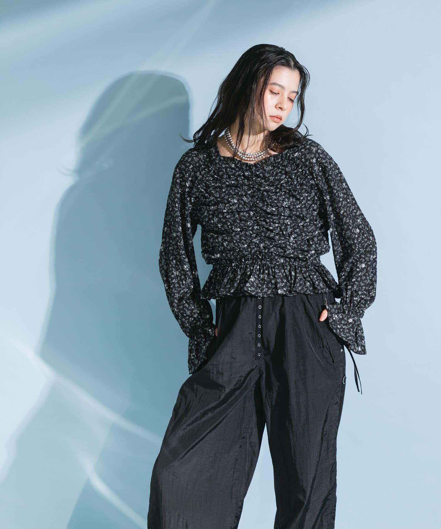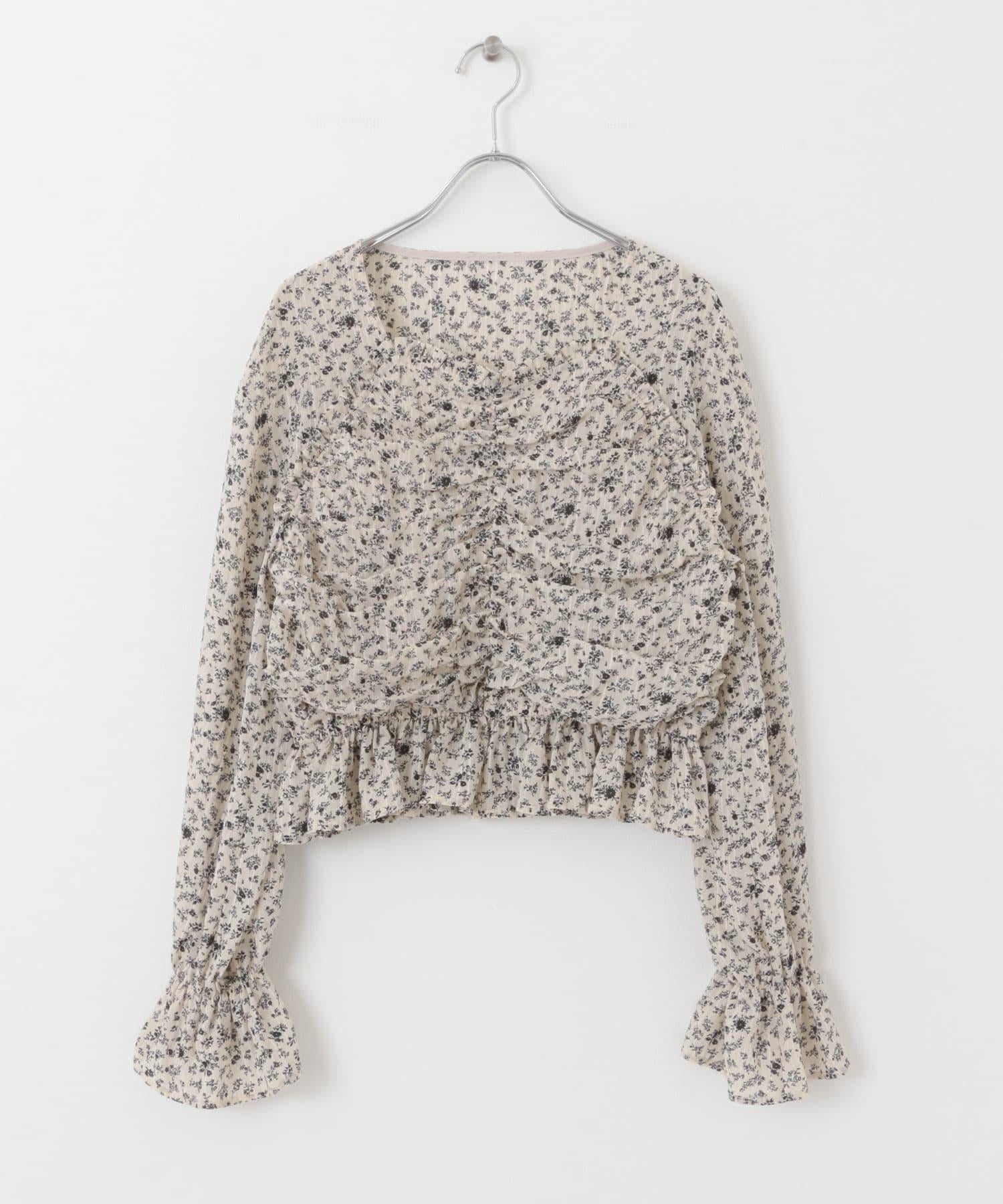 這款上衣的設計就像長裙和半身裙疊穿在一起。薄透而不甜膩的單色花朵圖案給人一種迷人的印象。剪裁的長度讓人眼前一亮,而方形的設計則將肩部的線條展現得淋漓盡致。有兩種顏色可供選擇,營造復古氛圍。