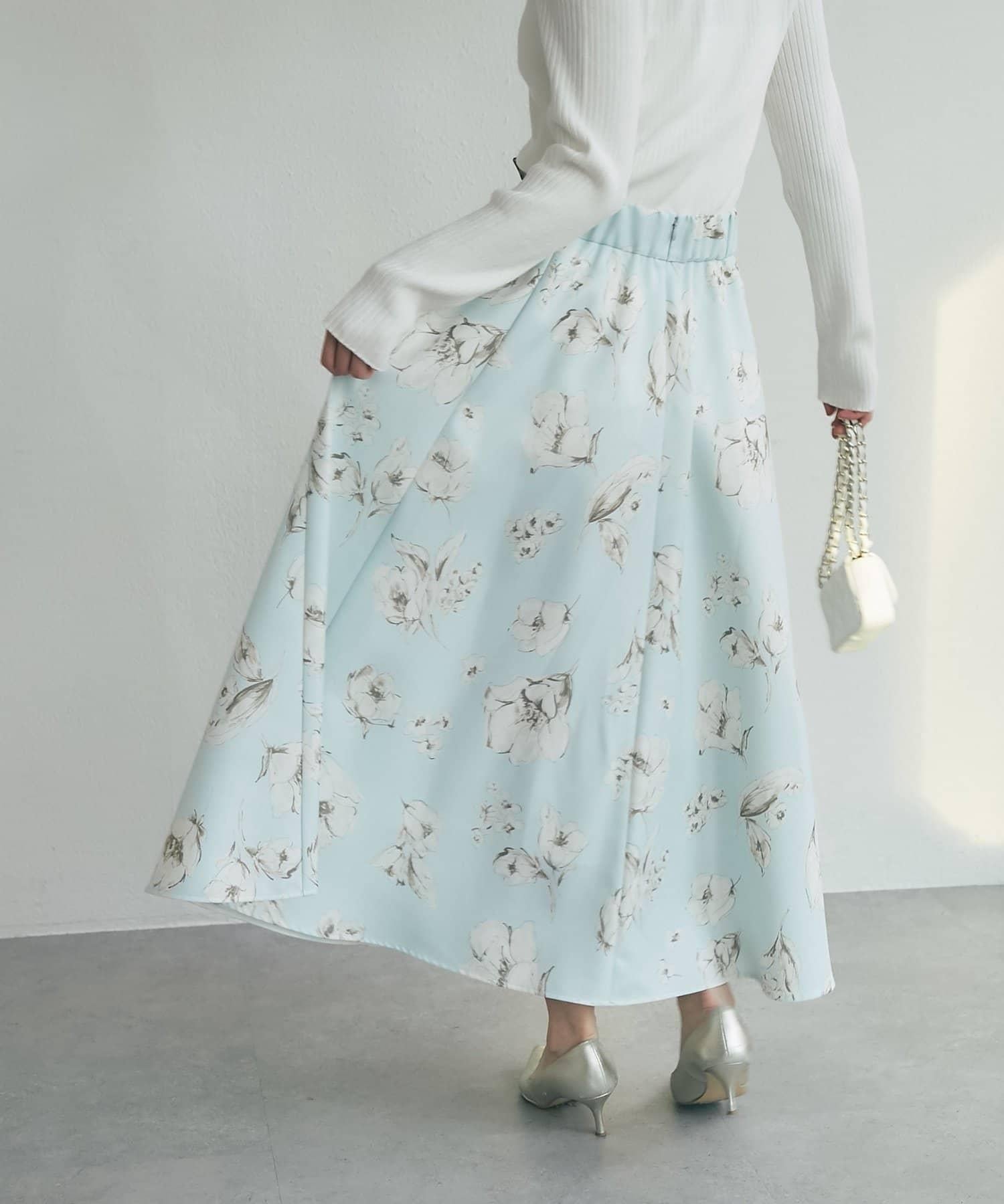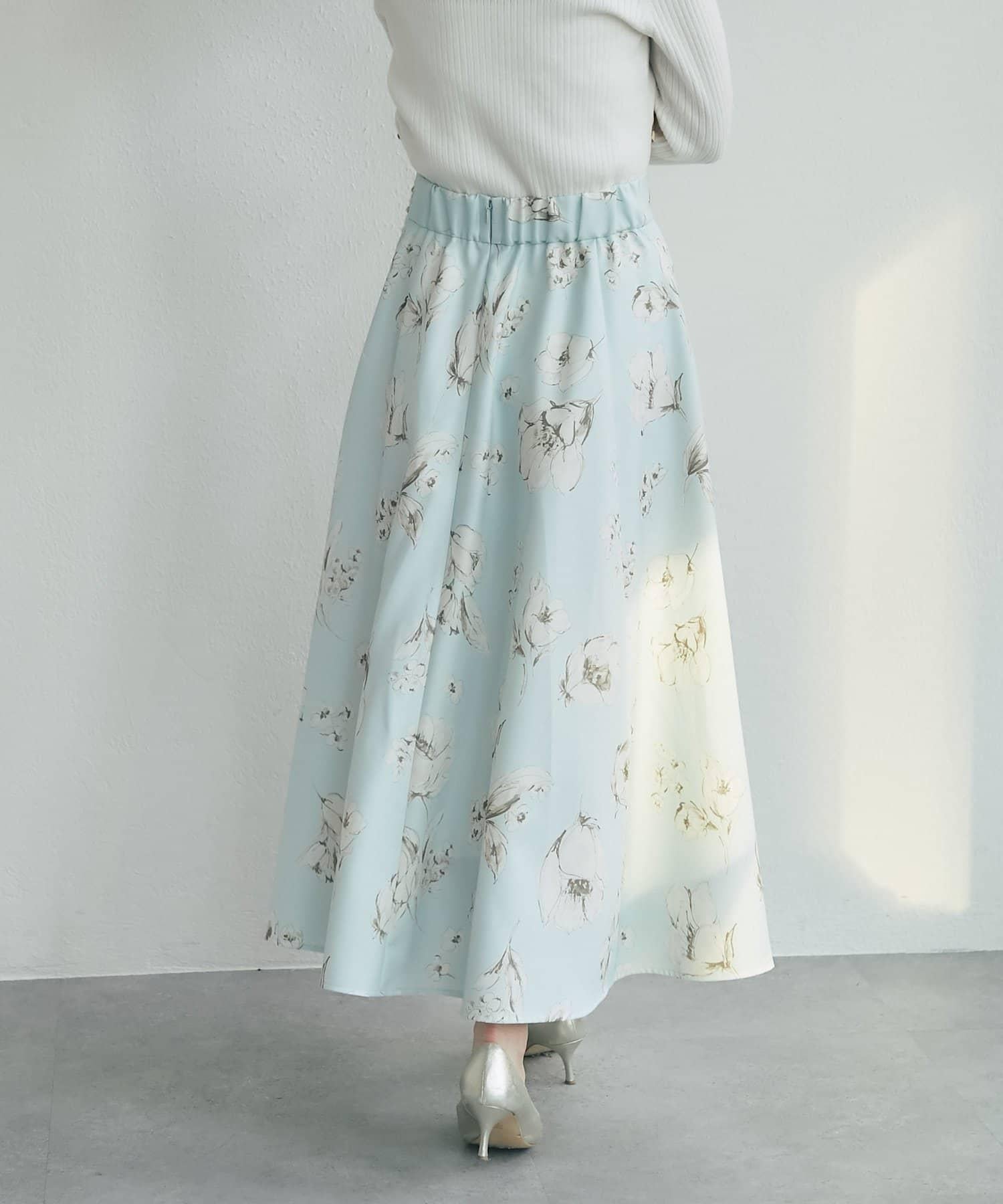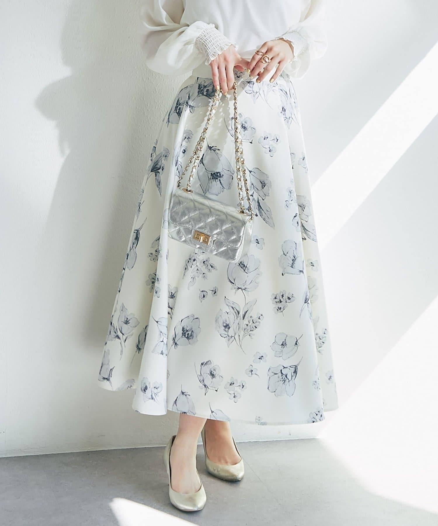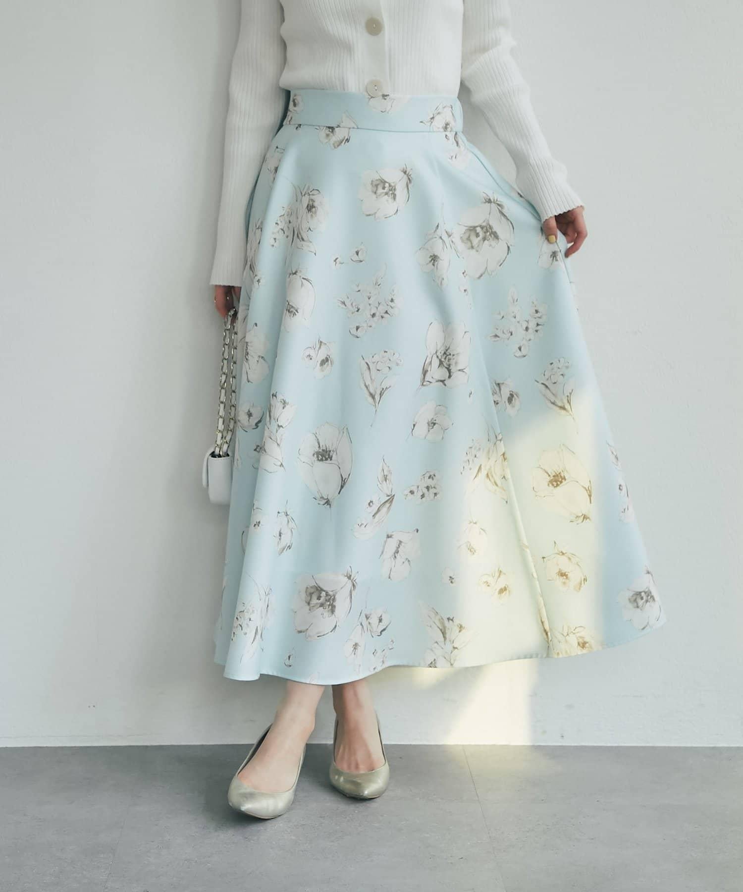 帶有精緻水彩觸感的喇叭裙,花朵圖案營造出女性的柔美氛圍。