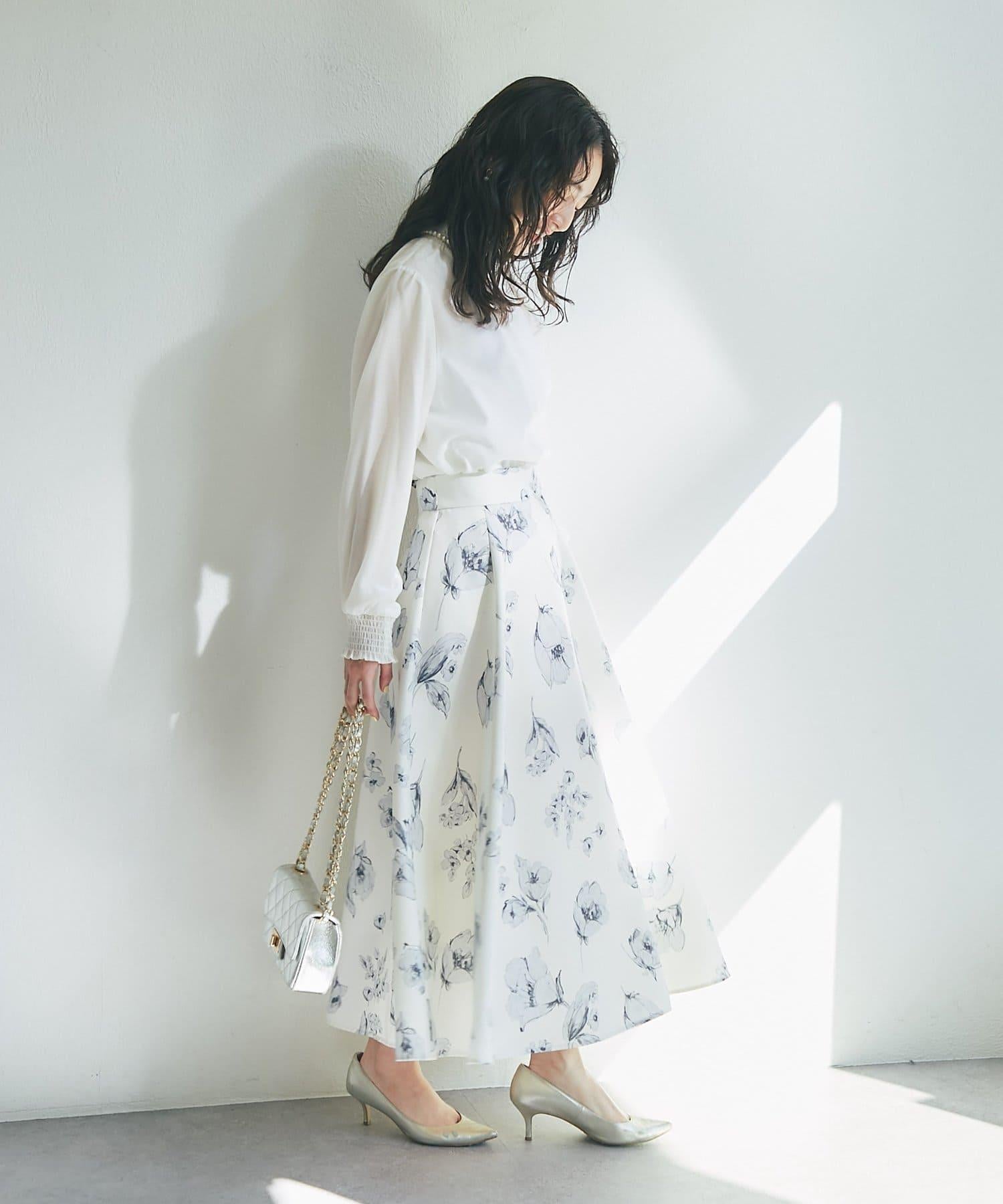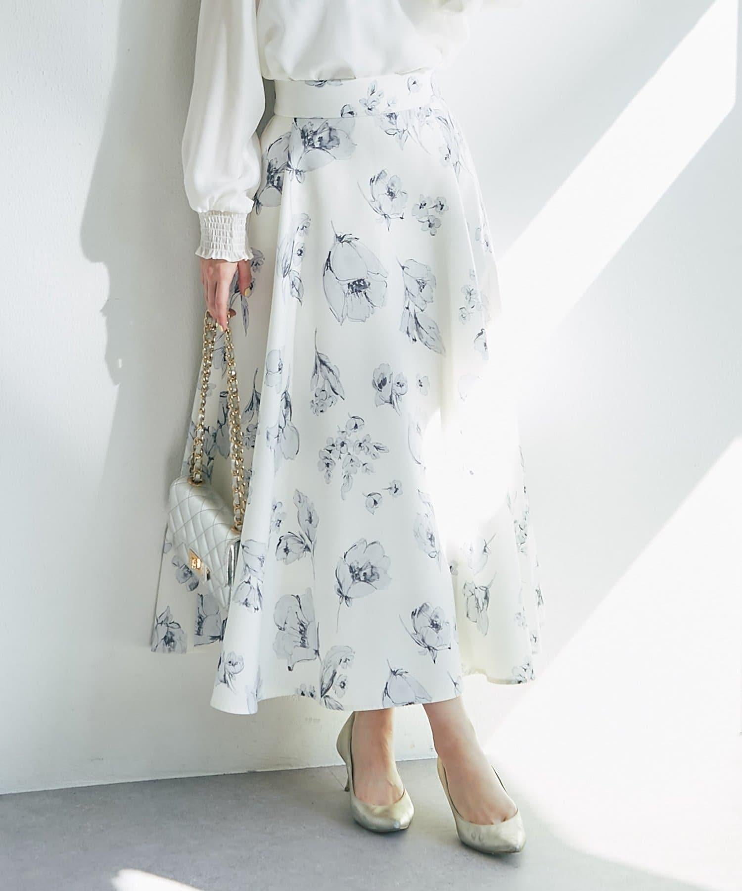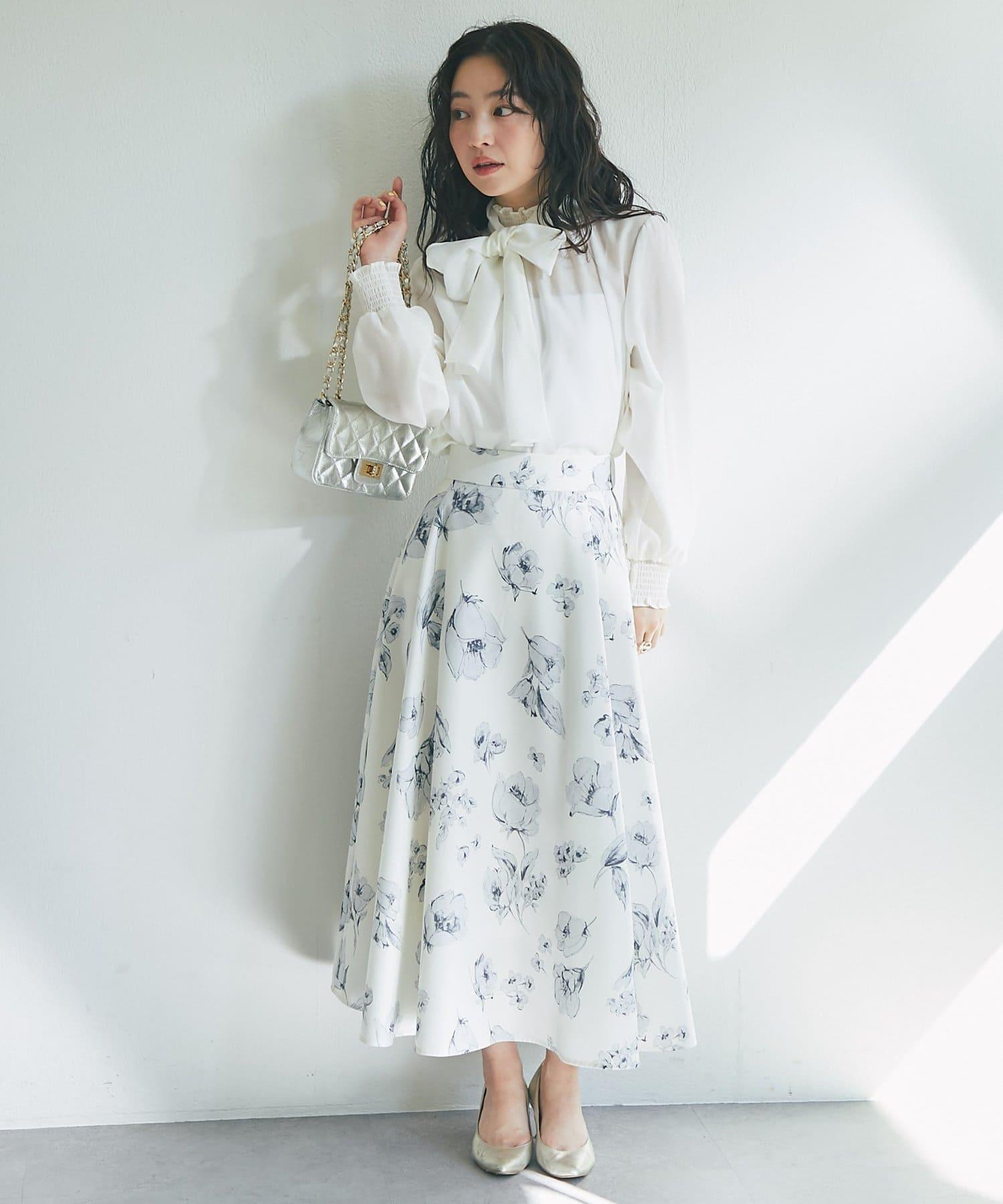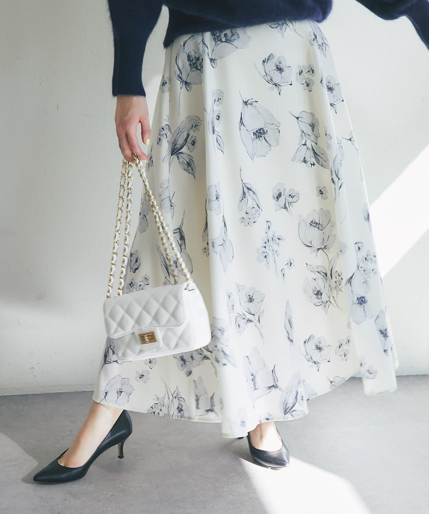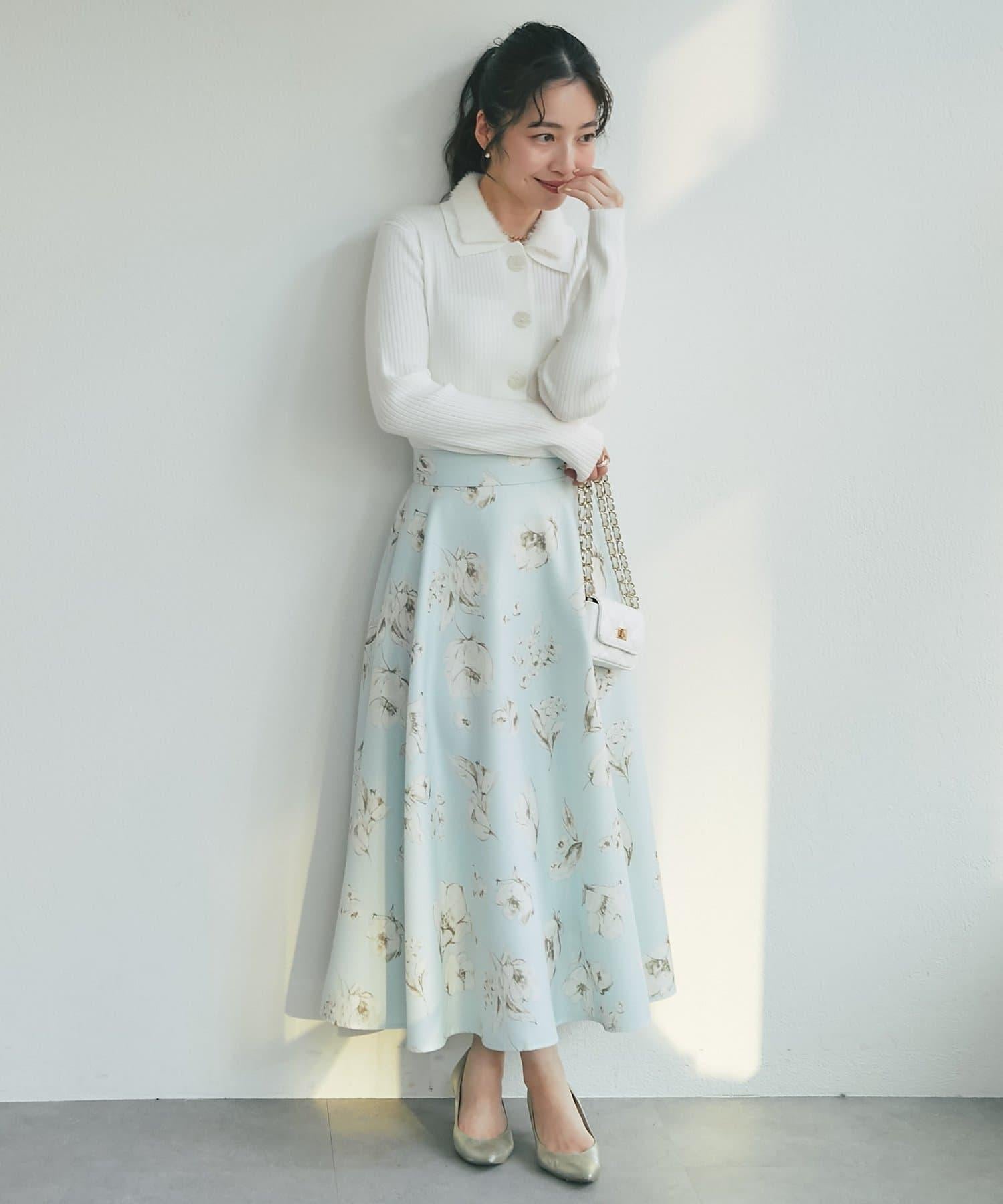 帶有精緻水彩觸感的喇叭裙,花朵圖案營造出女性的柔美氛圍。