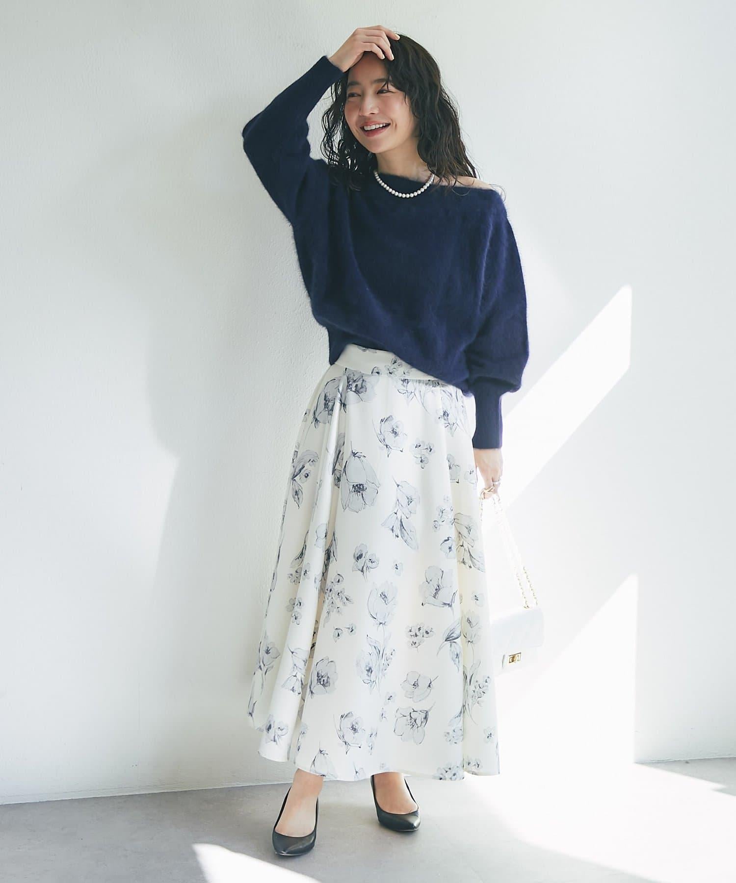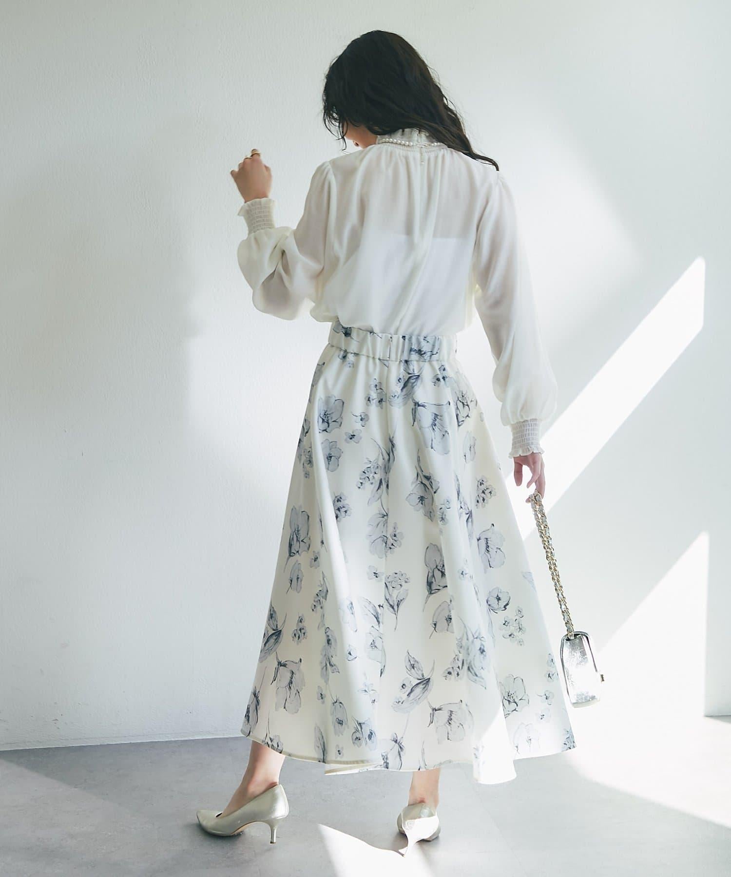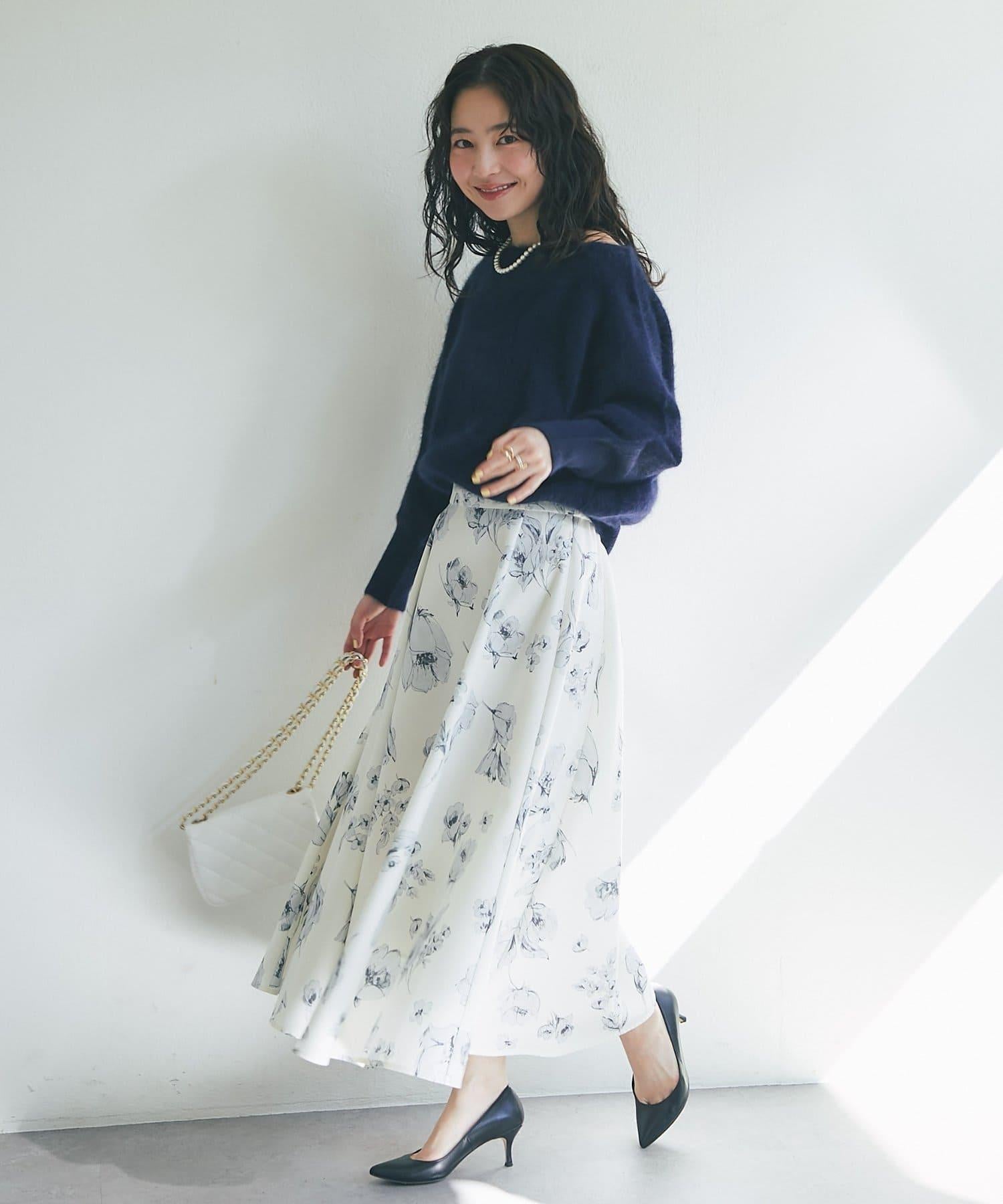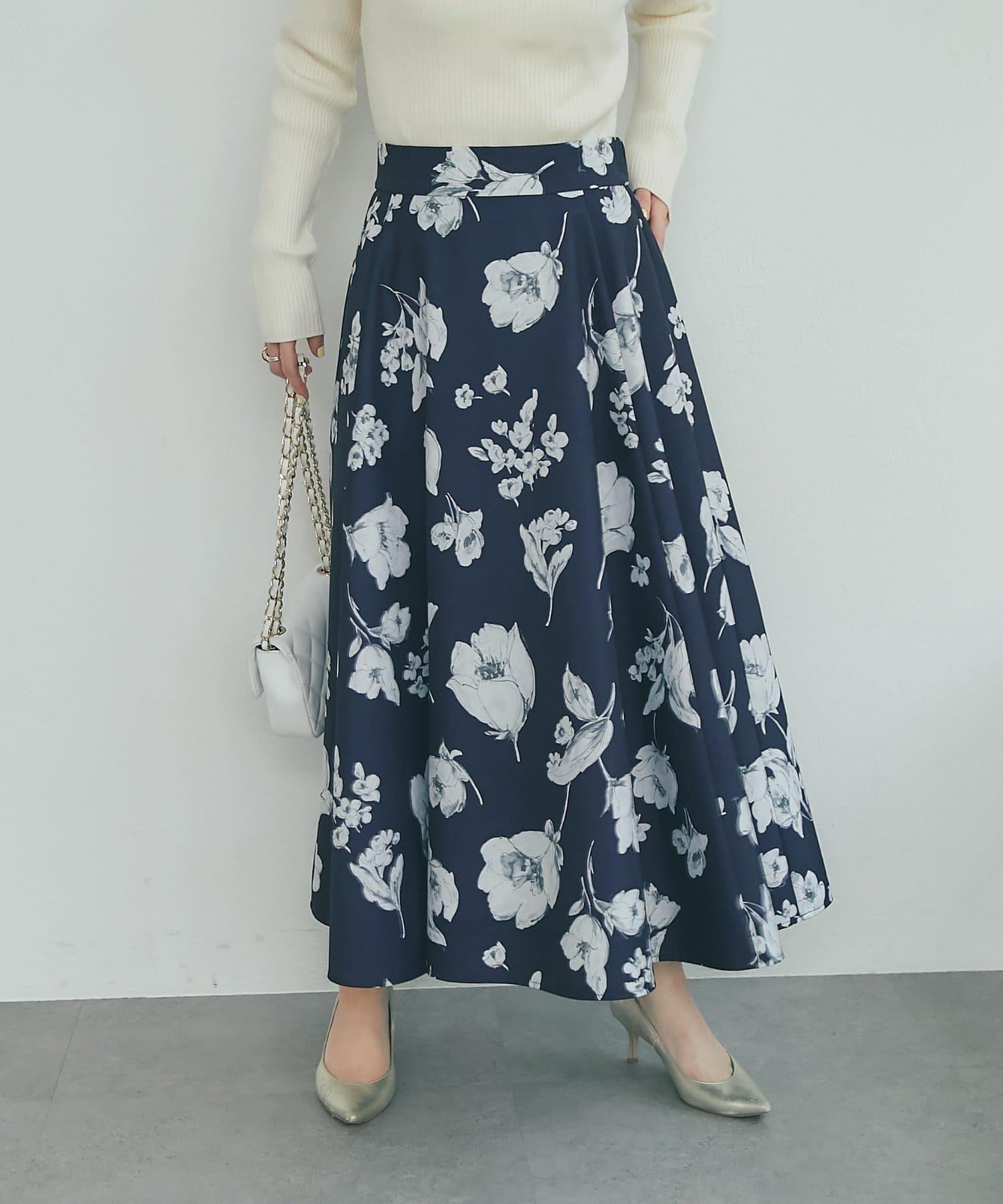 帶有精緻水彩觸感的喇叭裙,花朵圖案營造出女性的柔美氛圍。