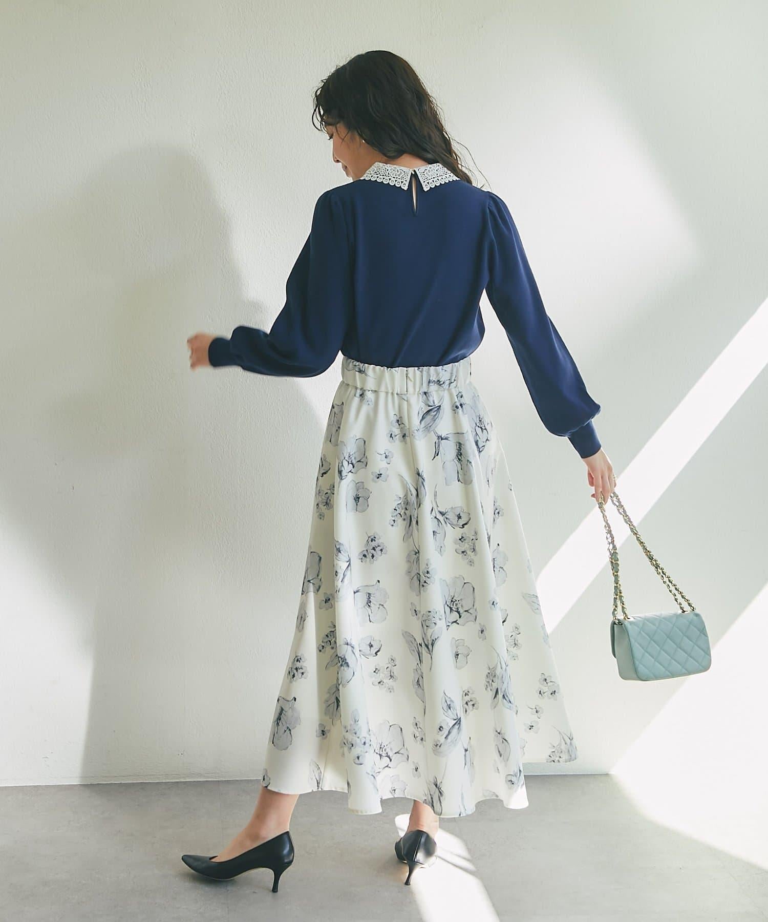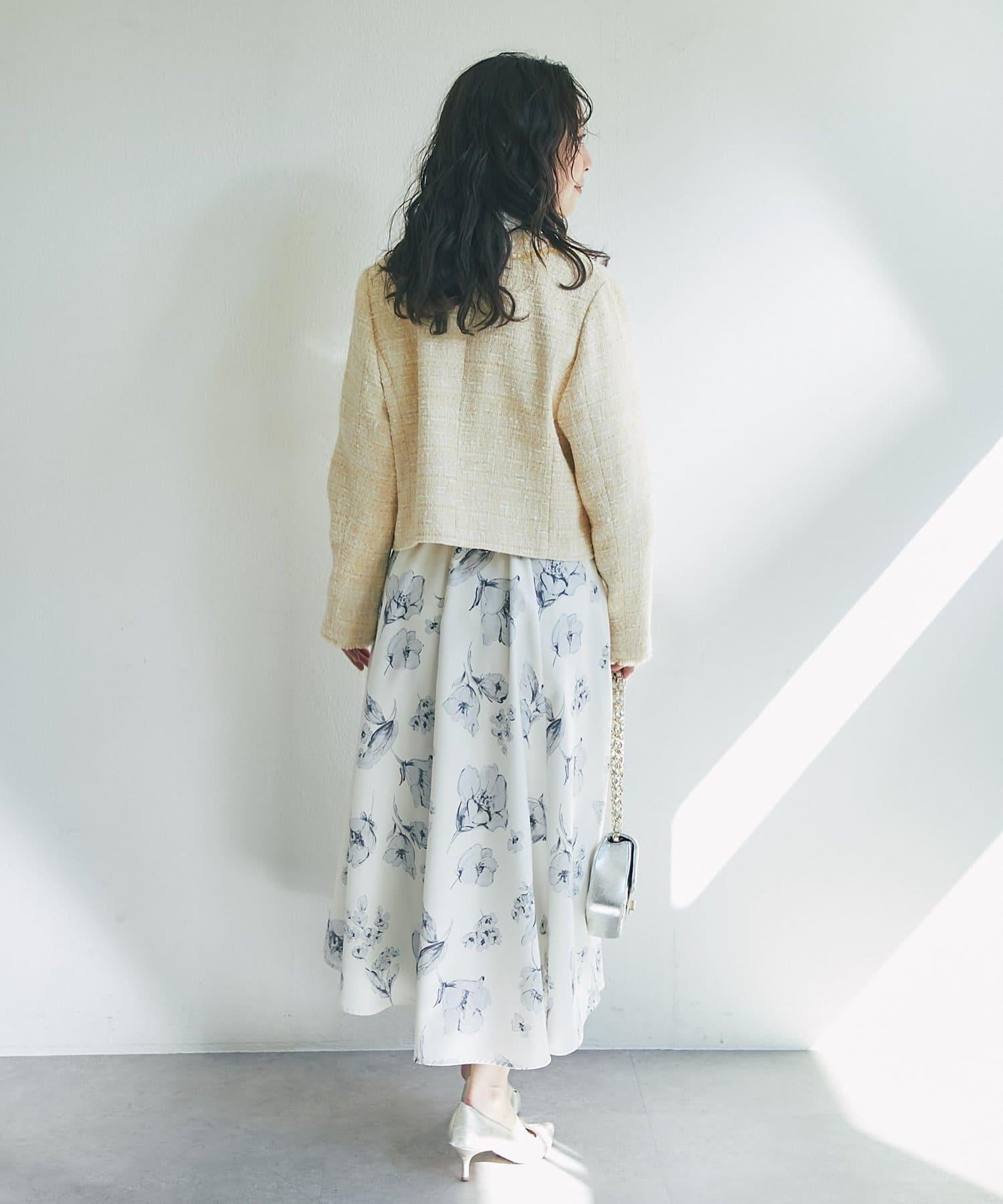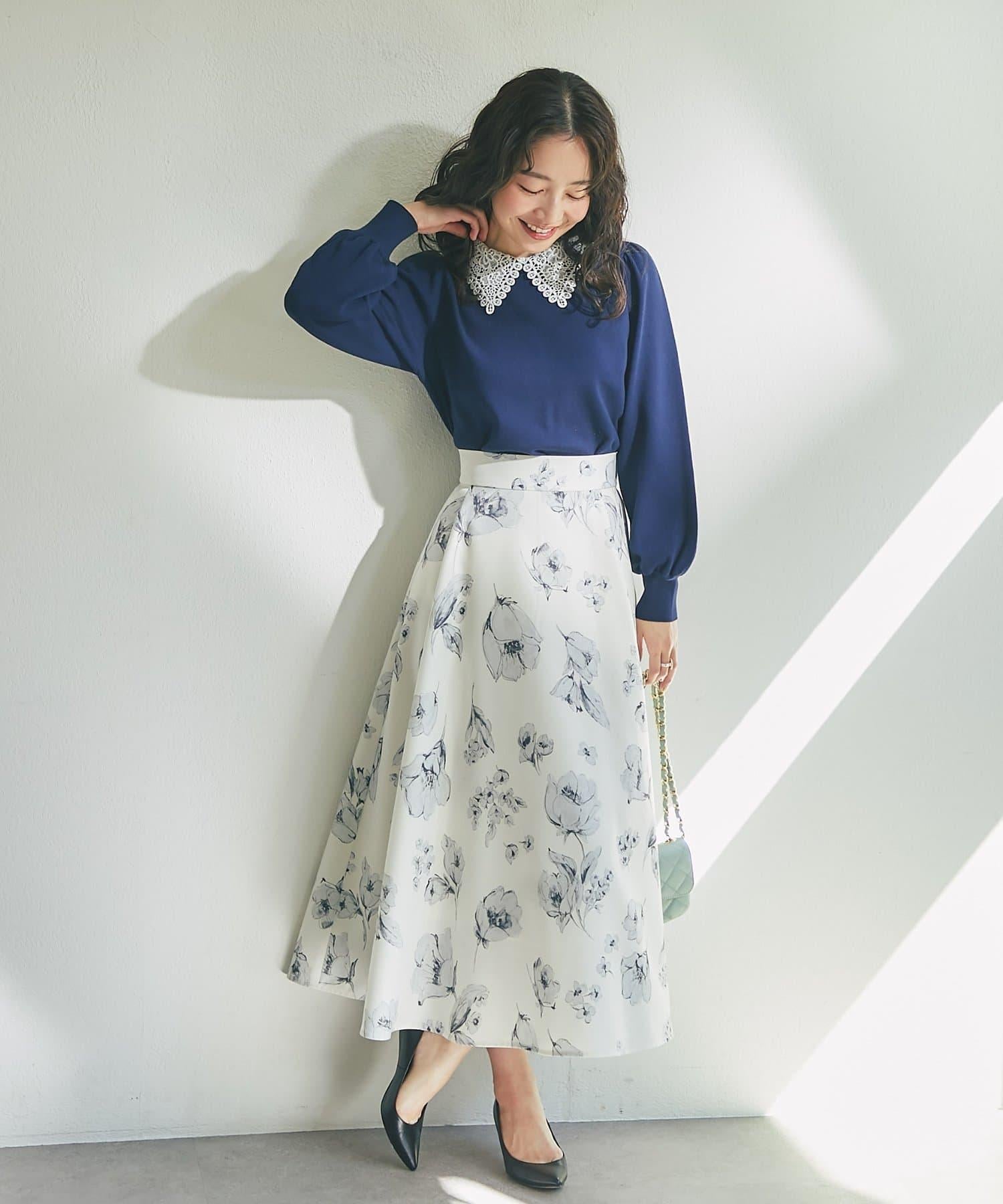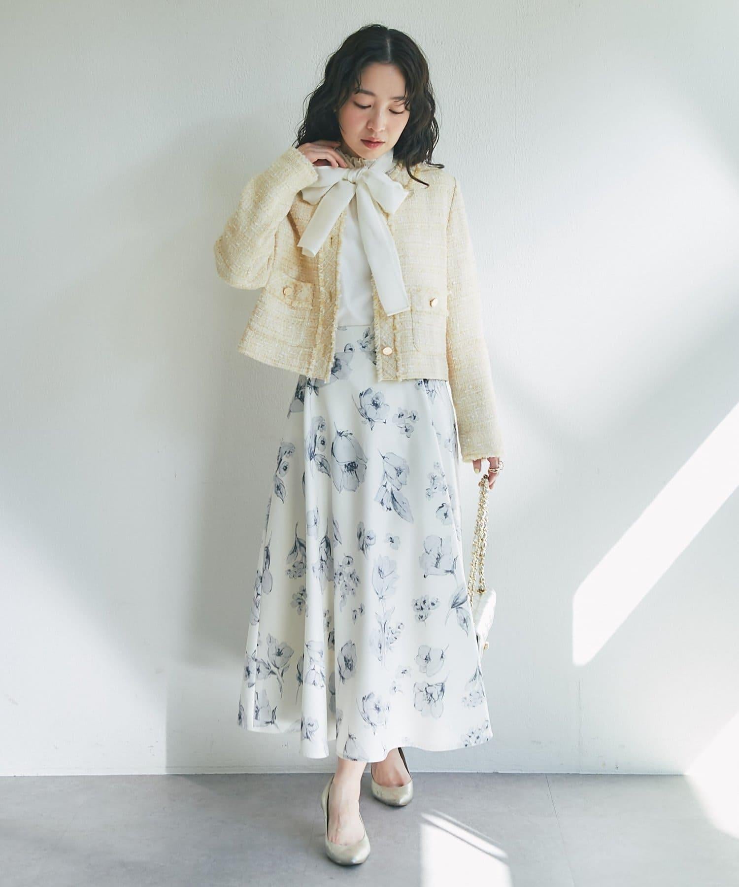 帶有精緻水彩觸感的喇叭裙,花朵圖案營造出女性的柔美氛圍。