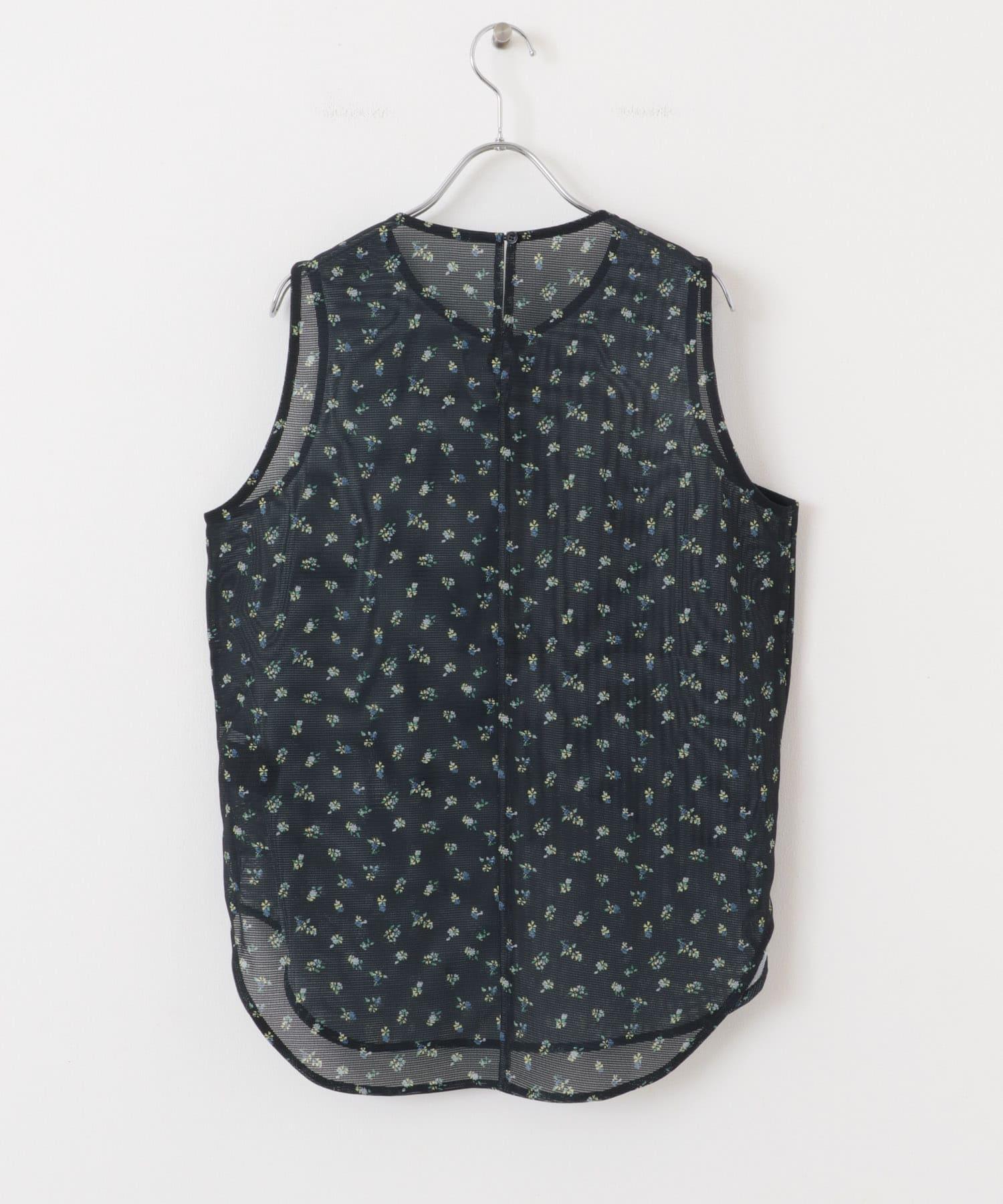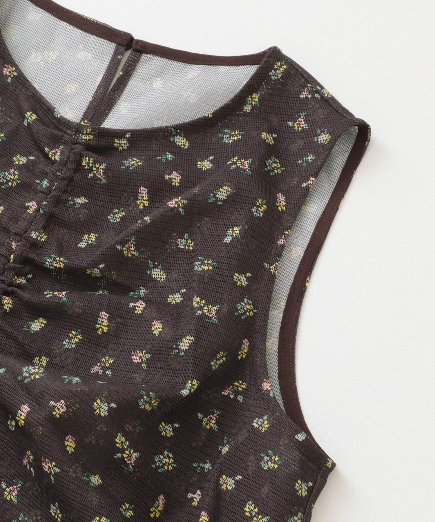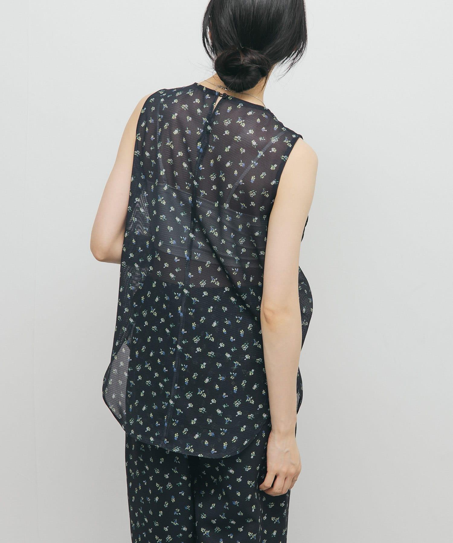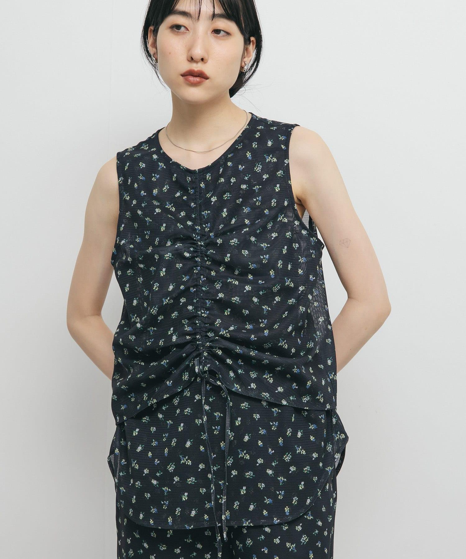 透氣網眼面料上印有花朵圖案。前部為雙層設計,上身的褶皺設計給人以迷人的印象。無袖設計,即使在炎熱的夏季也能穿著涼爽。同樣材質的花朵印花網眼長褲(KBA5-24R390)也可供選擇。