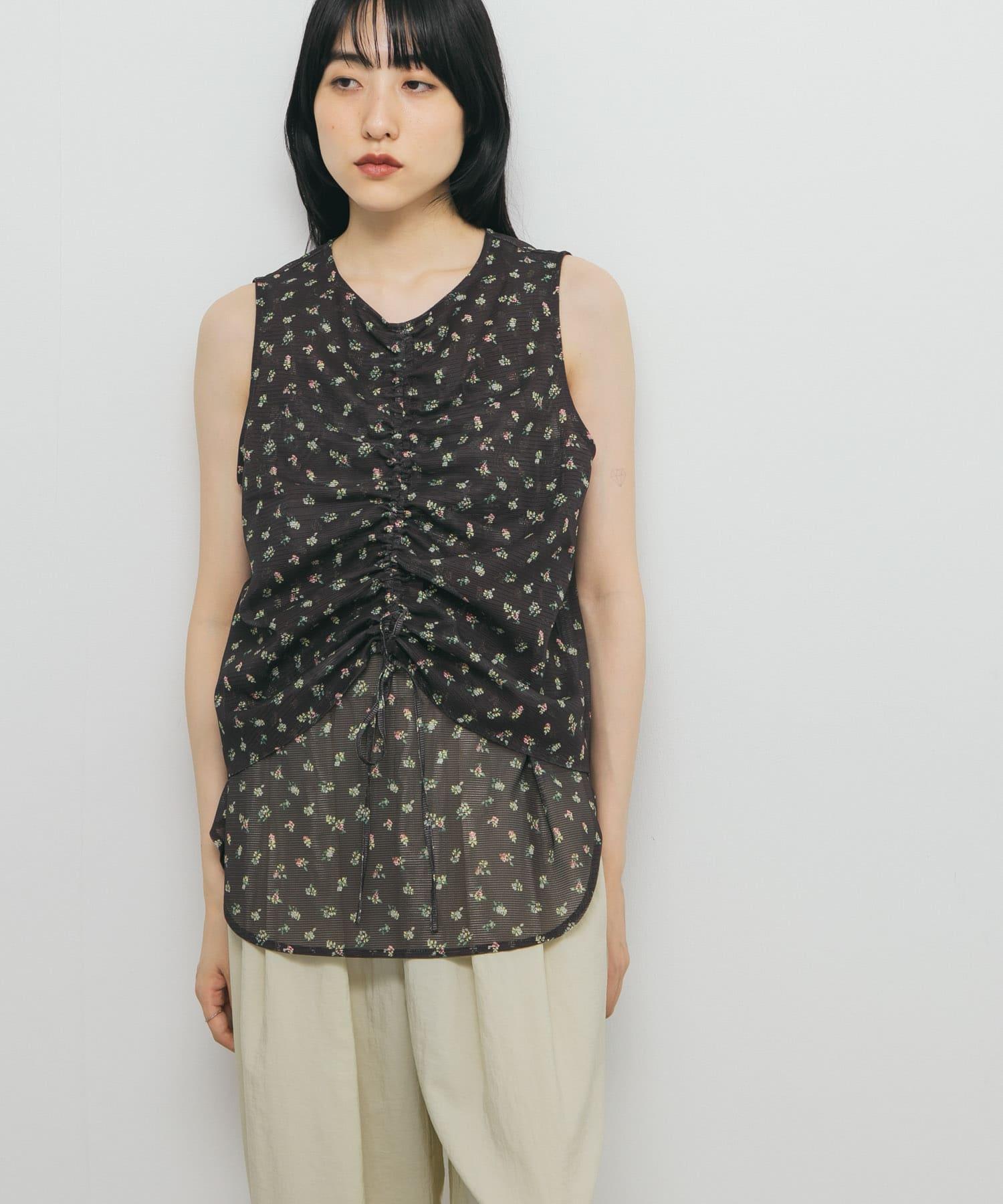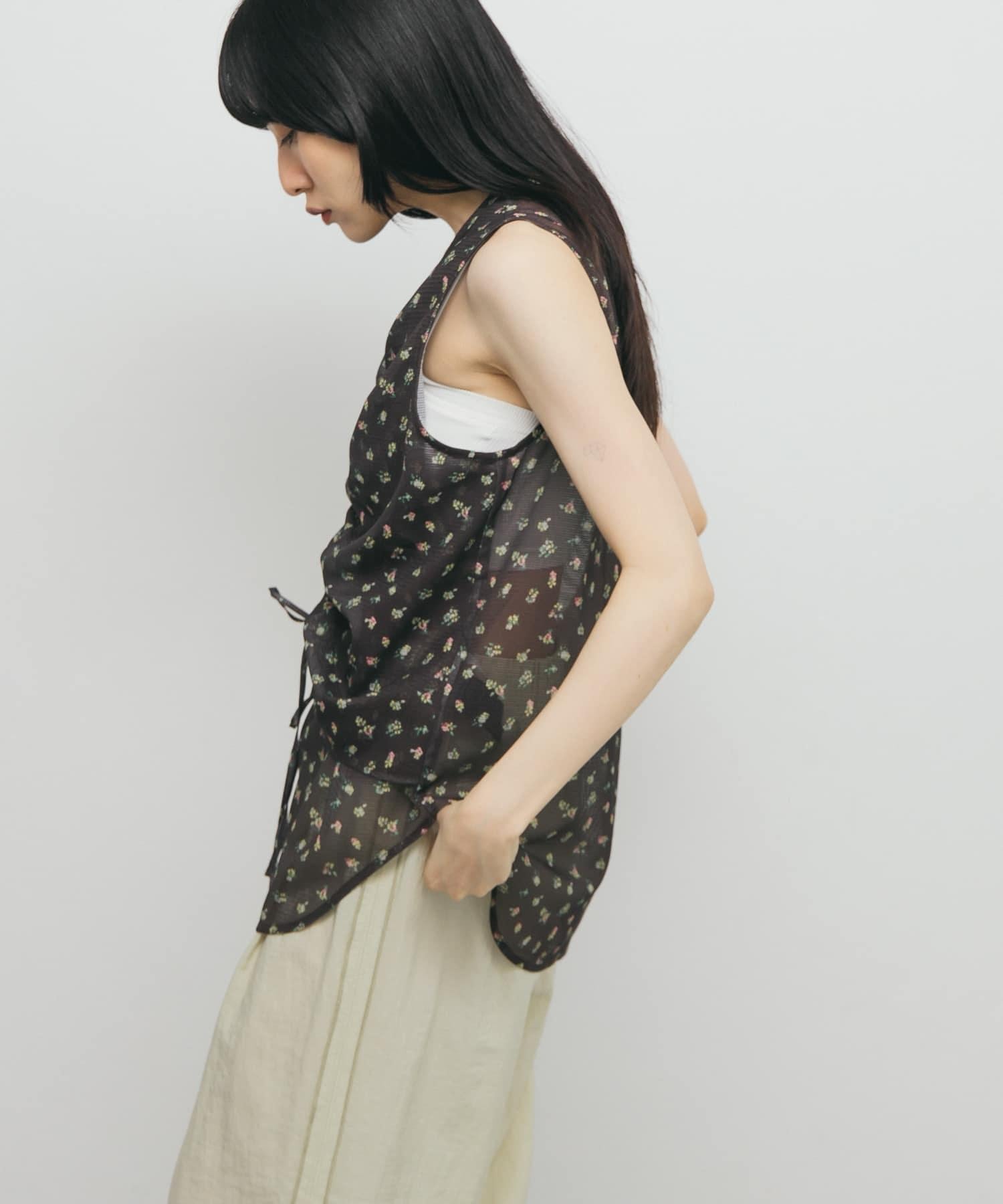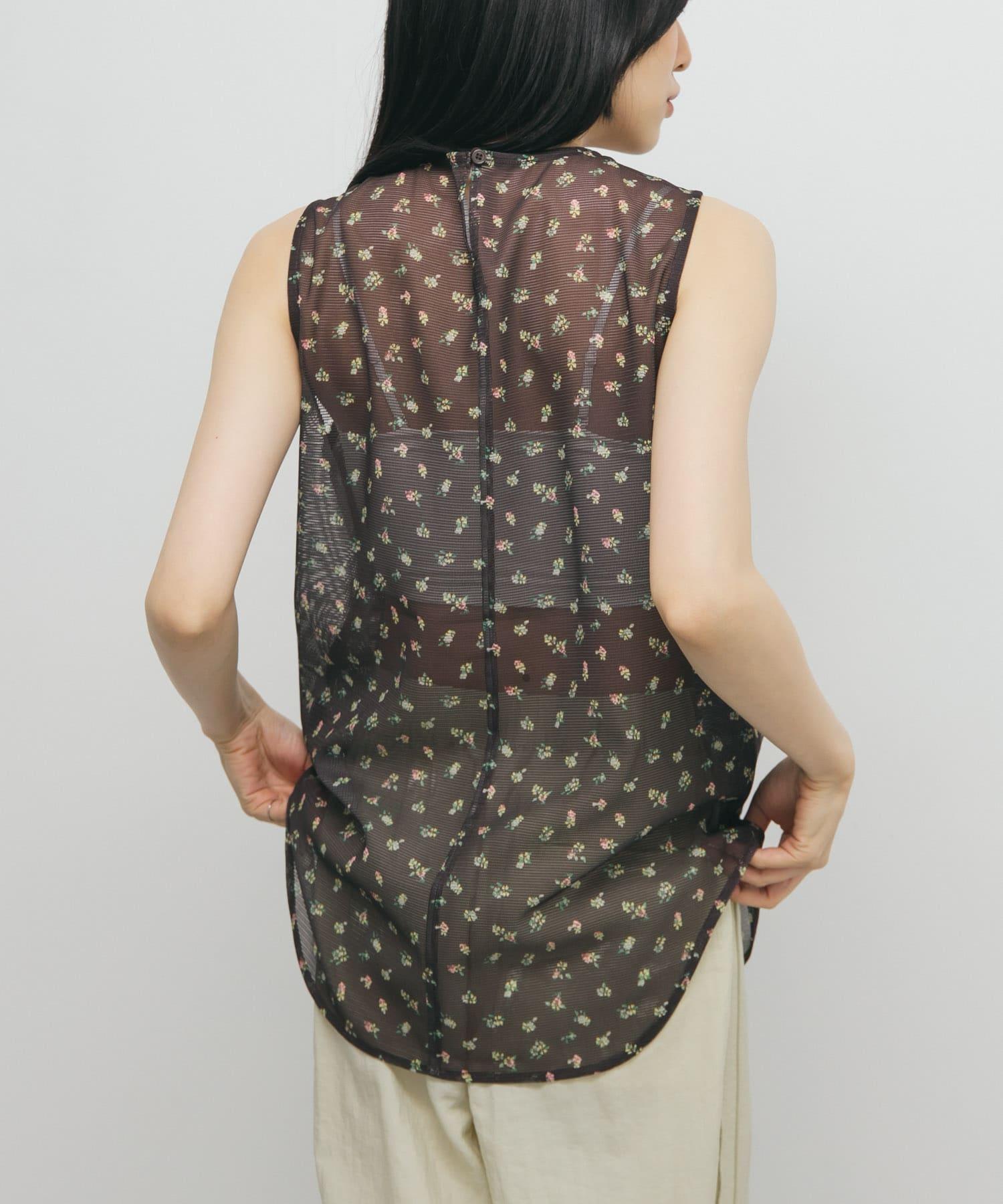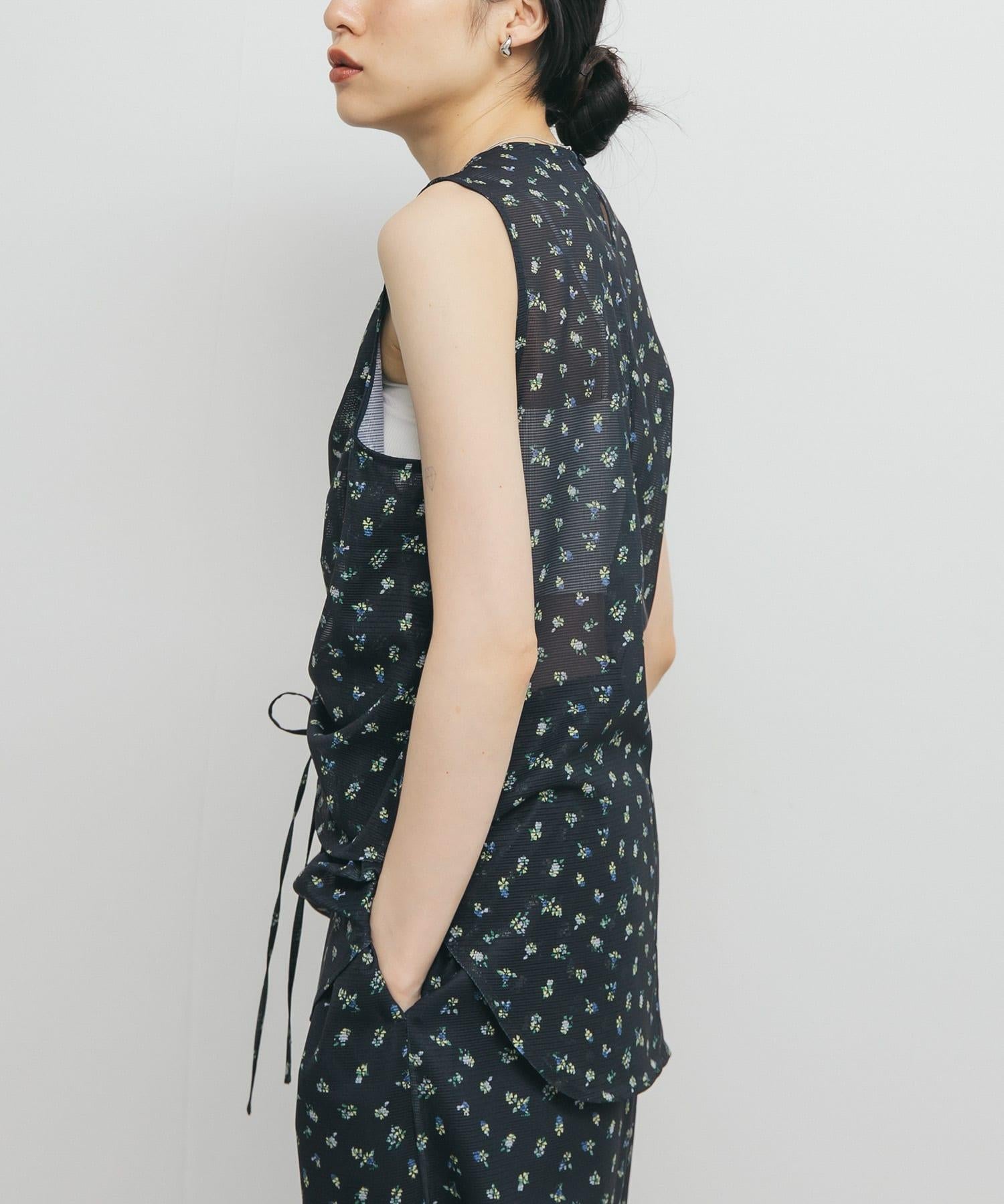 透氣網眼面料上印有花朵圖案。前部為雙層設計,上身的褶皺設計給人以迷人的印象。無袖設計,即使在炎熱的夏季也能穿著涼爽。同樣材質的花朵印花網眼長褲(KBA5-24R390)也可供選擇。