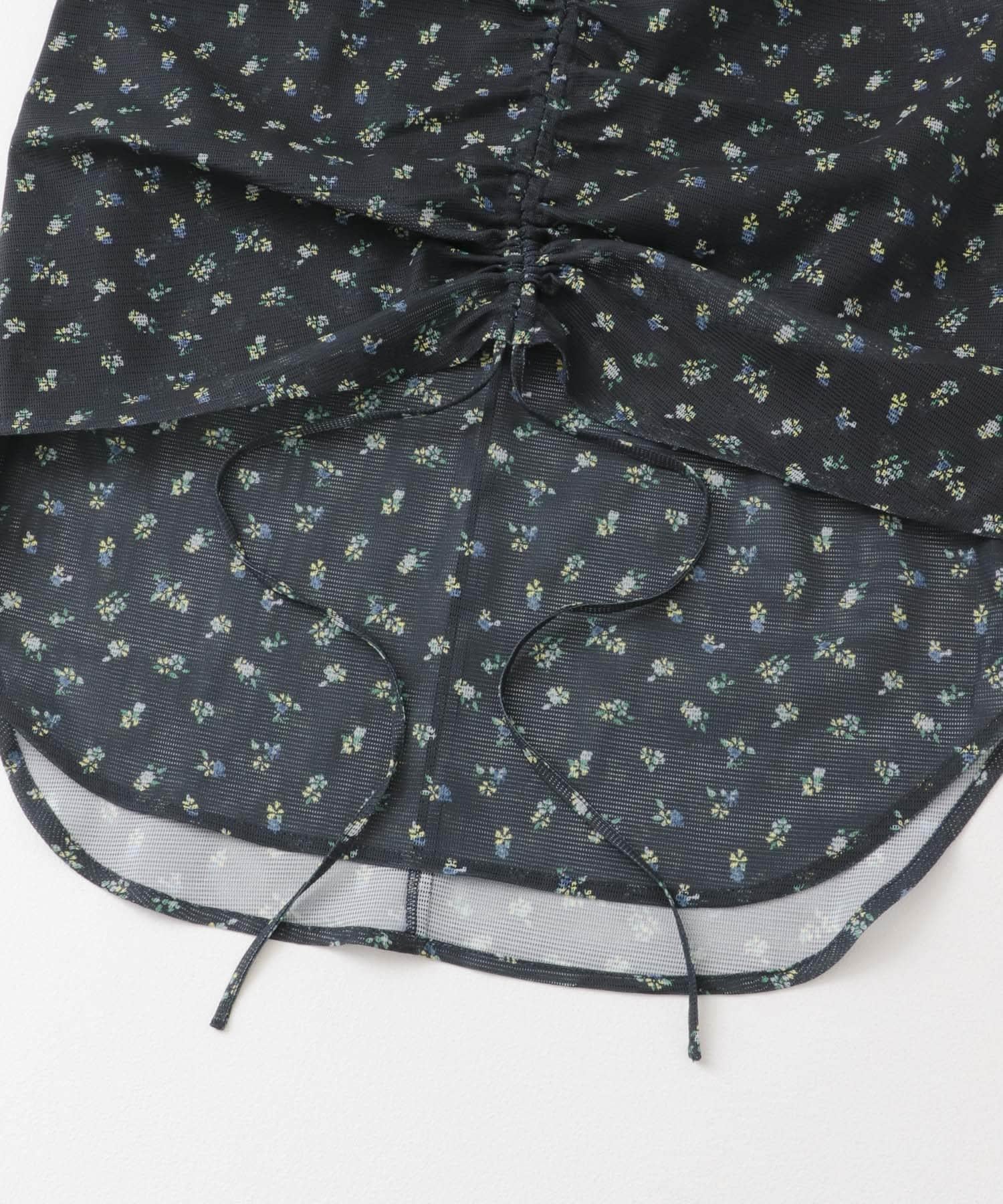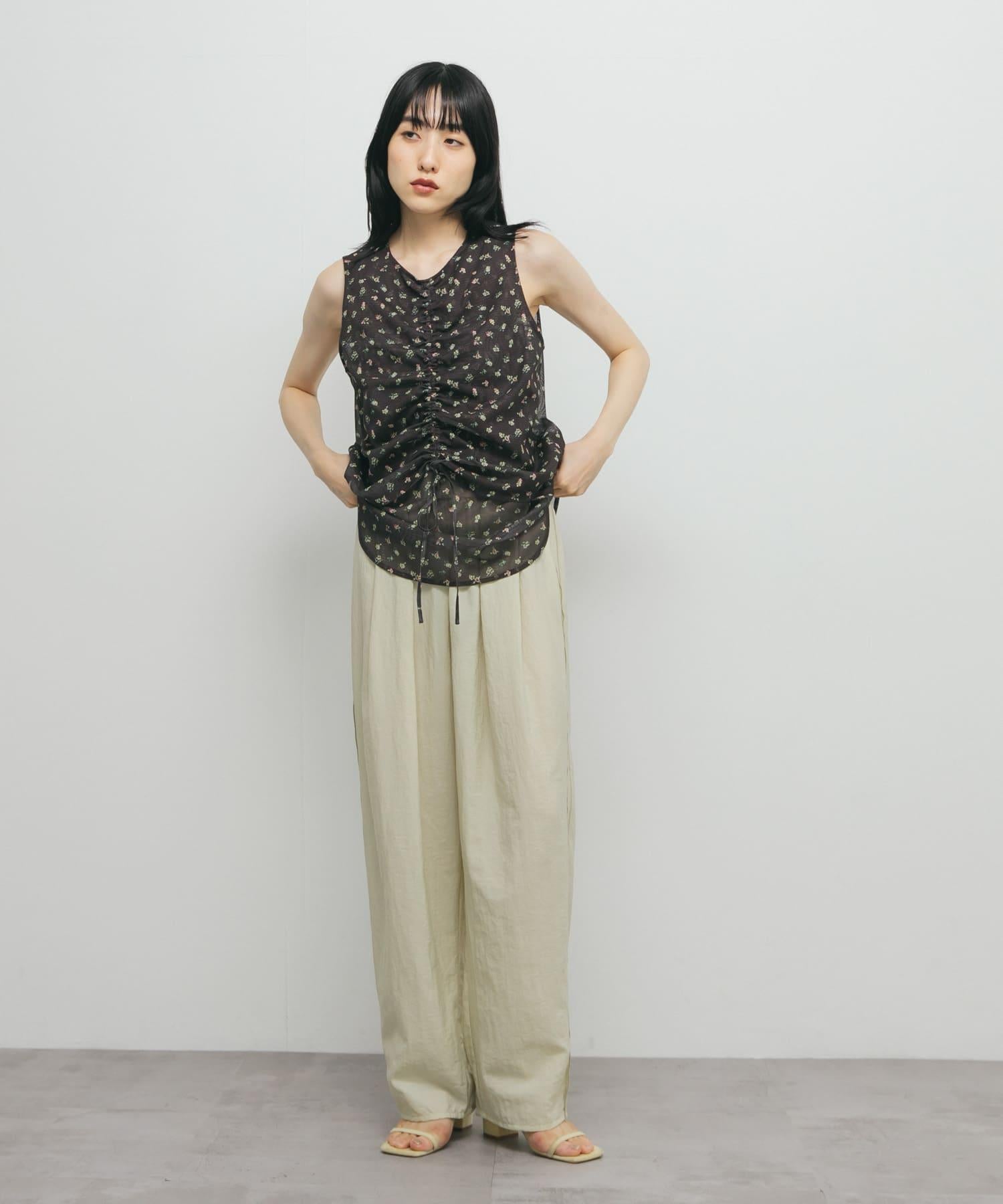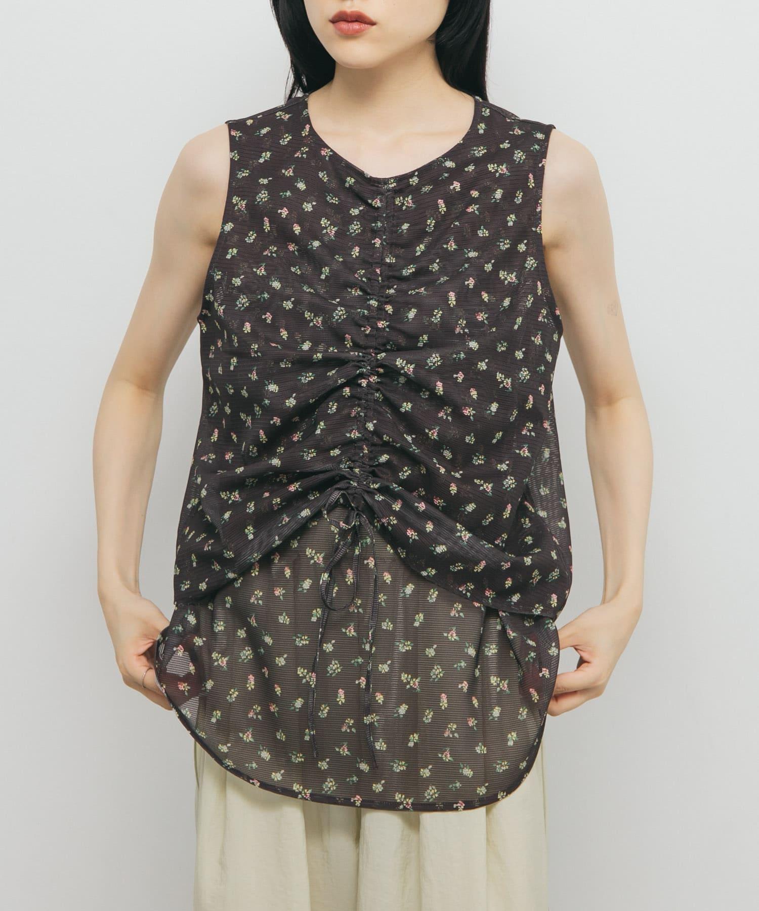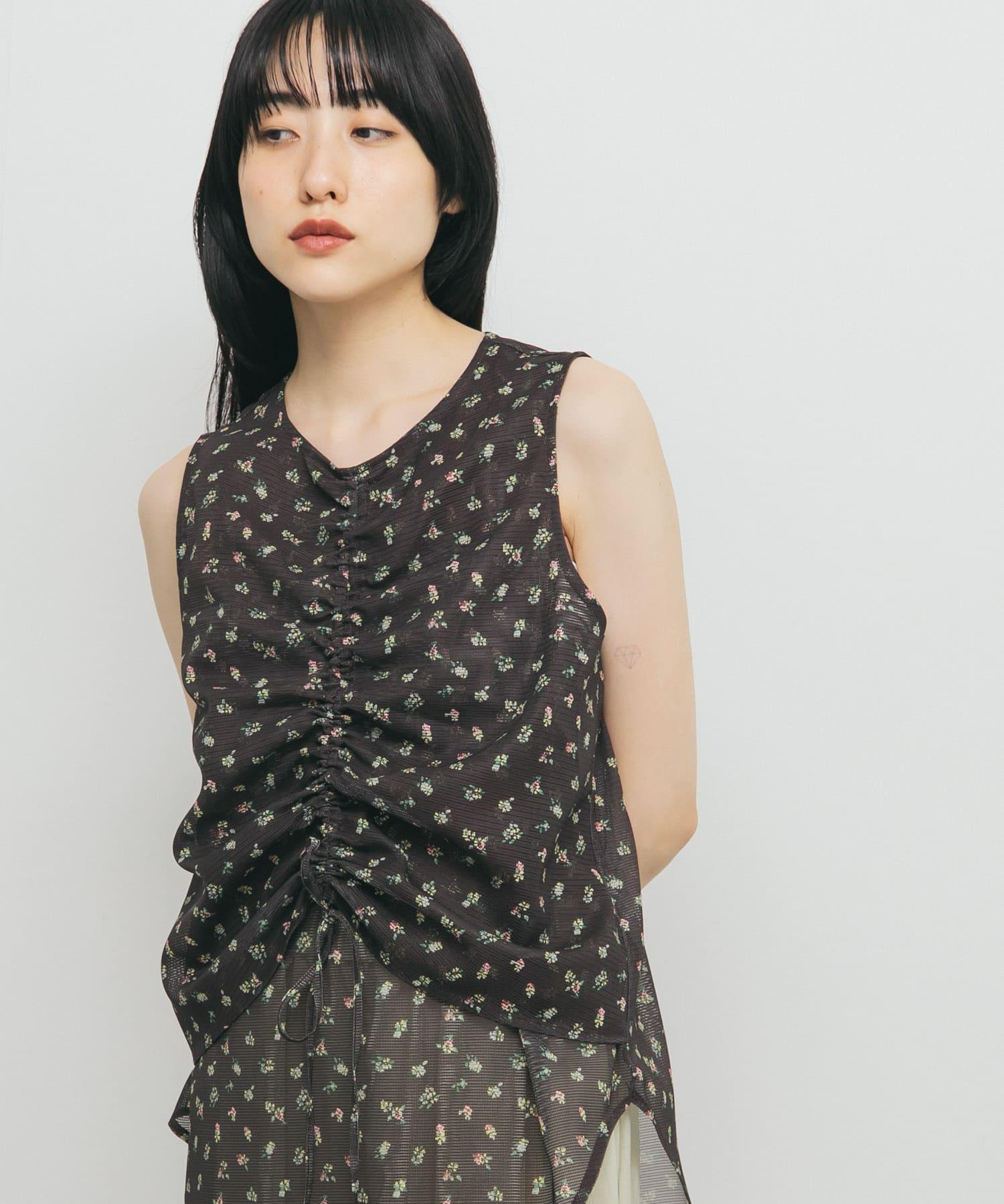 透氣網眼面料上印有花朵圖案。前部為雙層設計,上身的褶皺設計給人以迷人的印象。無袖設計,即使在炎熱的夏季也能穿著涼爽。同樣材質的花朵印花網眼長褲(KBA5-24R390)也可供選擇。