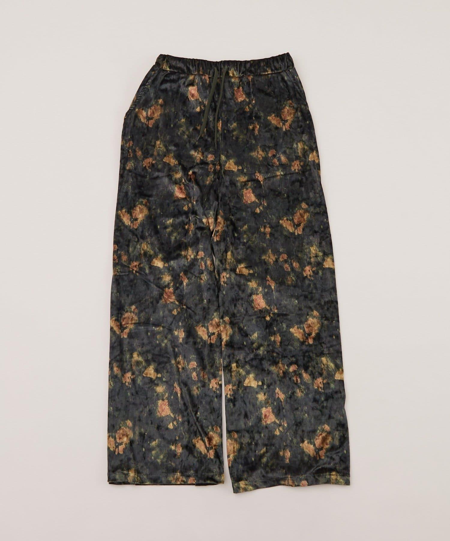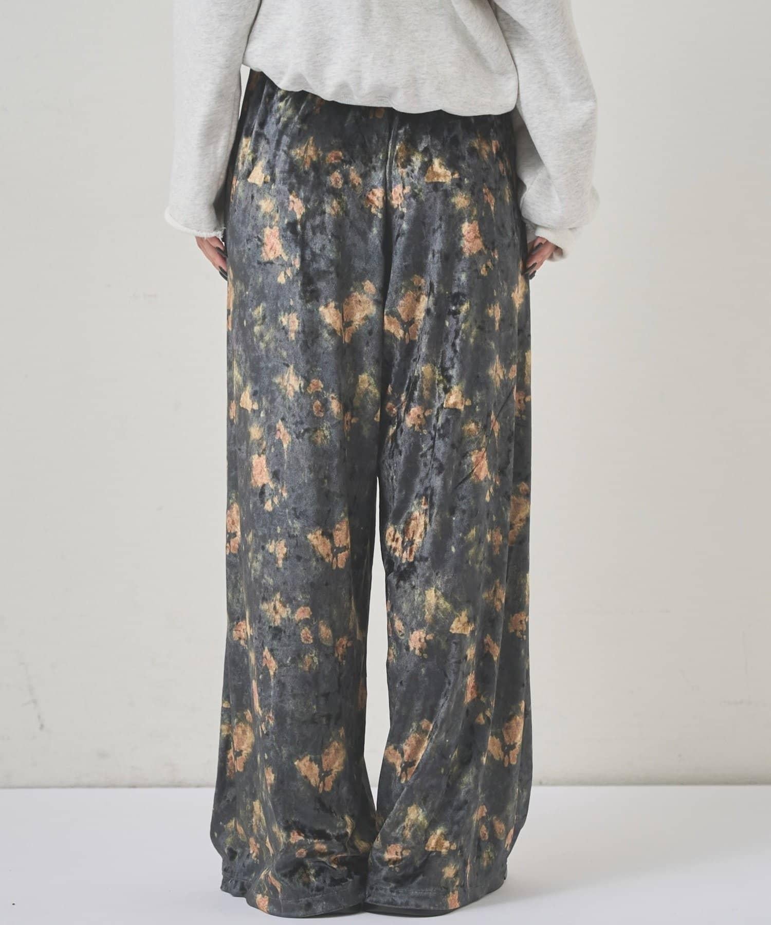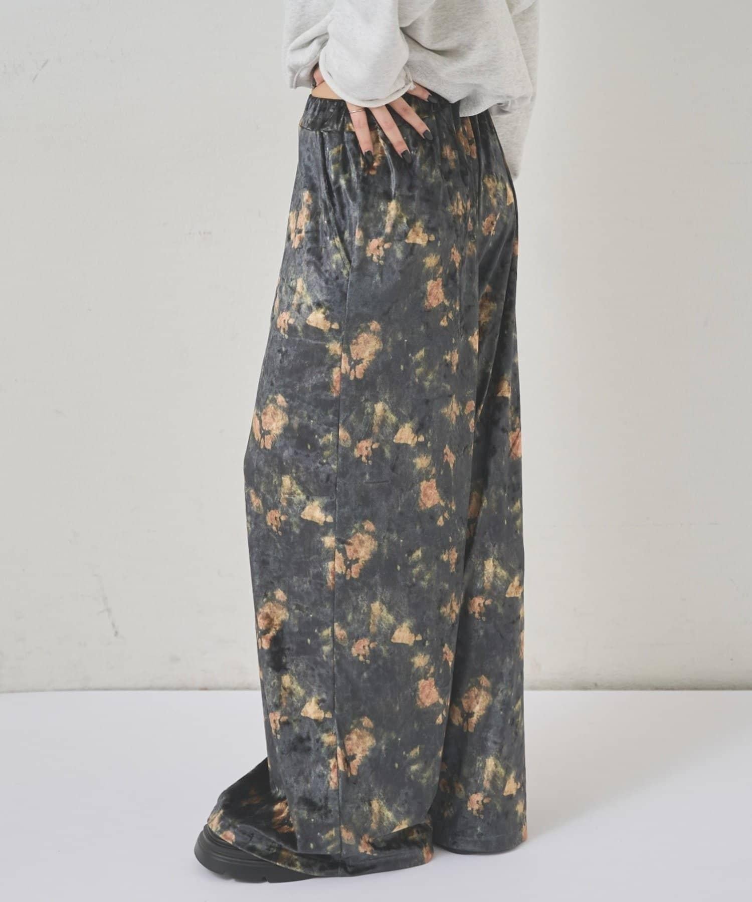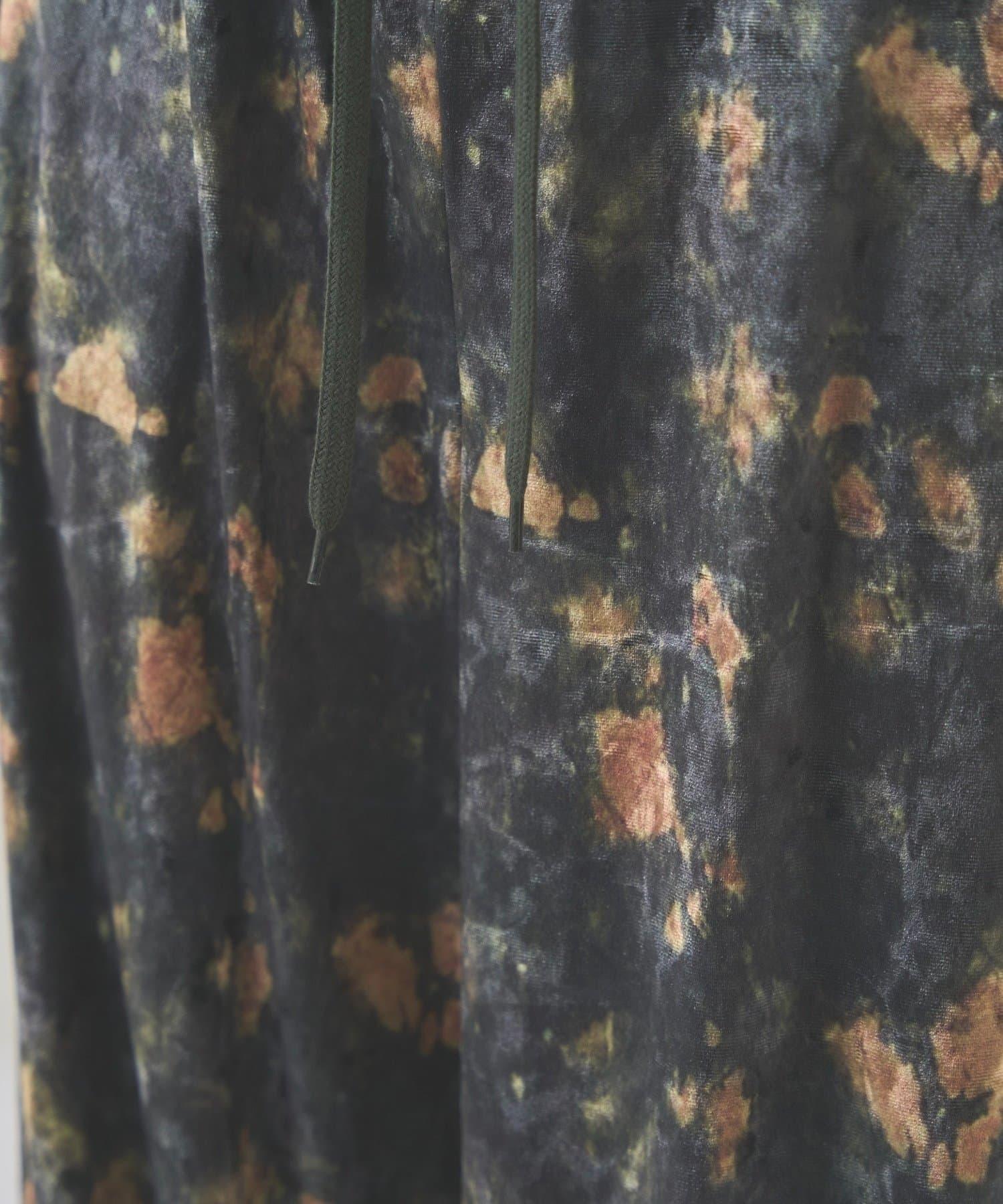 天鵝絨面料的休閒褲,光澤優雅,印有華麗的花朵圖案。