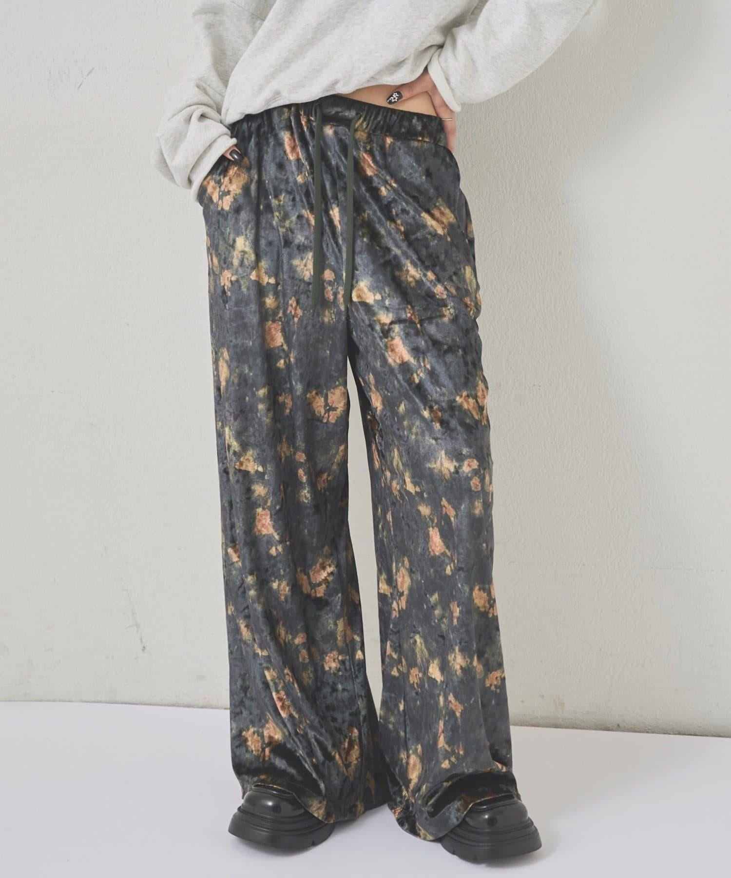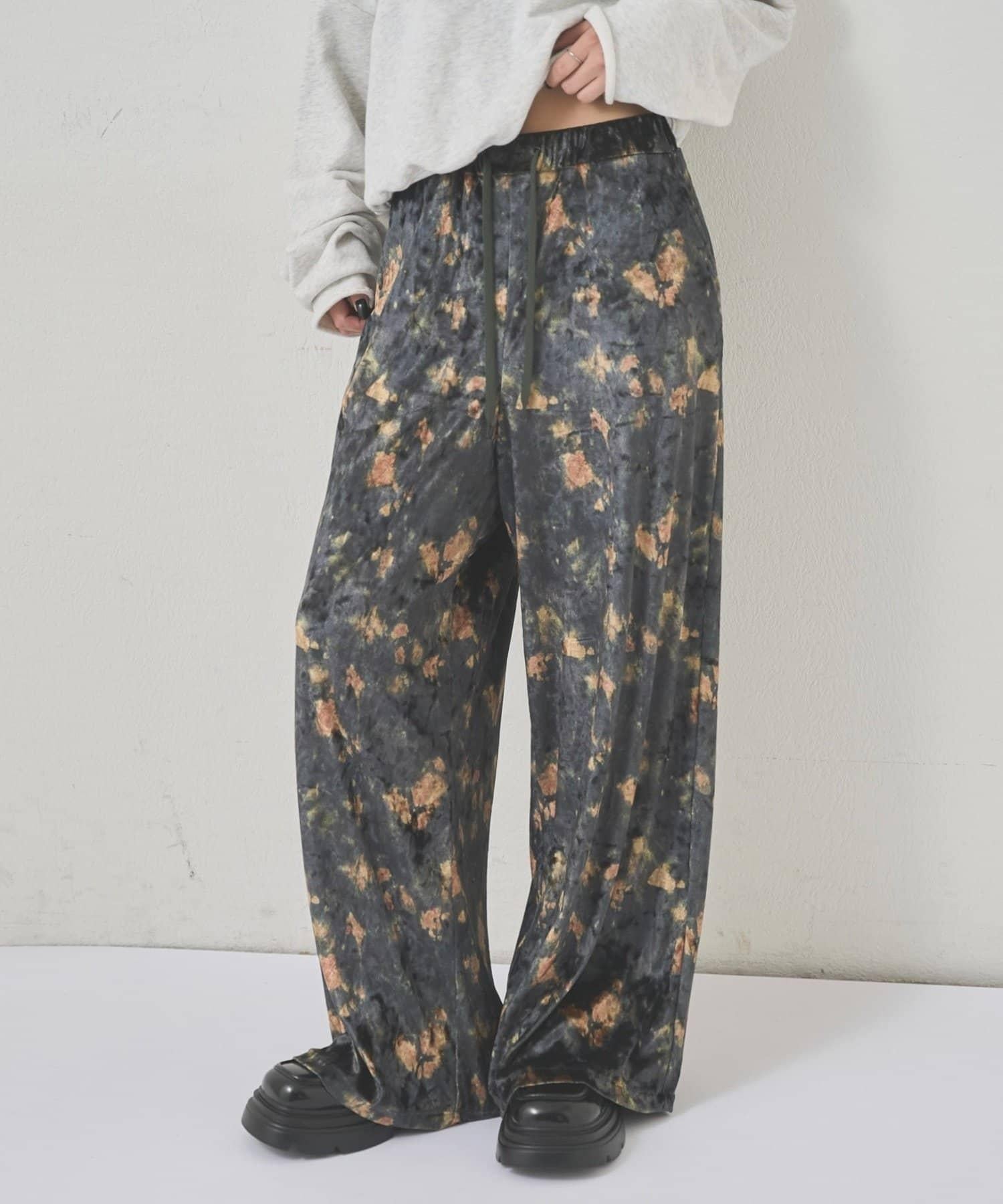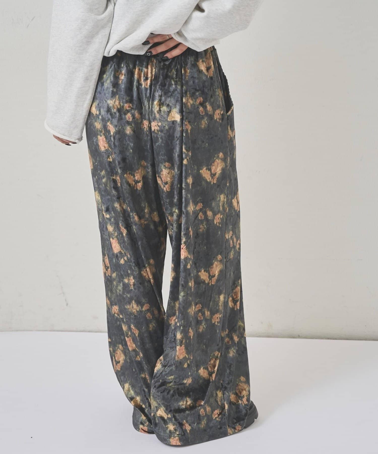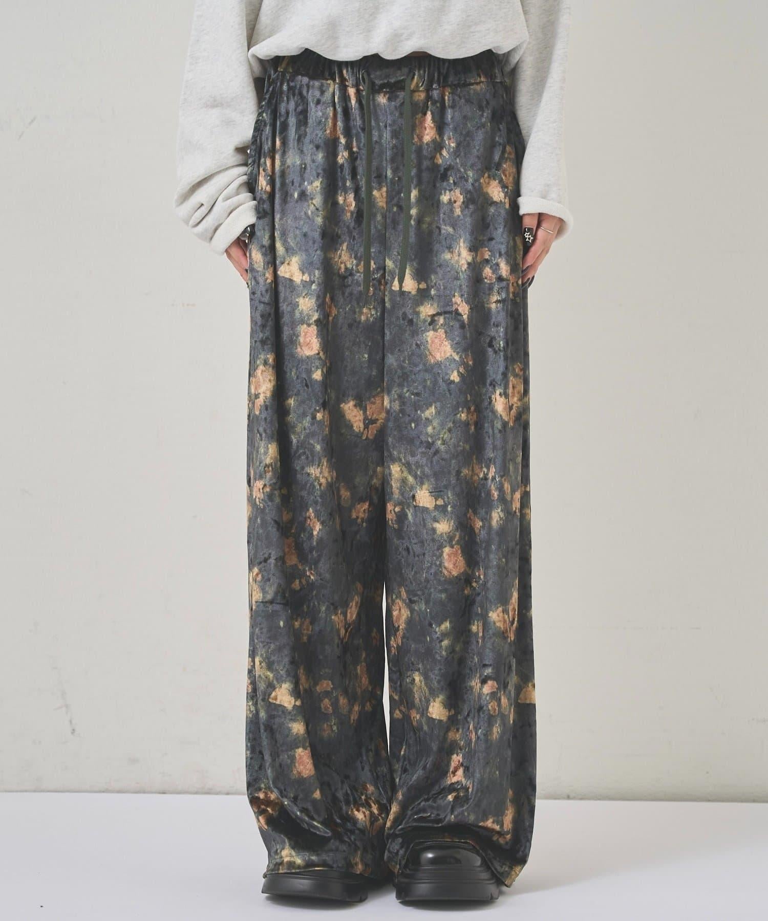天鵝絨面料的休閒褲,光澤優雅,印有華麗的花朵圖案。