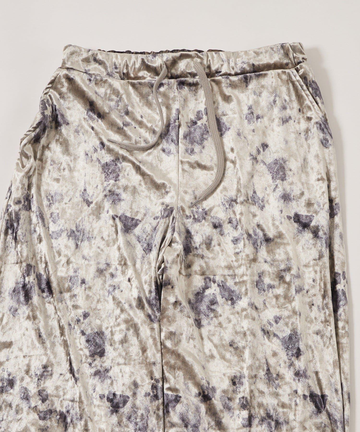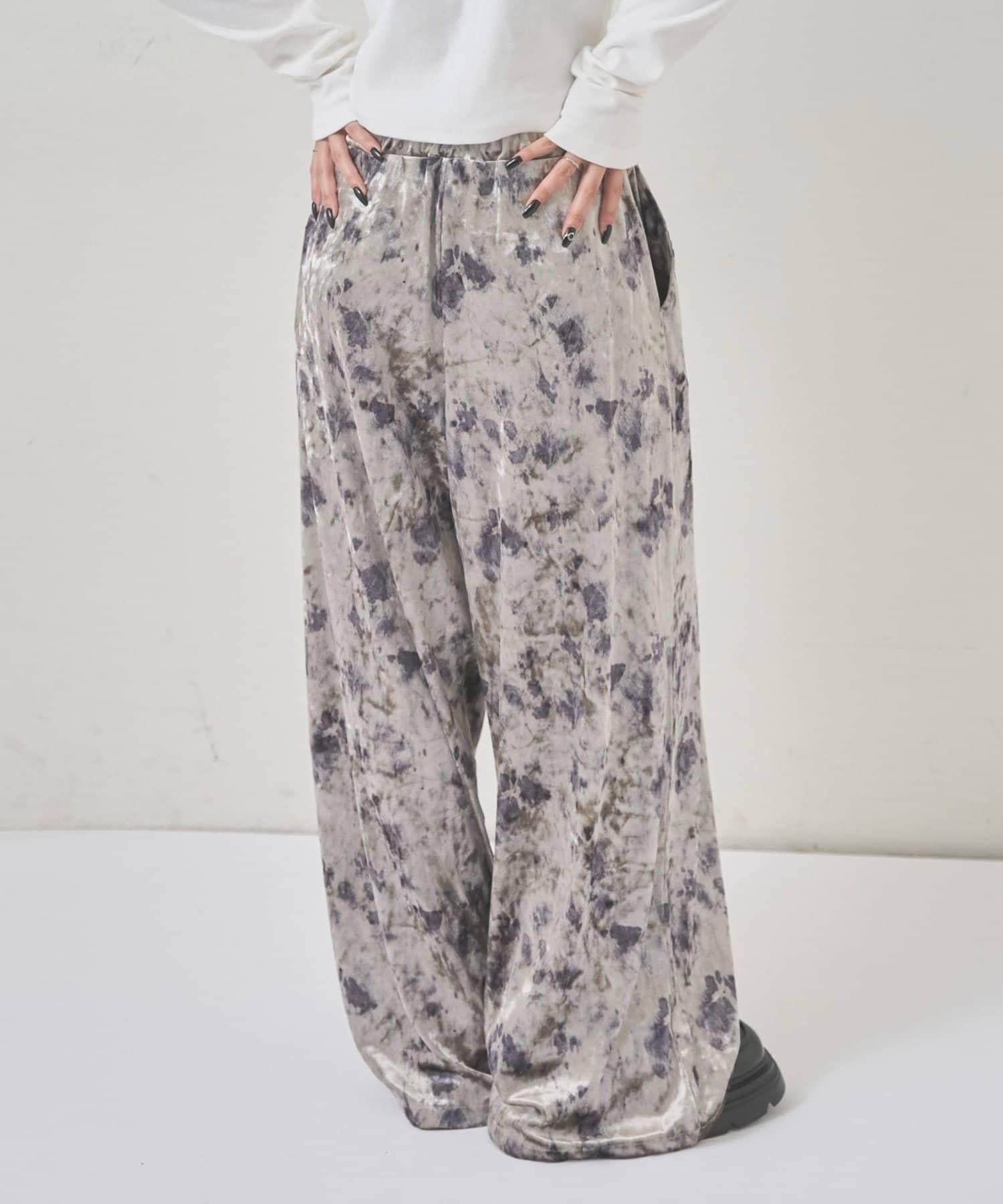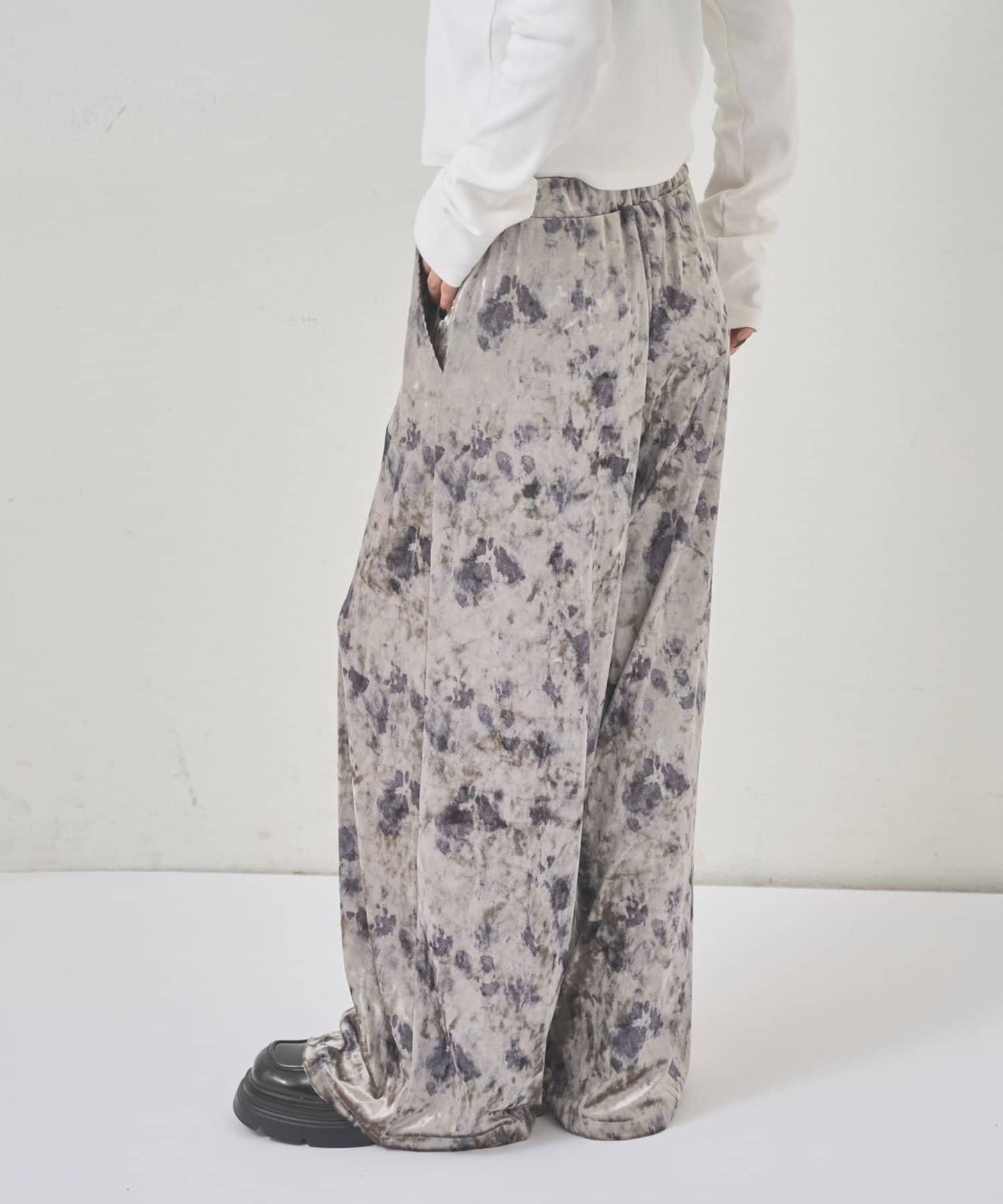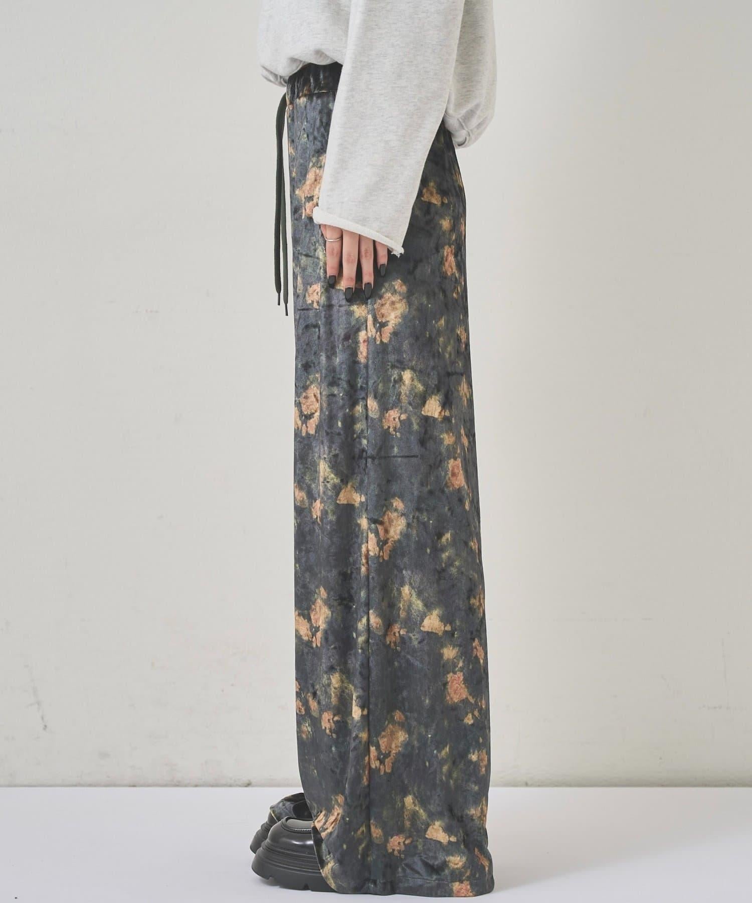 天鵝絨面料的休閒褲,光澤優雅,印有華麗的花朵圖案。