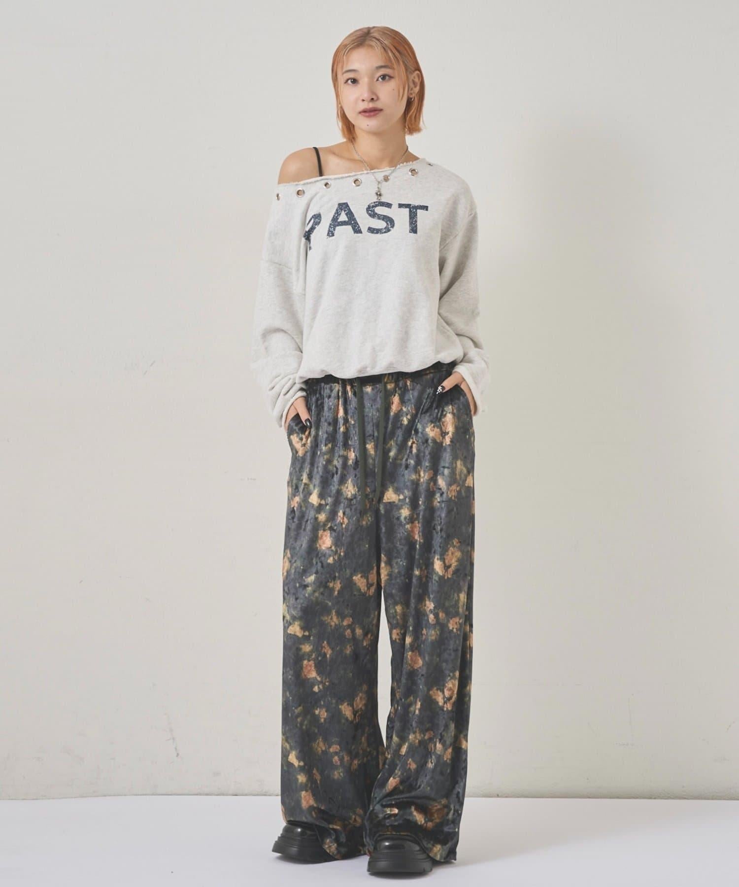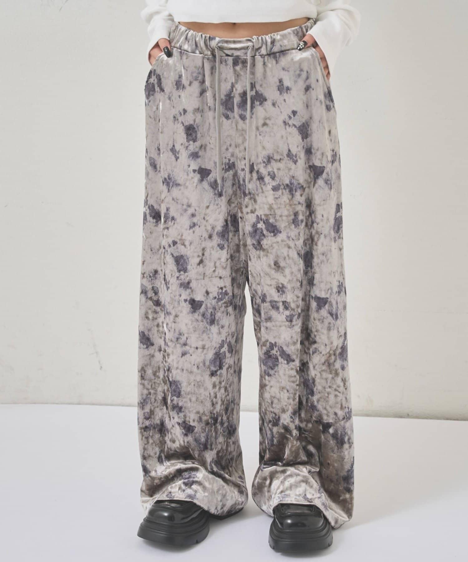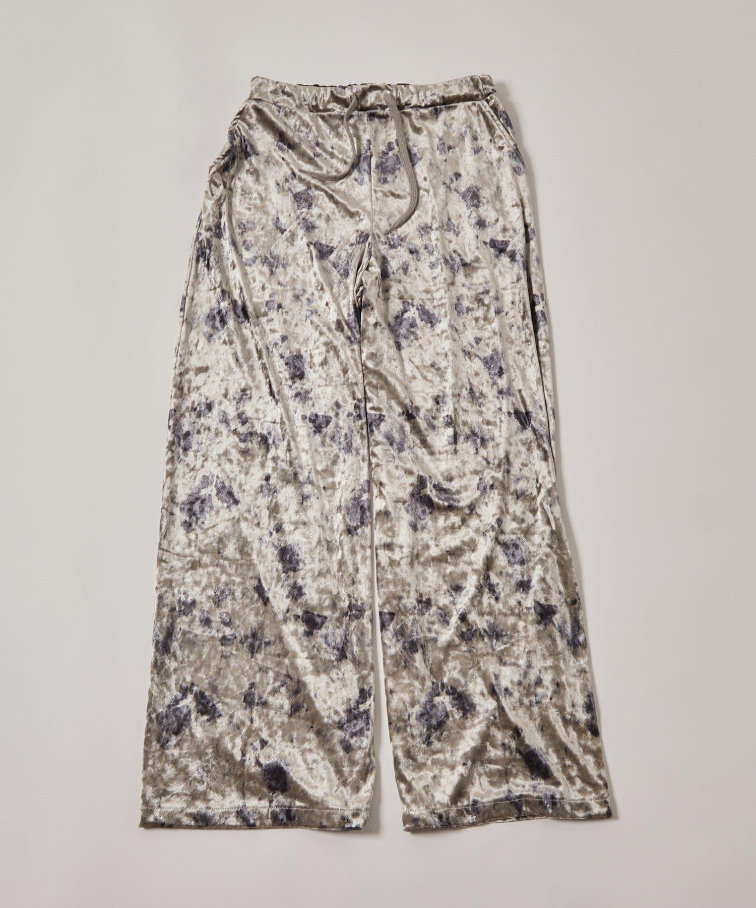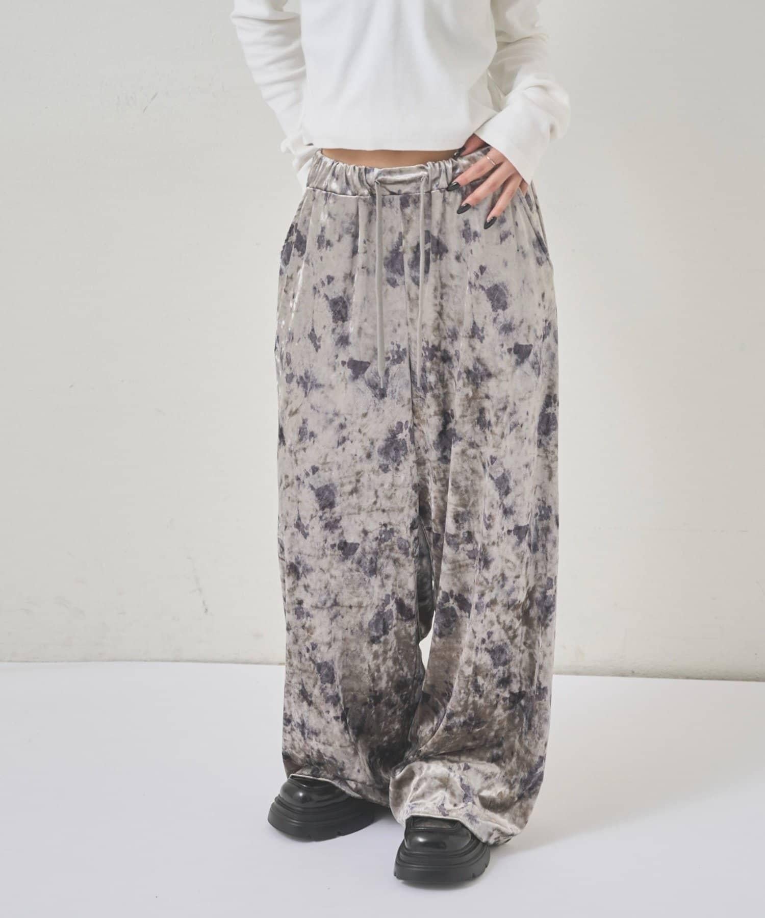 天鵝絨面料的休閒褲,光澤優雅,印有華麗的花朵圖案。