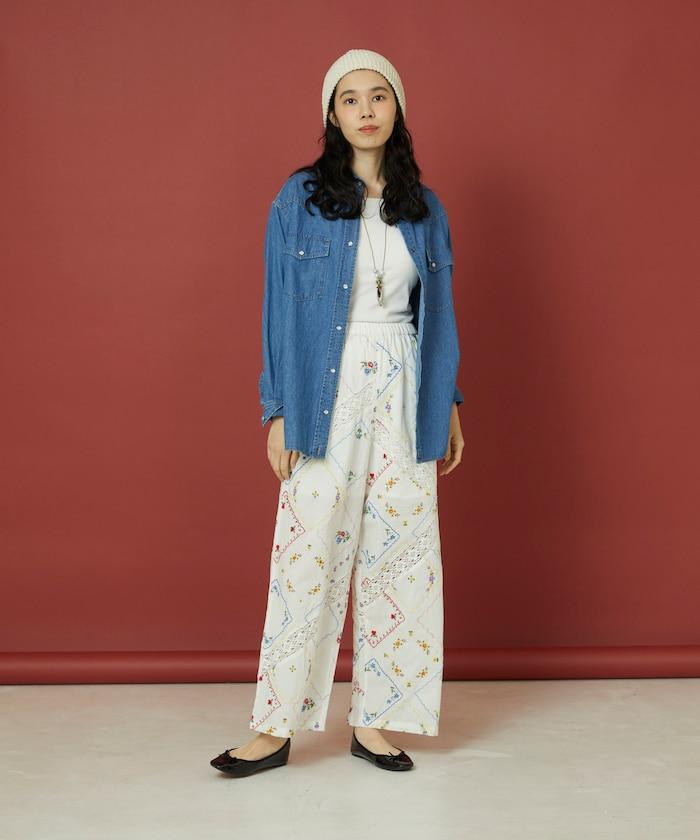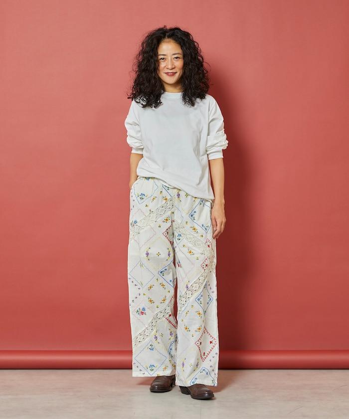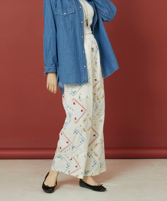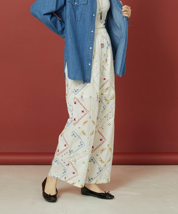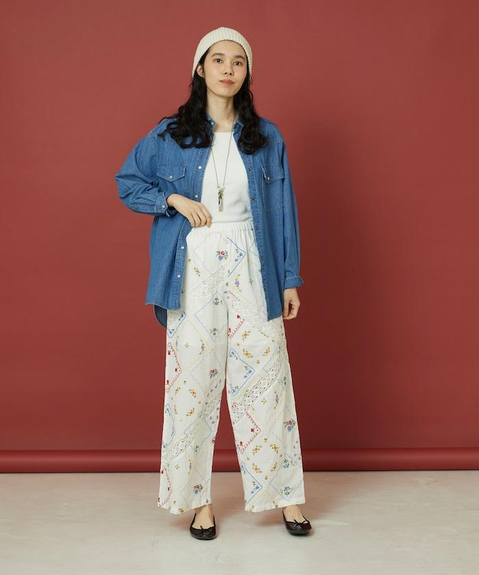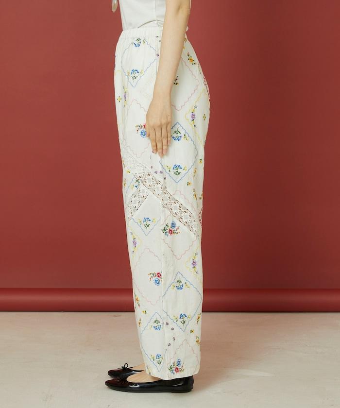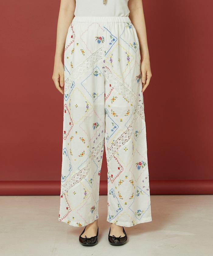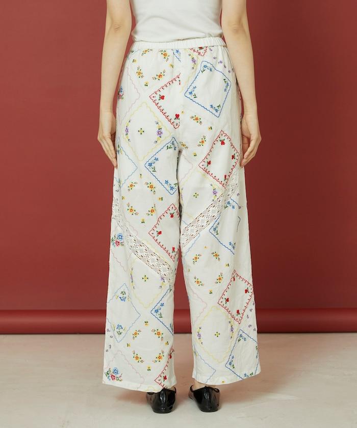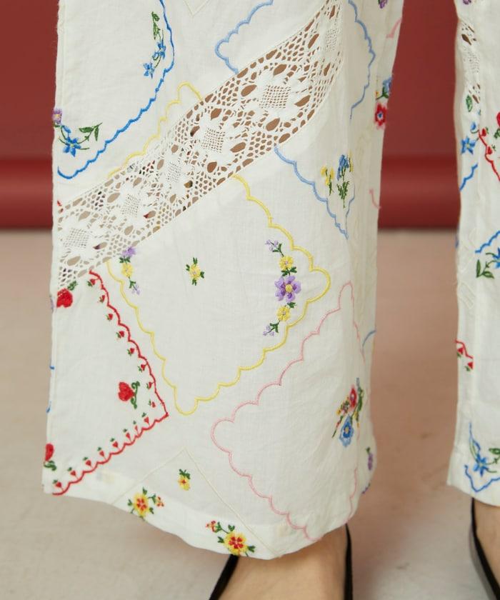 這款簡便長褲採用棉質面料,布面繡有色彩斑斕的刺繡,給人一種古董刺繡手帕拼接的感覺。