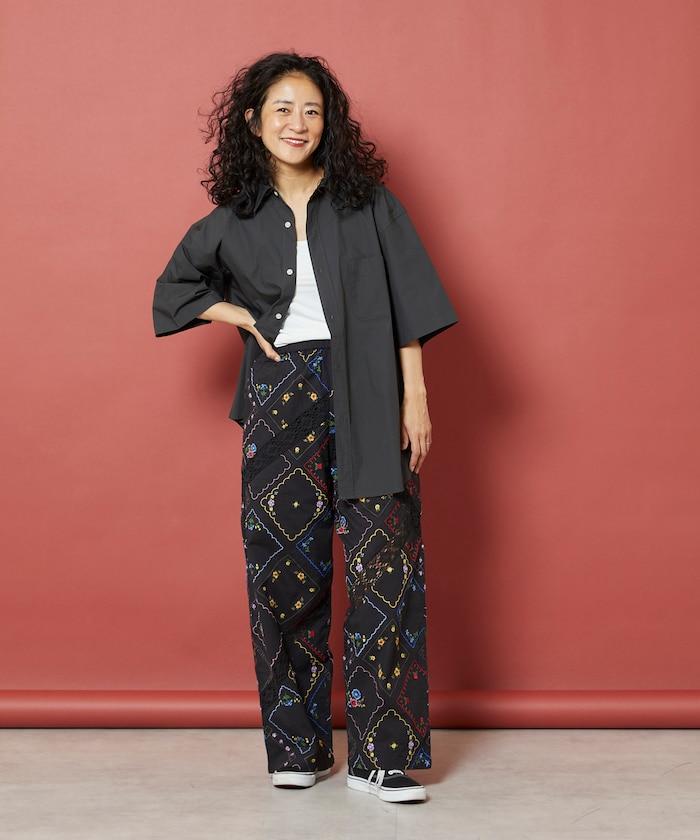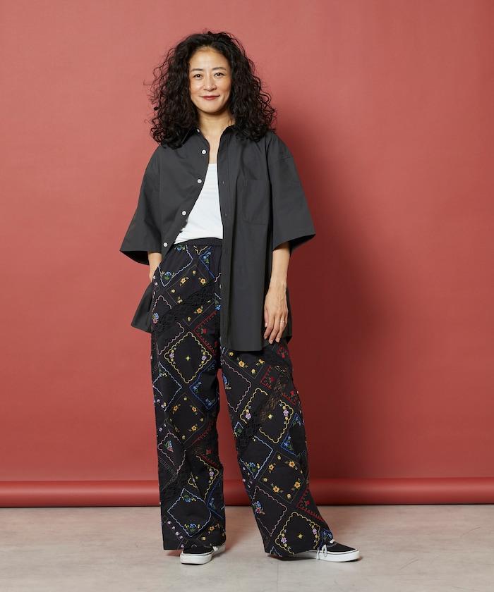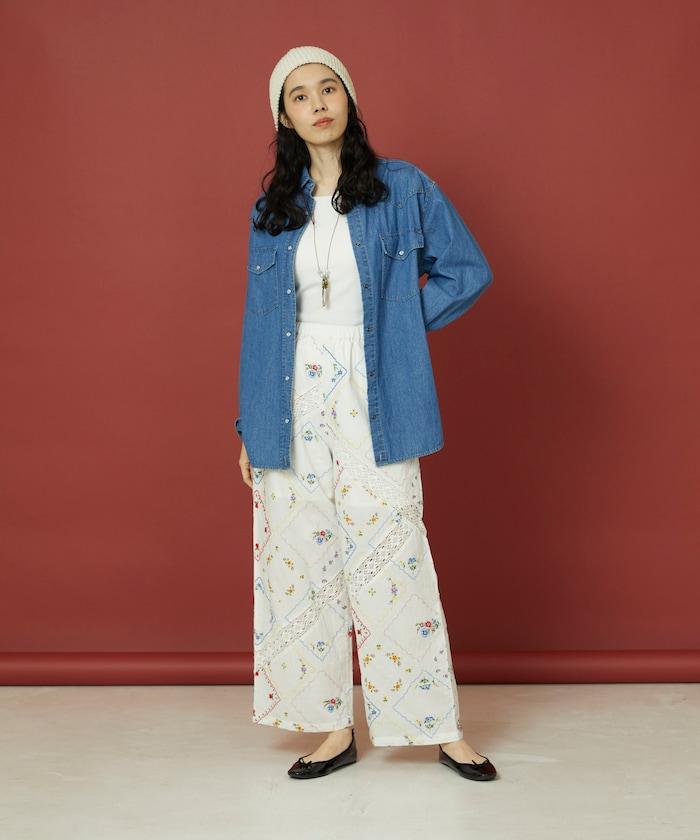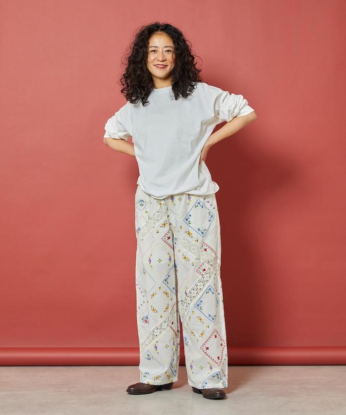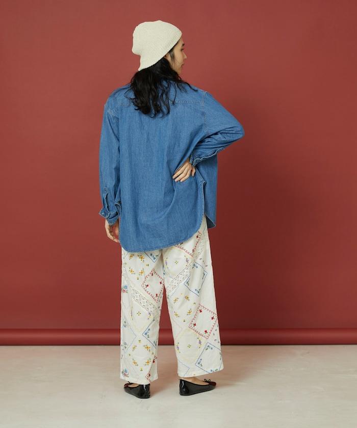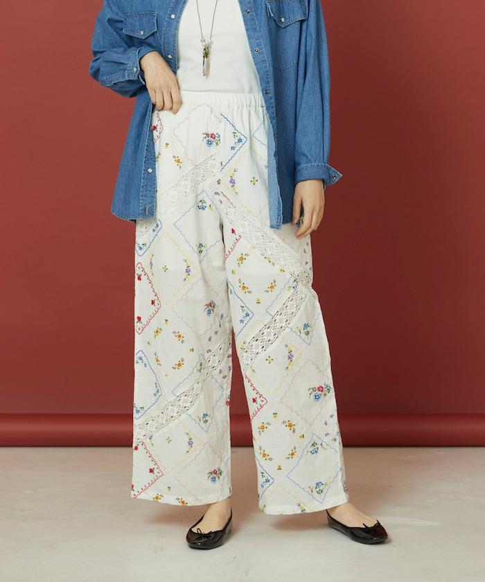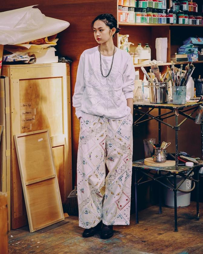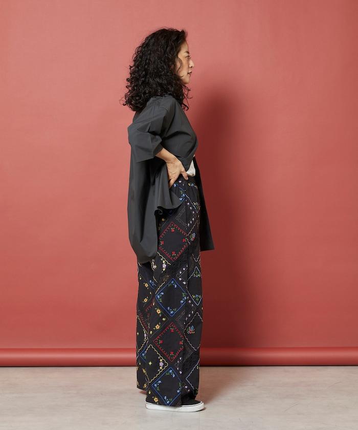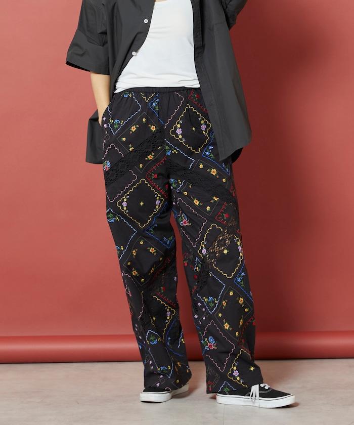 這款簡便長褲採用棉質面料,布面繡有色彩斑斕的刺繡,給人一種古董刺繡手帕拼接的感覺。