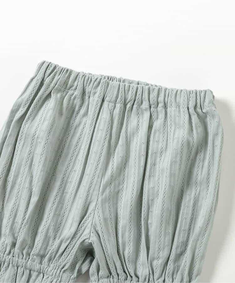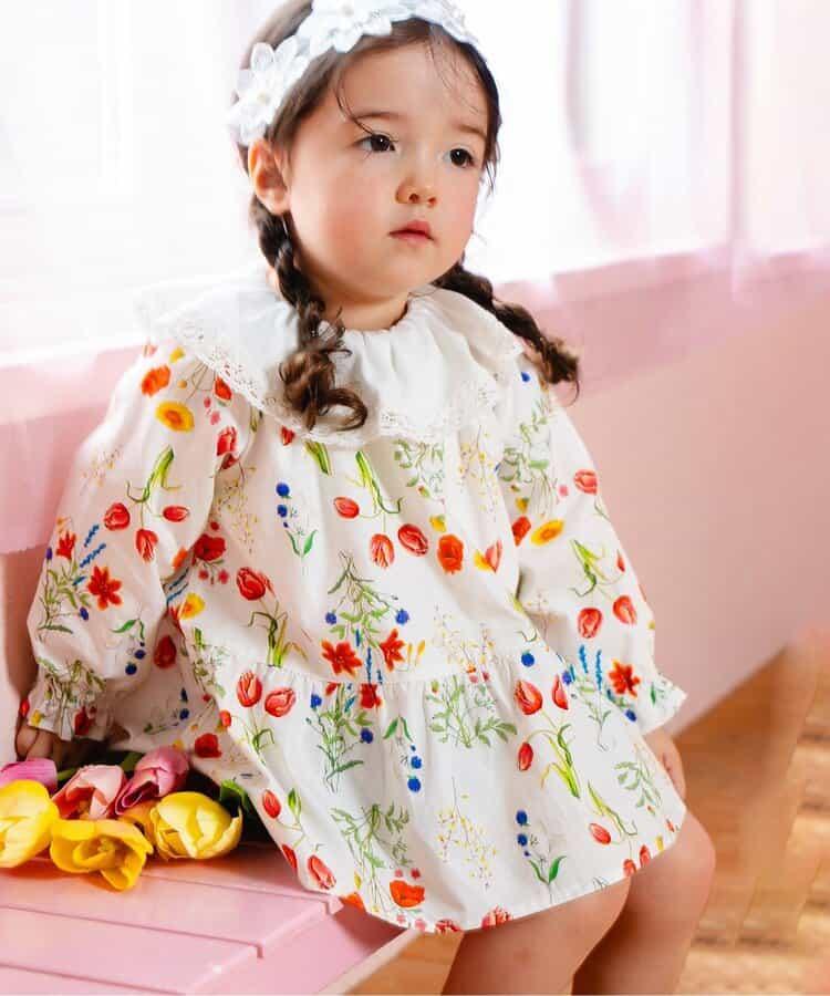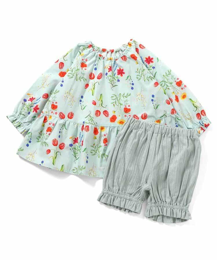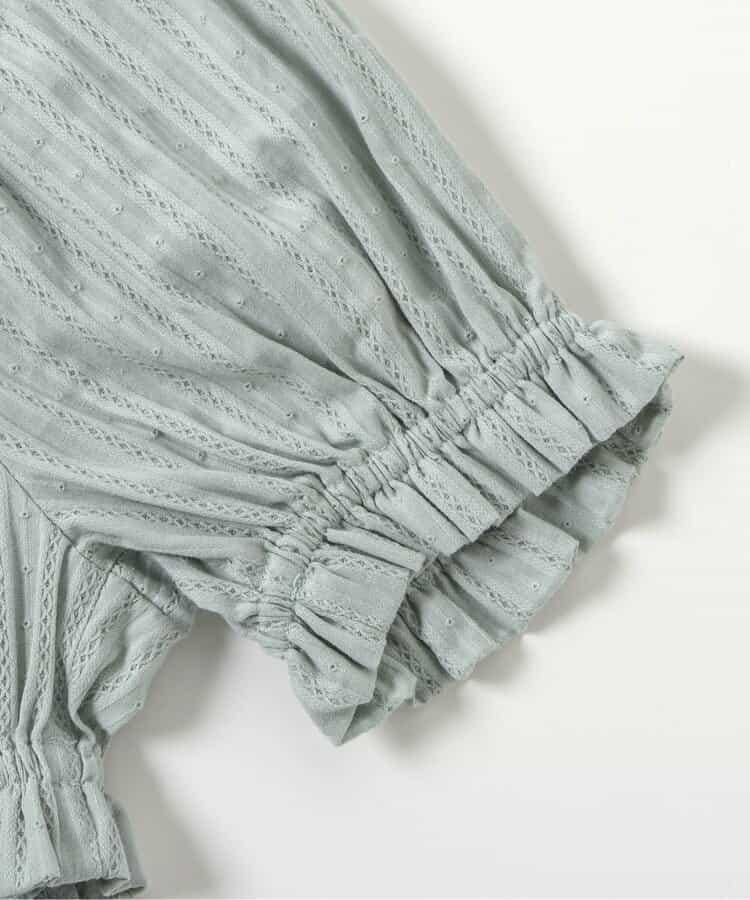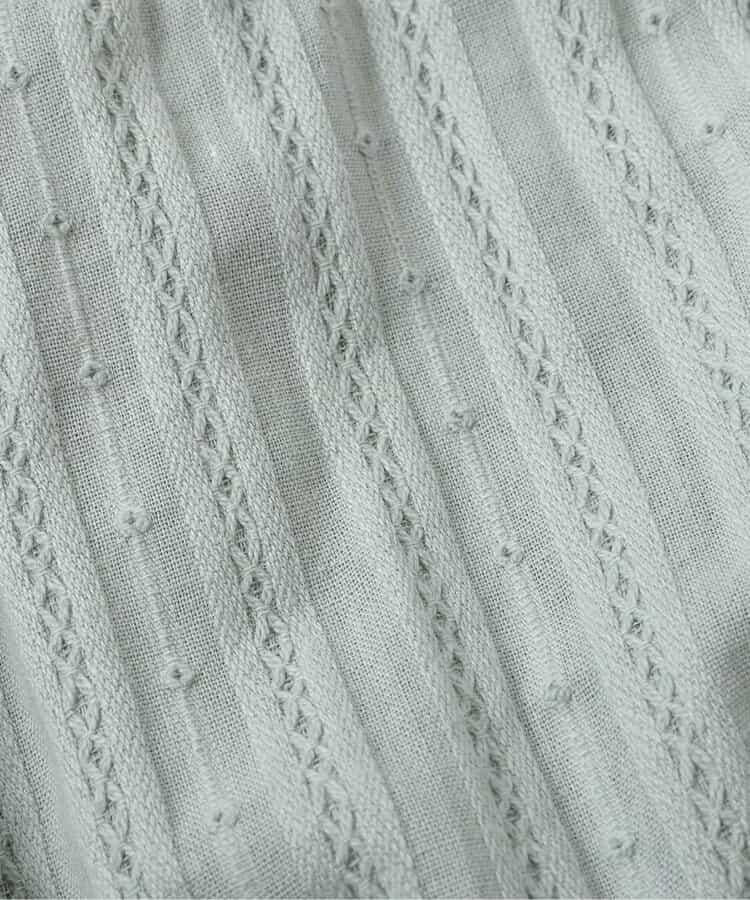 上衣採用喇叭廓形設計,顯得優雅大方;下裝採用米白色的連衣裙面料和與上衣同色的條紋編織面料。