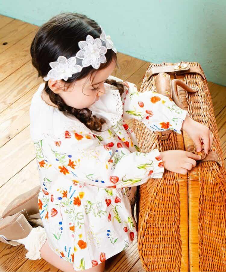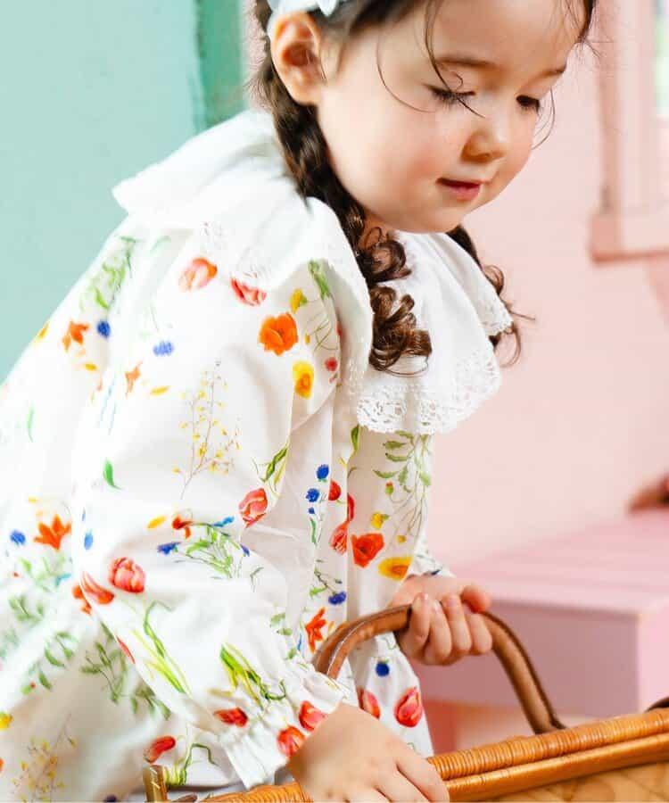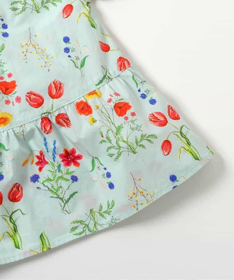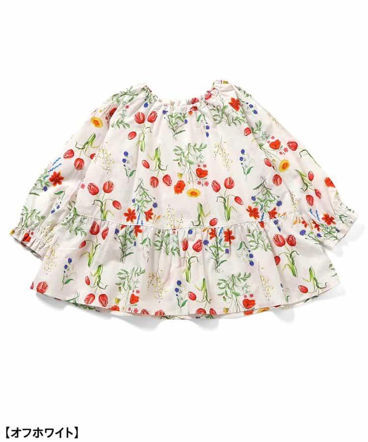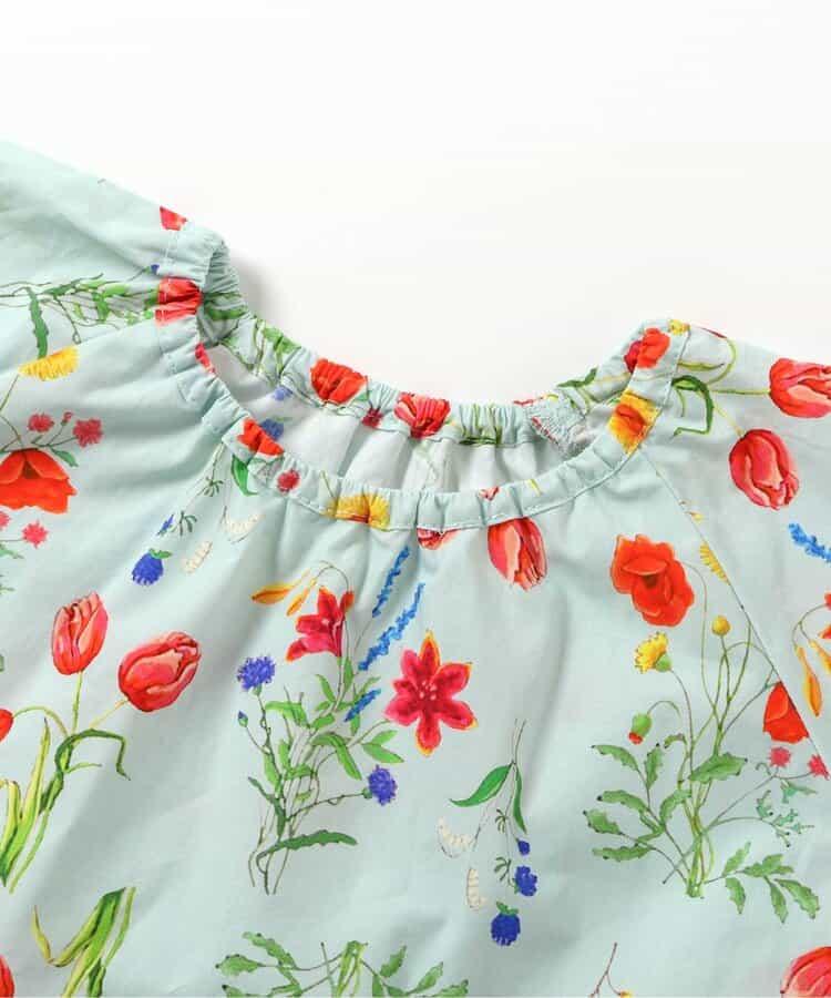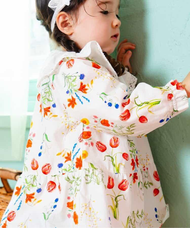 上衣採用喇叭廓形設計,顯得優雅大方;下裝採用米白色的連衣裙面料和與上衣同色的條紋編織面料。