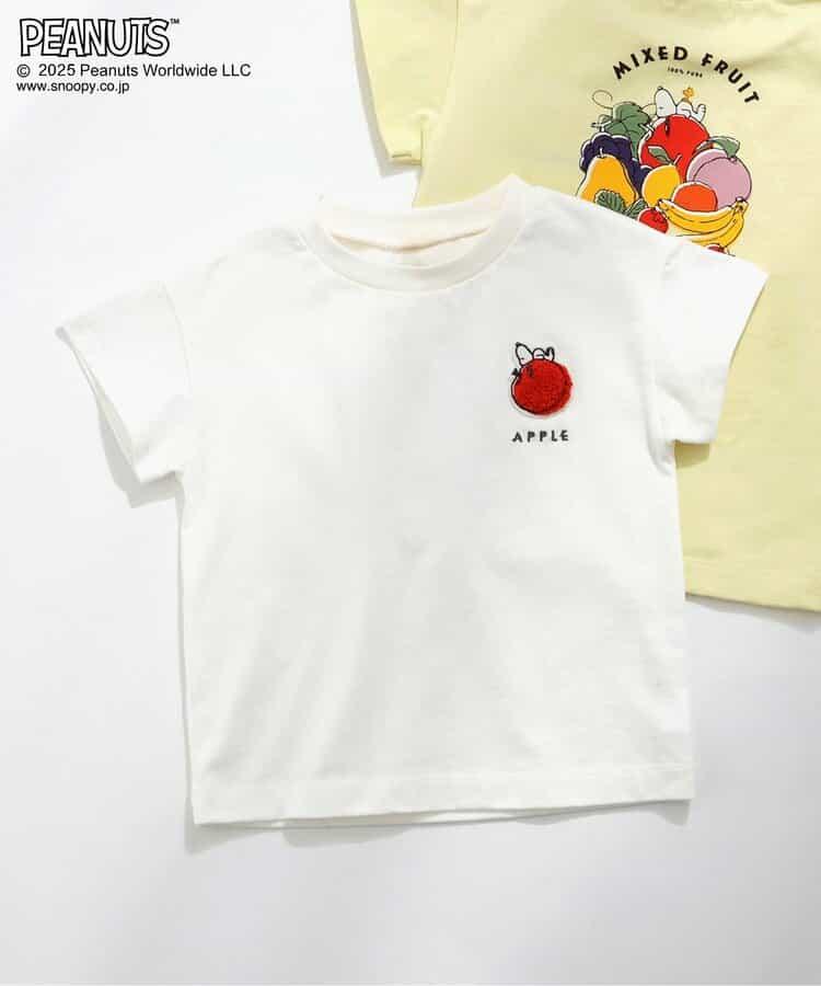 胸前是可愛的史努比與不同姿態的蘋果、香蕉和橘子,並以一個薩格拉徽章作為單點◎。