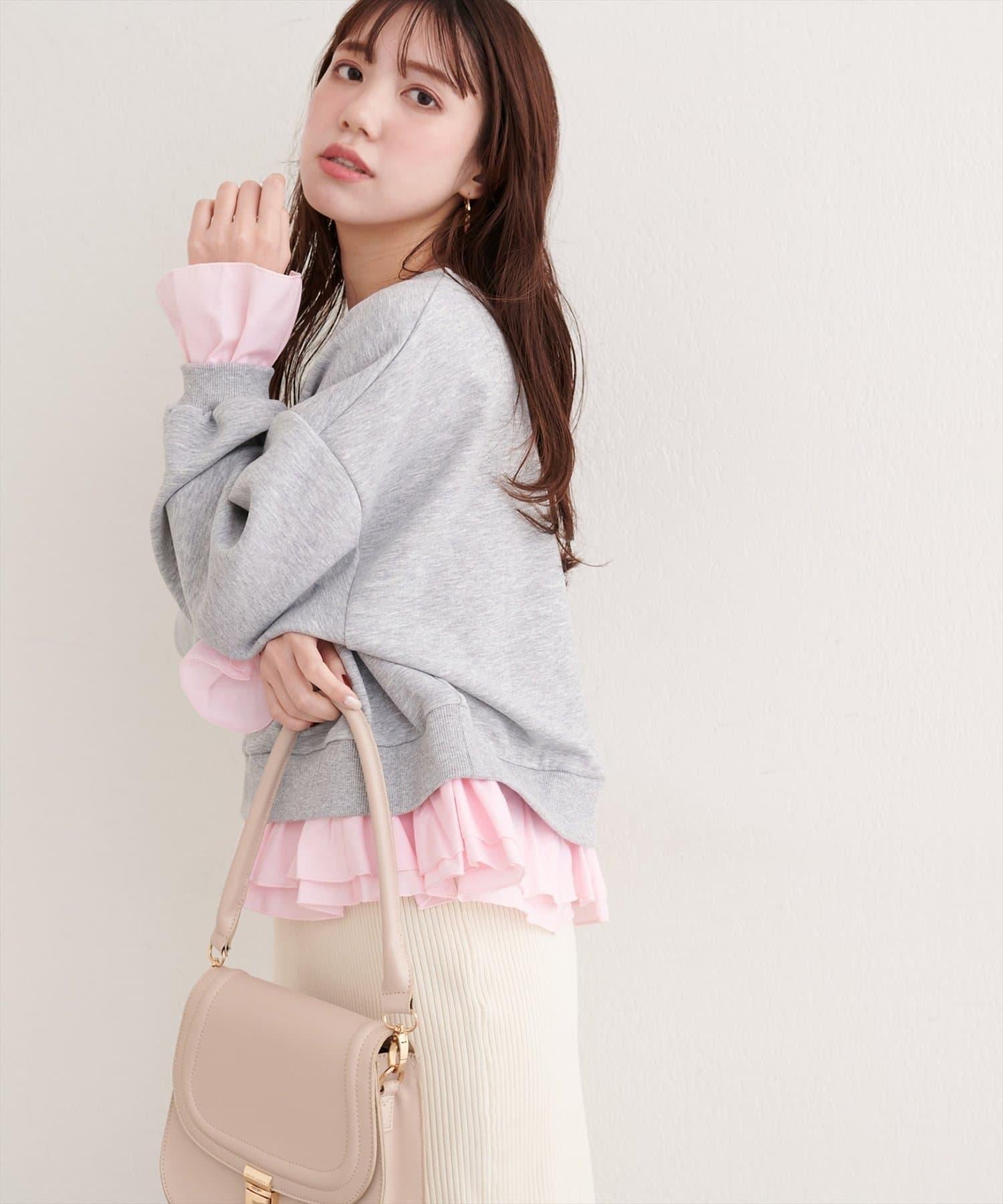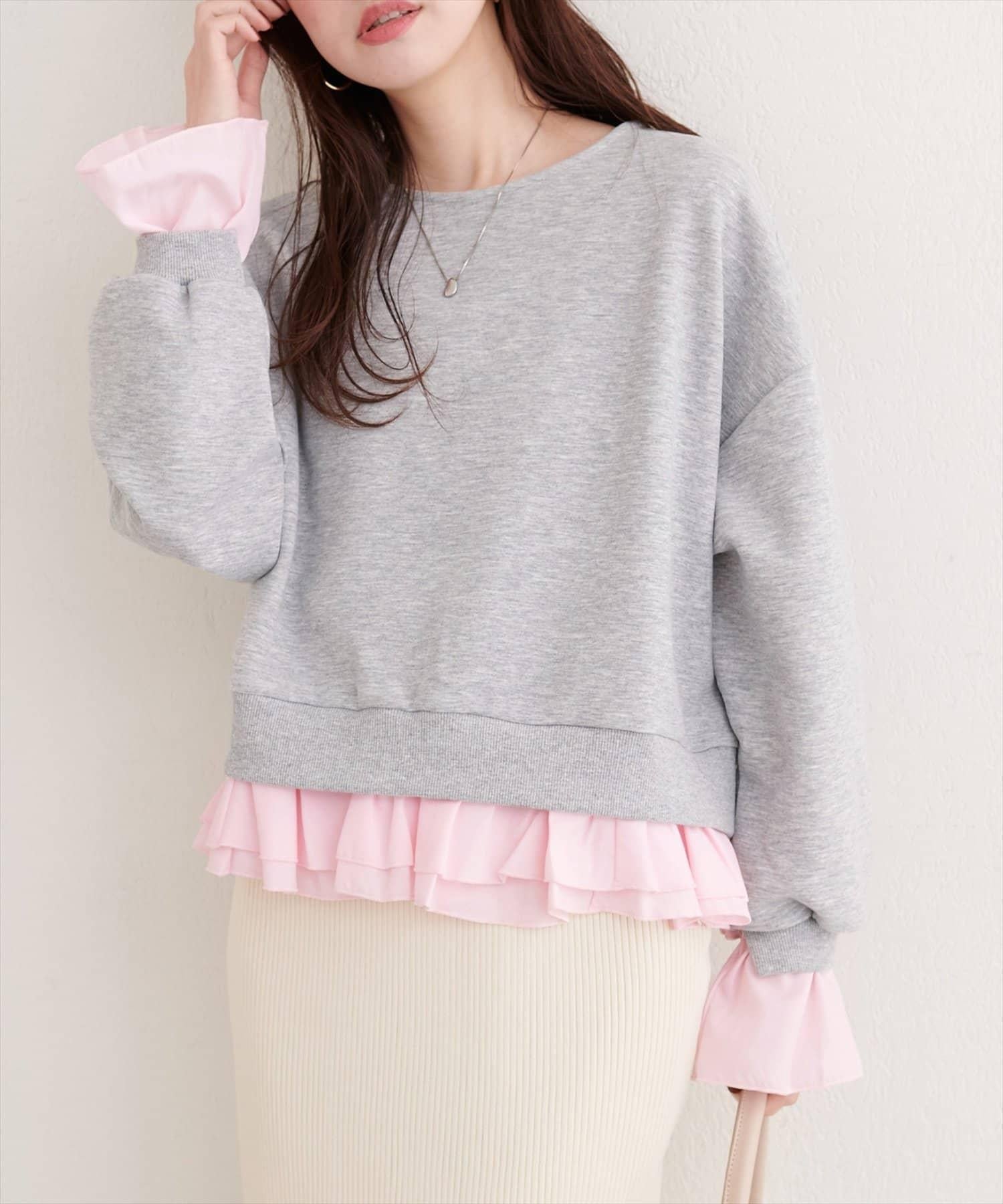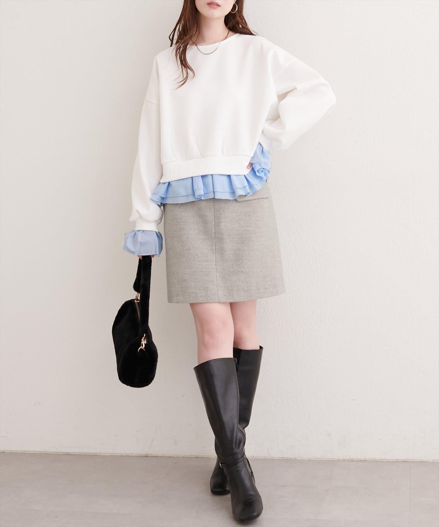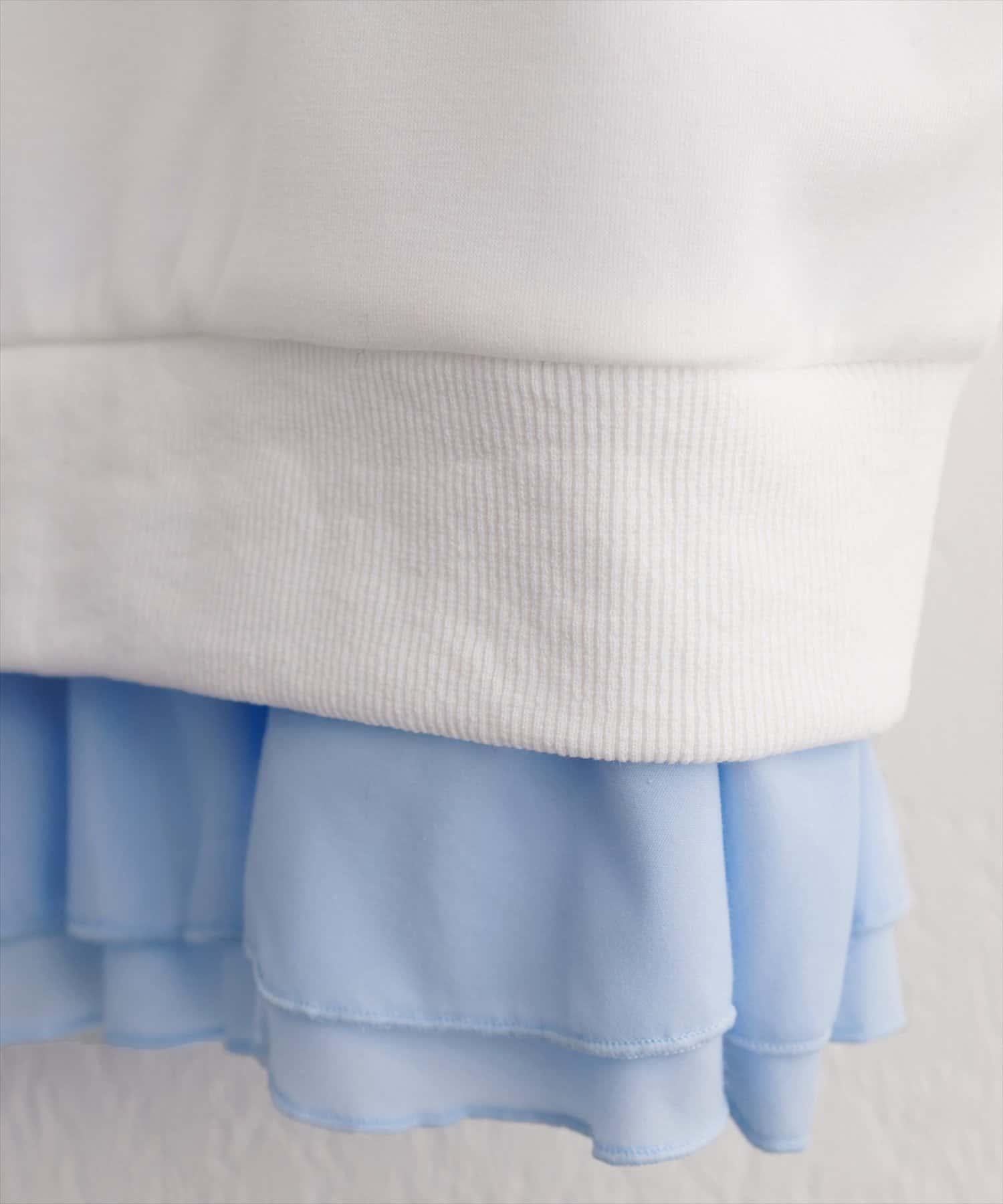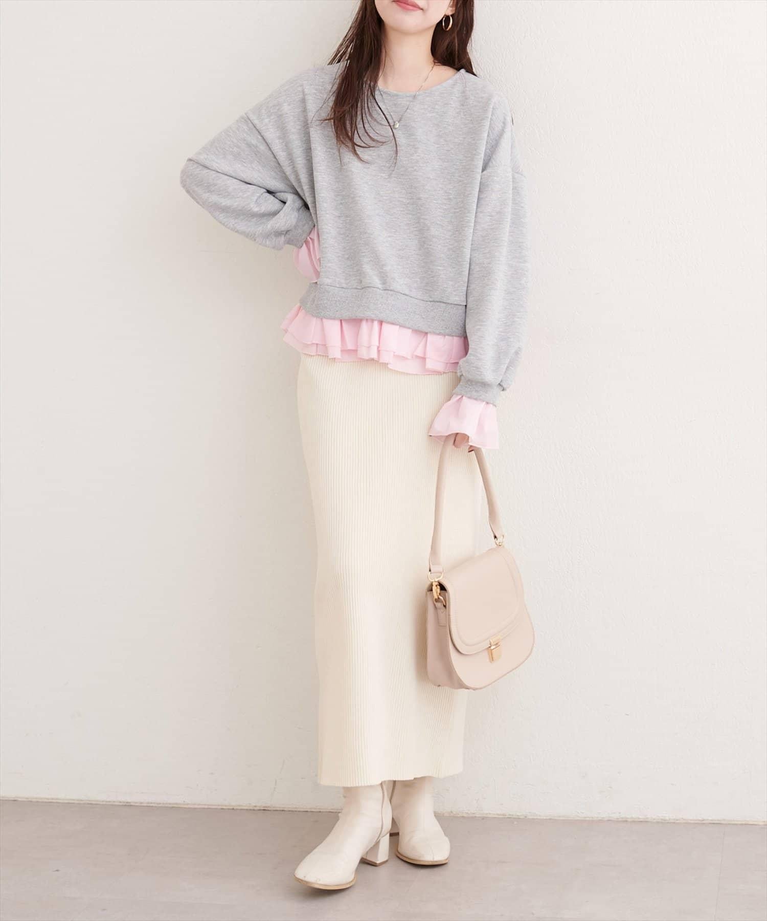 荷葉邊的甜美與套頭衫的休閒完美平衡,營造出一種不甜膩的成人可愛感。