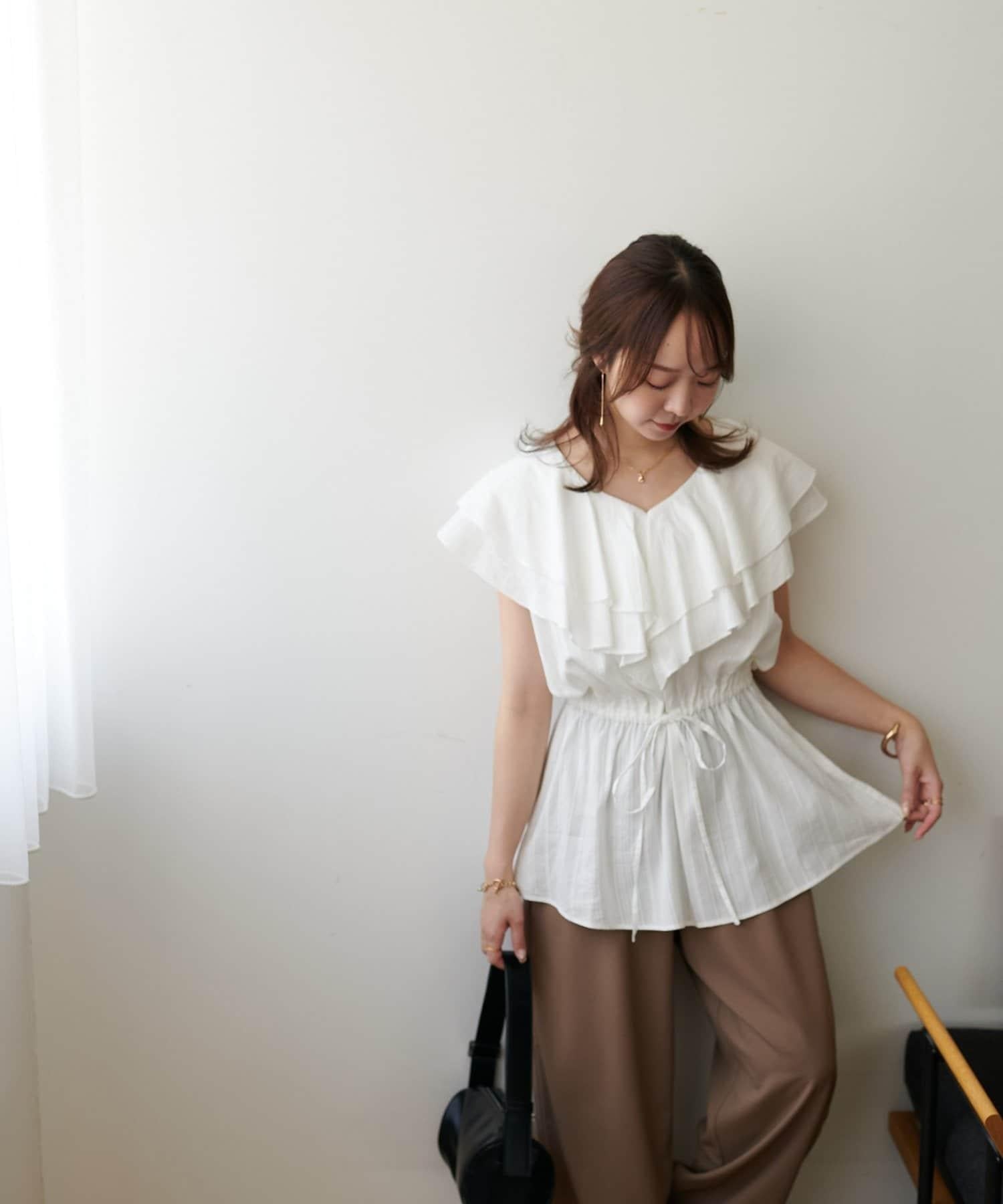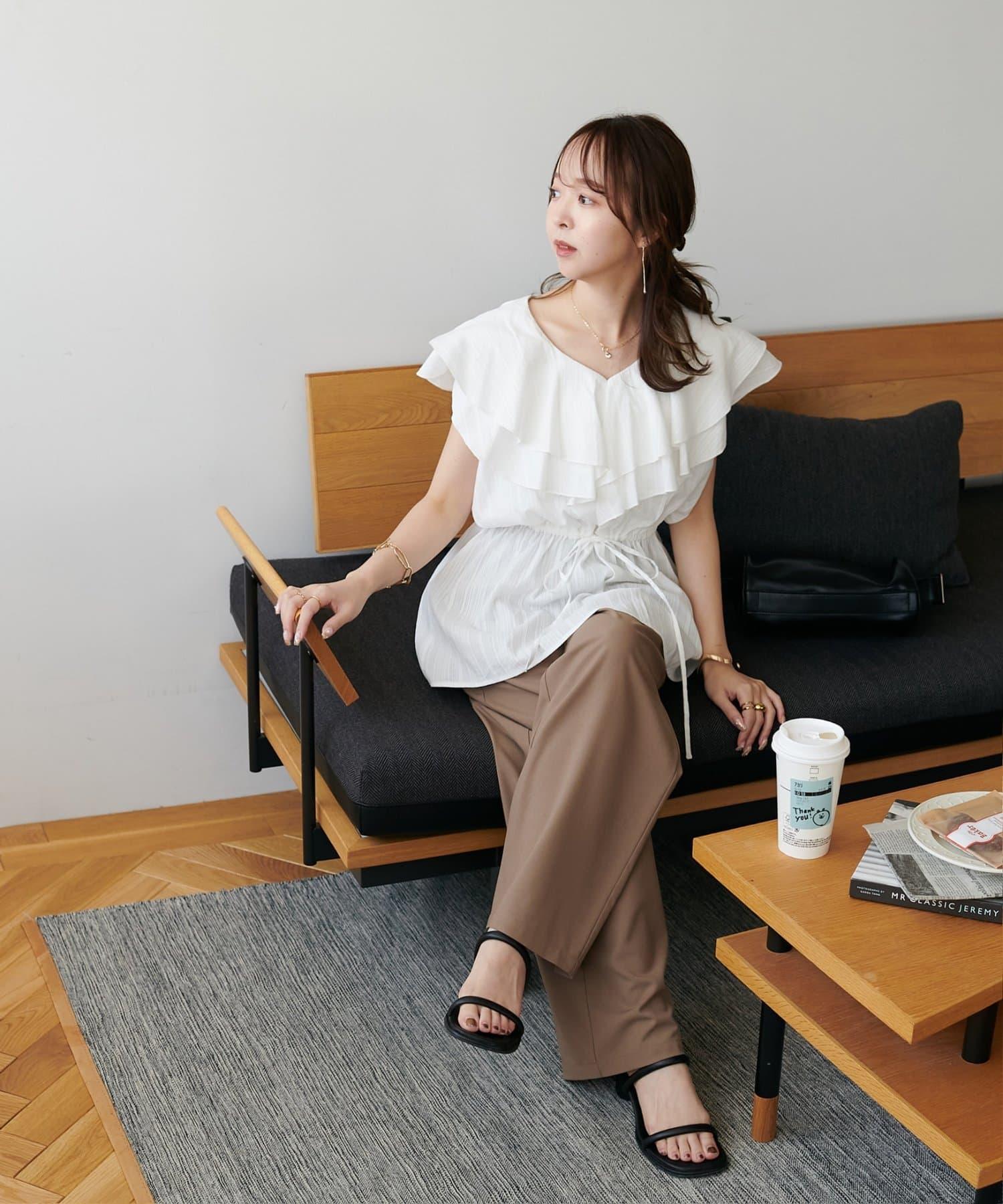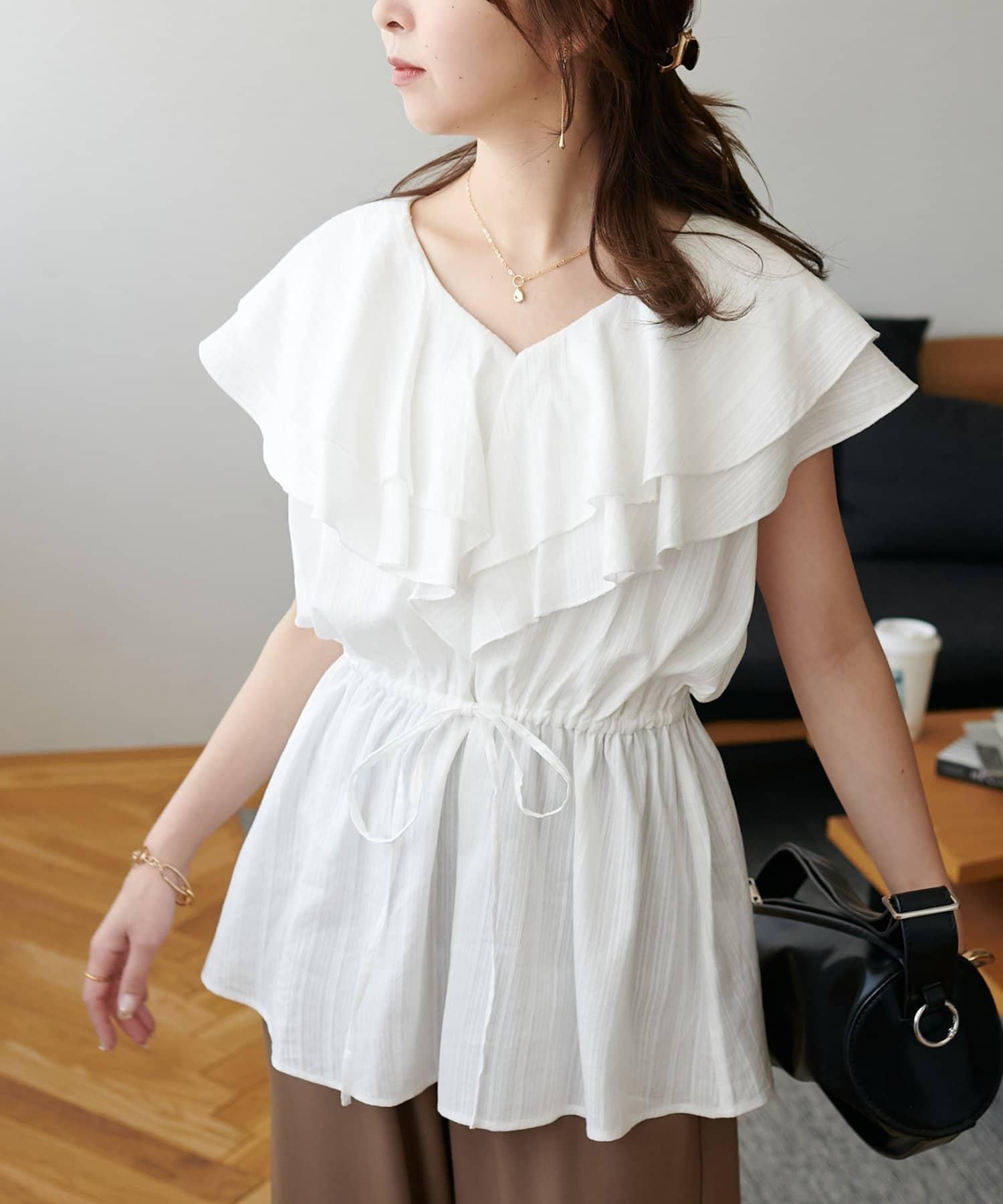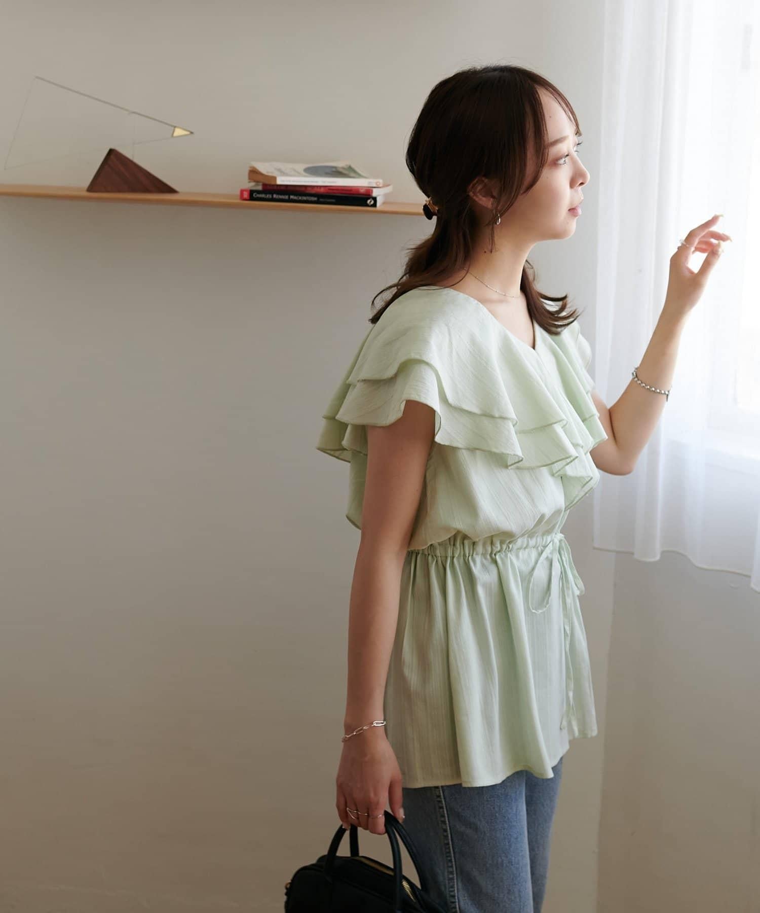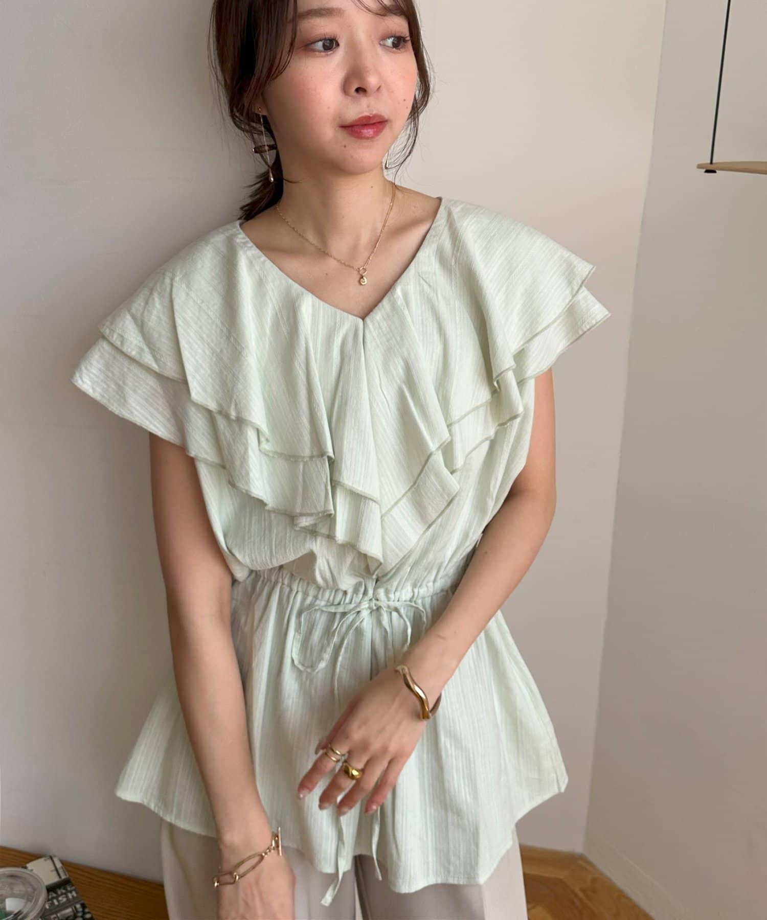 V 領的適度寬鬆與荷葉邊的立體感完美搭配,營造出成熟女性的氣息,同時又不失甜美。