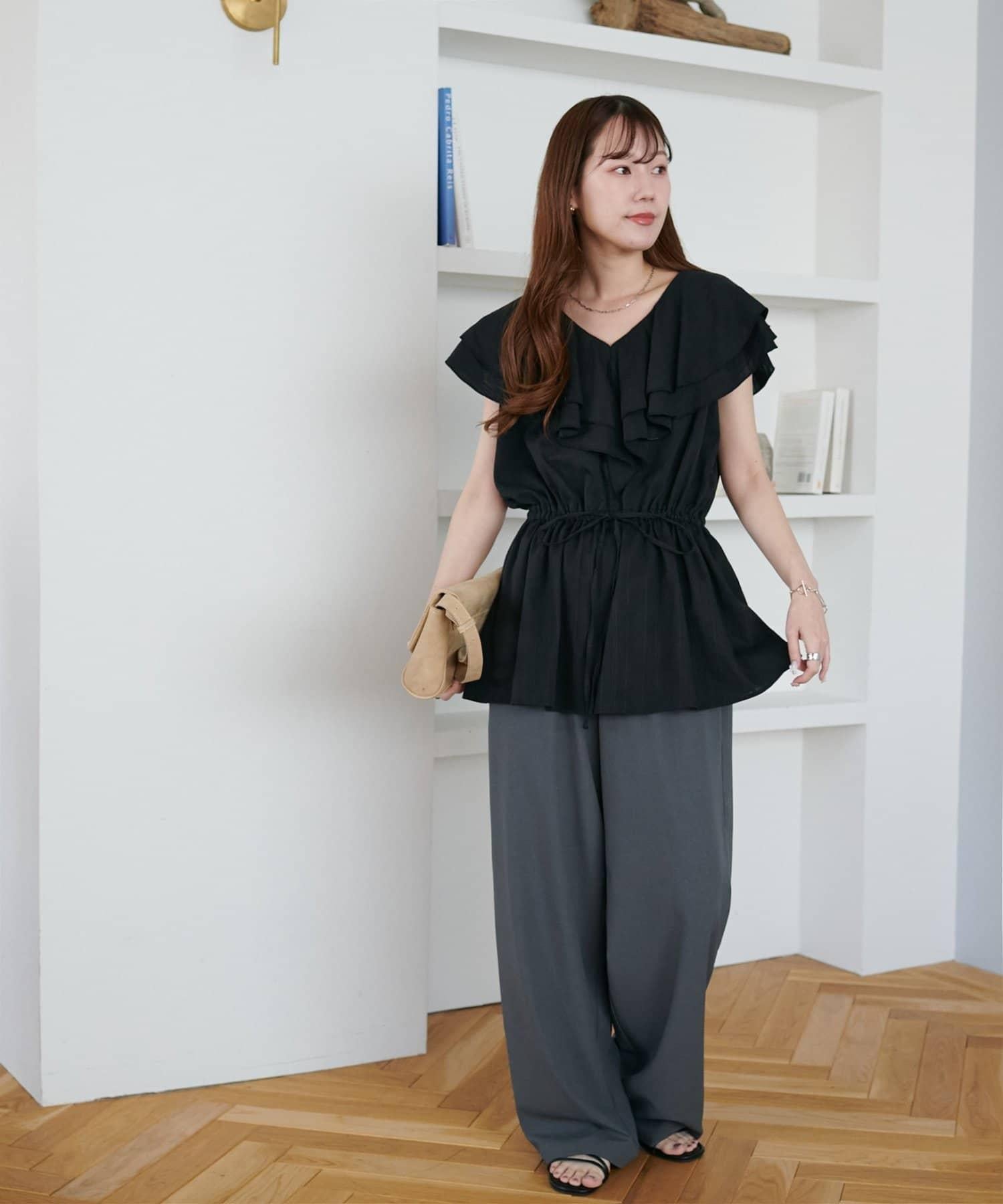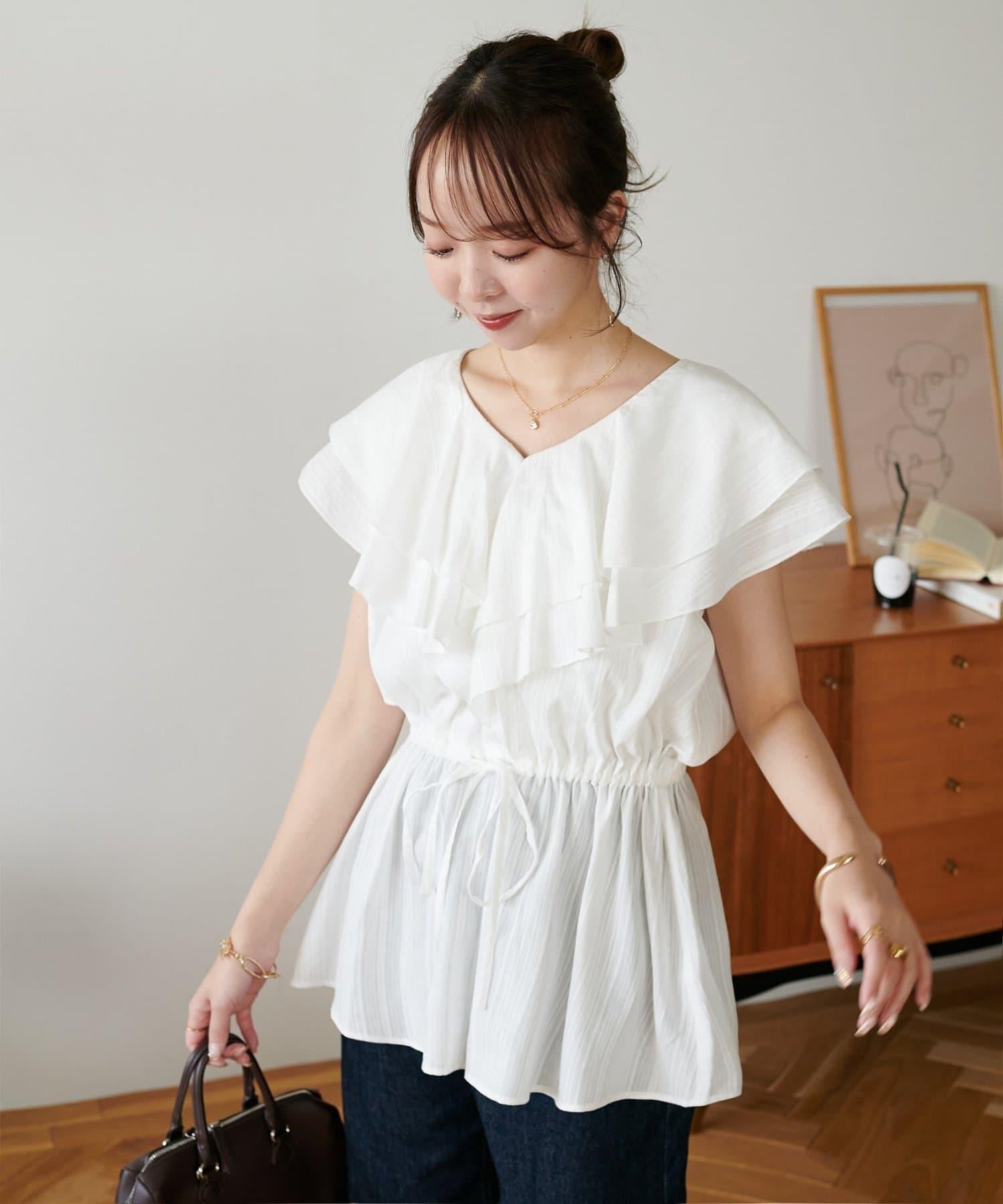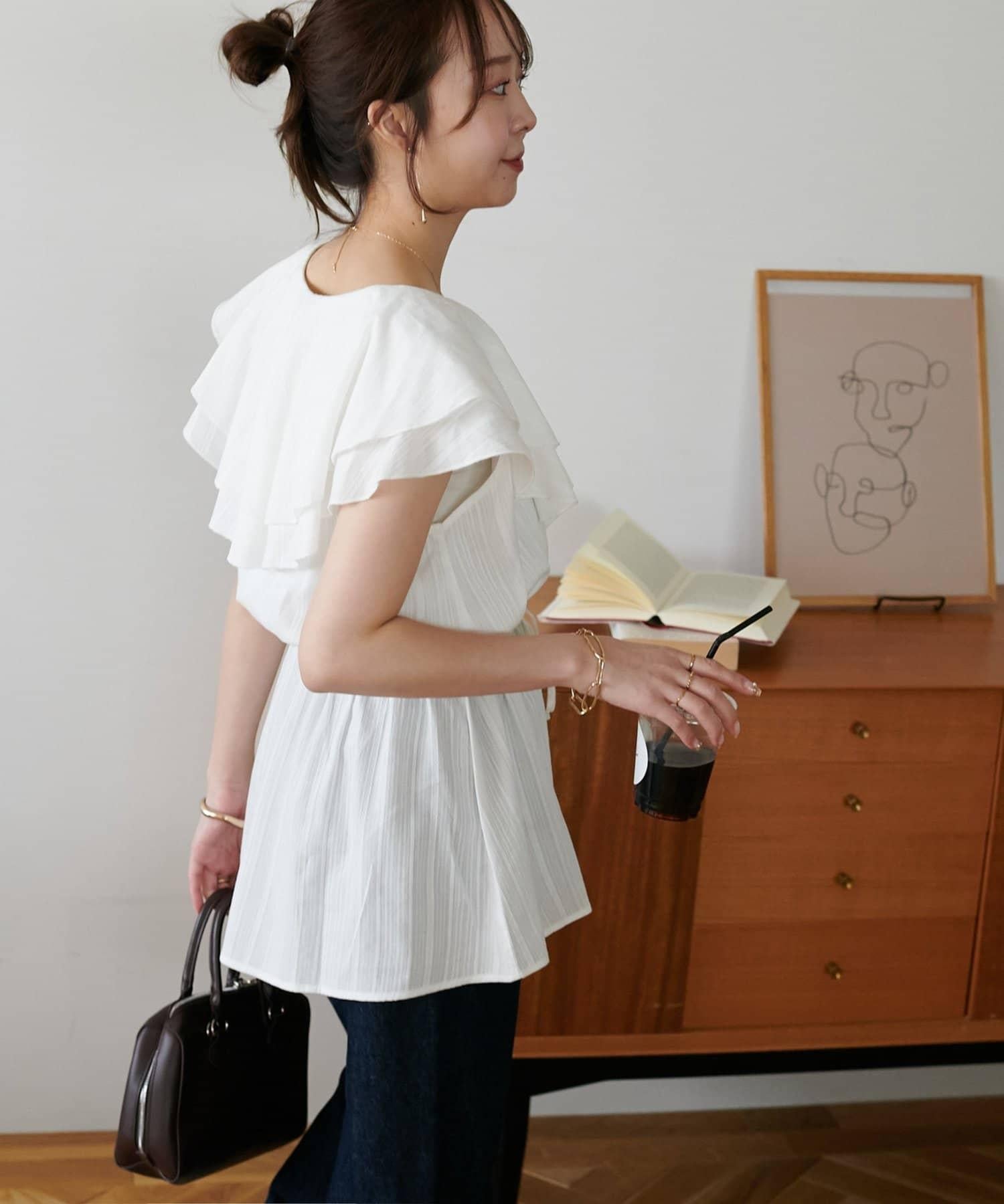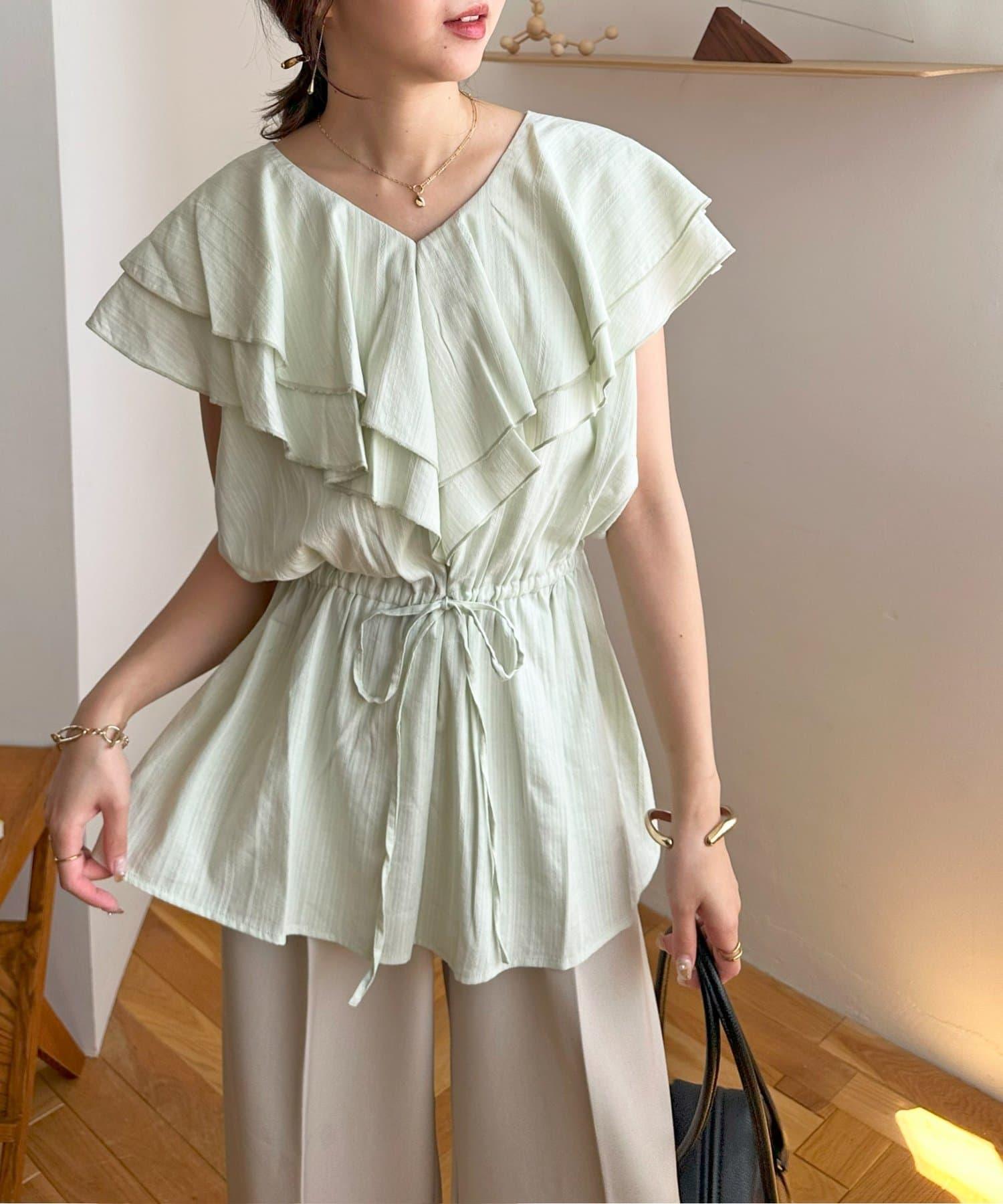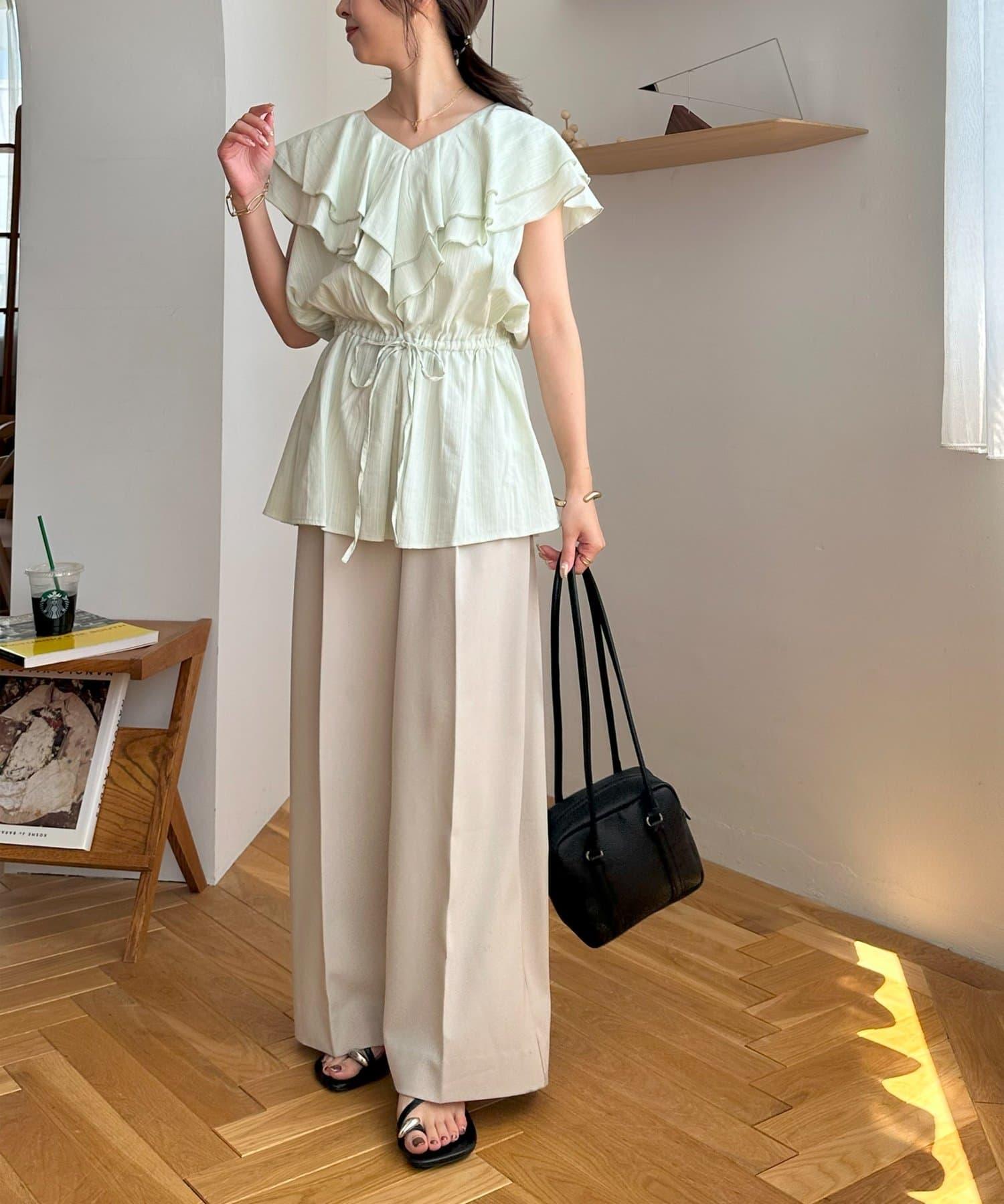 V 領的適度寬鬆與荷葉邊的立體感完美搭配,營造出成熟女性的氣息,同時又不失甜美。