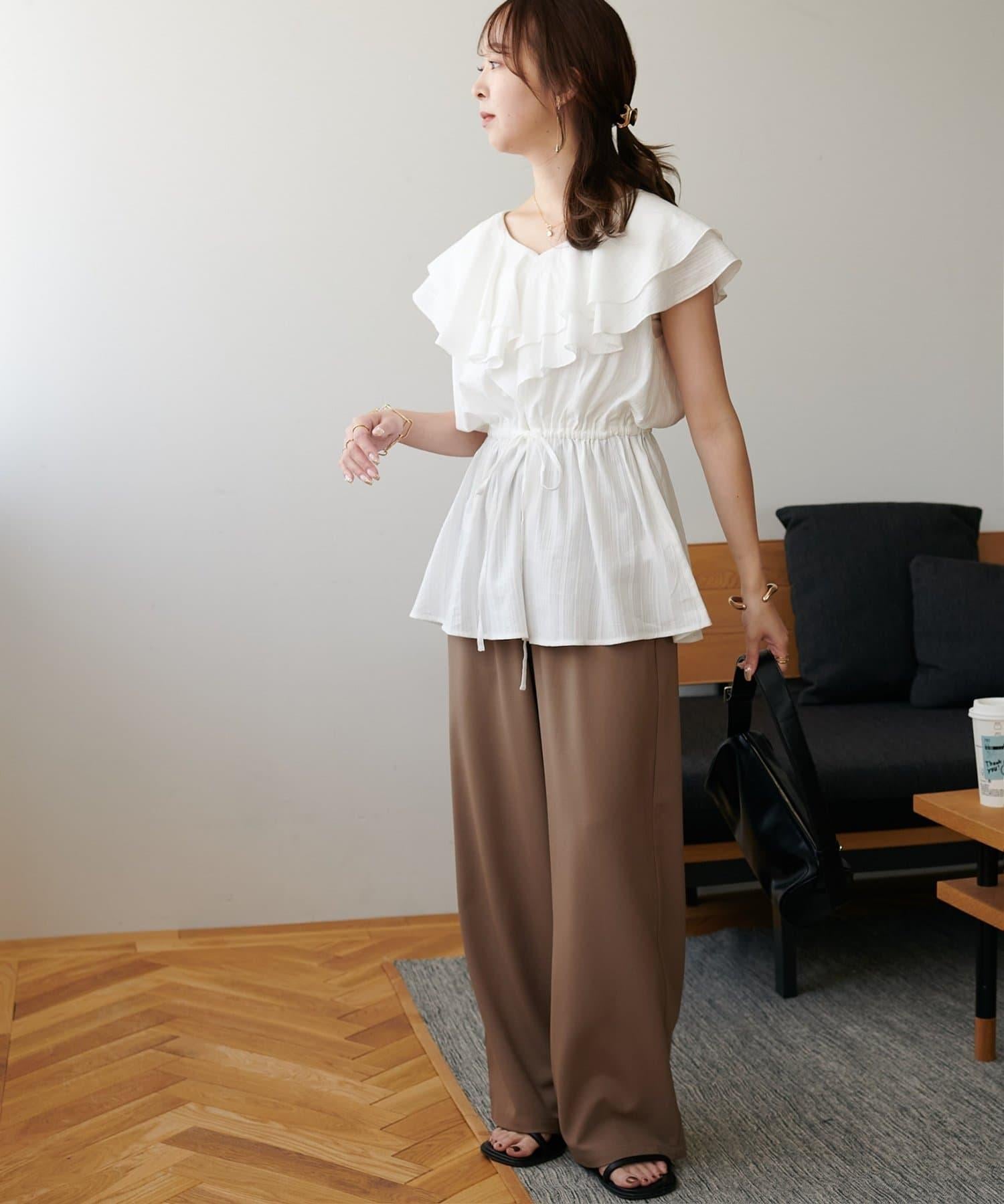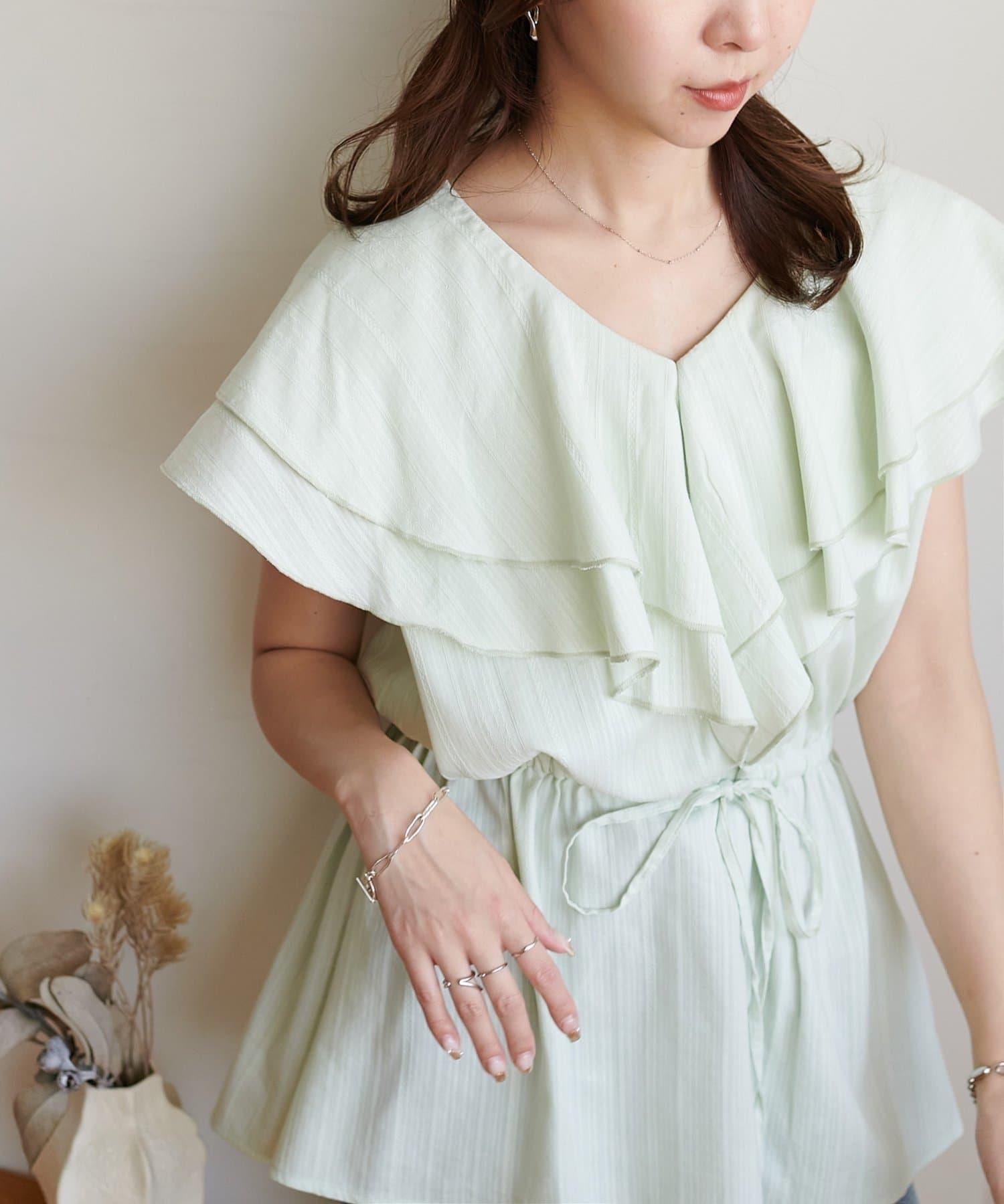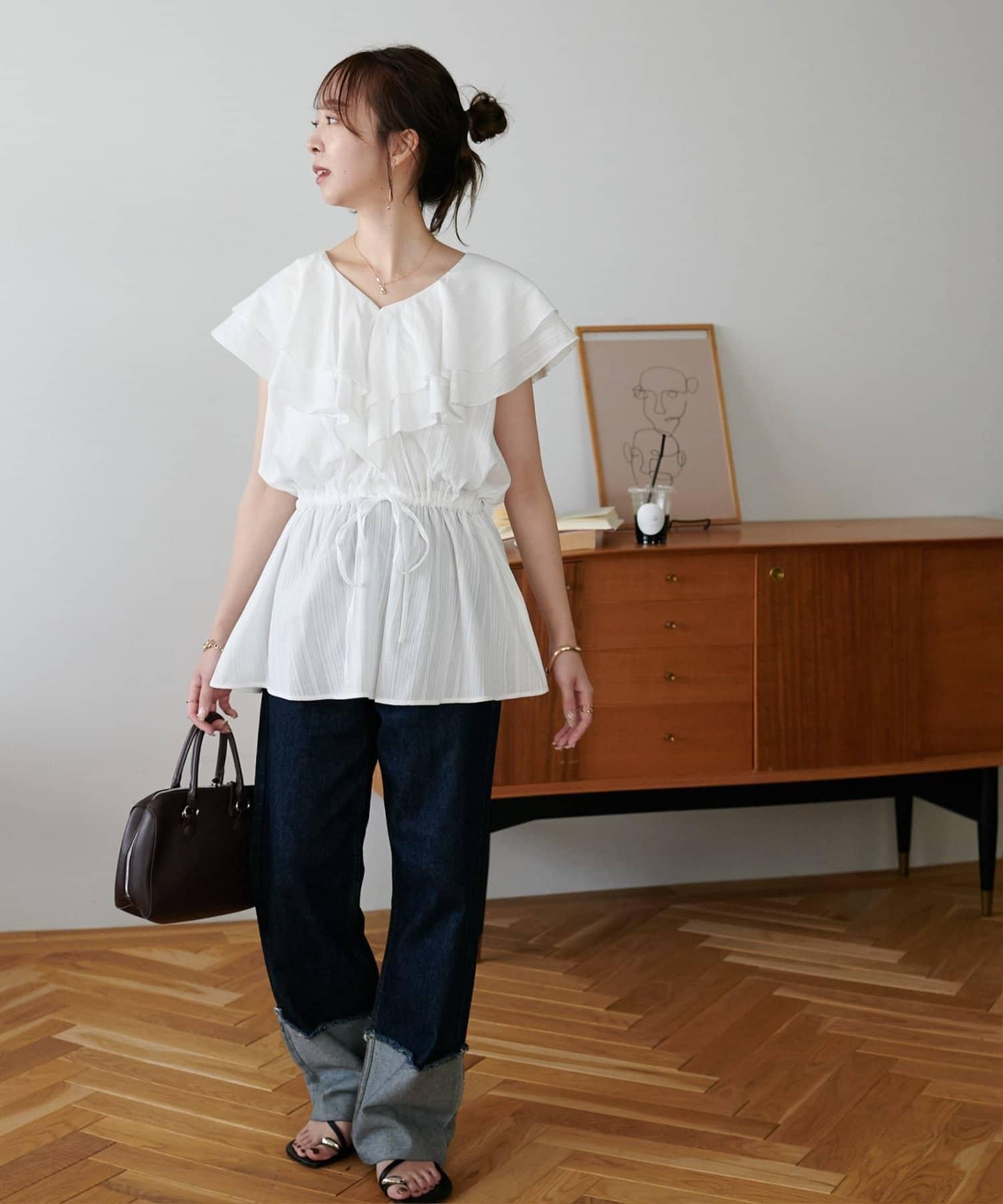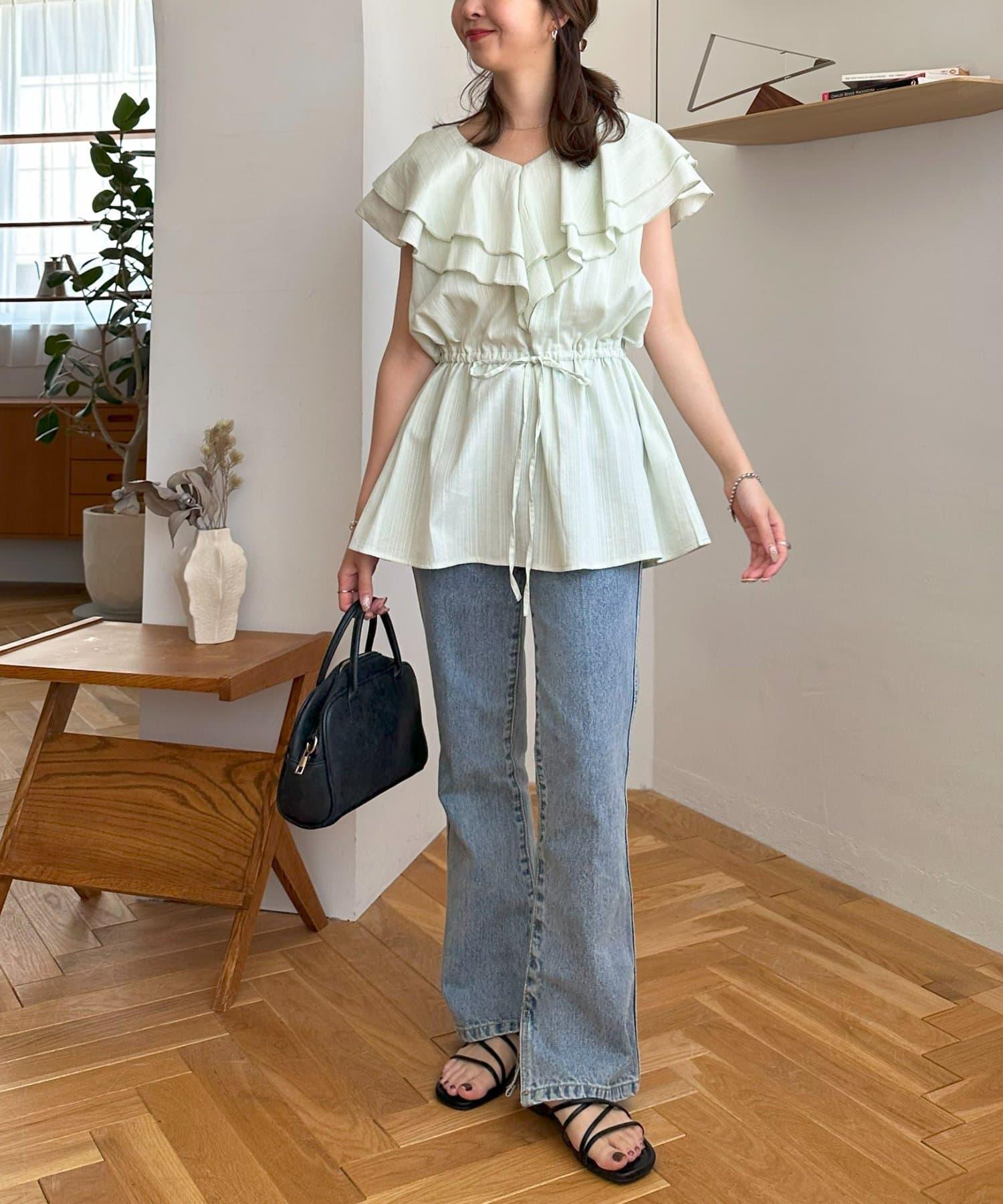 V 領的適度寬鬆與荷葉邊的立體感完美搭配,營造出成熟女性的氣息,同時又不失甜美。