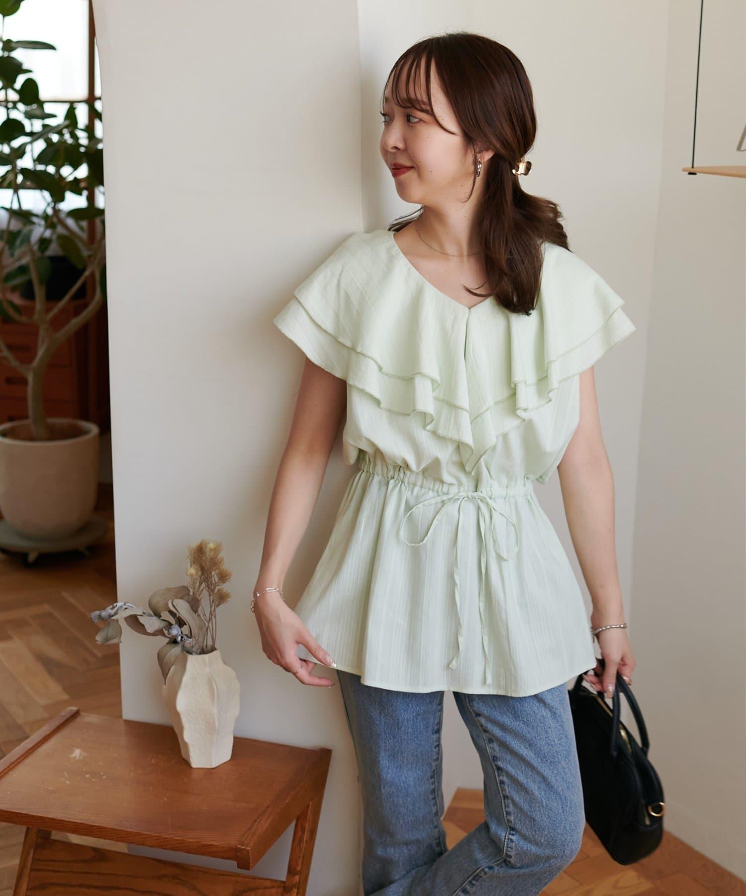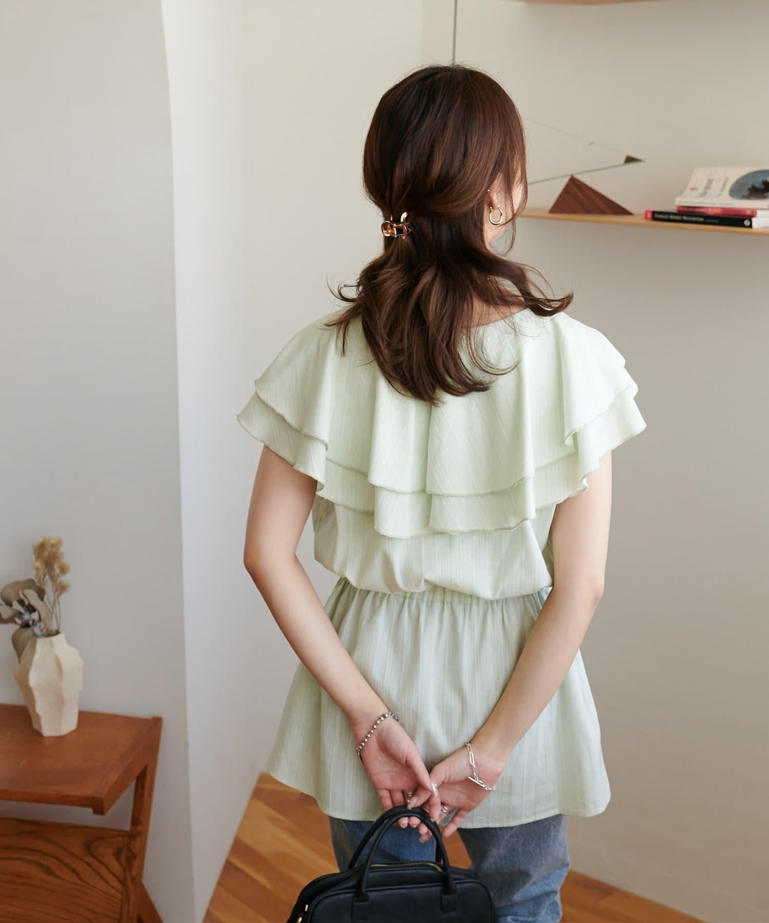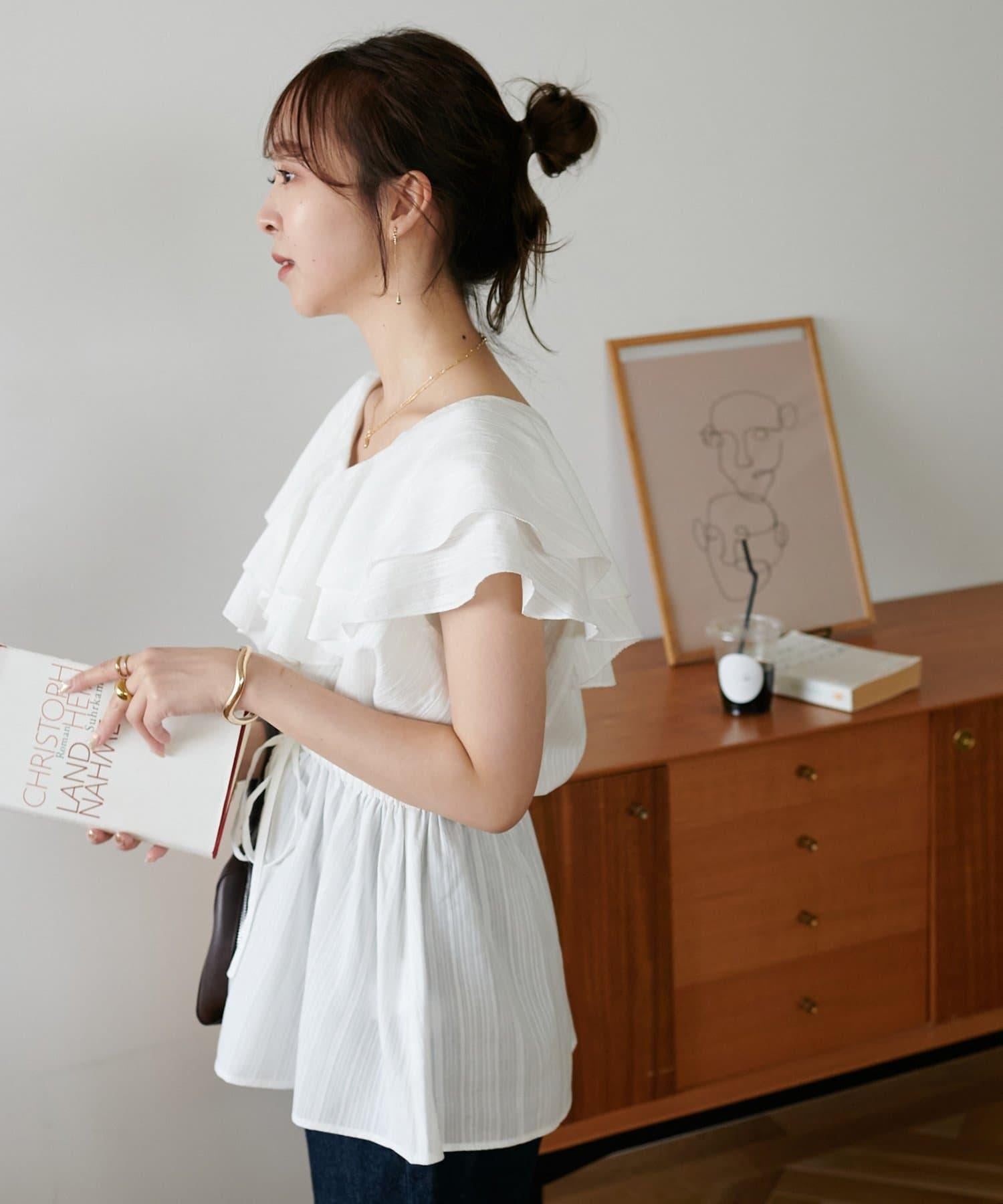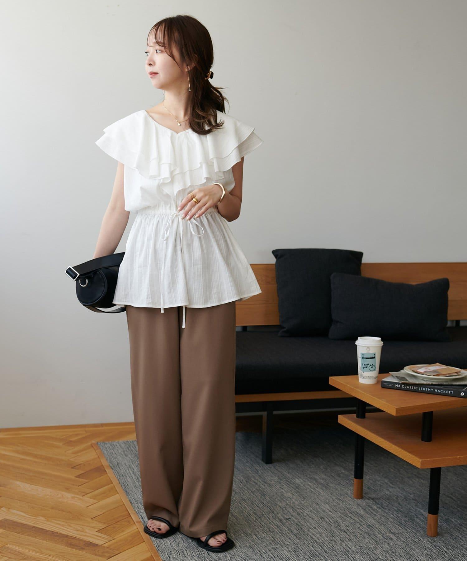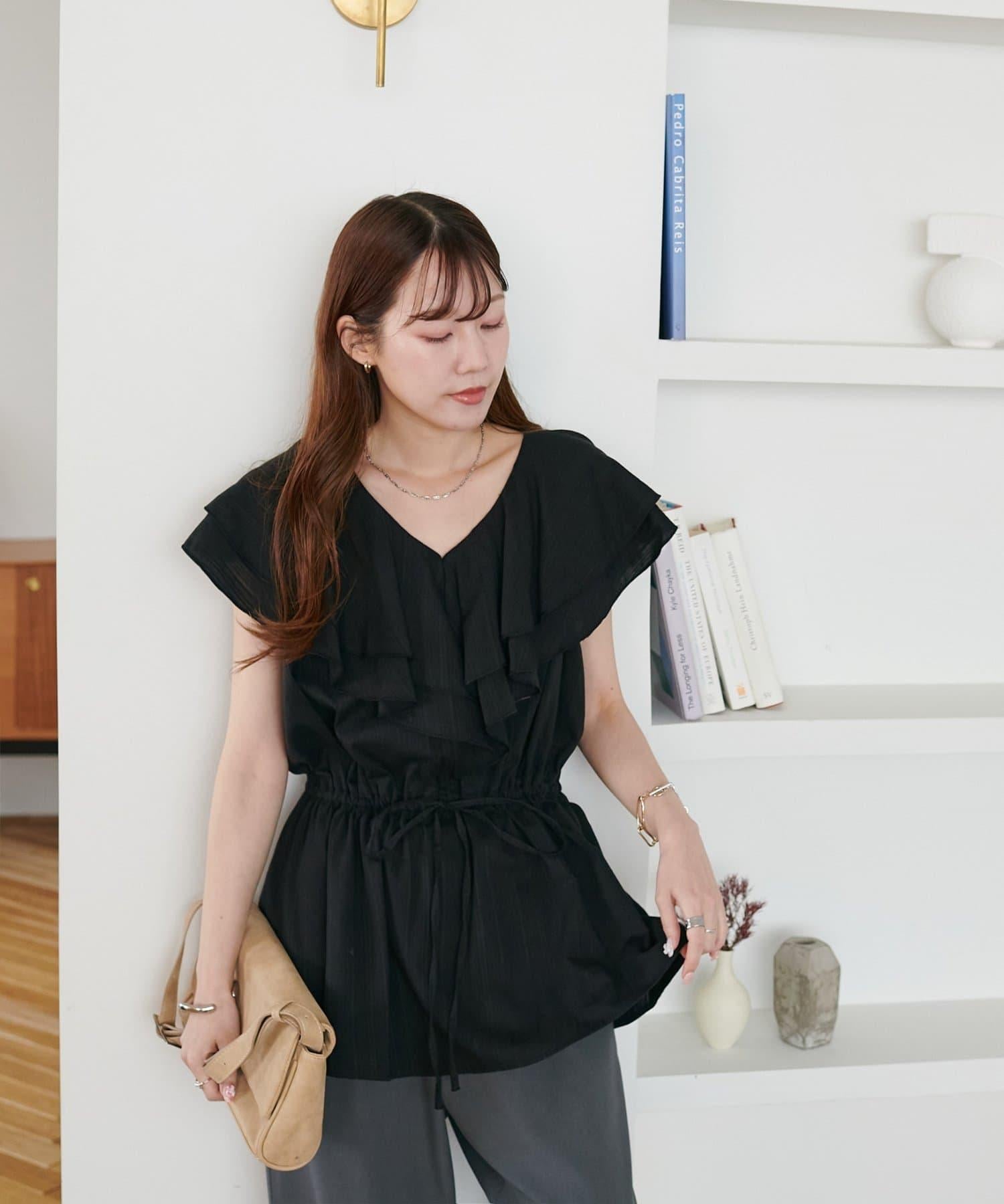 V 領的適度寬鬆與荷葉邊的立體感完美搭配,營造出成熟女性的氣息,同時又不失甜美。