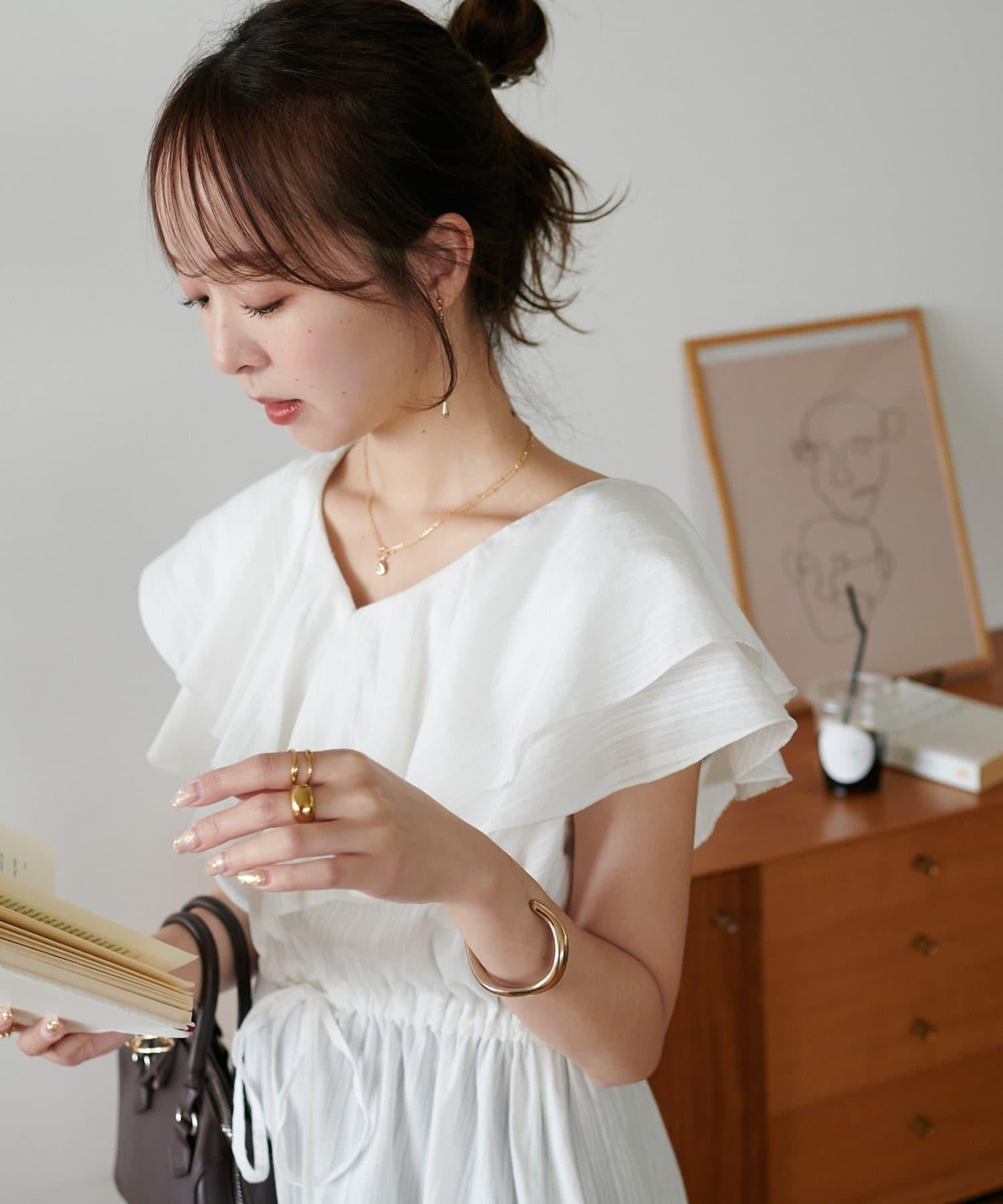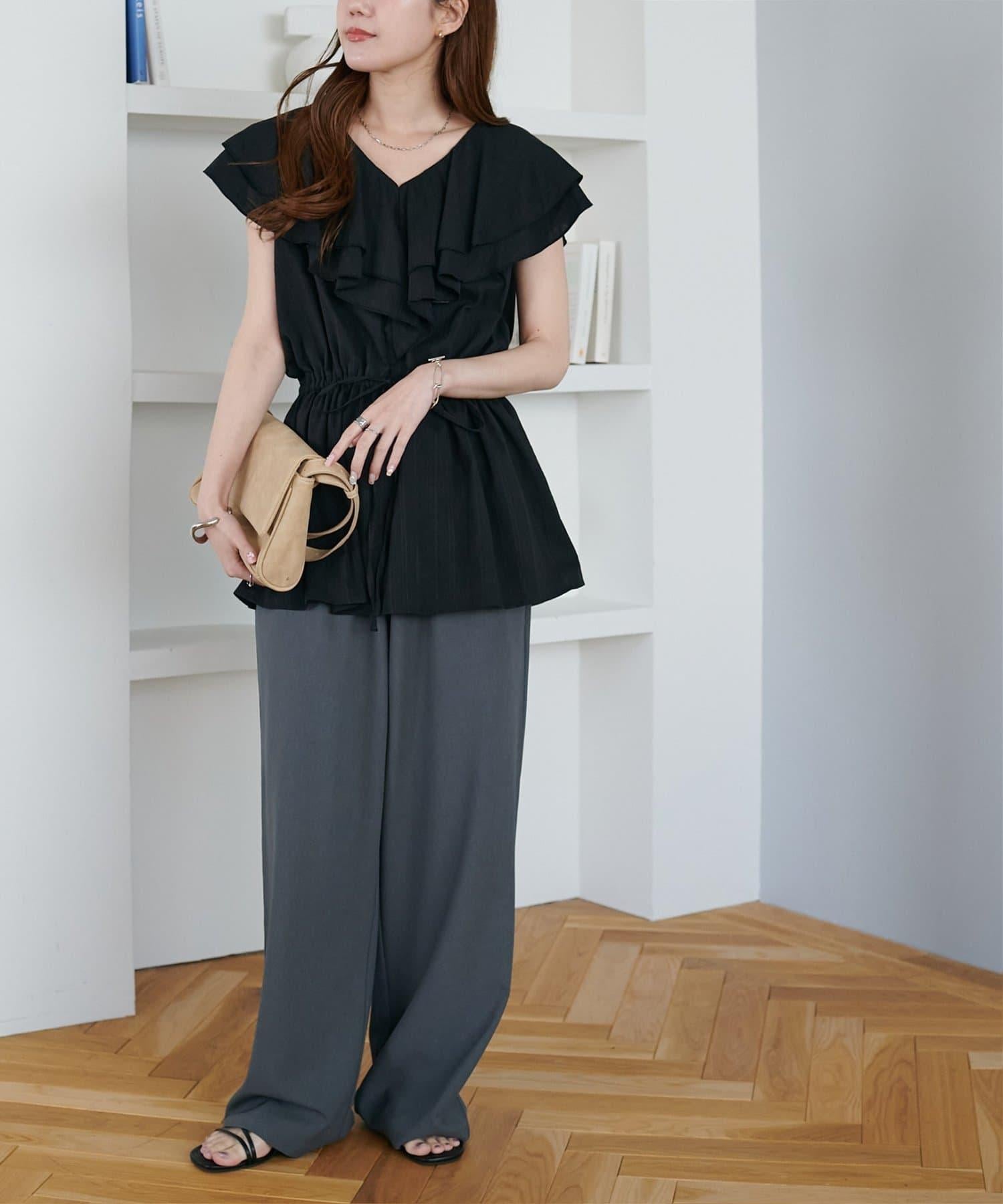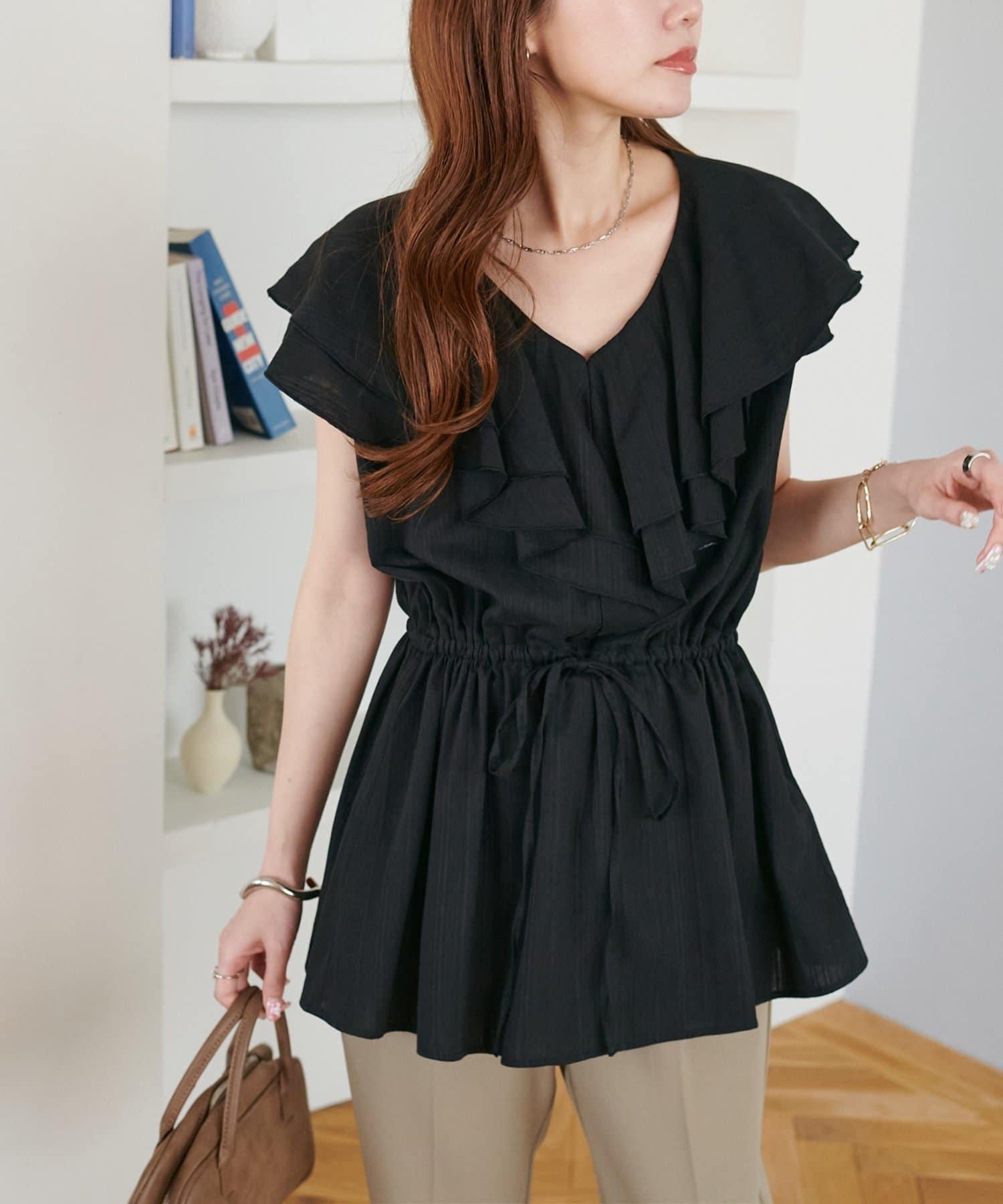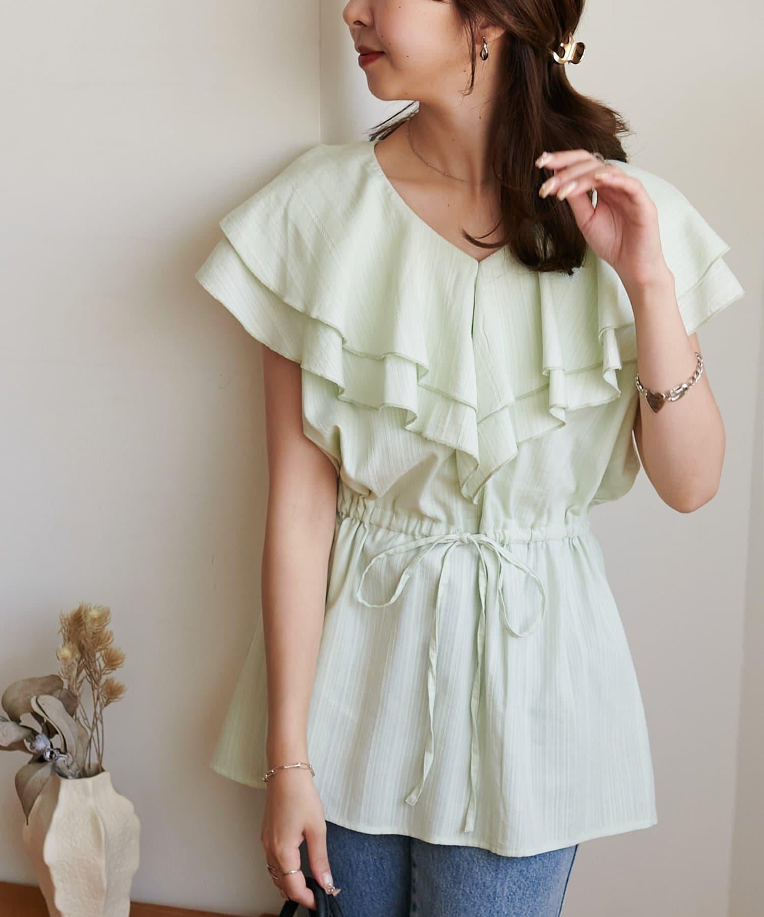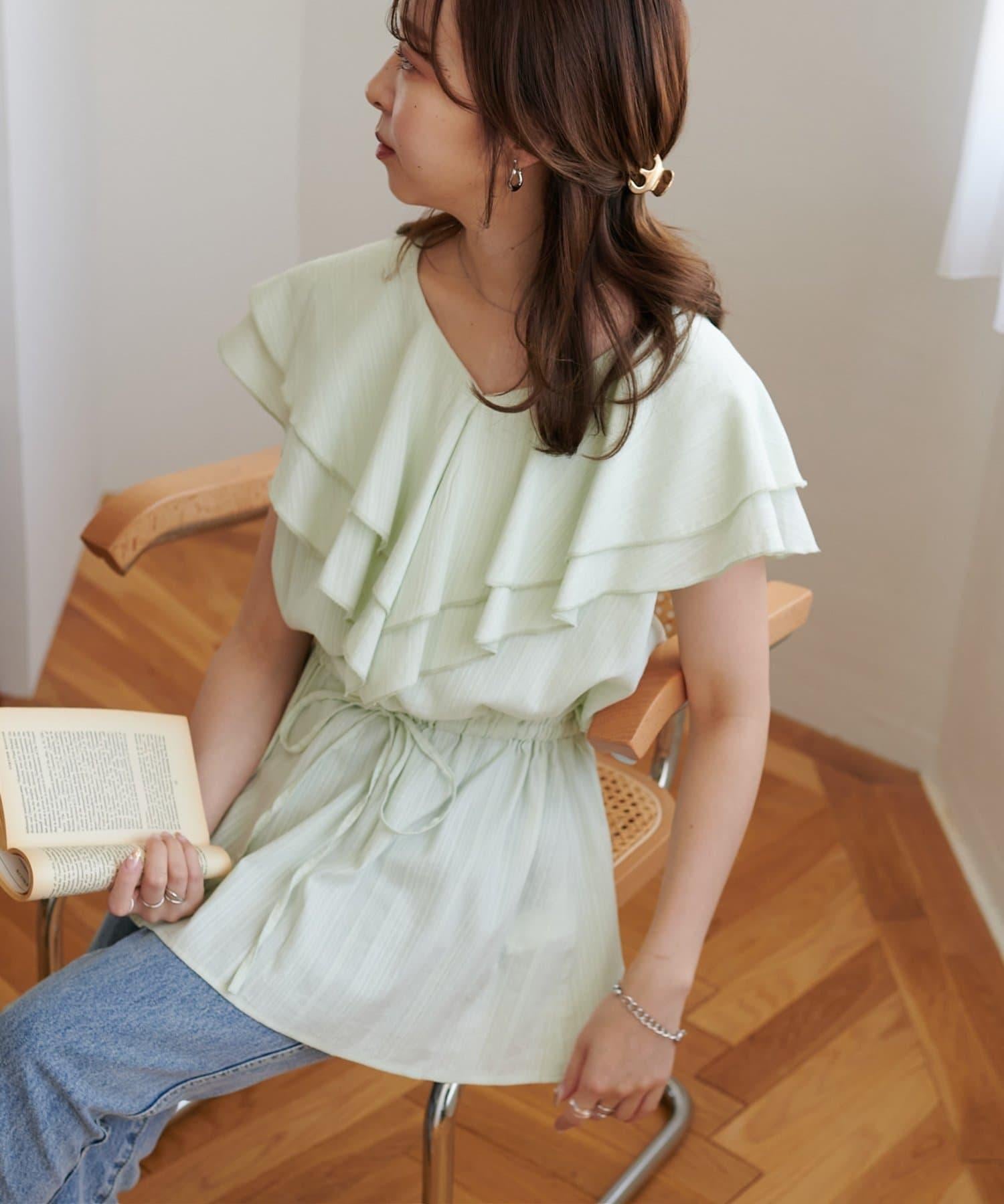 V 領的適度寬鬆與荷葉邊的立體感完美搭配,營造出成熟女性的氣息,同時又不失甜美。