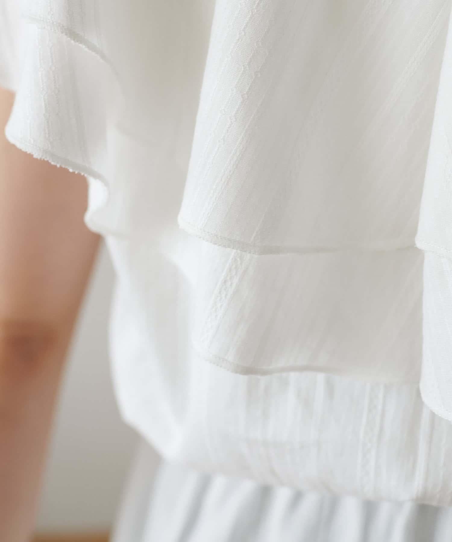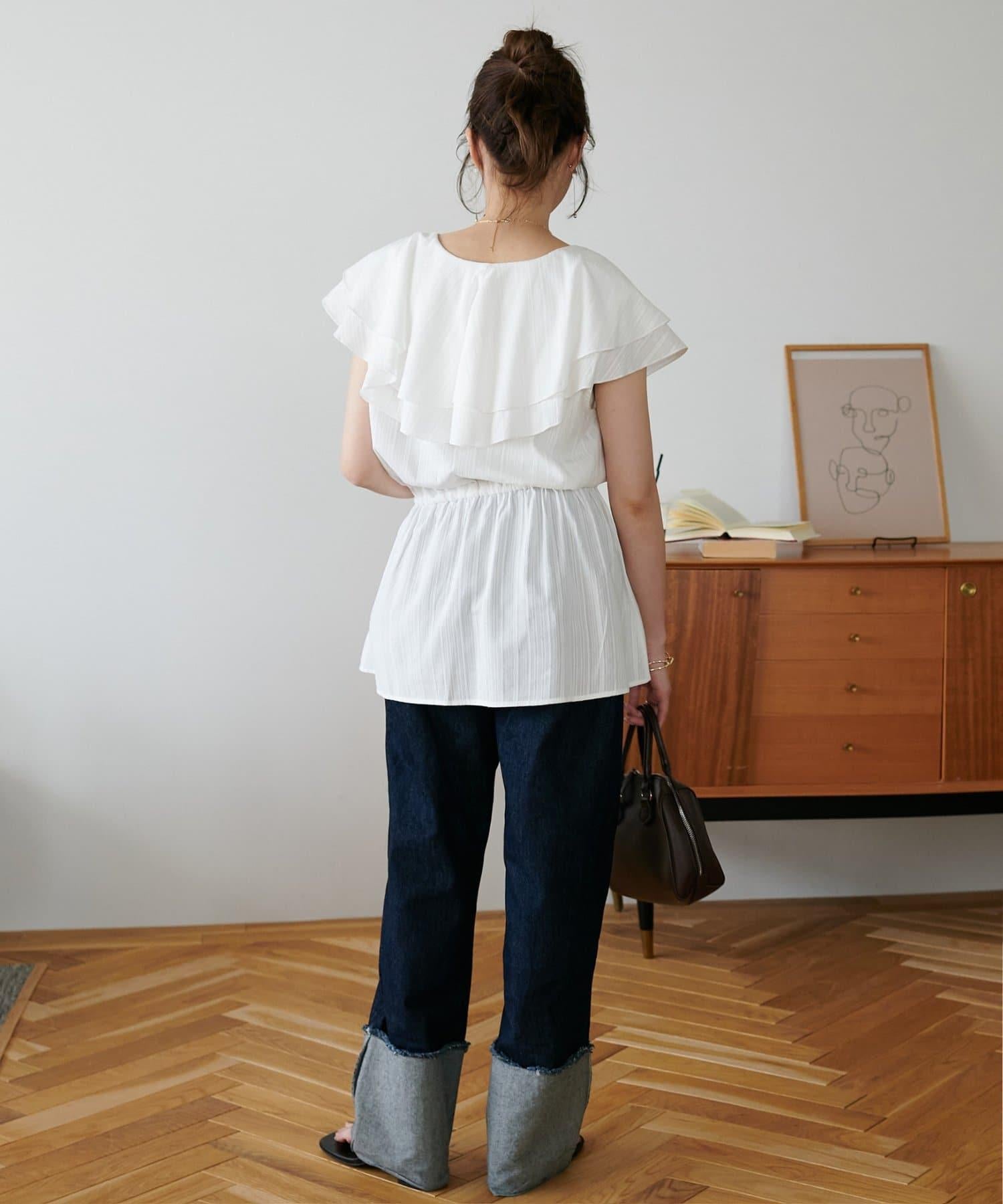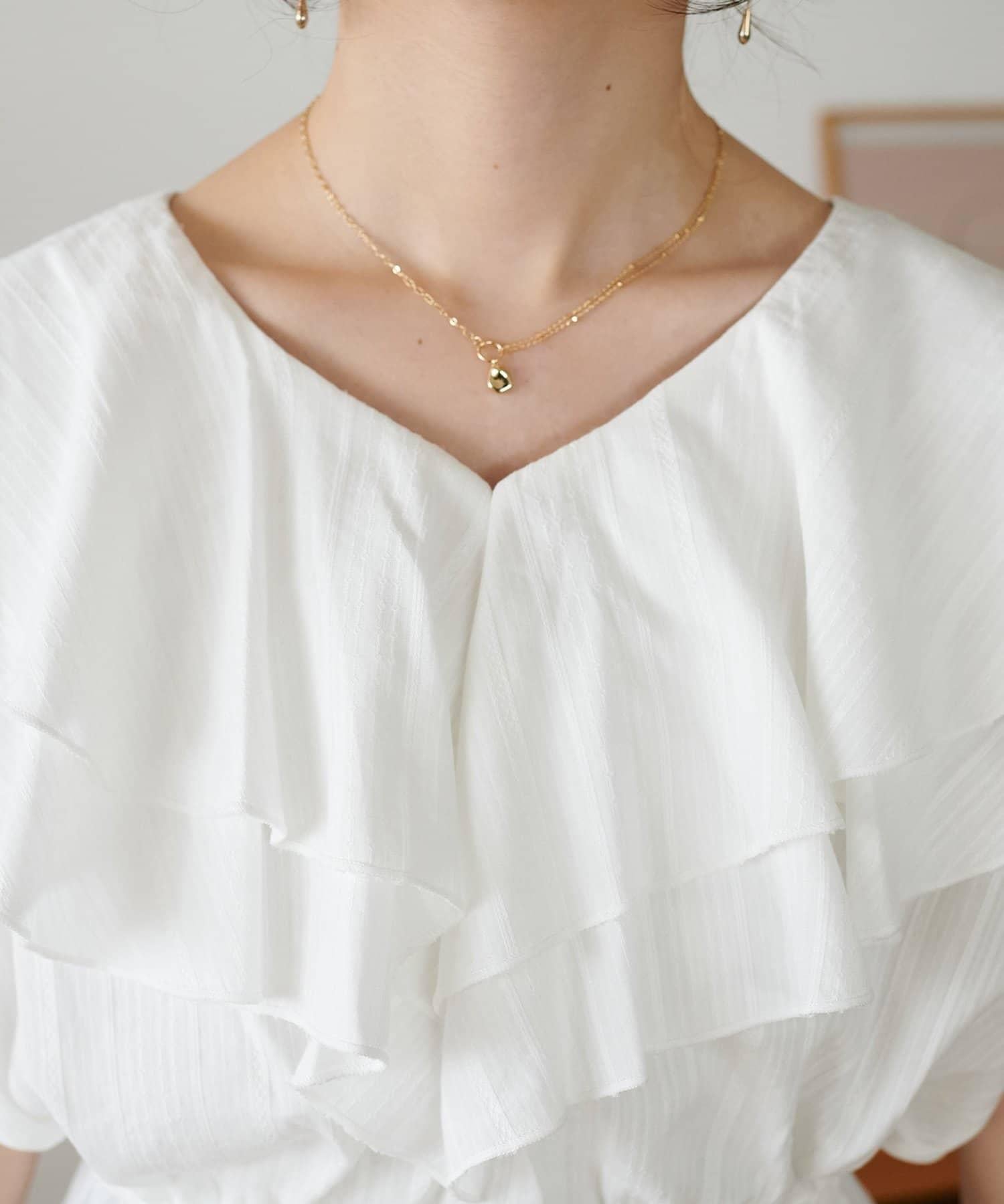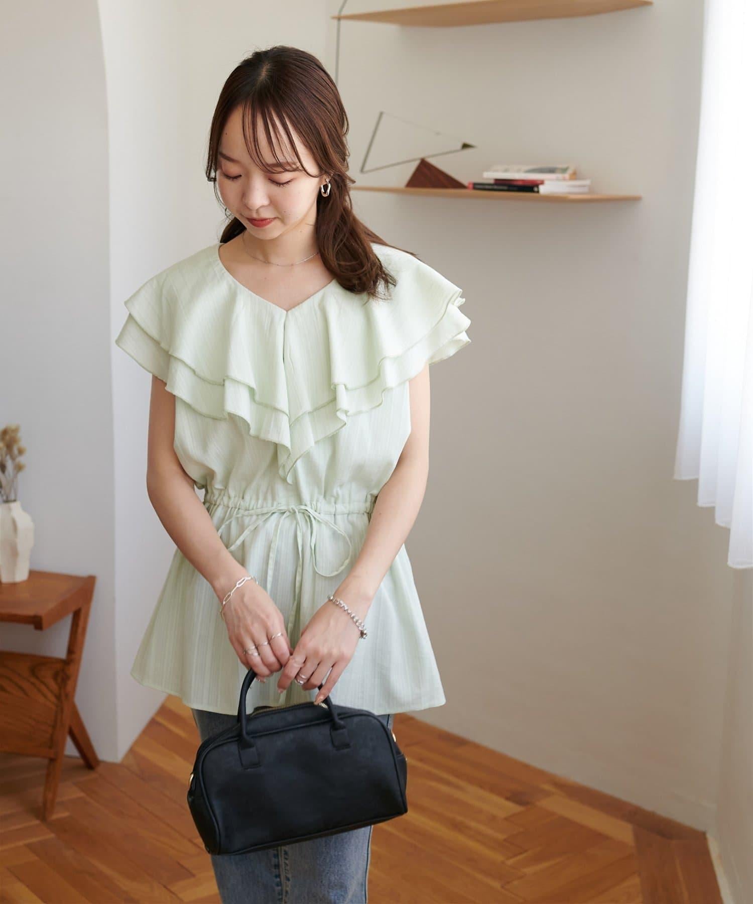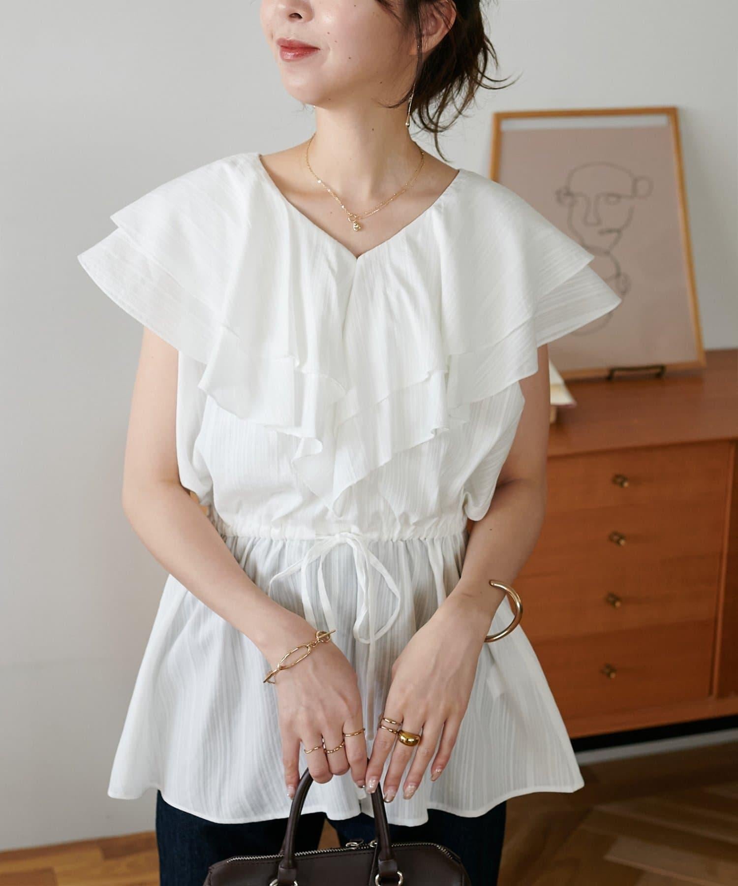 V 領的適度寬鬆與荷葉邊的立體感完美搭配,營造出成熟女性的氣息,同時又不失甜美。
