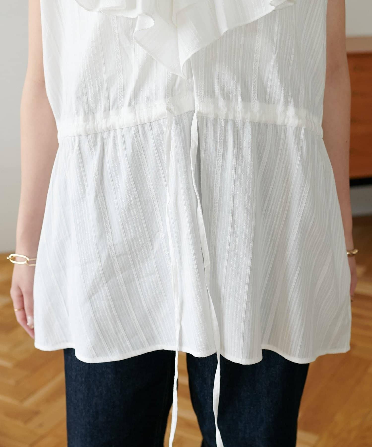身高 153cm 的工作人員:腰部的收腰設計讓它看起來更利落,所以推薦給個子較矮的人!流蘇設計自然地遮住了肩部,即使是無袖也會有安全感。