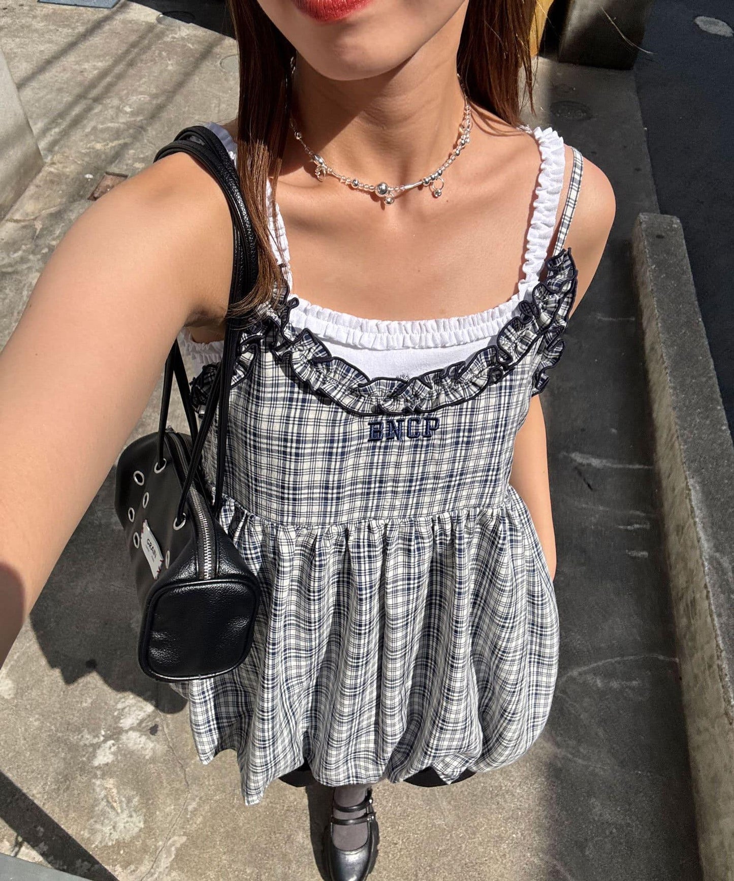 氣球吊帶半身裙,帶有可愛的復古流蘇格紋圖案。