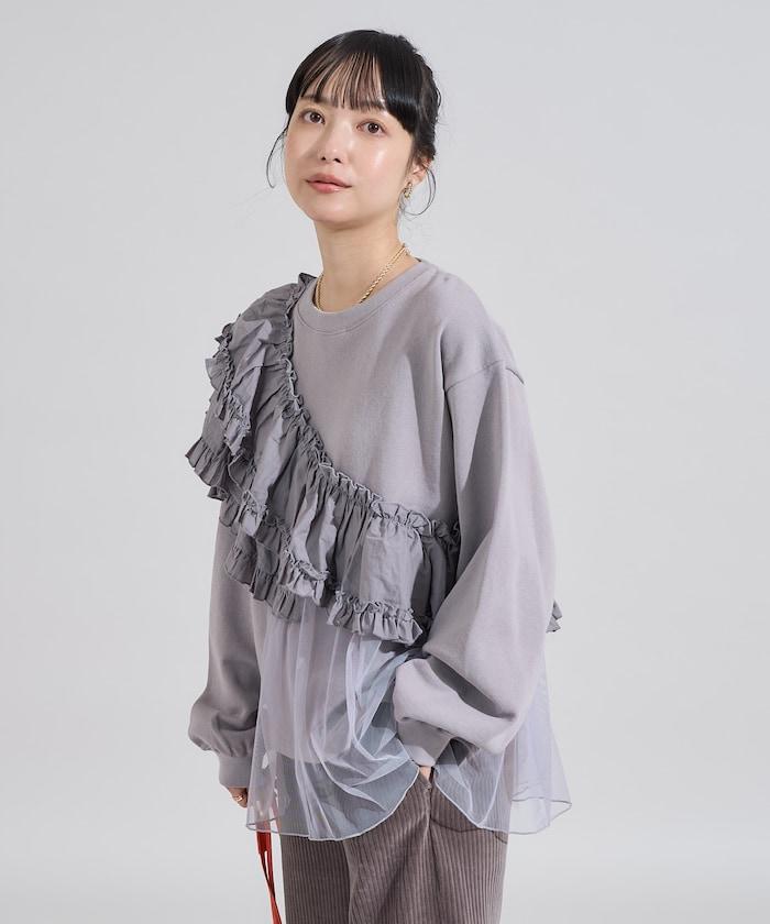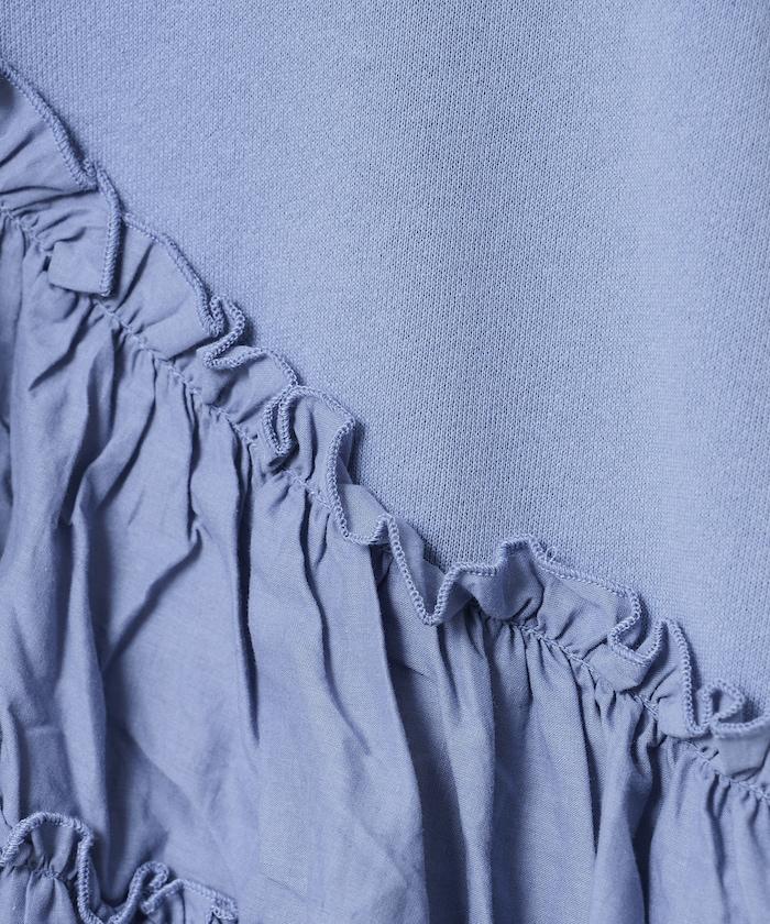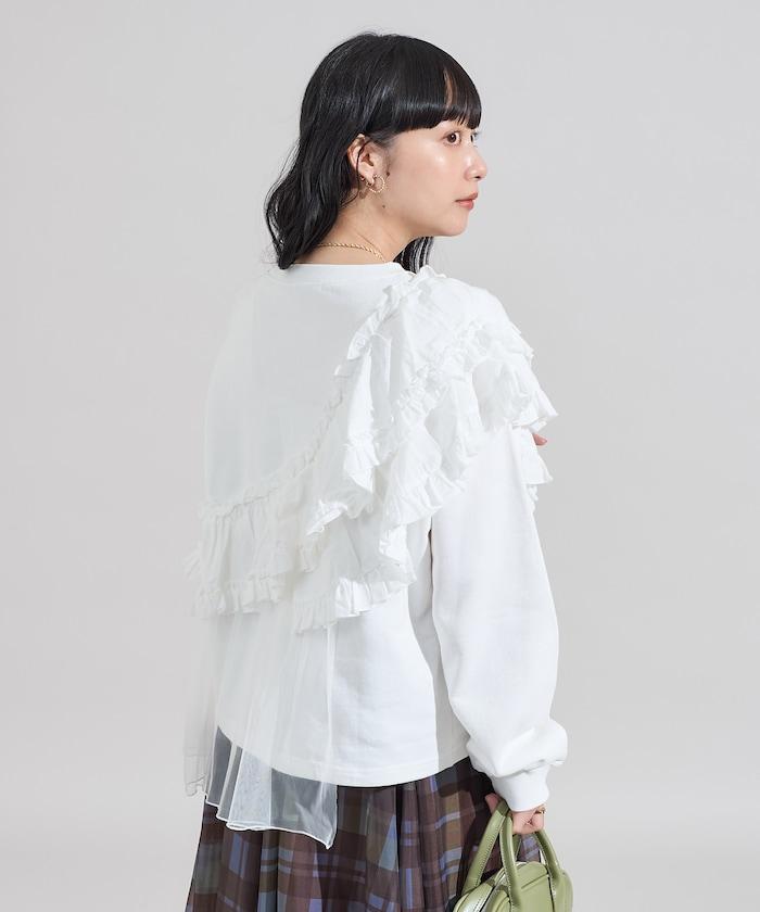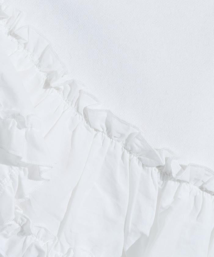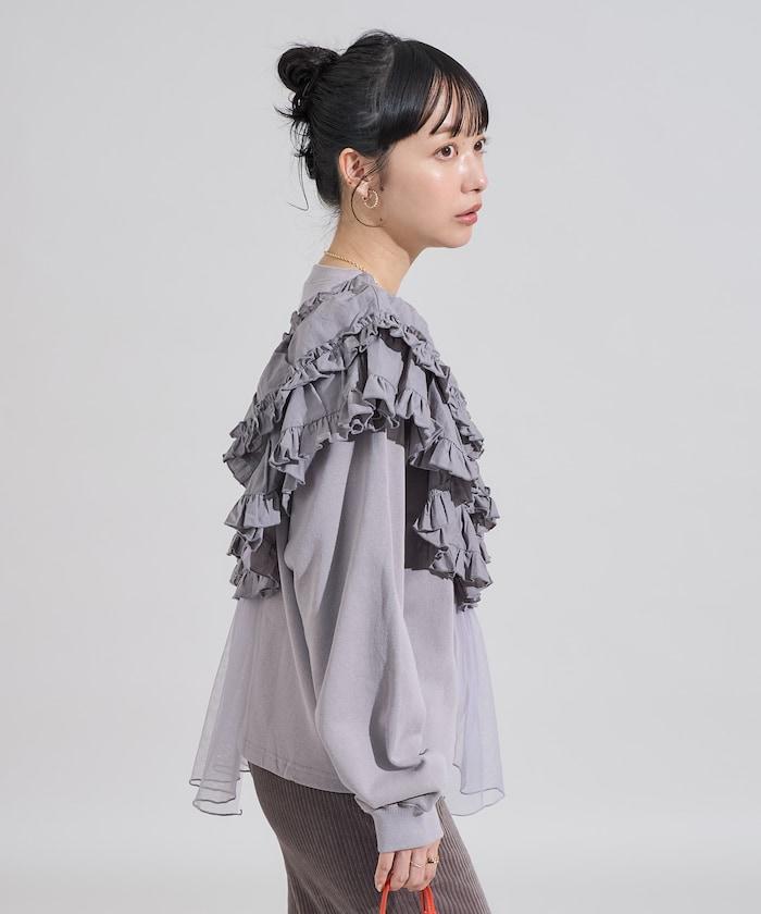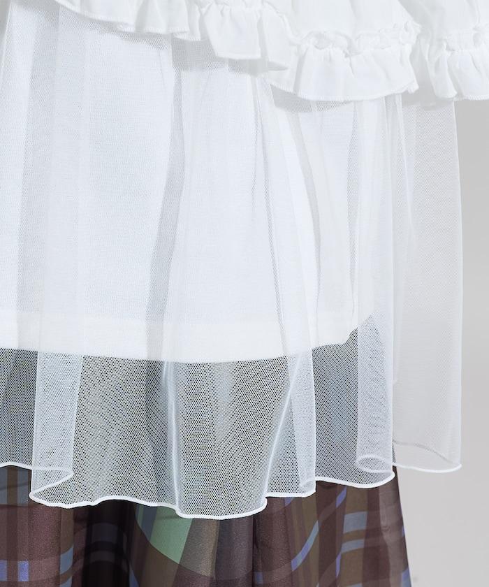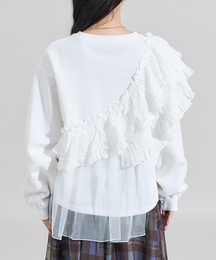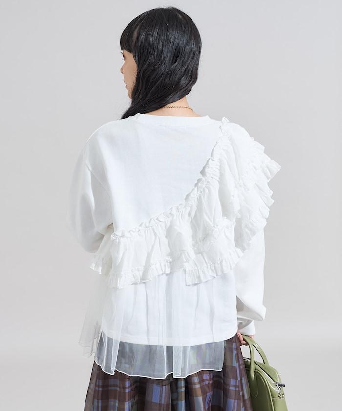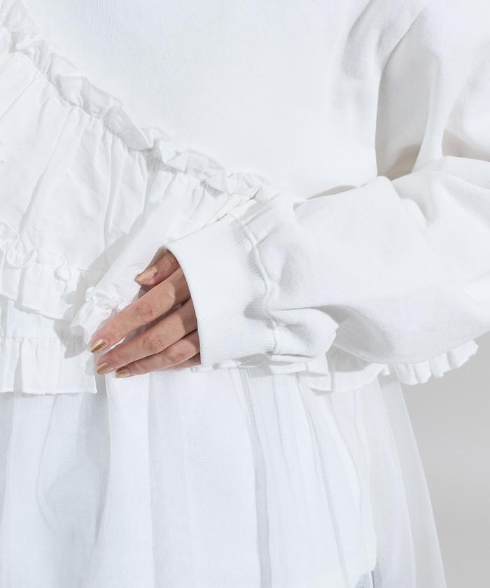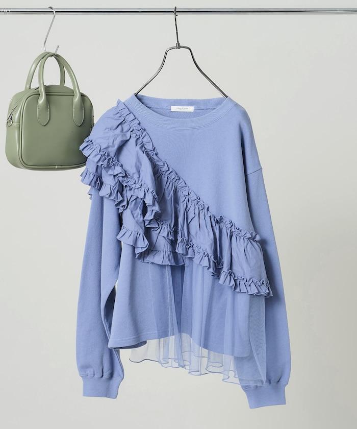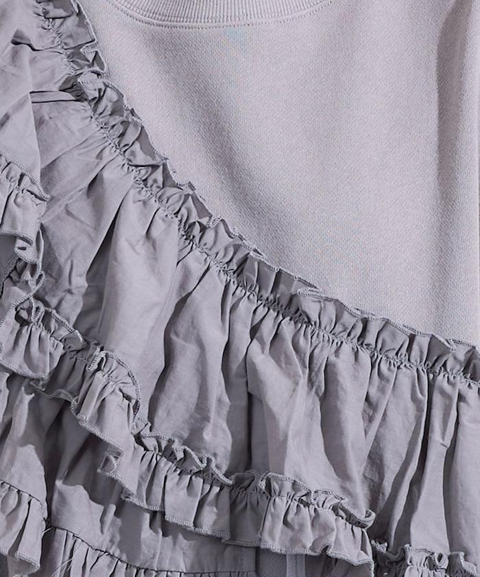 褶邊和薄紗的不對稱運用營造出更加立體的效果。