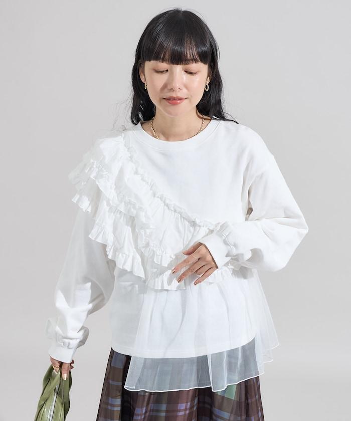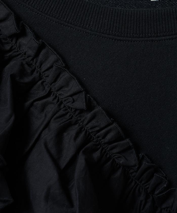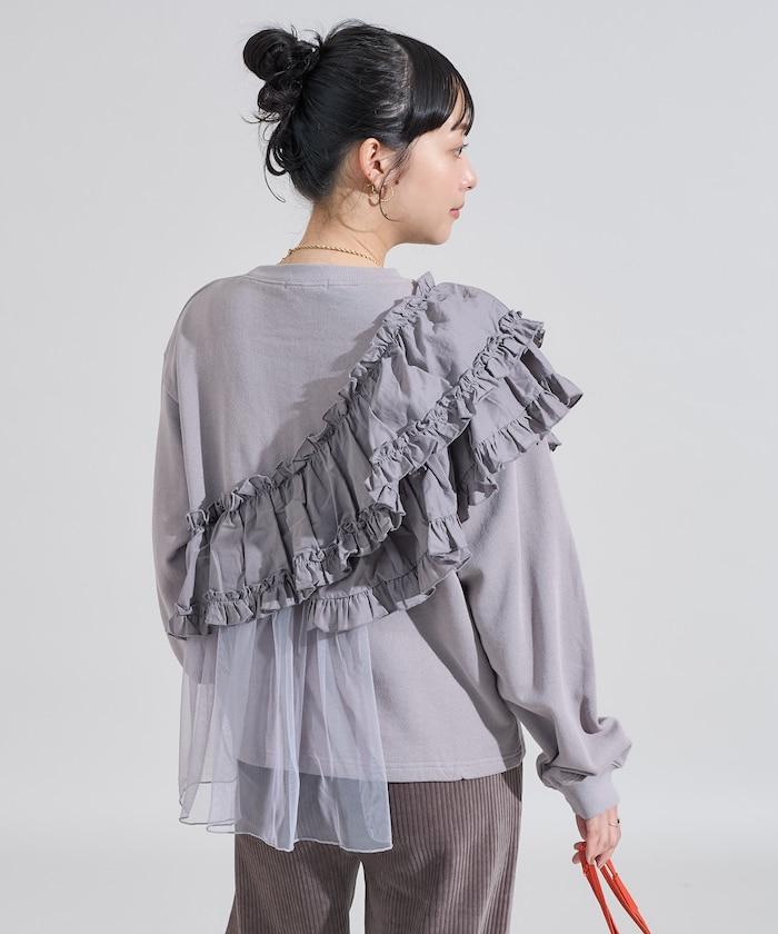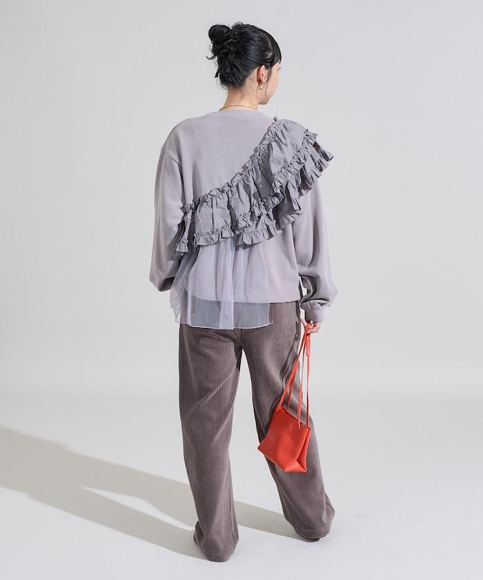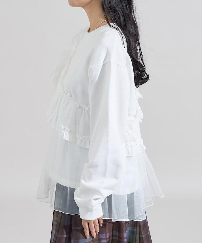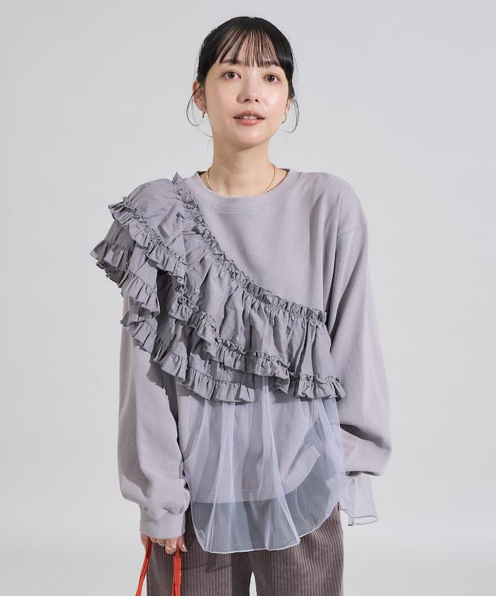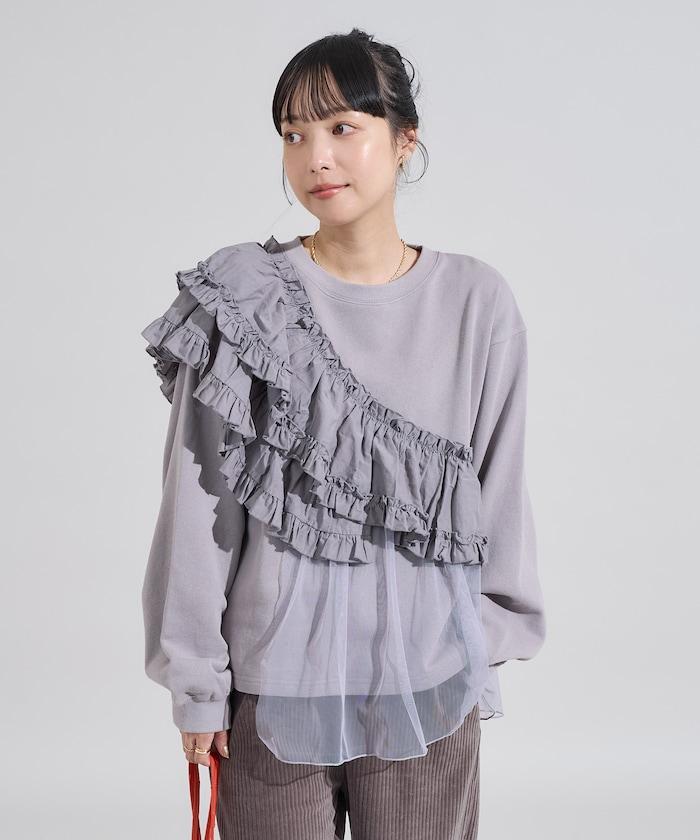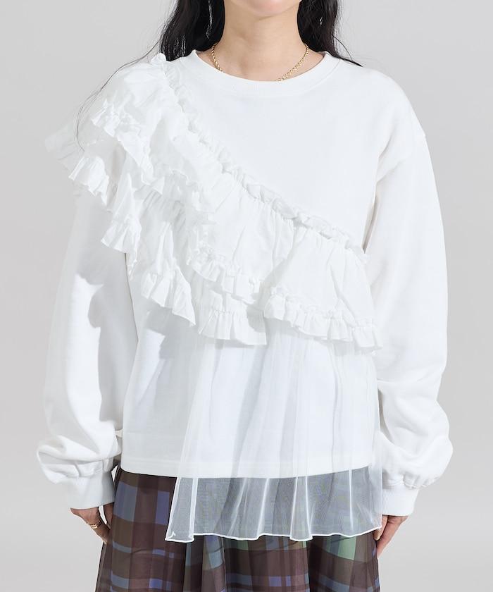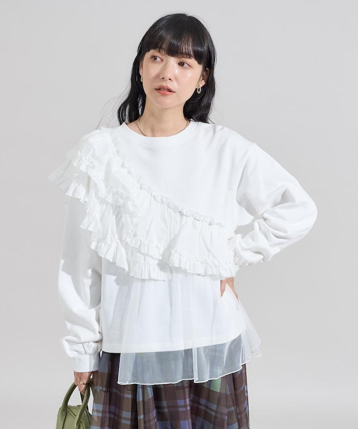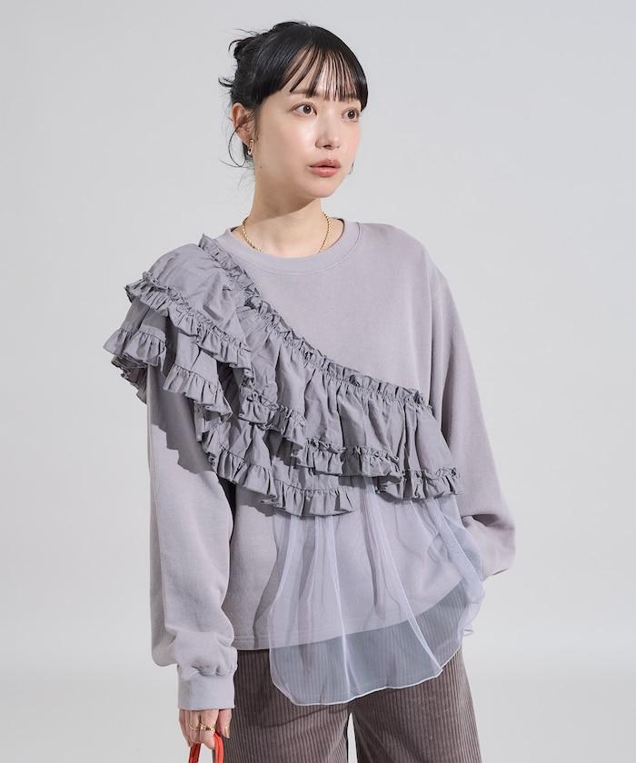 褶邊和薄紗的不對稱運用營造出更加立體的效果。